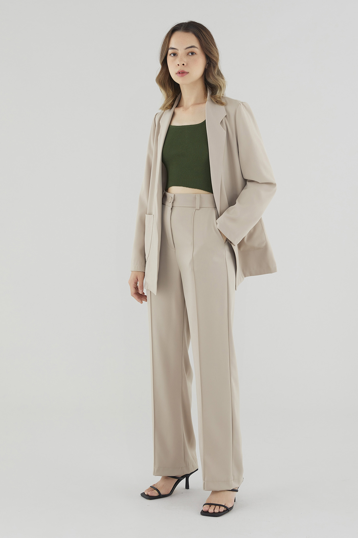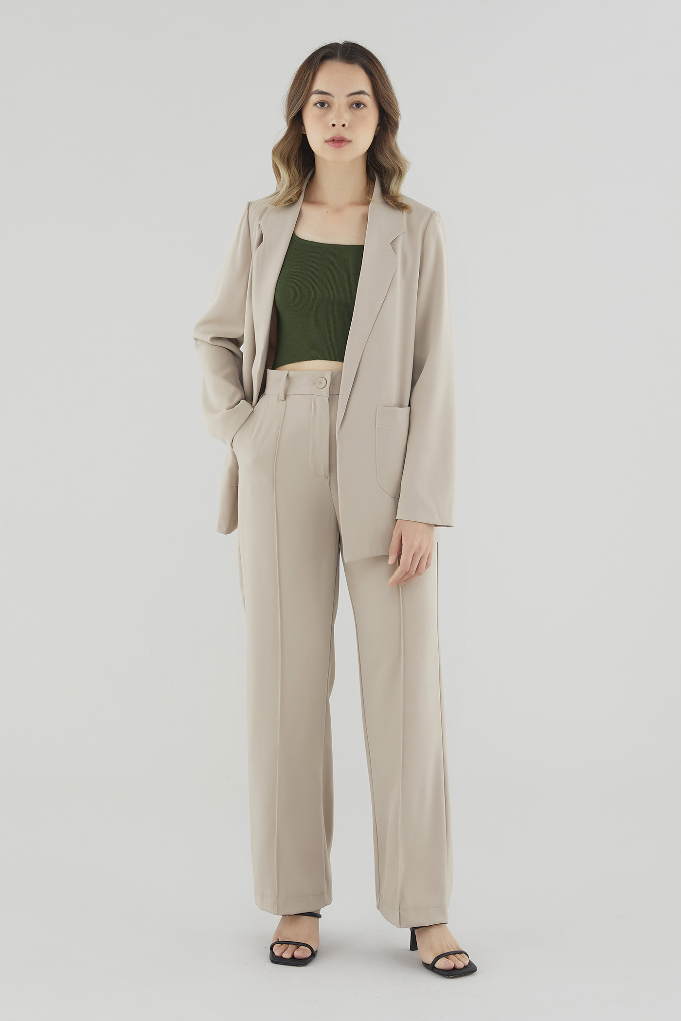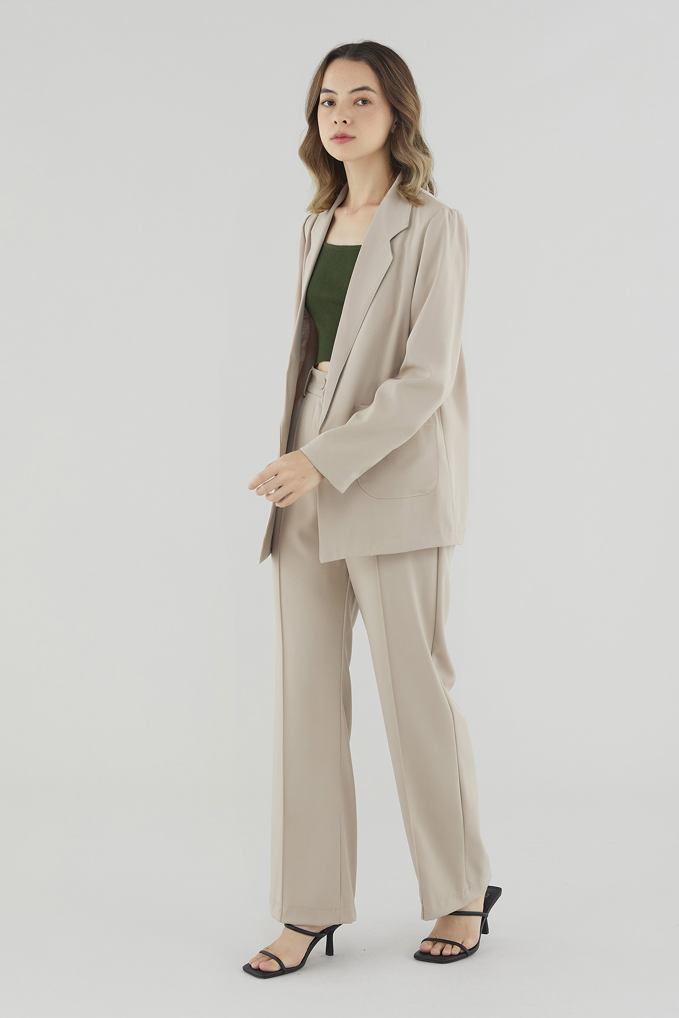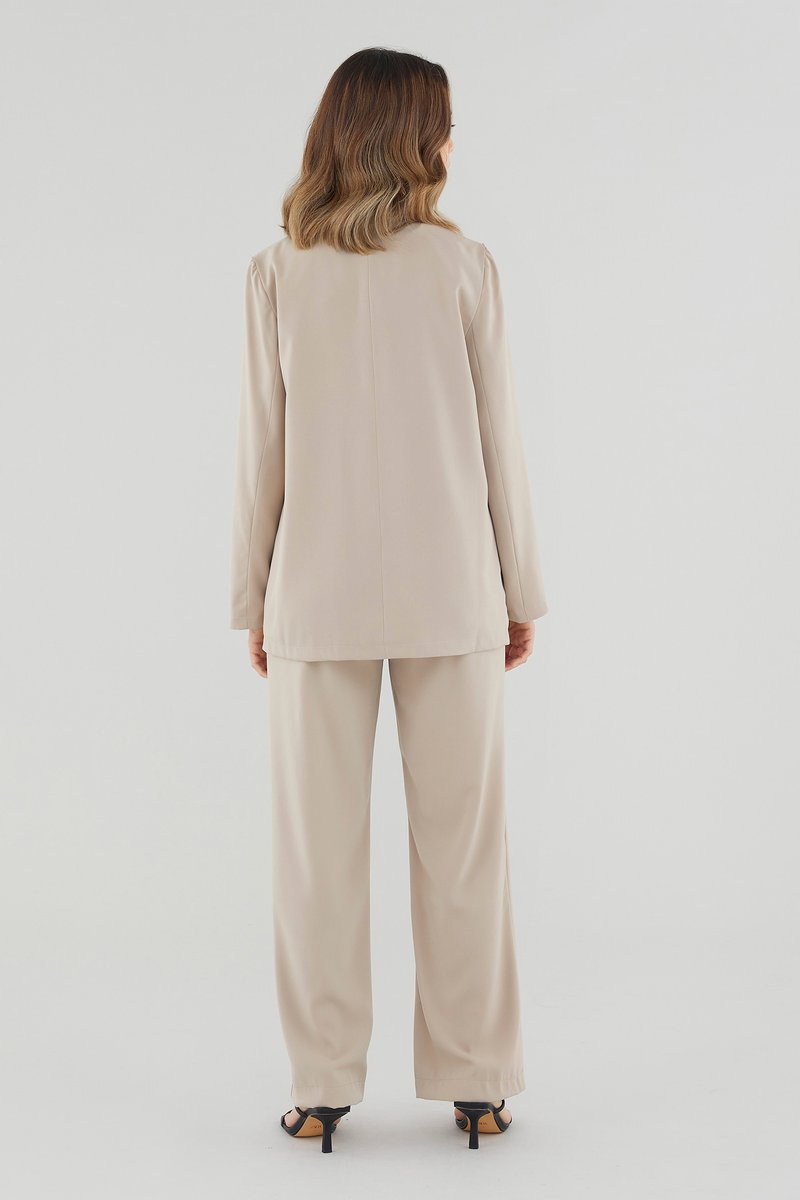 Soft suiting. Cut from smooth fabric with a structured drape, this buttonless blazer features slim lapels with wide notches and a flattering, slightly oversized silhouette. Worn in a relaxed fit.