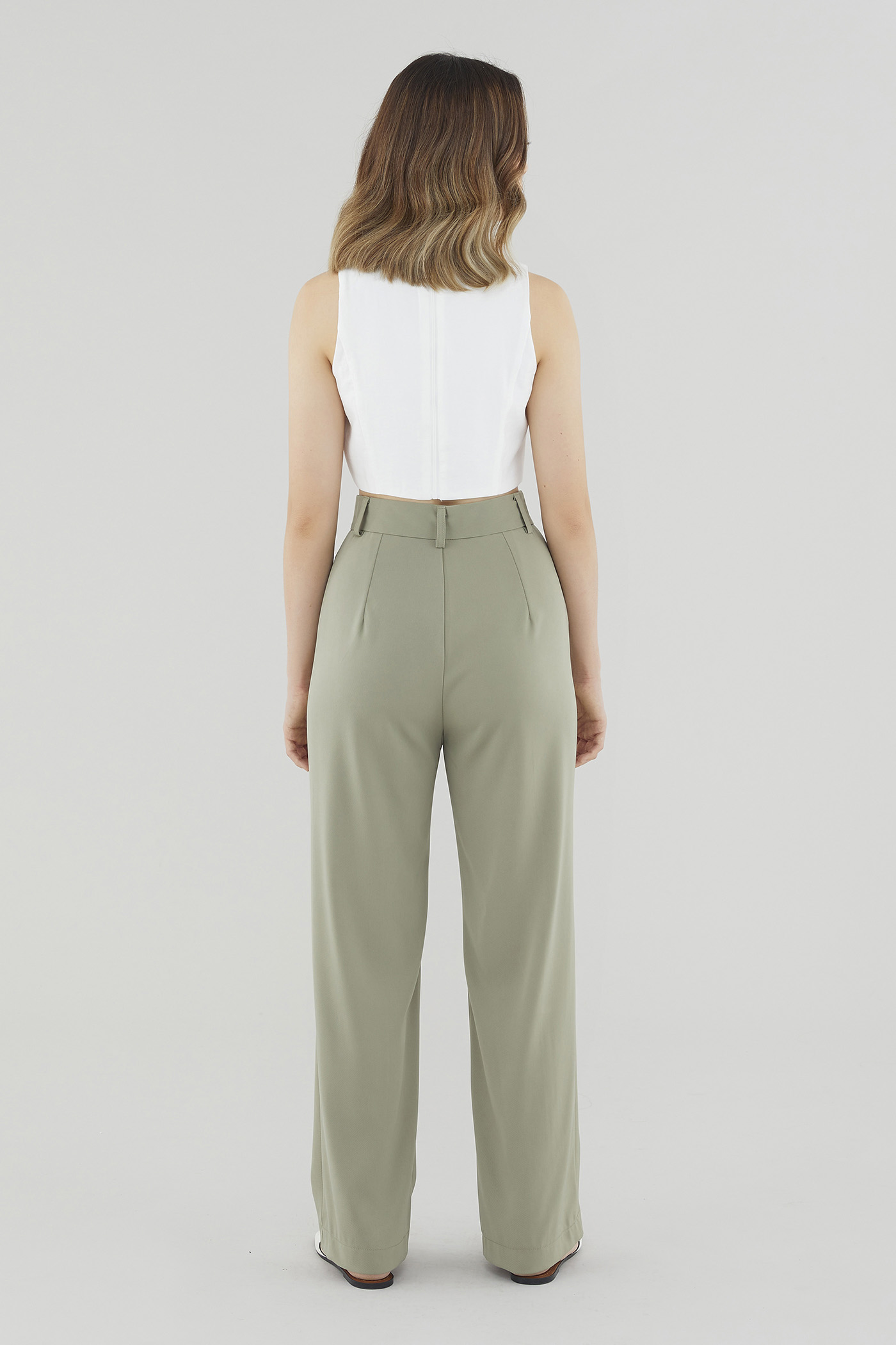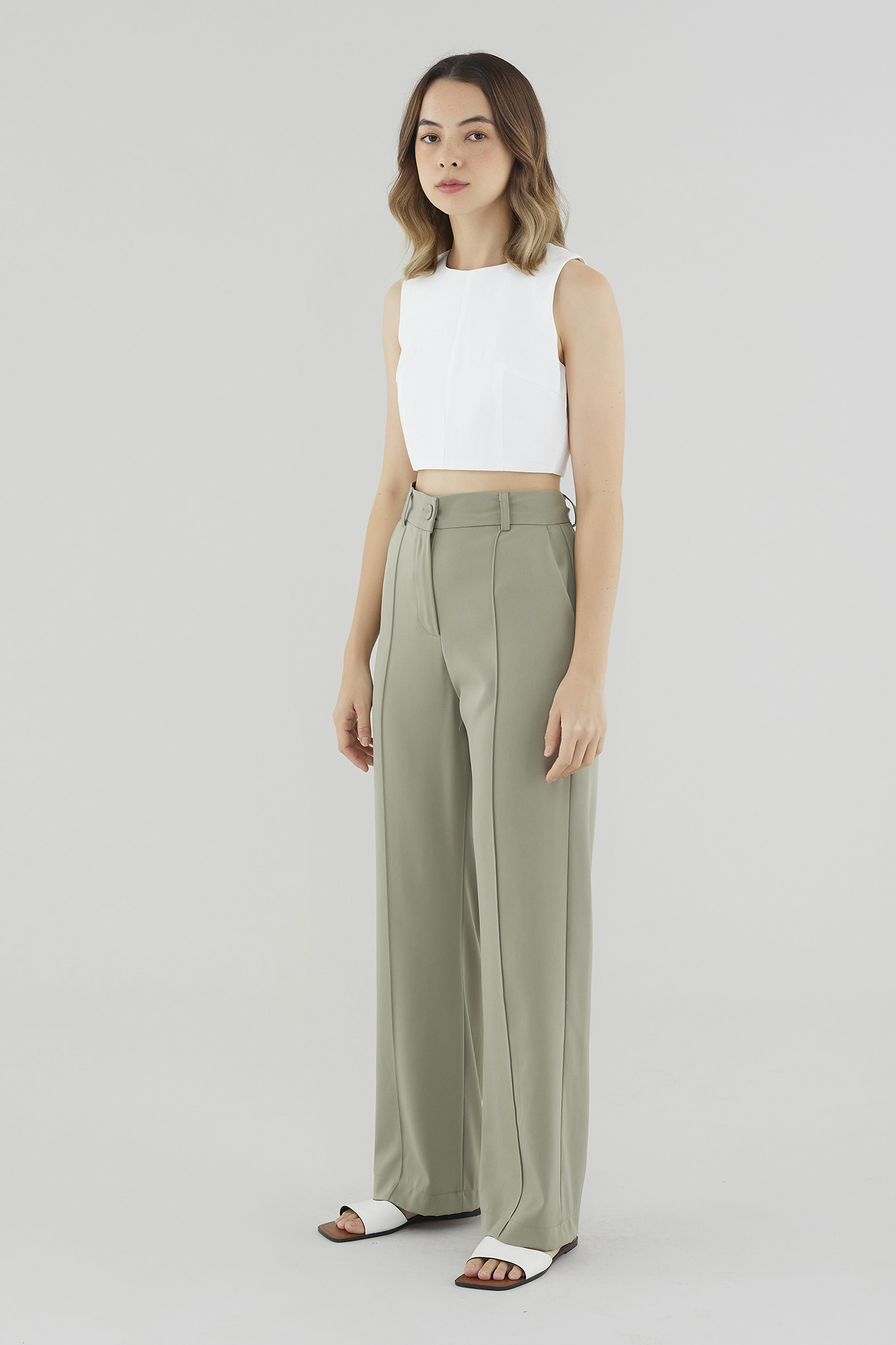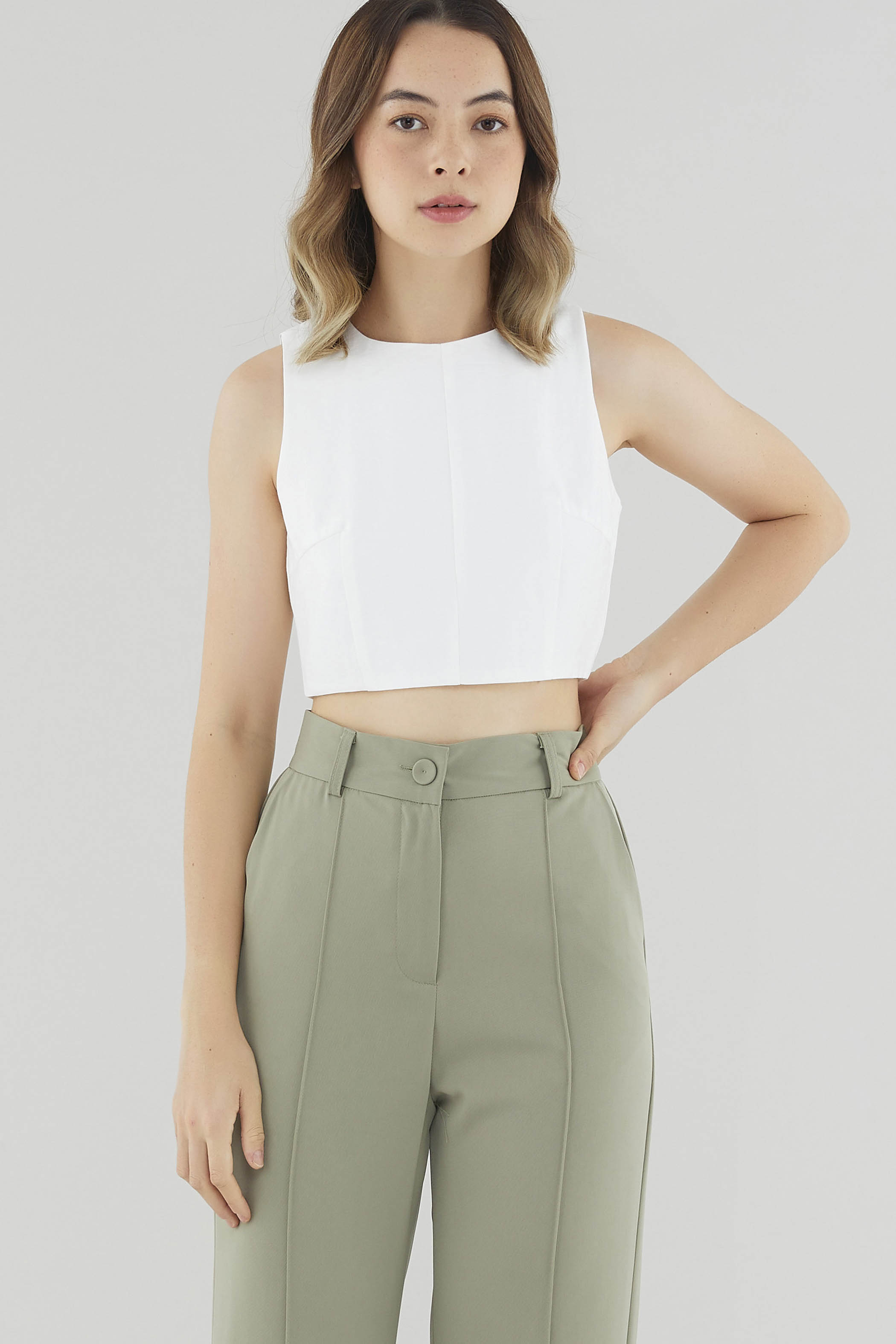 Refresh your rotation. Made from non-stretch, gently tailored fabric, this sleeveless cropped top features a round neckline, flattering cut-in shoulders and a panelled bodice for extra polish. Fits slim with a zip closure on the back.