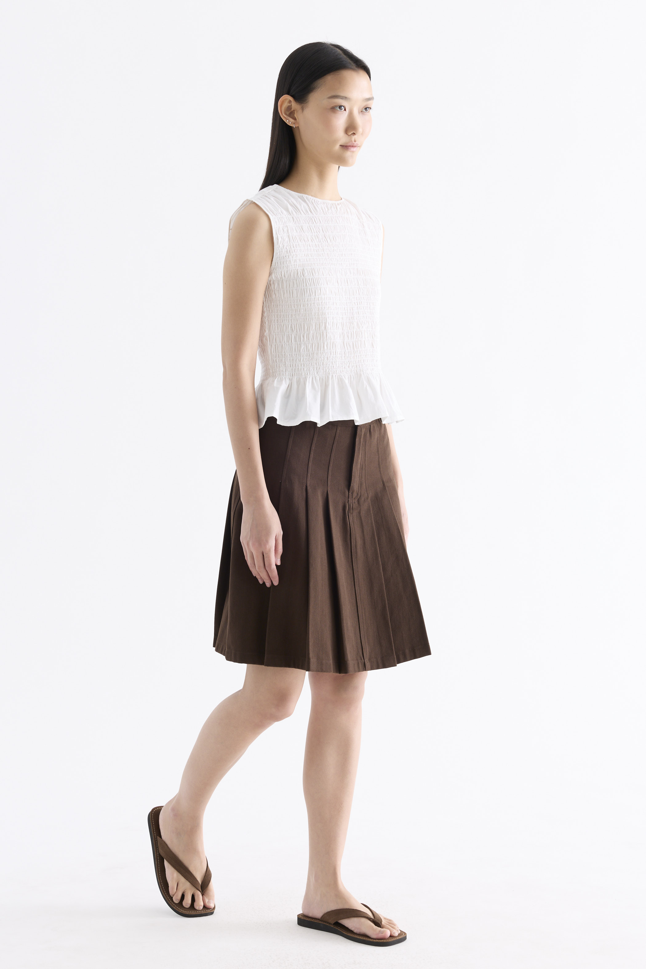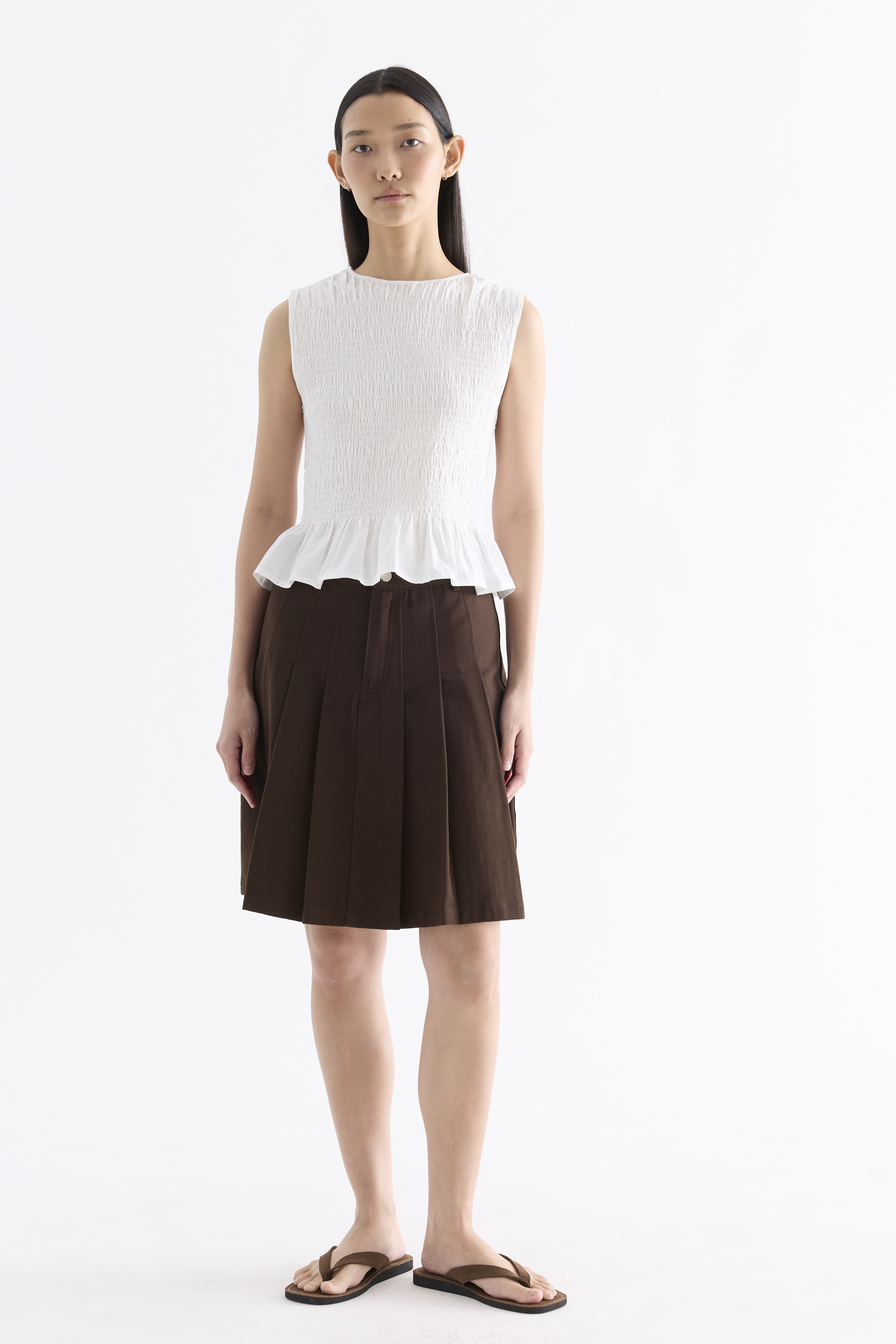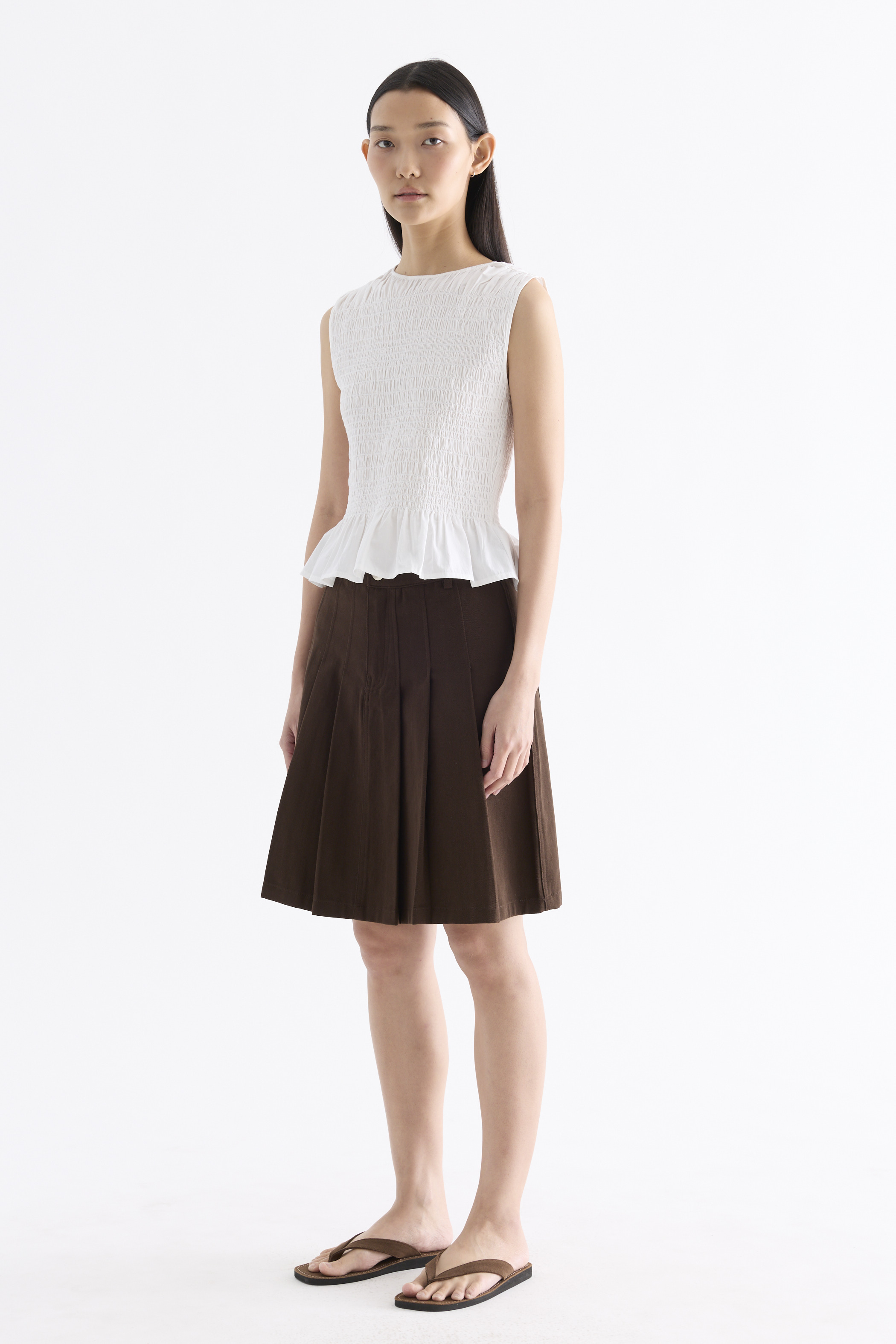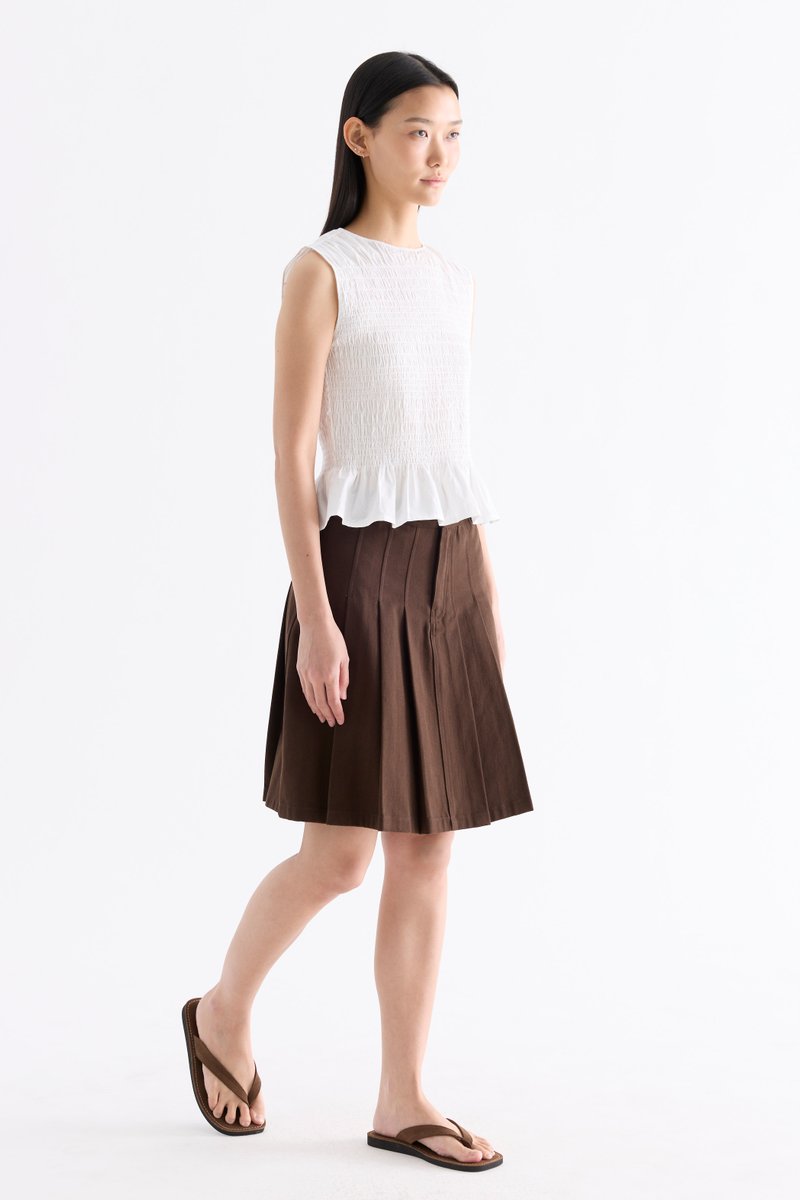 But first, textures. Cut from crisp and softly structured cotton, this sleeveless top features a smocked bodice, gathered round neckline and frilled hem. Fits slim.