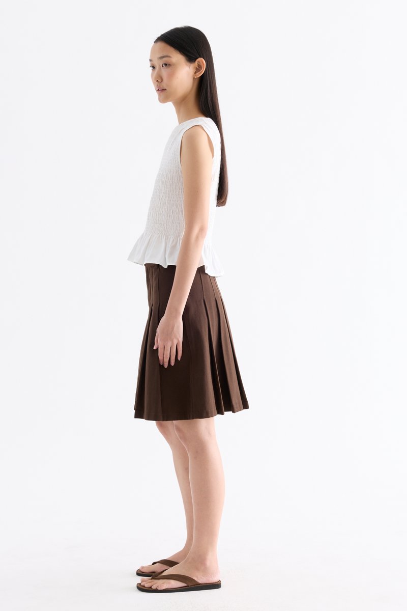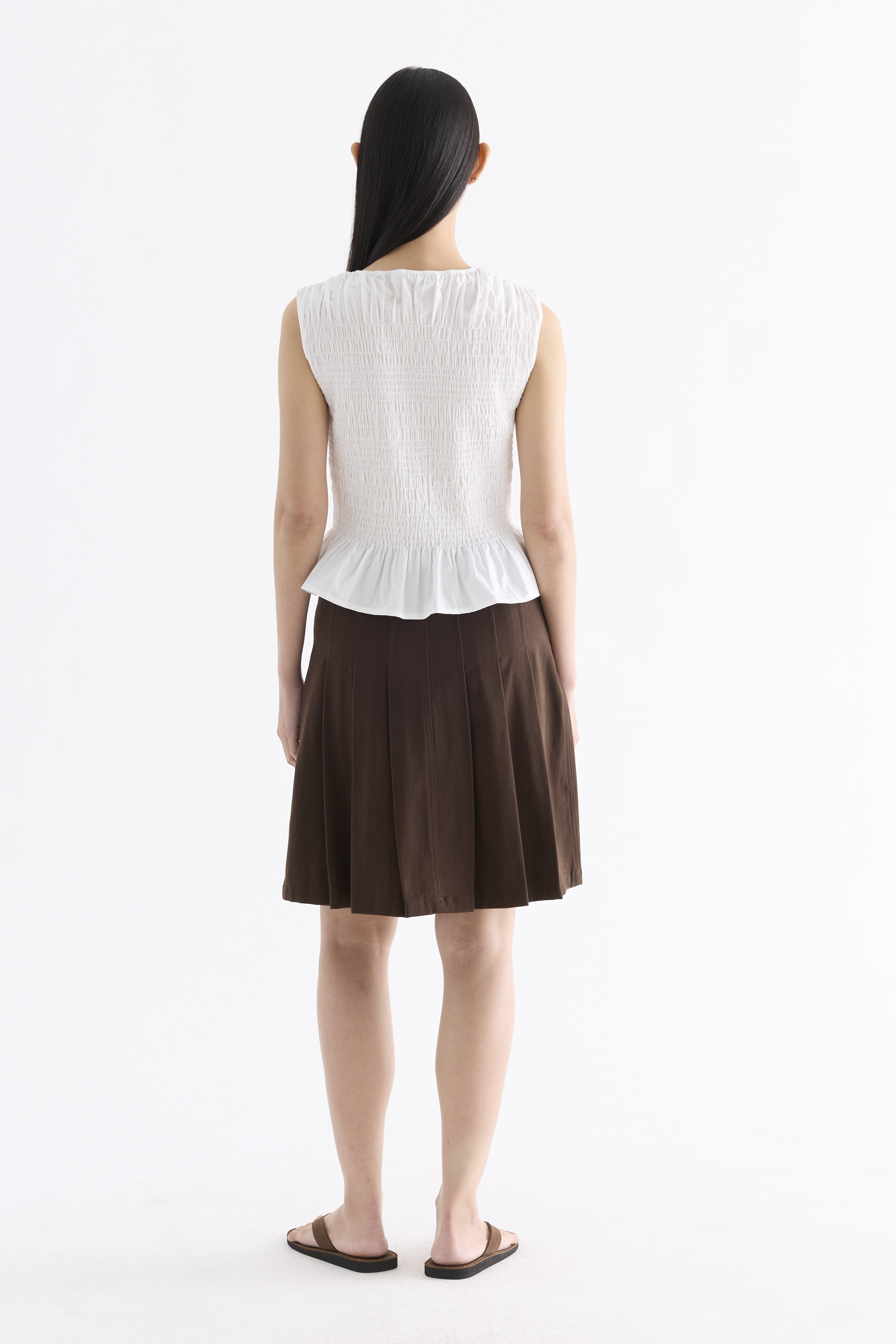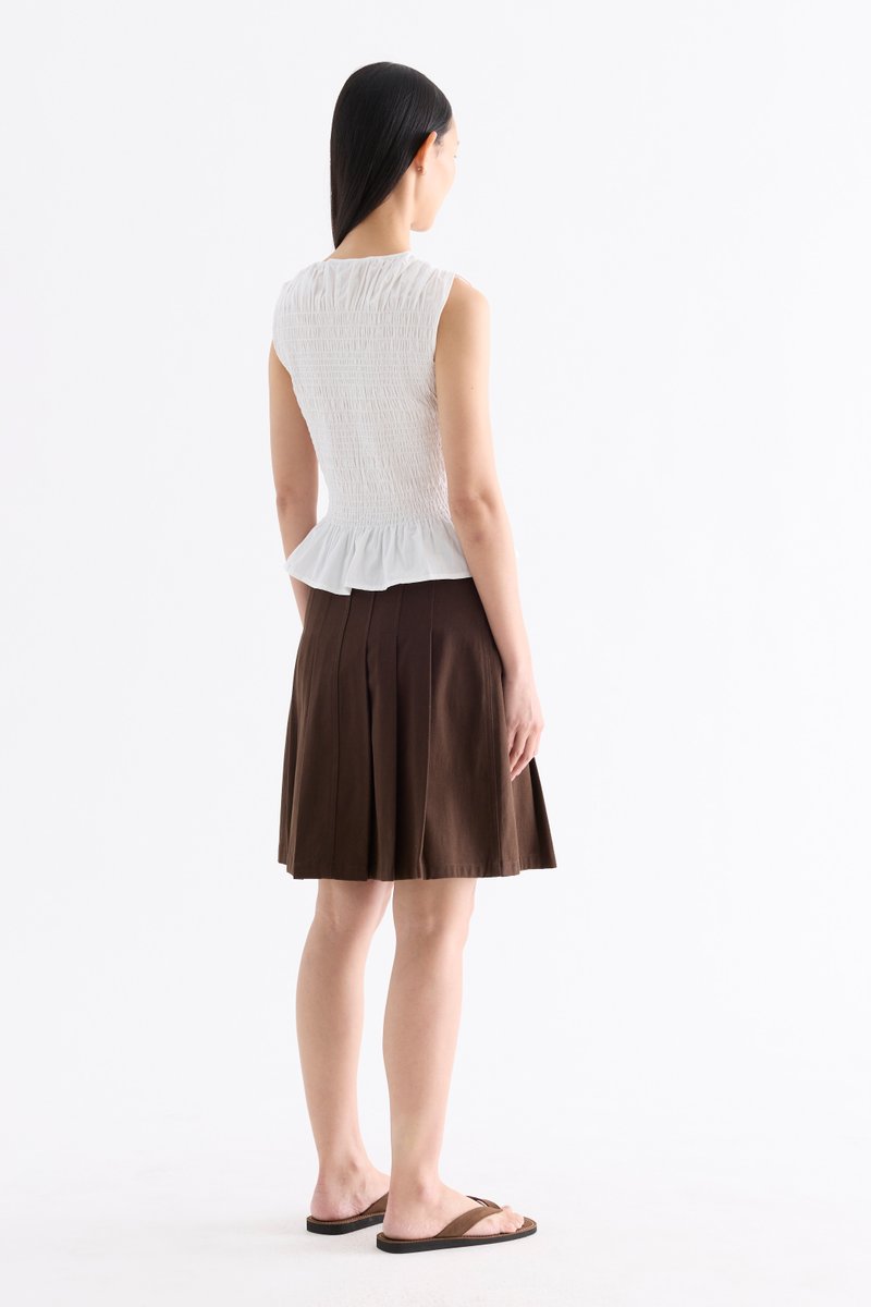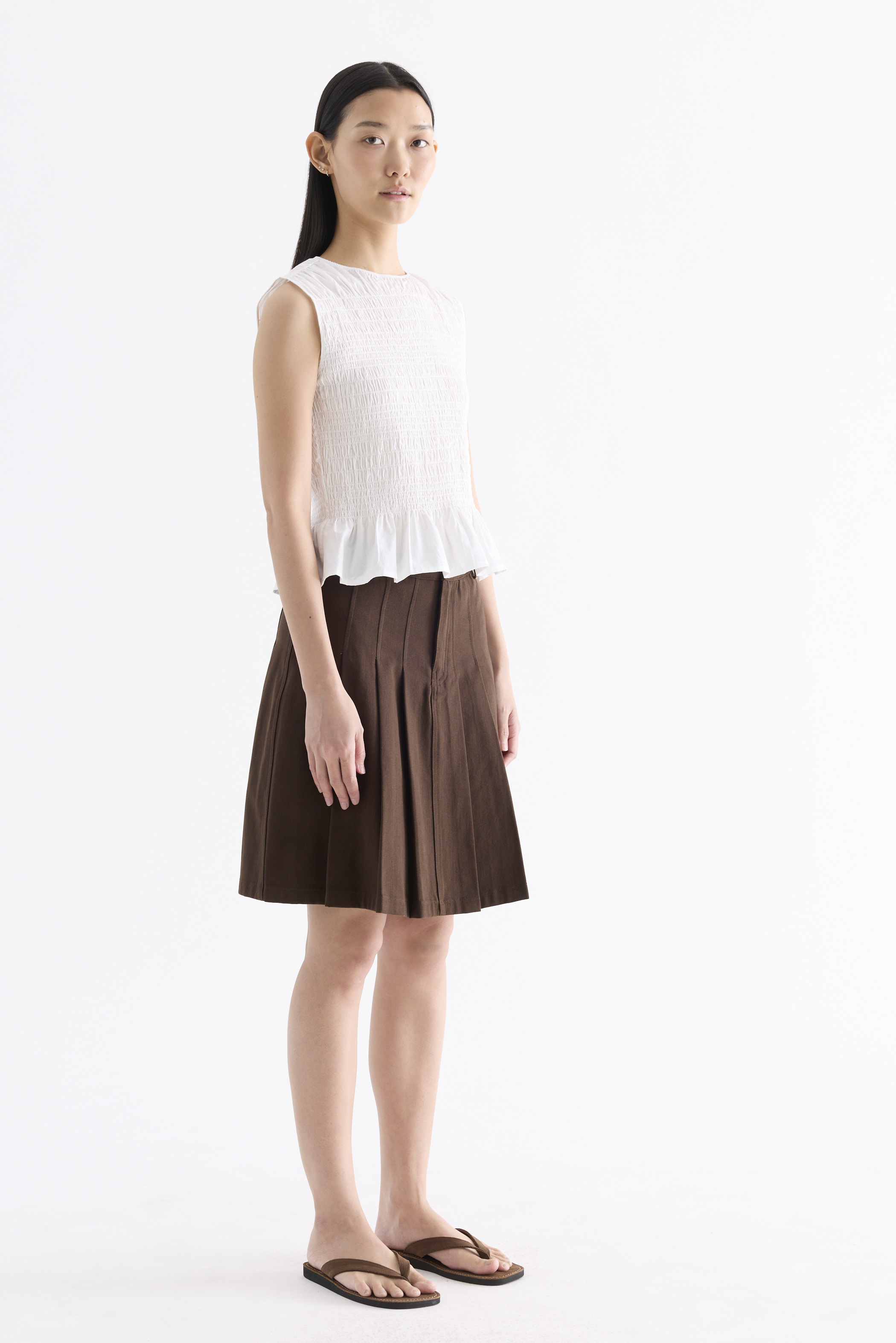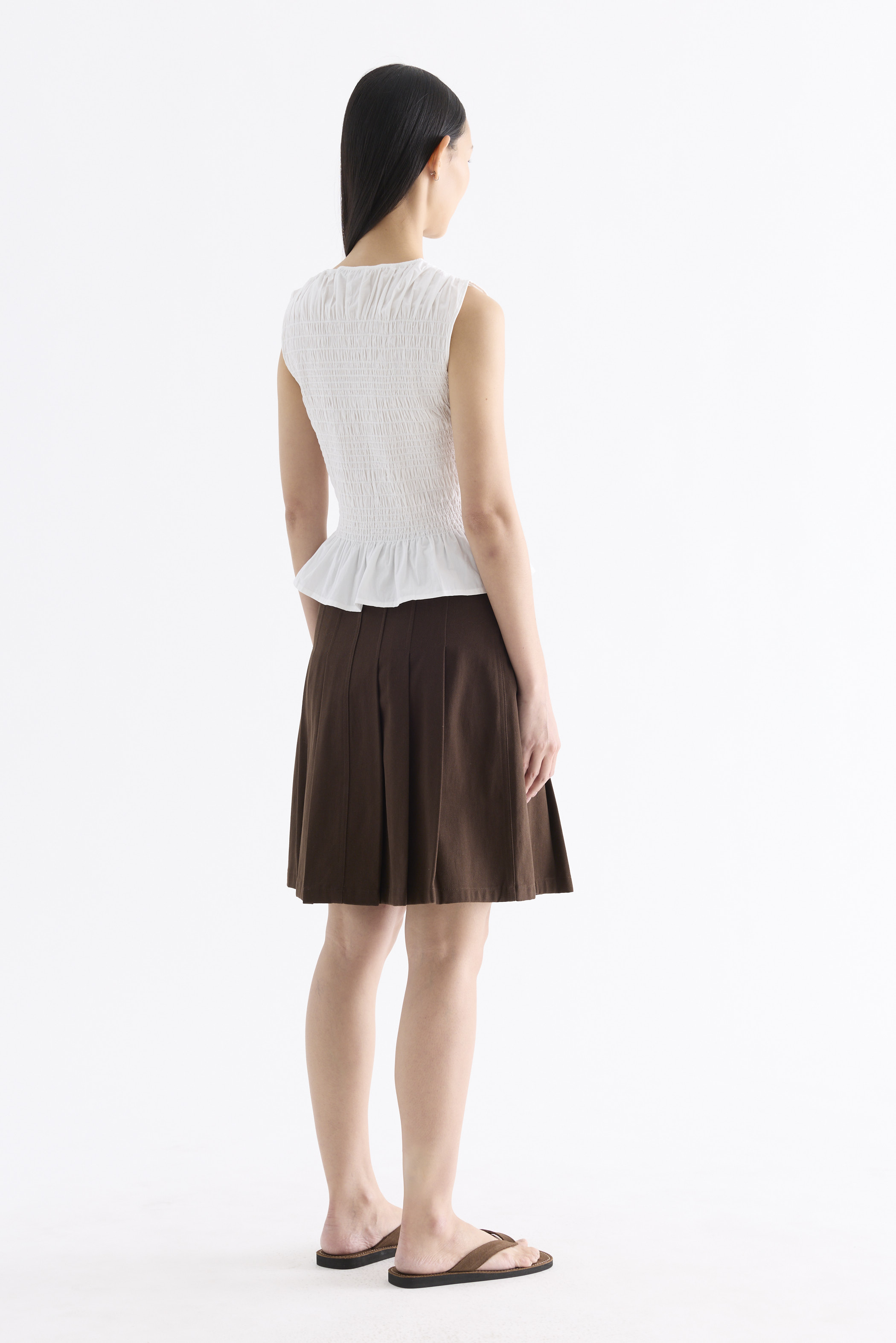 But first, textures. Cut from crisp and softly structured cotton, this sleeveless top features a smocked bodice, gathered round neckline and frilled hem. Fits slim.
