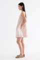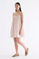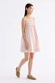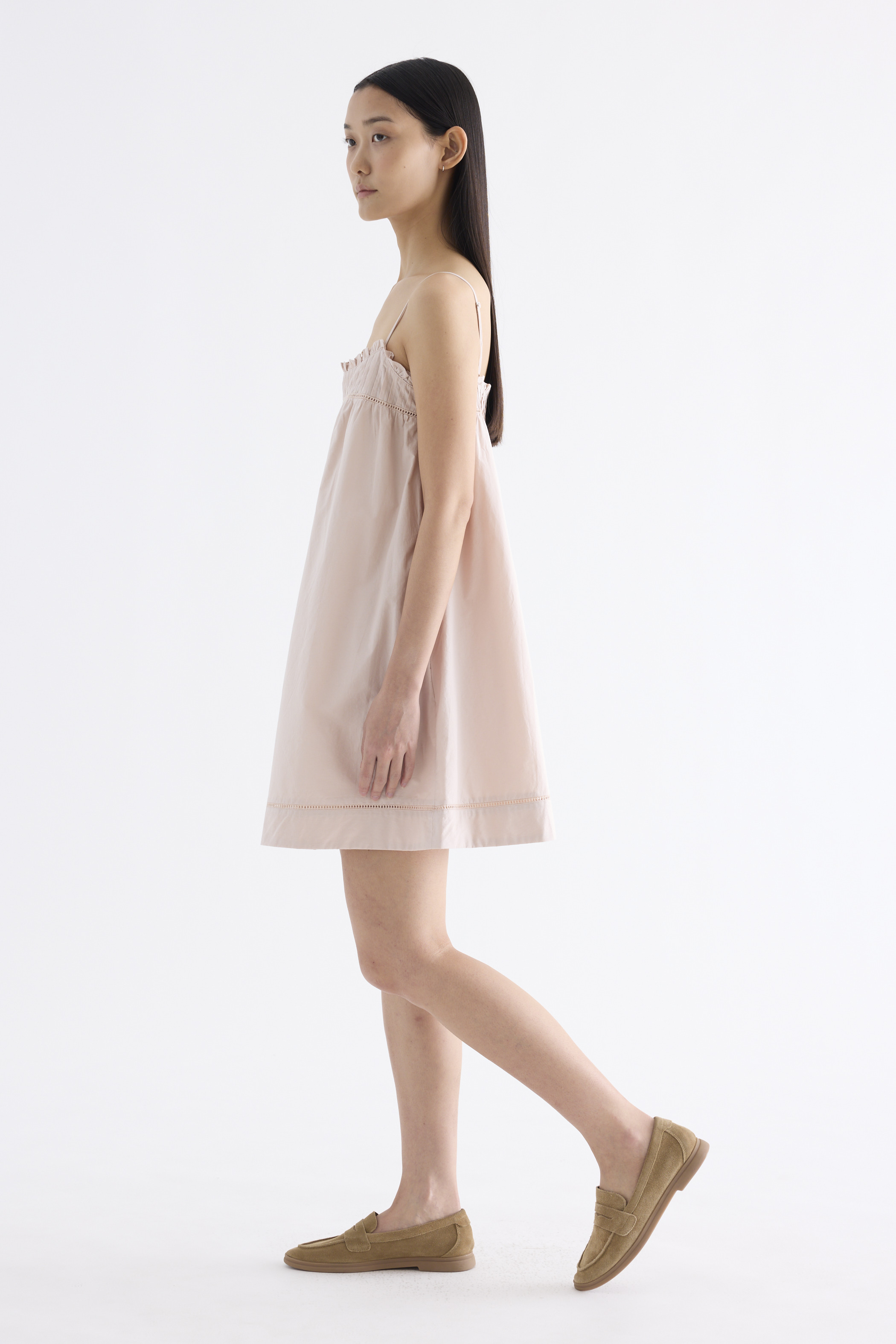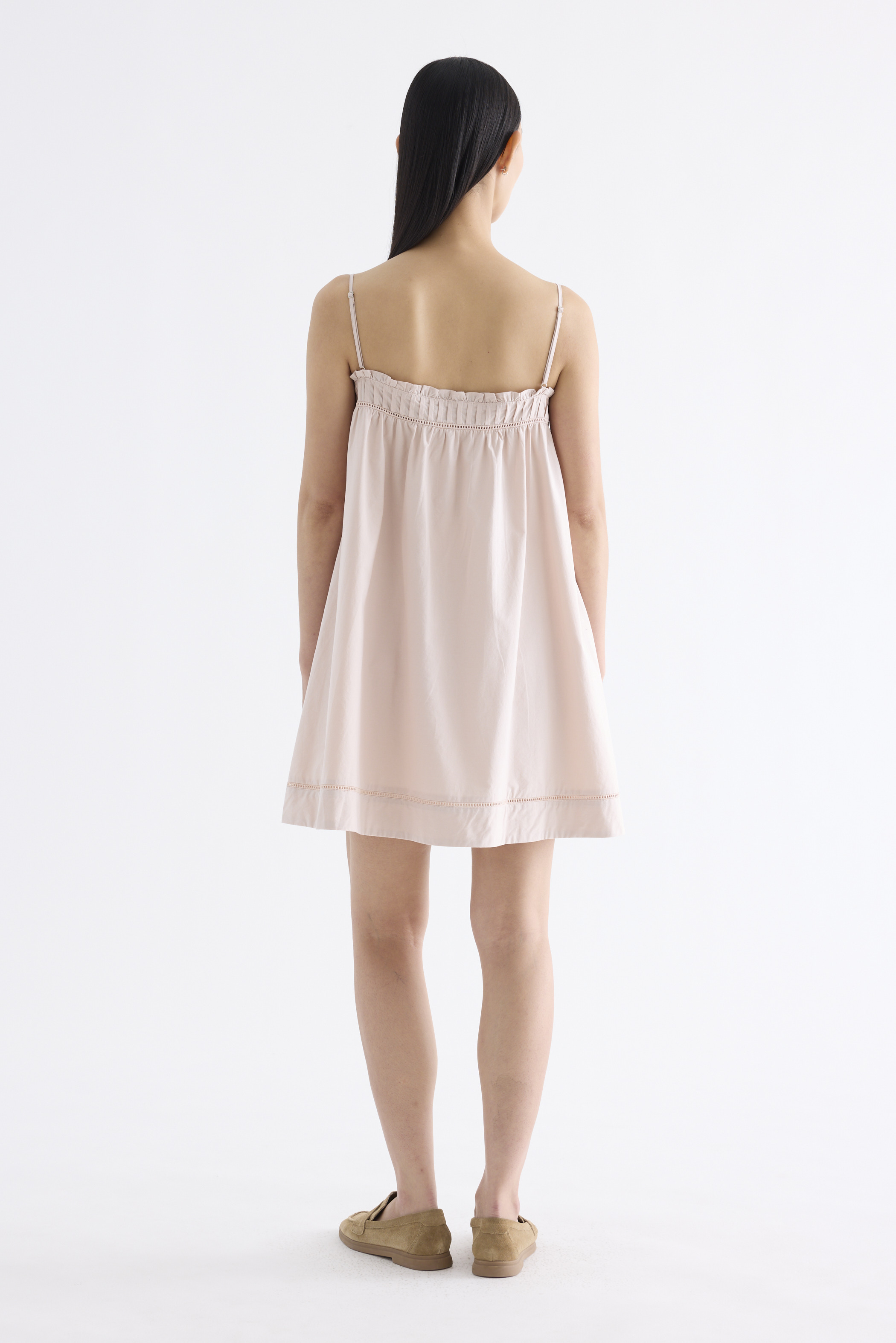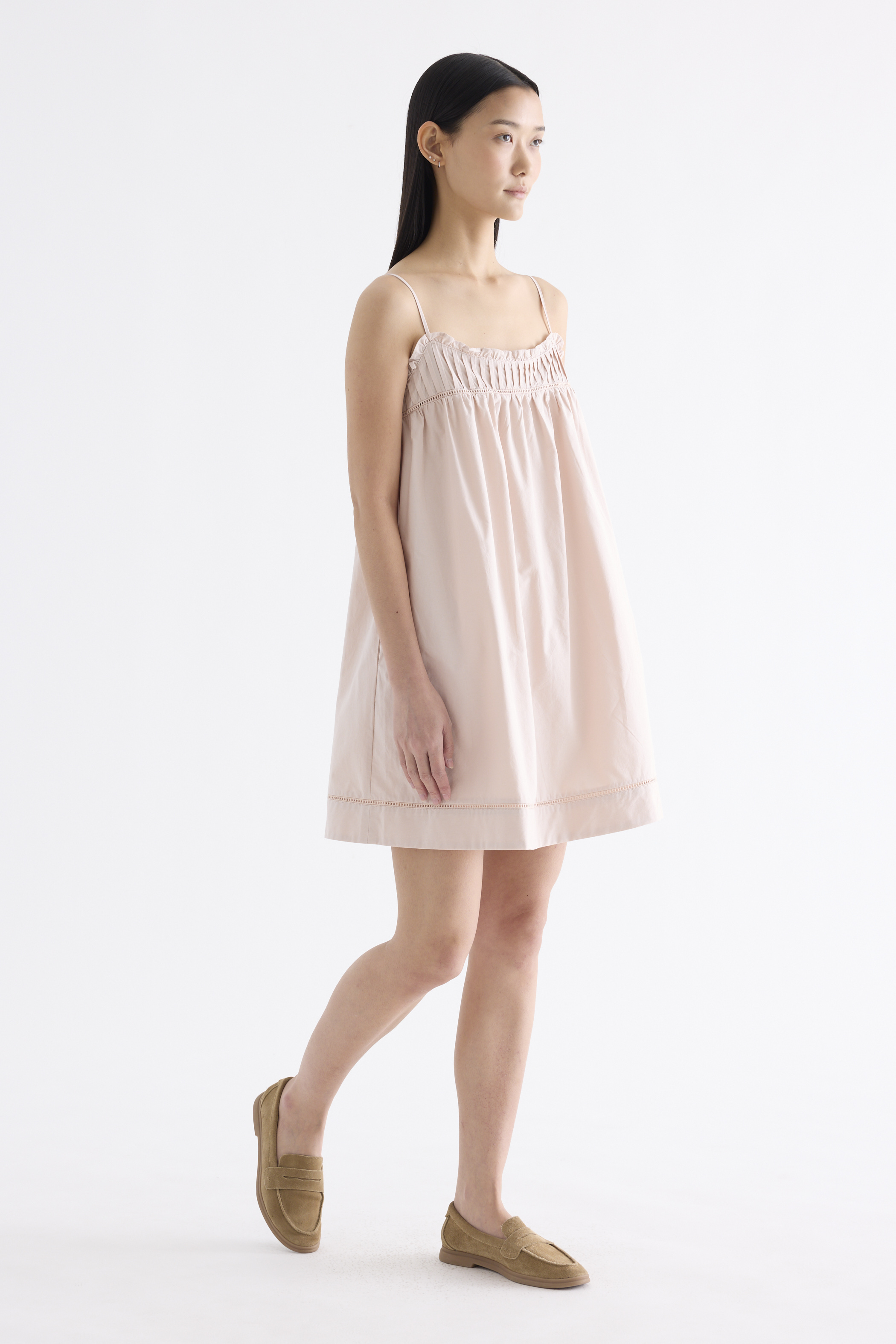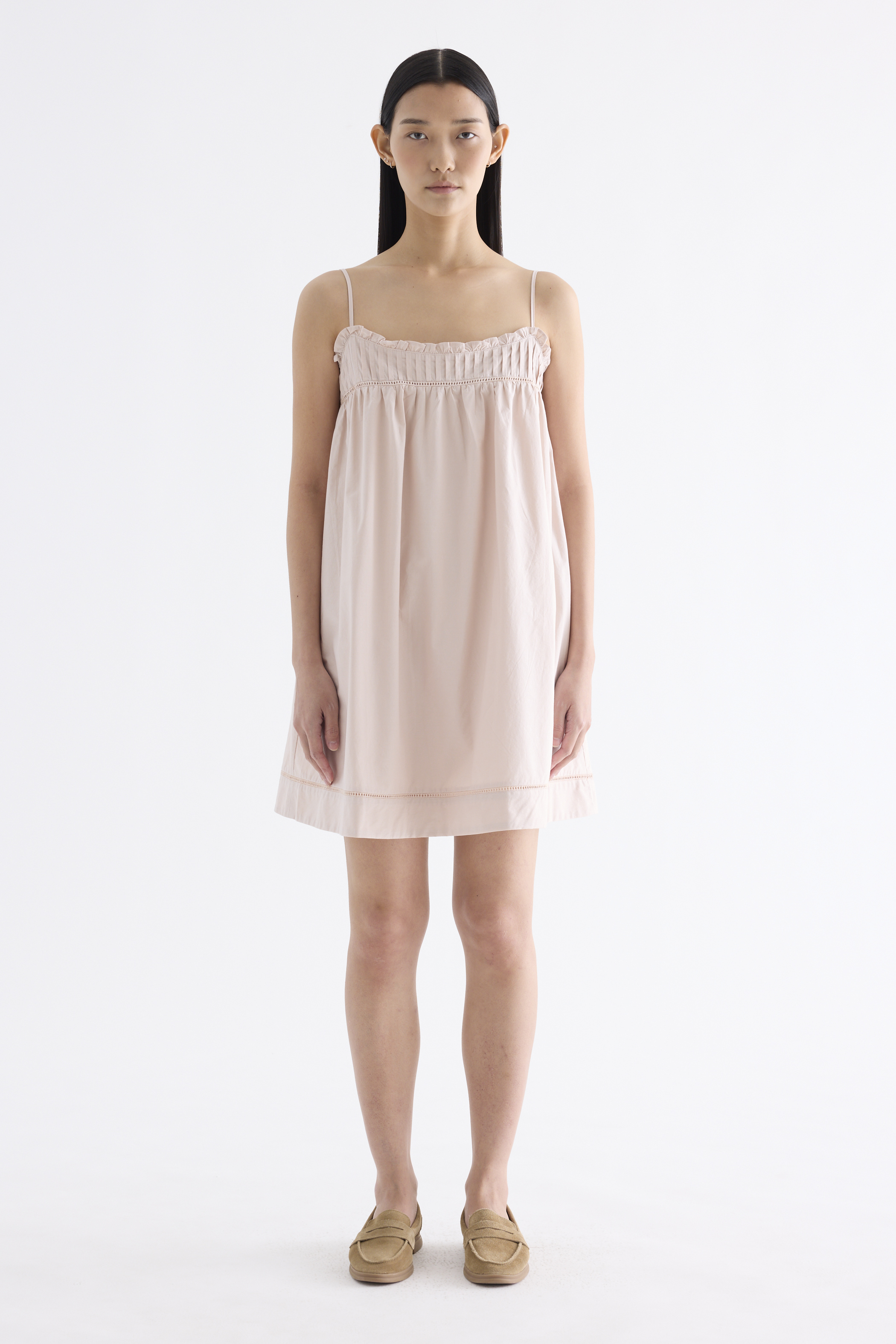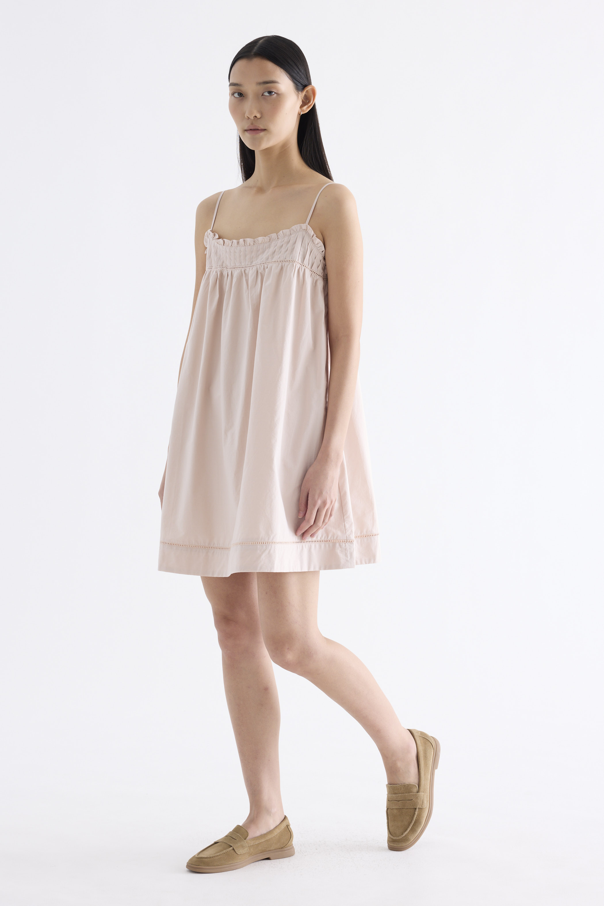 Cooler picks. Made from crisp and softly structured cotton, this sleeveless dress features an empire silhouette with slim adjustable shoulder straps, a frill-trimmed neckline, a pleated bust and lace detailing. Fits above the knee with a side zip closure.