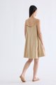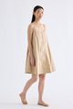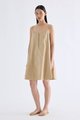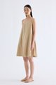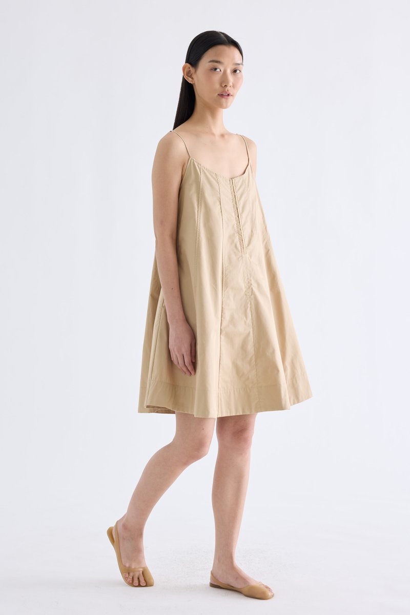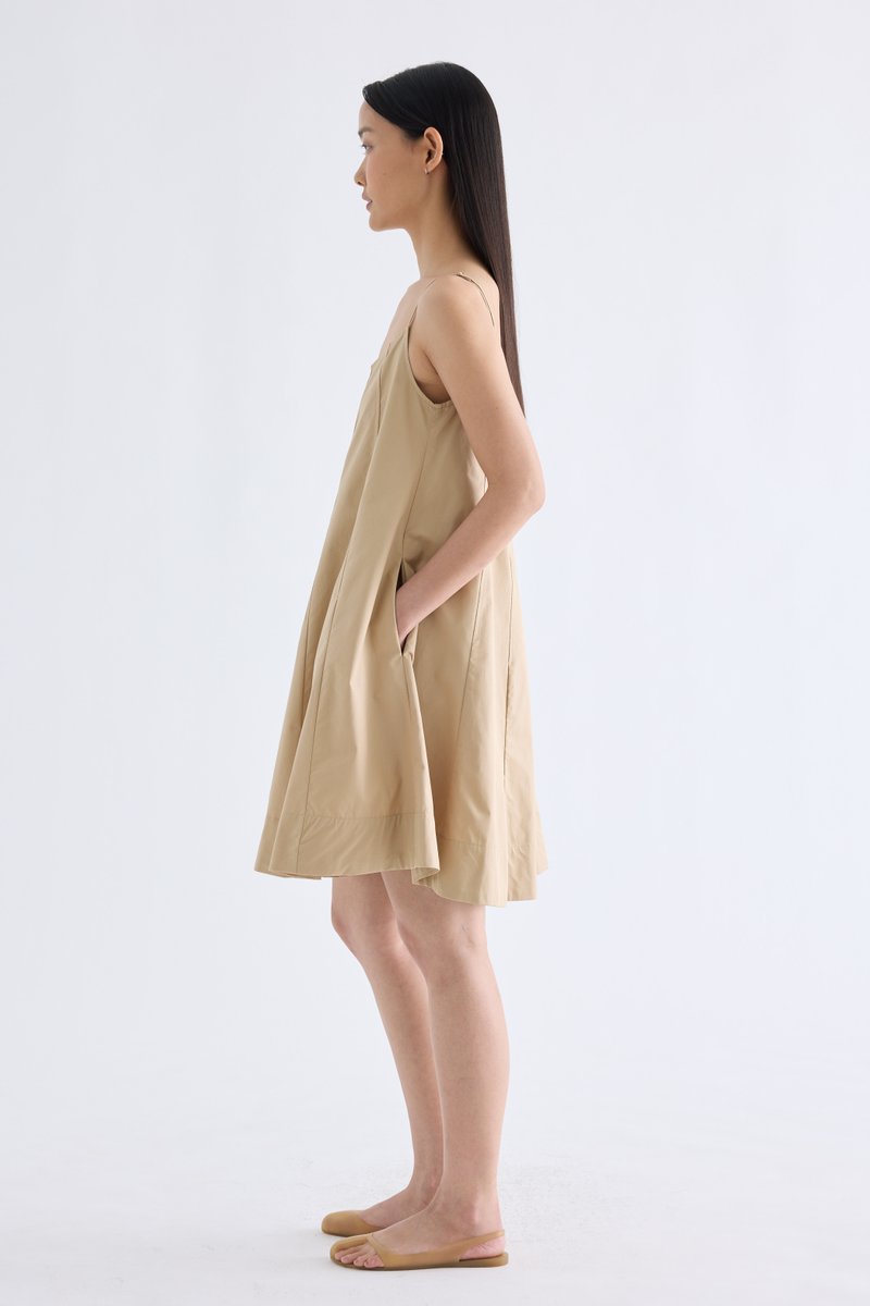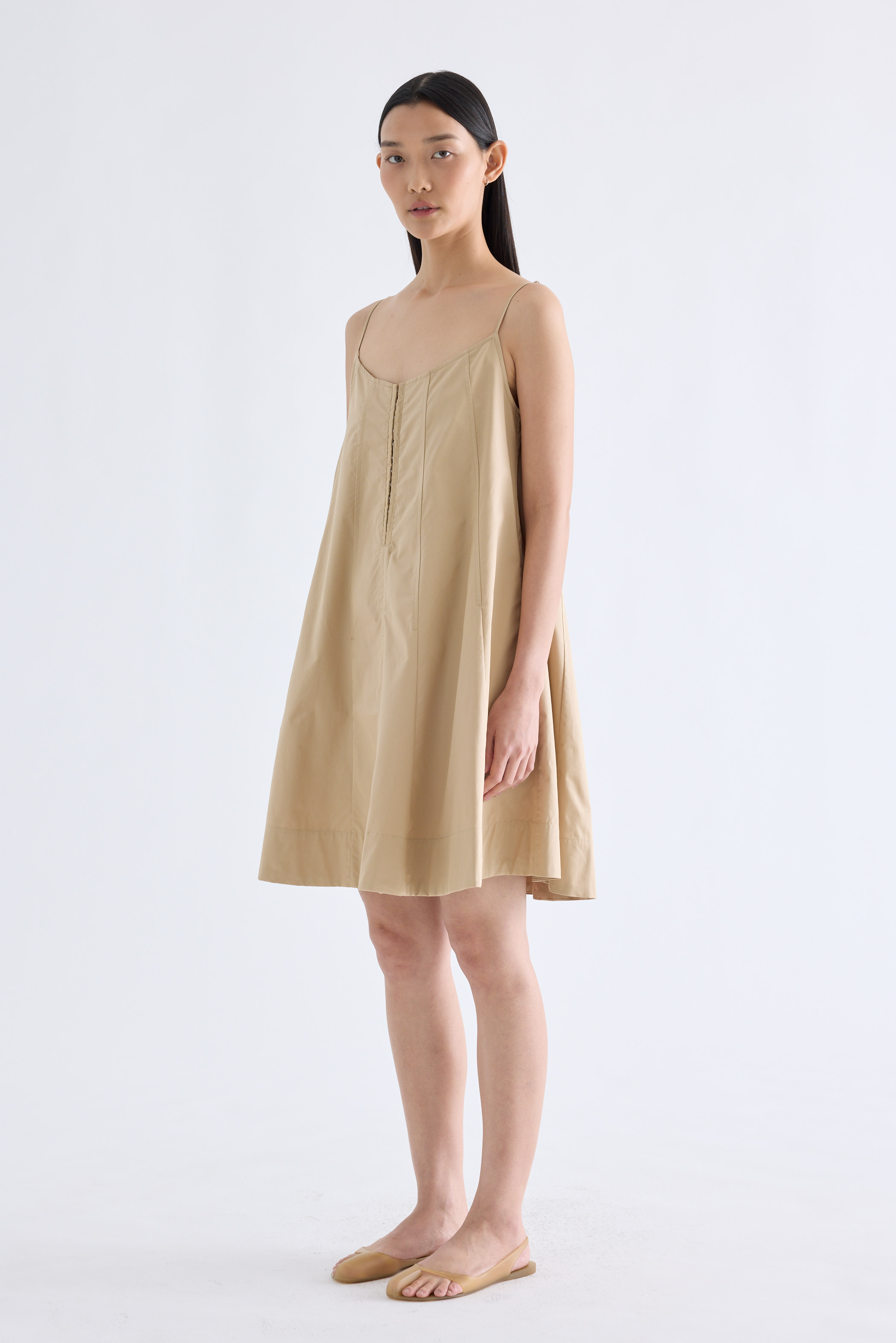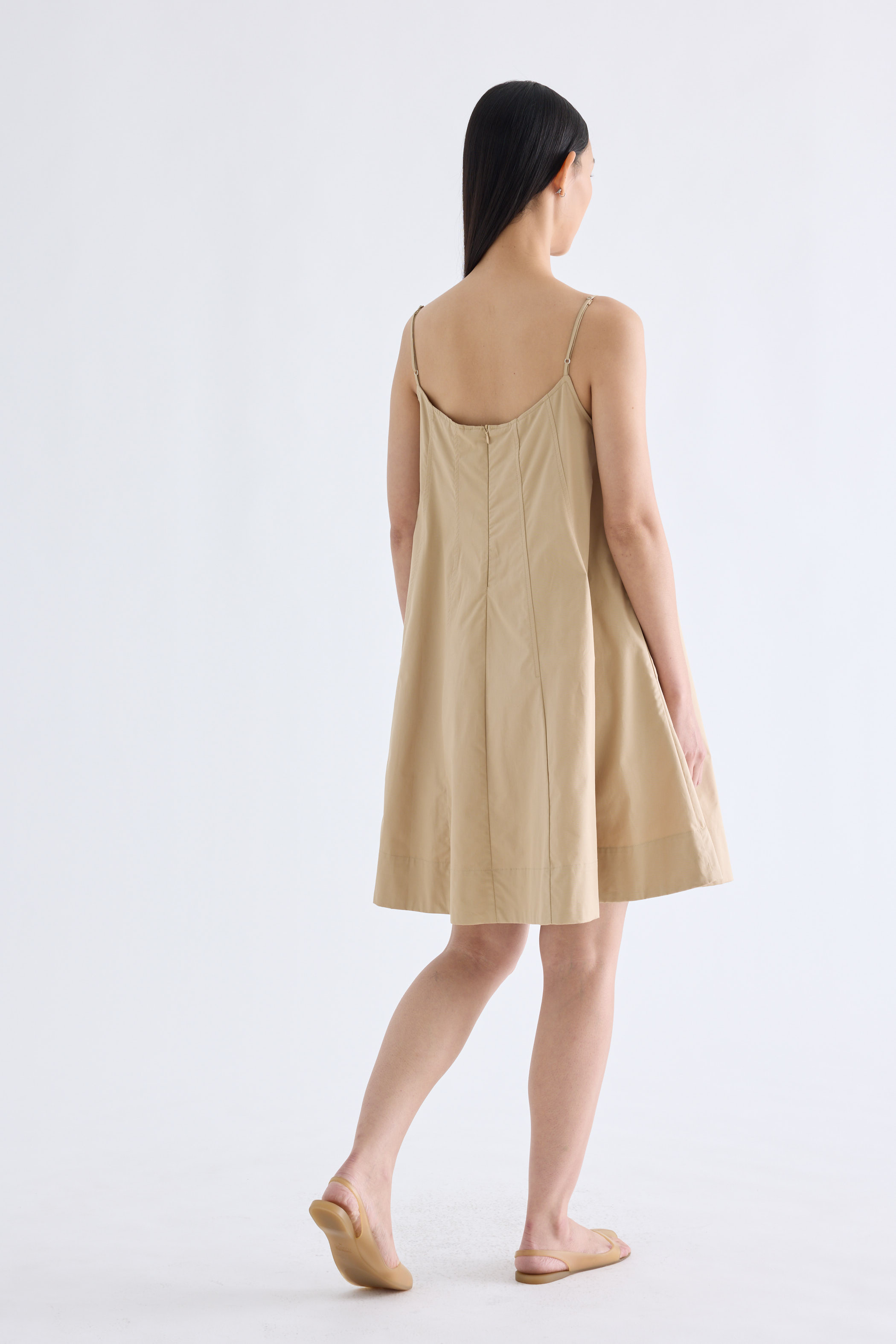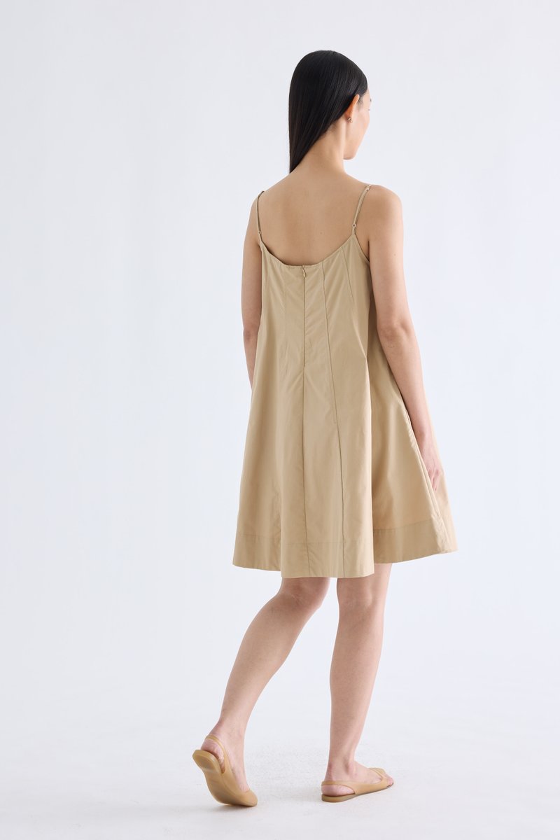 Go with the flow. Made from crisp and softly structured cotton, this sleeveless dress features a flared, panelled silhouette with front hook-and-eye closures, slim adjustable shoulder straps, a straight neckline and a back zip closure. Fits relaxed and above the knee.