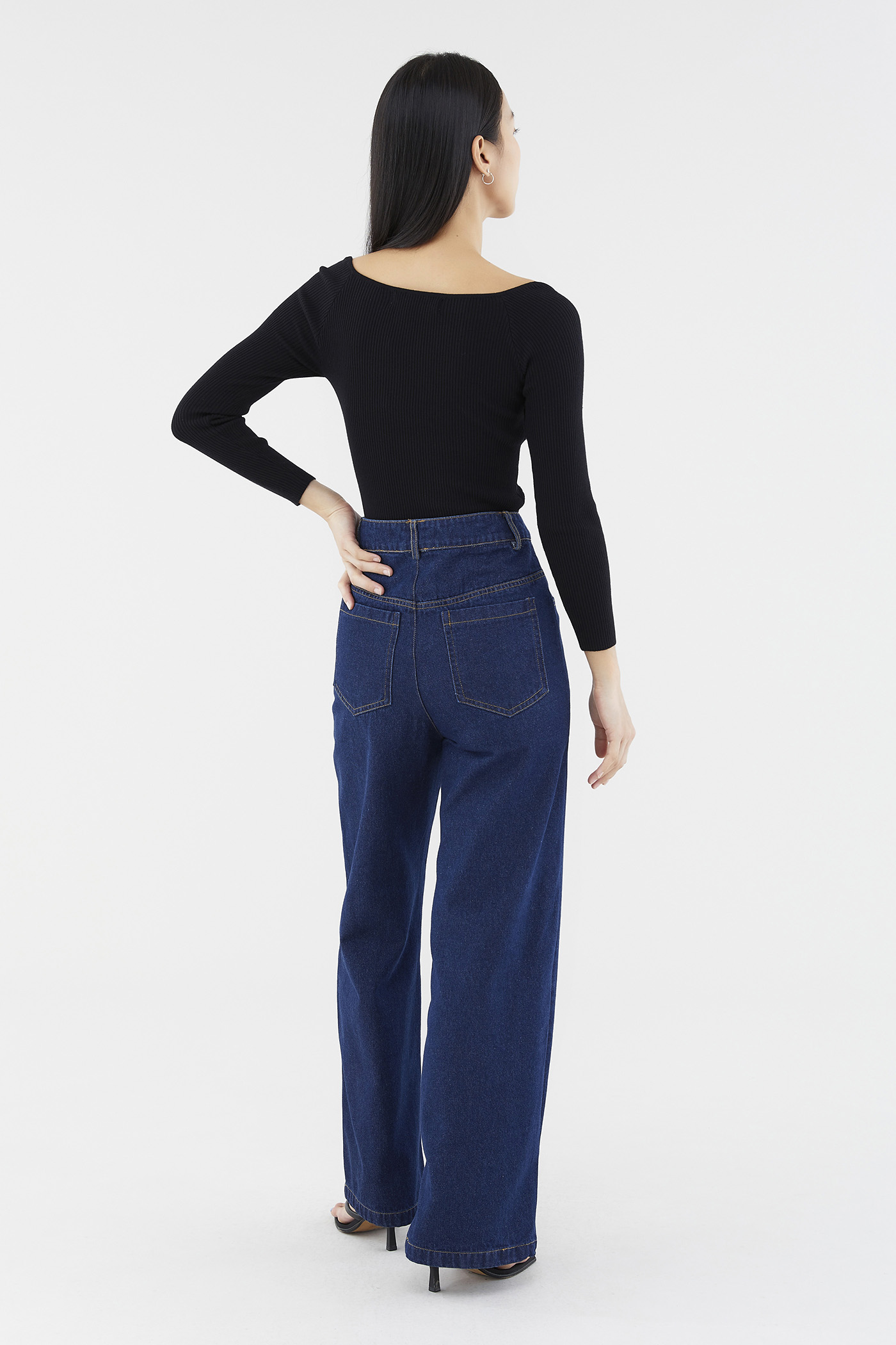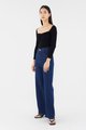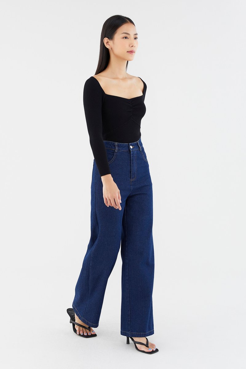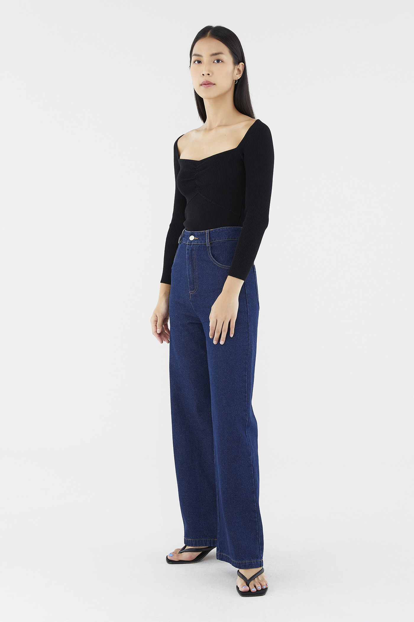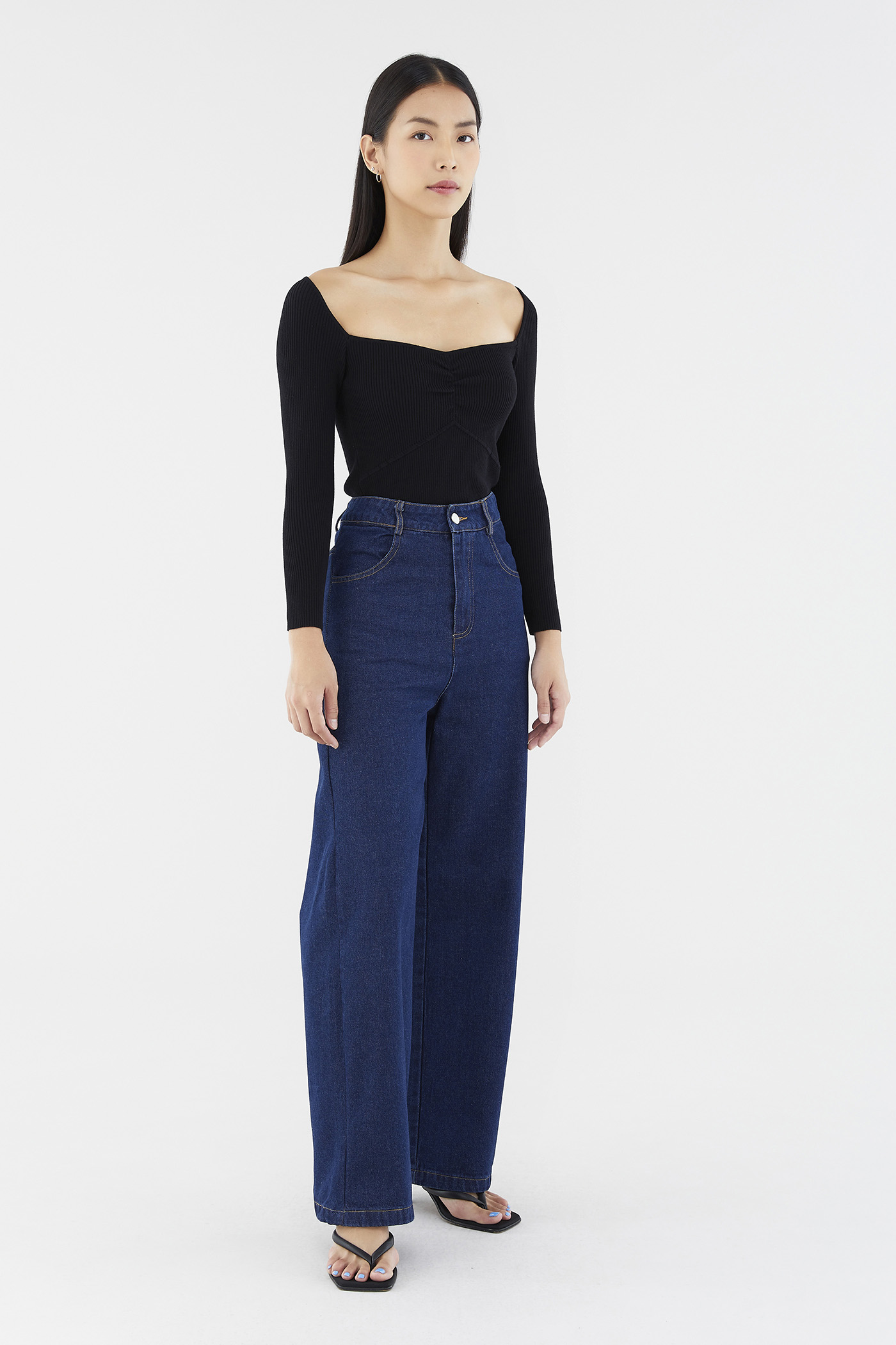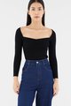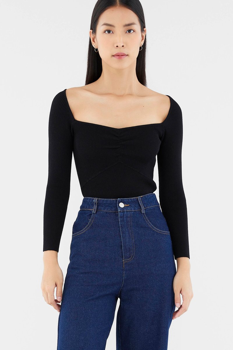 Sleek and cosy. Cut from soft and ribbed knit, this long-sleeved top features a wide sweetheart neckline, ruched front and seam detail beneath the bust. Worn in a slim fit.