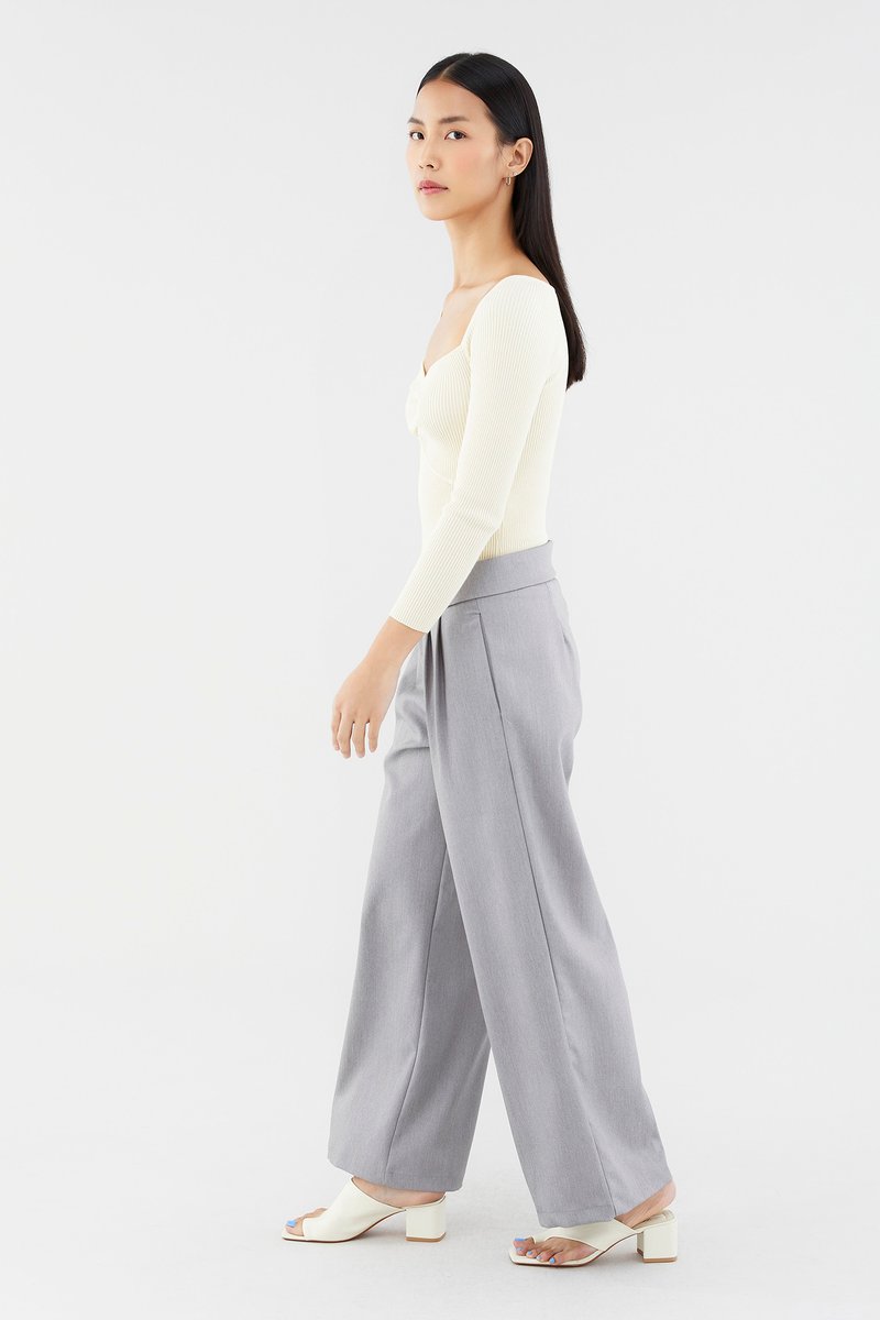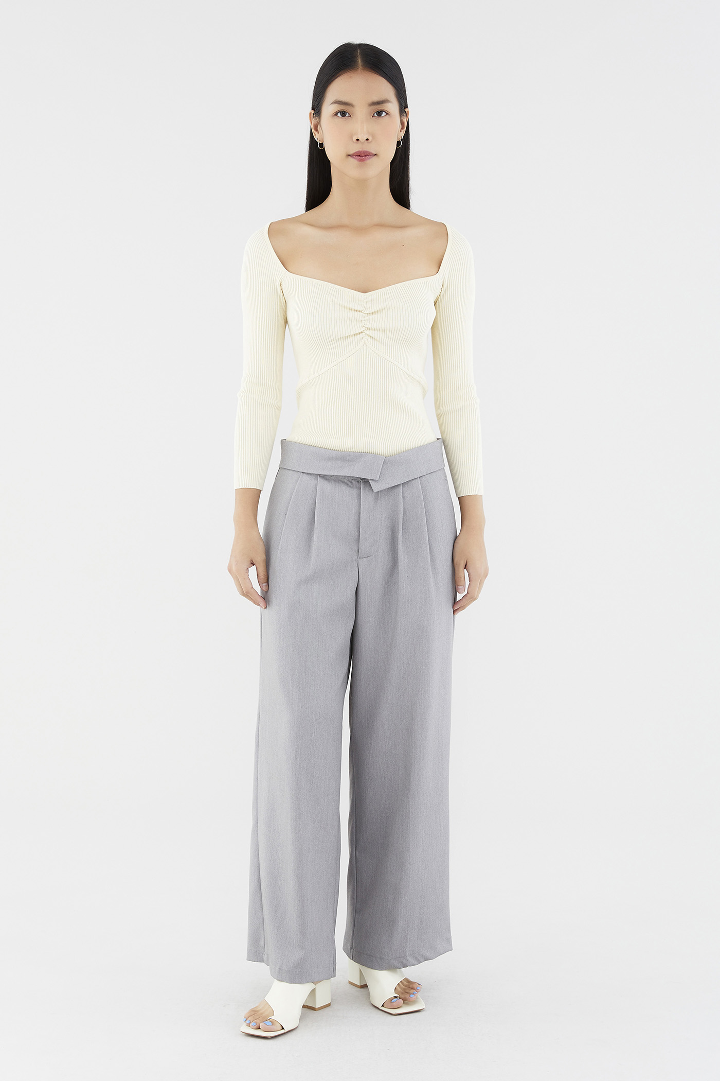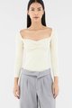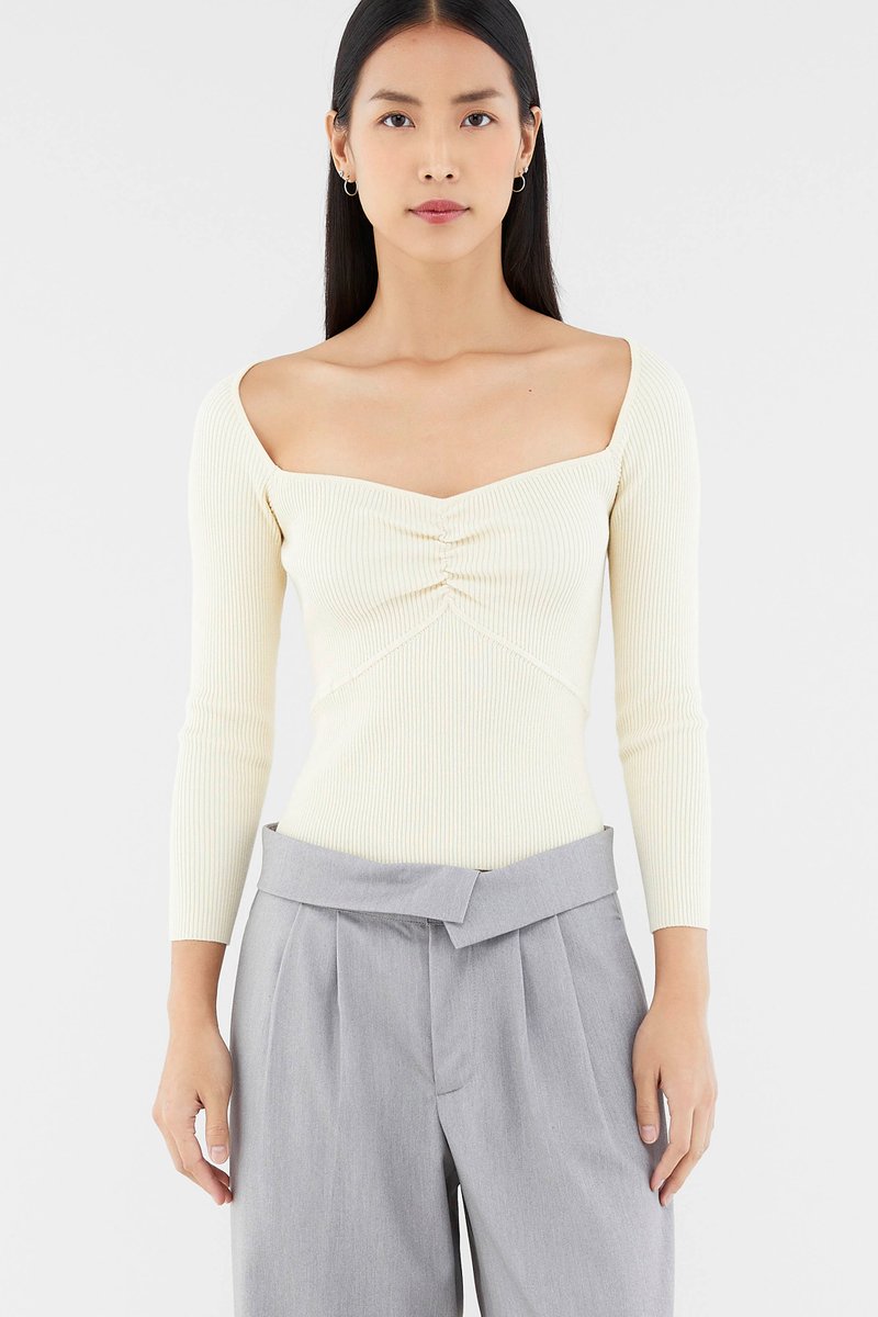 Sleek and cosy. Cut from soft and ribbed knit, this long-sleeved top features a wide sweetheart neckline, ruched front and seam detail beneath the bust. Worn in a slim fit.