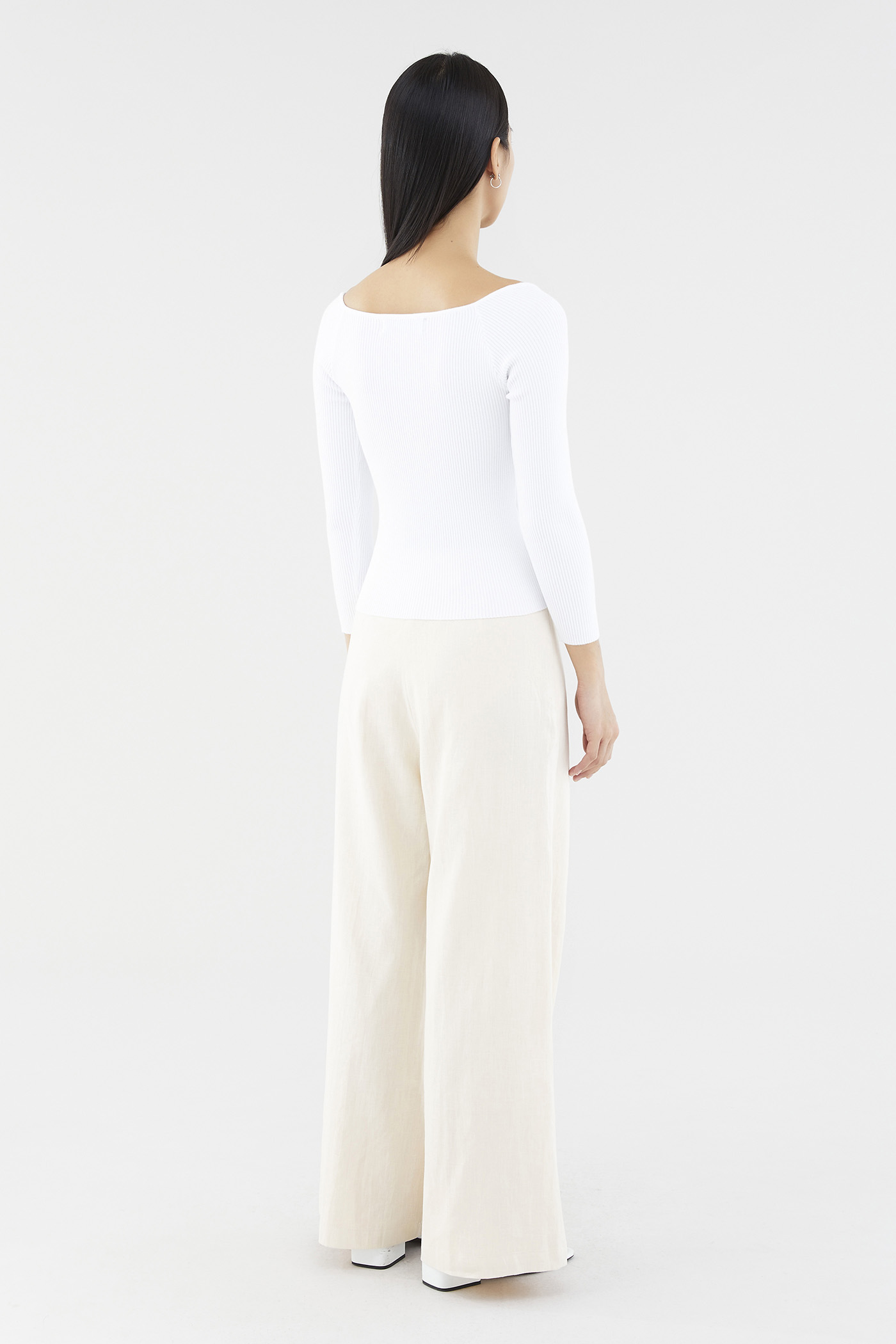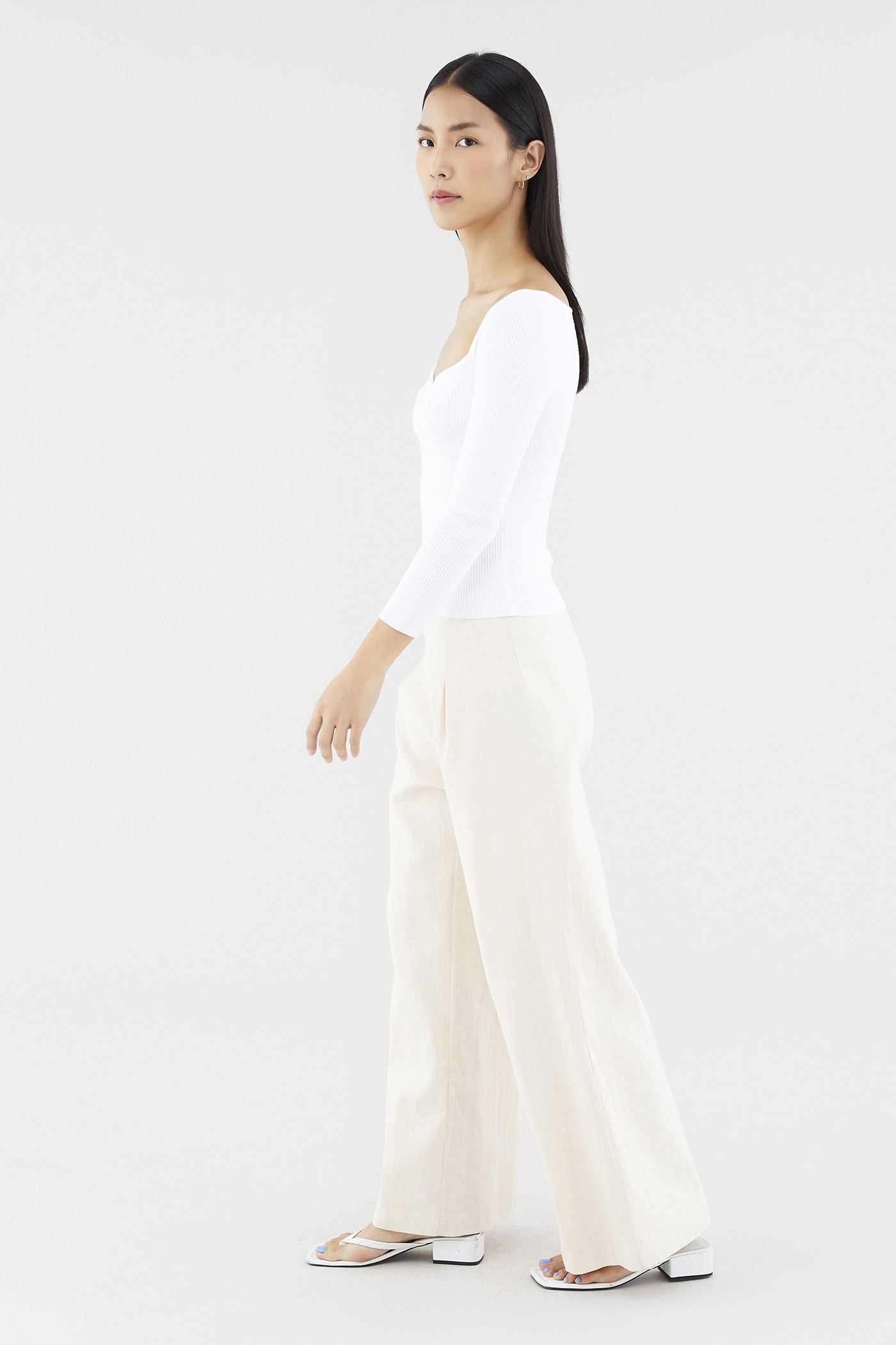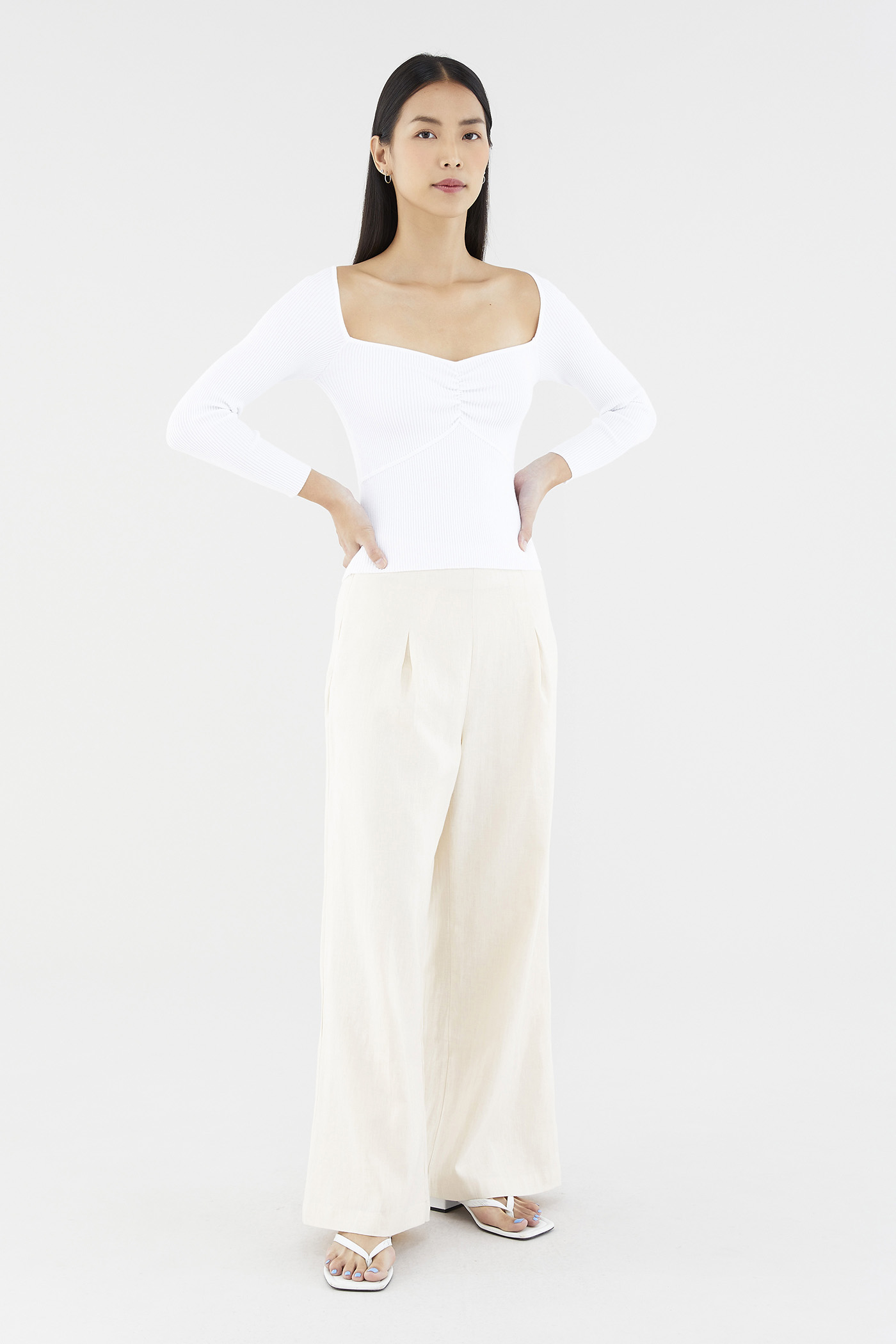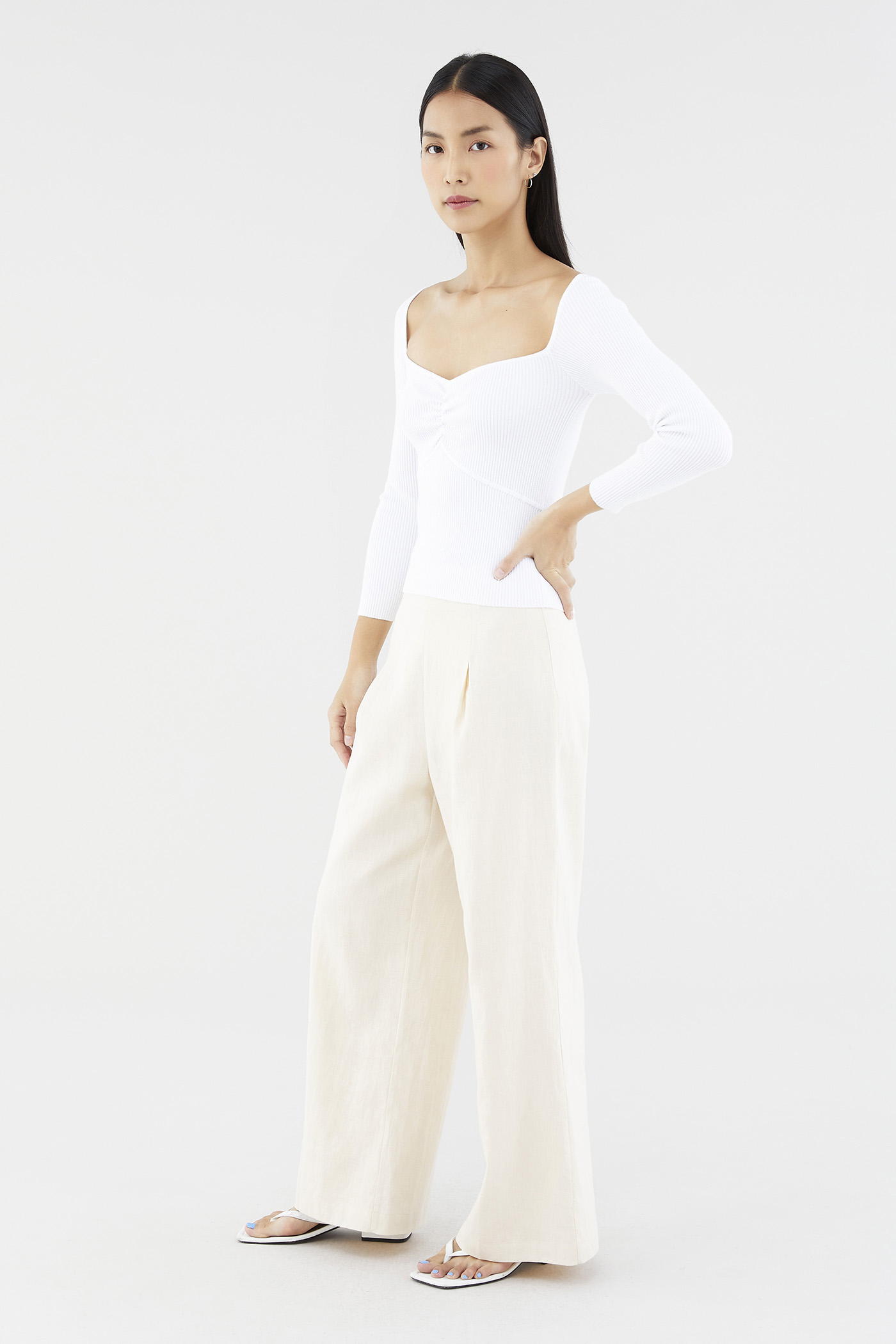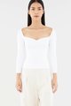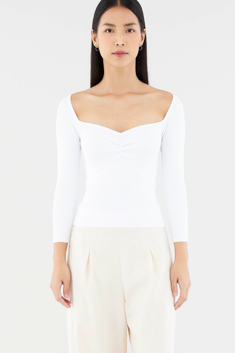 Sleek and cosy. Cut from soft and ribbed knit, this long-sleeved top features a wide sweetheart neckline, ruched front and seam detail beneath the bust. Worn in a slim fit.