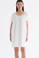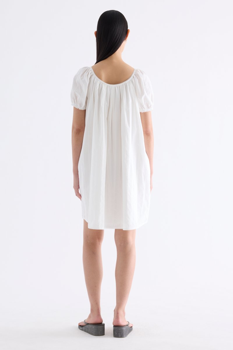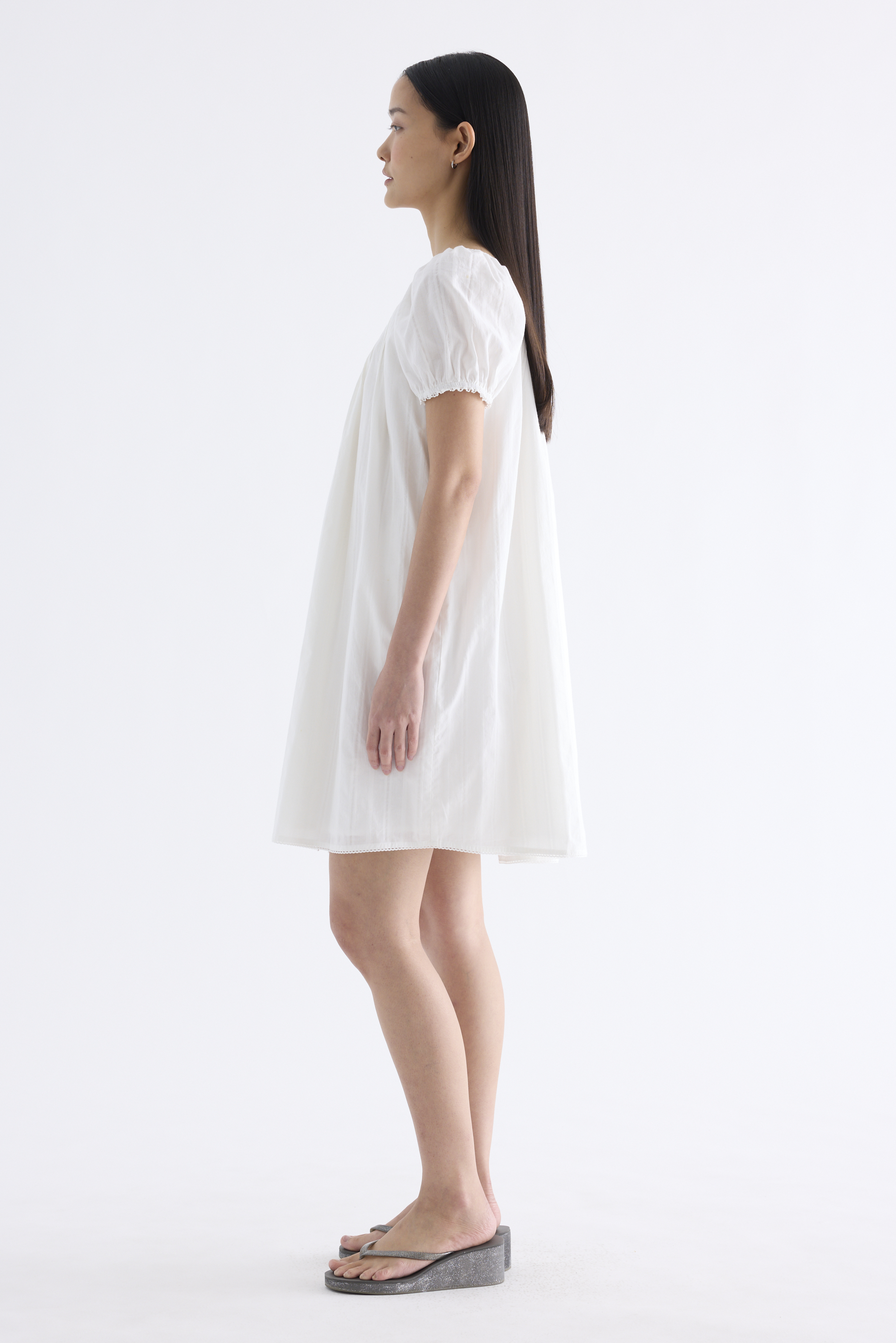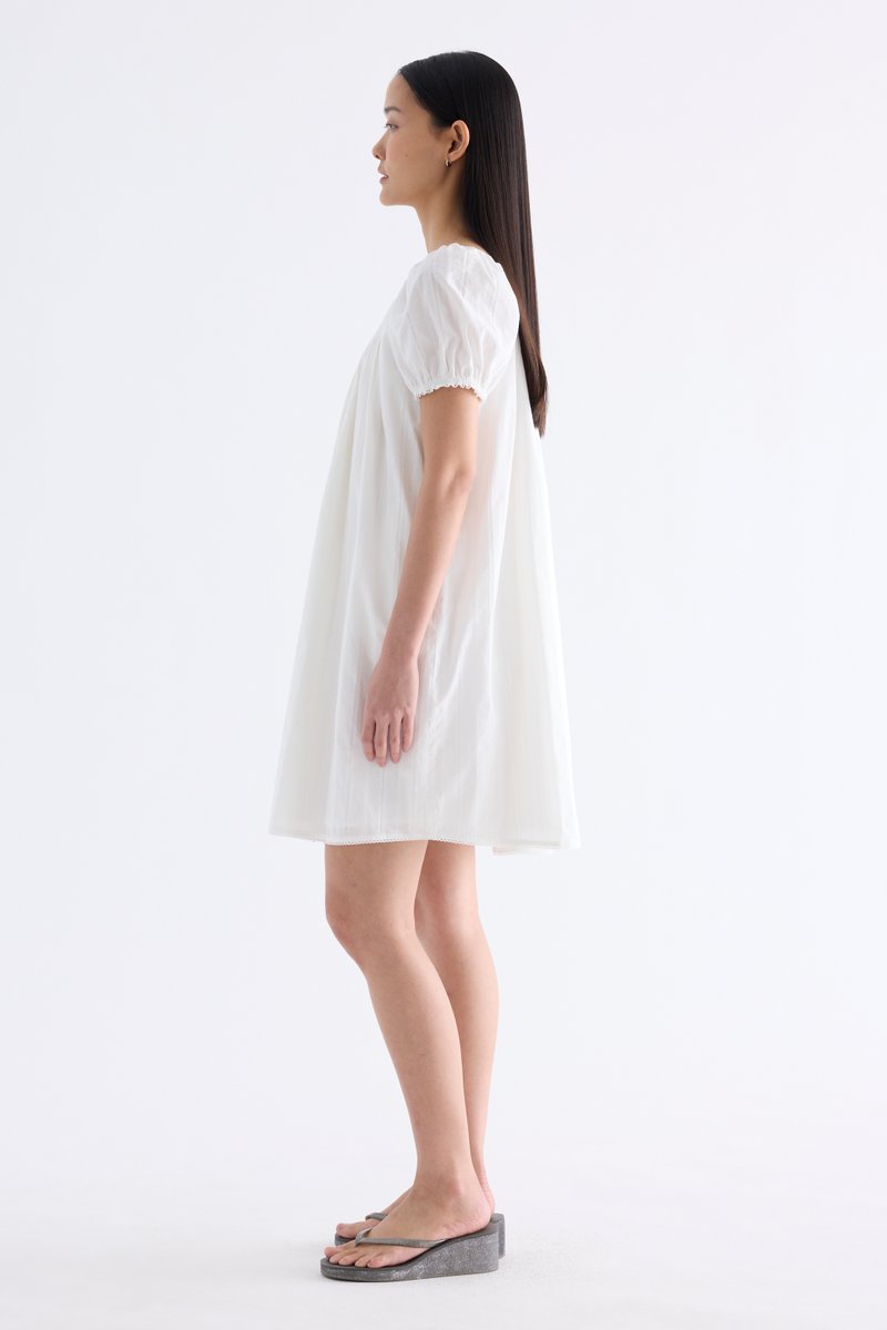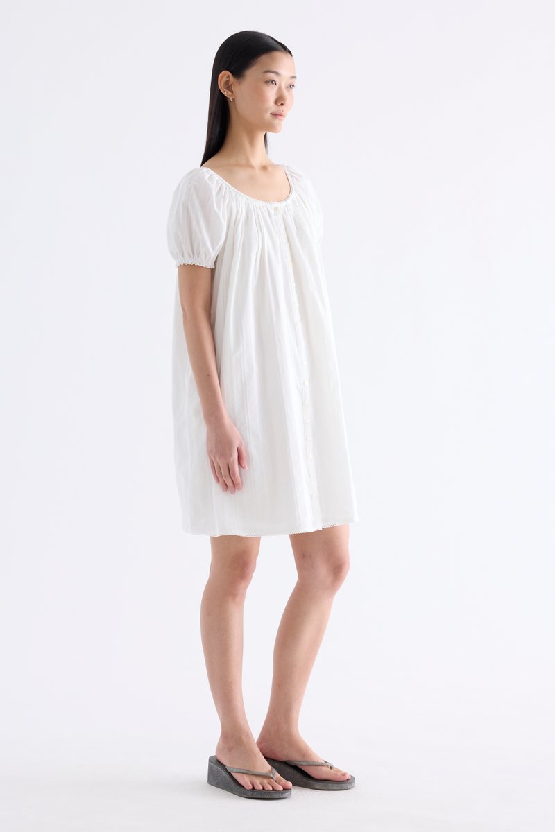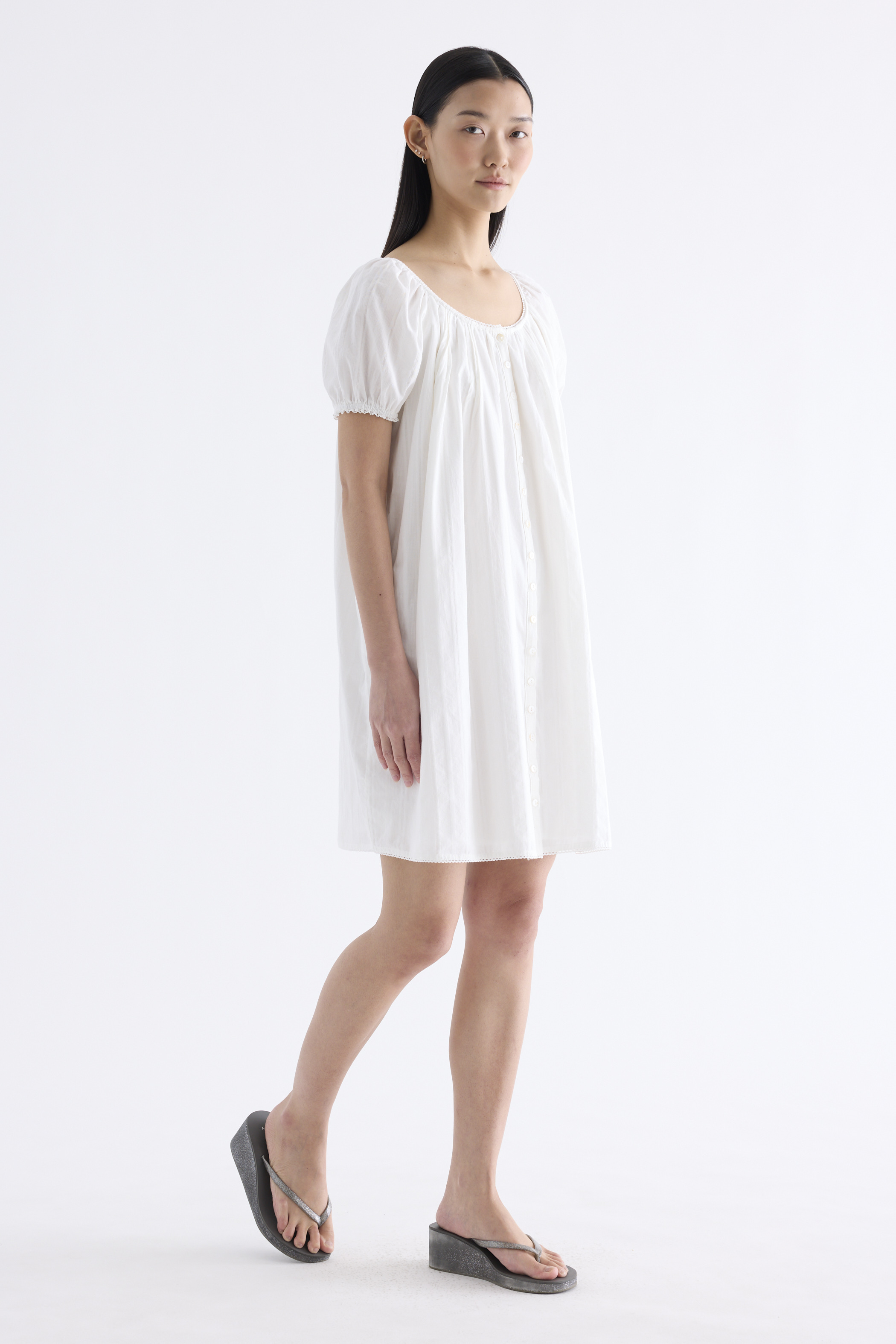 Free and easy. Made from airy and softly structured cotton, this dress features a wide lace-trimmed neckline, short puffy sleeves with elasticated lace-trimmed cuffs and a button-down front. Fits relaxed and above the knee.