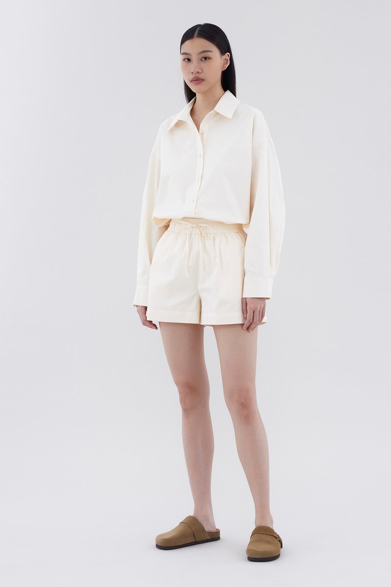 Cool meets comfy. Cut from smooth cotton with a structured drape, these shorts feature an elasticated drawstring waistband and slightly flared legs. Worn in a relaxed fit.