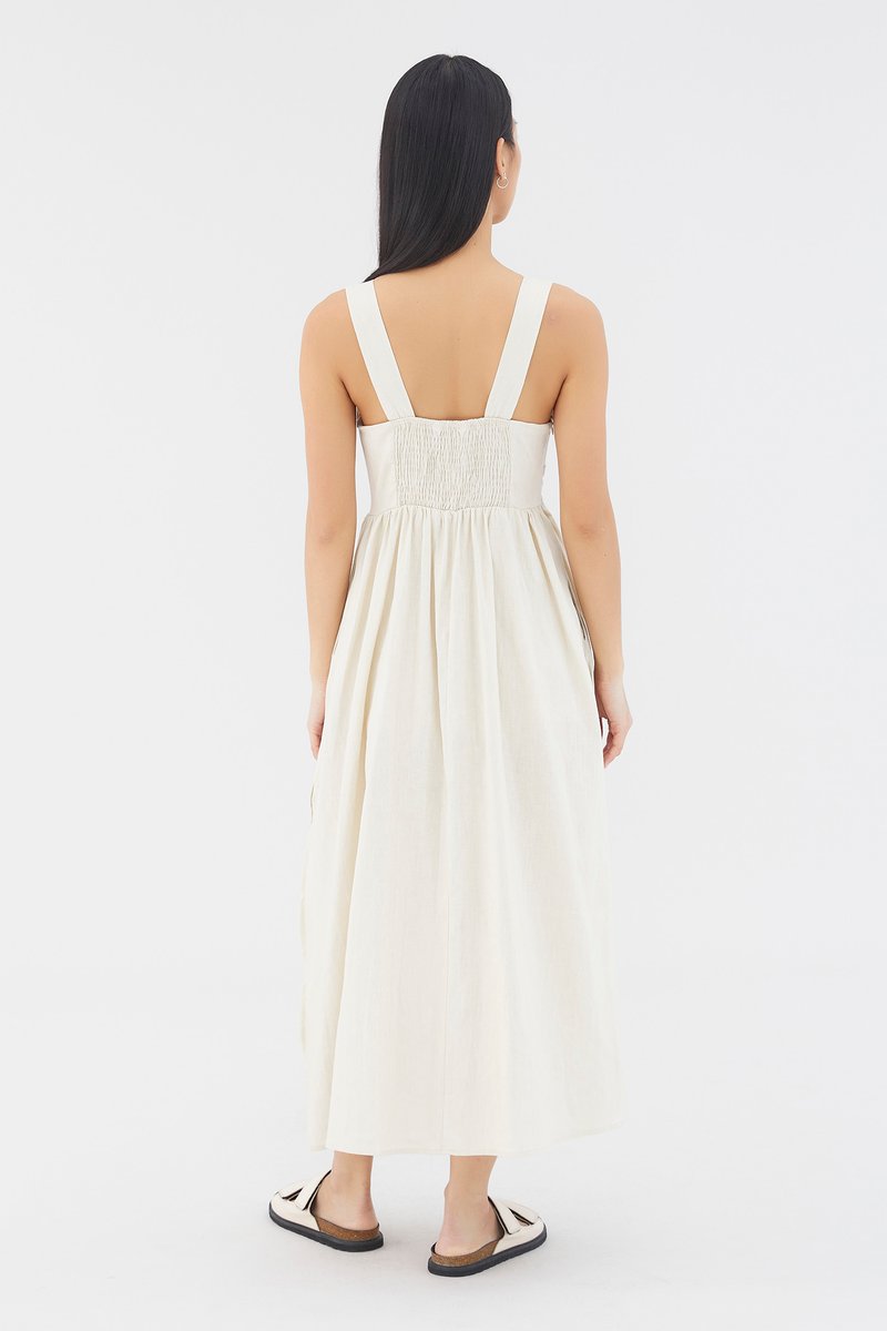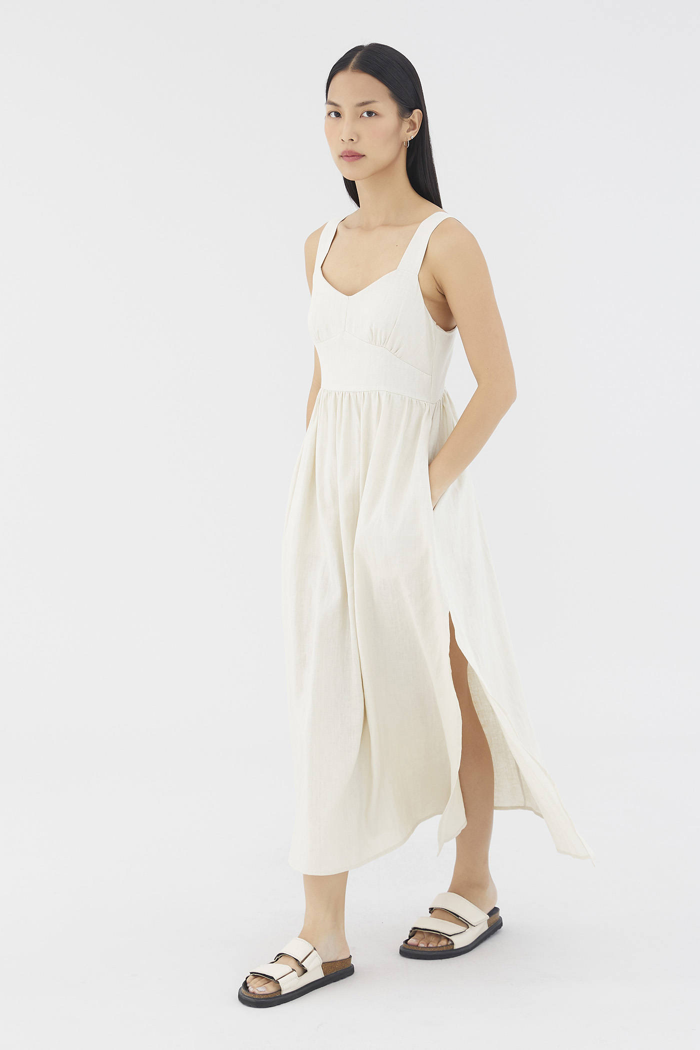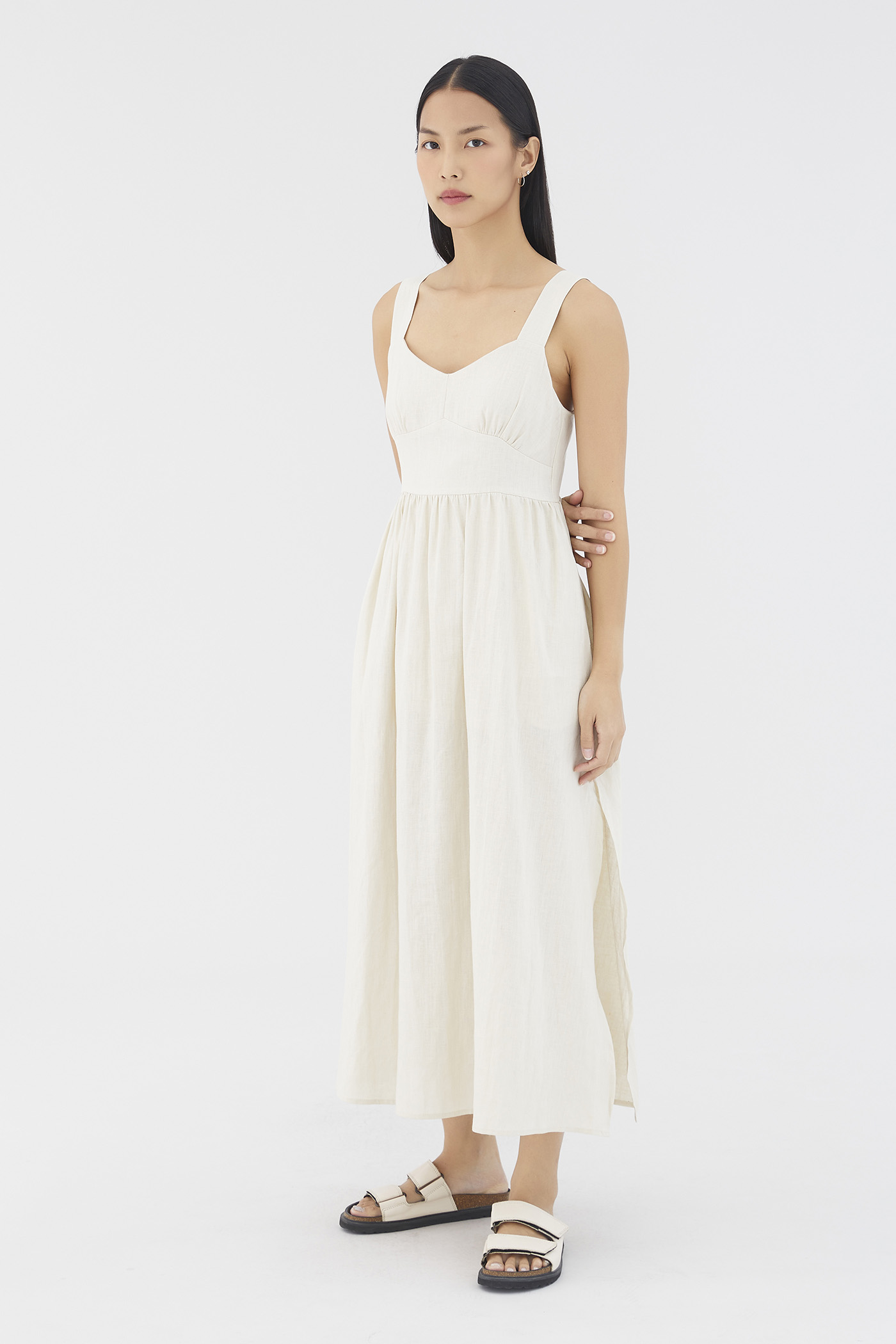 Occasion ready. Cut from airy and softly structured 100% linen, this sleeveless maxi dress features a dipped neckline, wide shoulder straps, a broad waist panel, a partially smocked back and a side zip closure. Worn in an A-line silhouette that fits slimmer through the bodice before flowing out in a relaxed skirt.