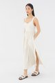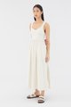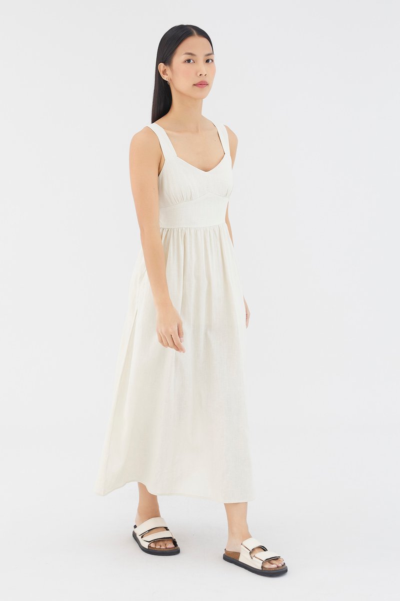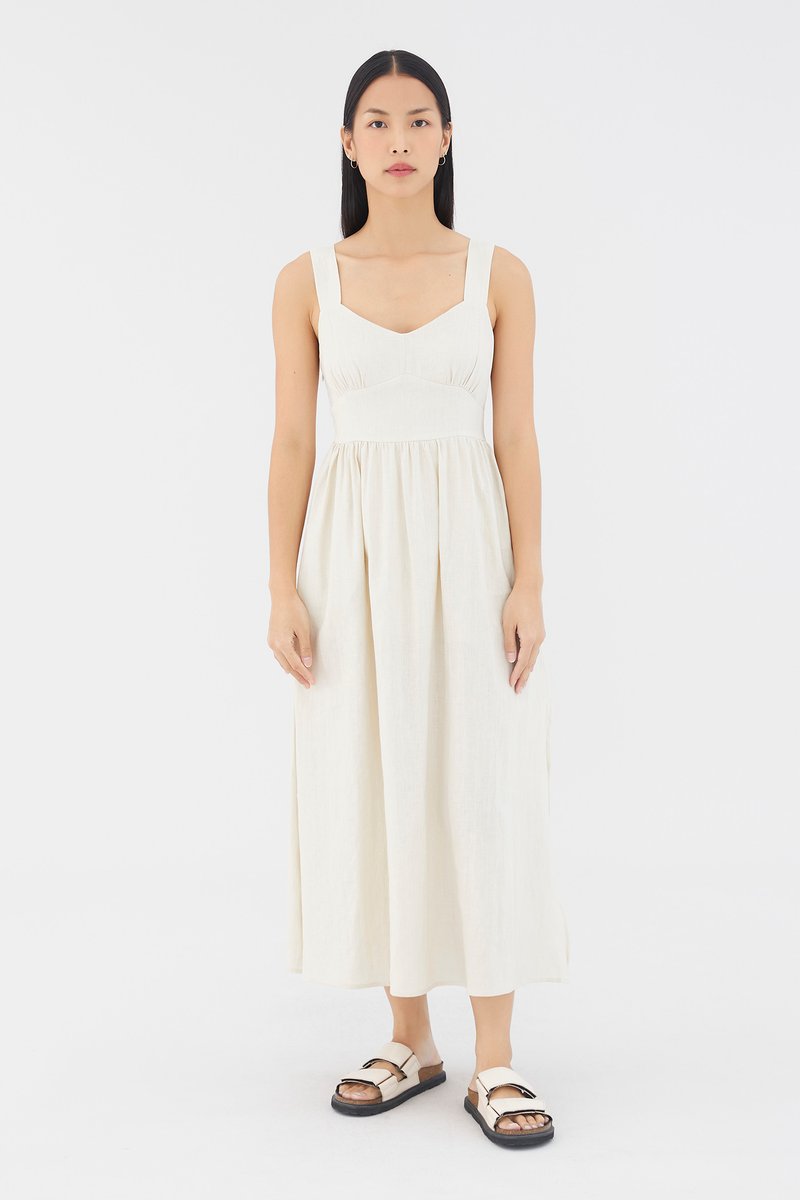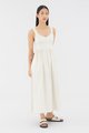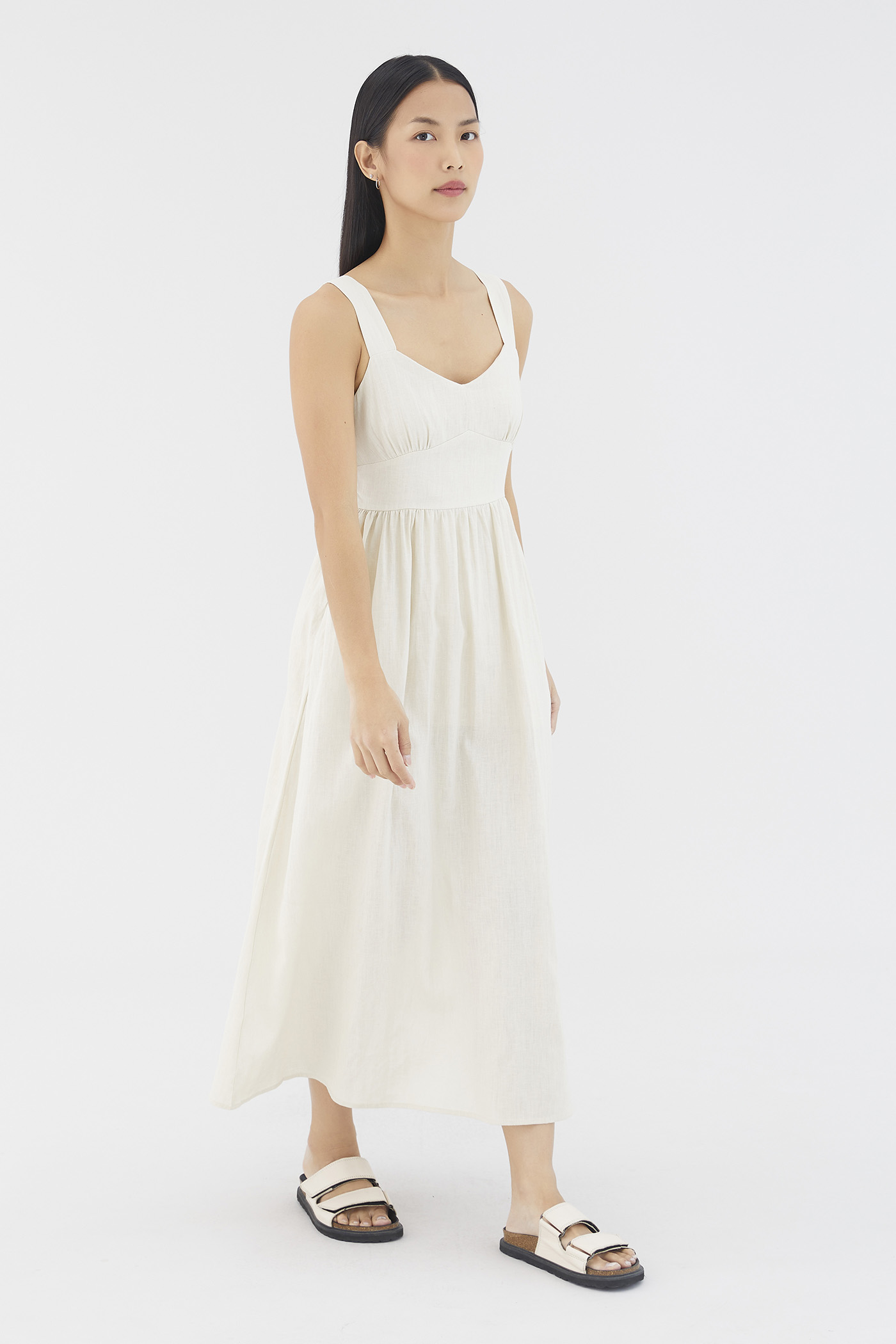 Occasion ready. Cut from airy and softly structured 100% linen, this sleeveless maxi dress features a dipped neckline, wide shoulder straps, a broad waist panel, a partially smocked back and a side zip closure. Worn in an A-line silhouette that fits slimmer through the bodice before flowing out in a relaxed skirt.