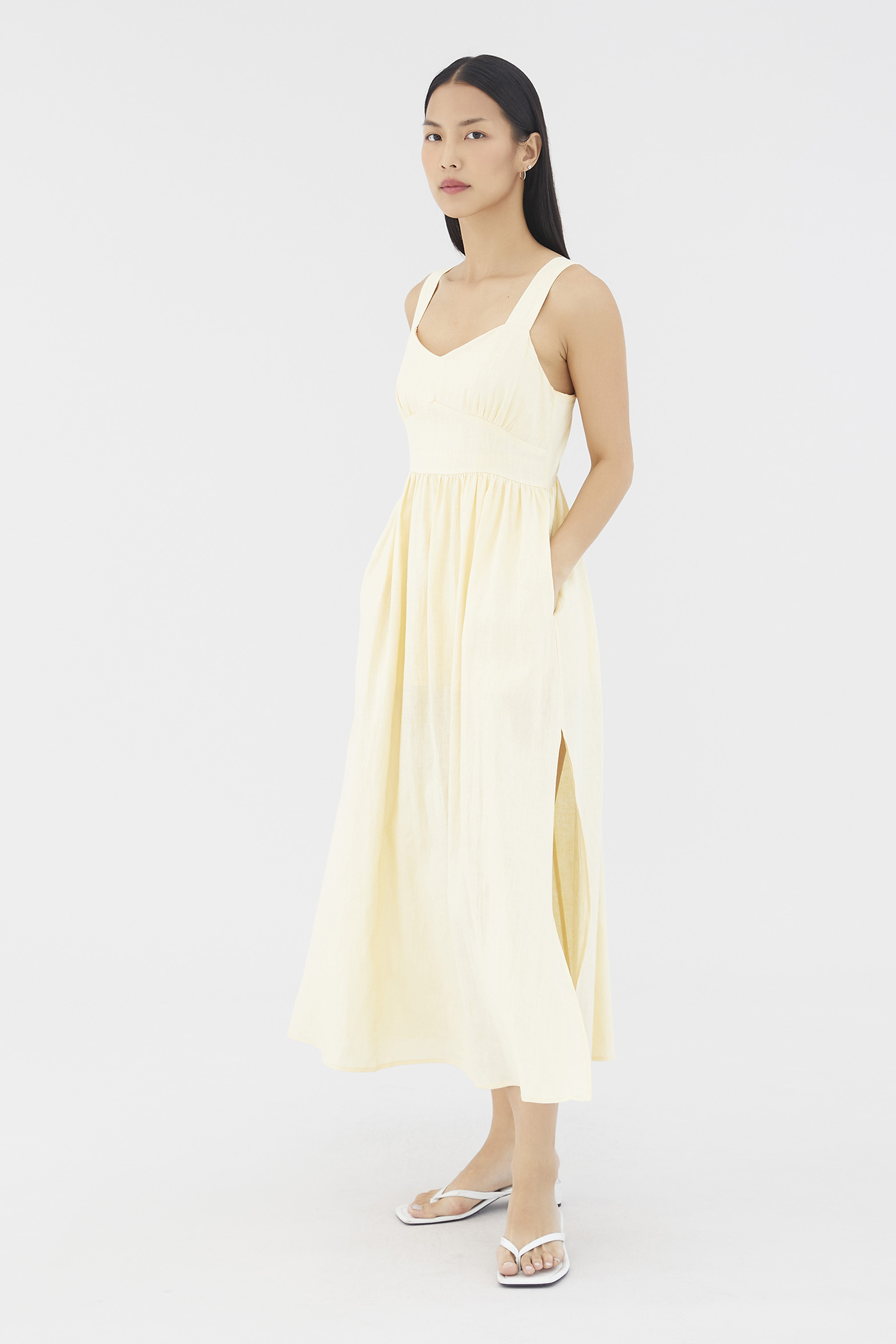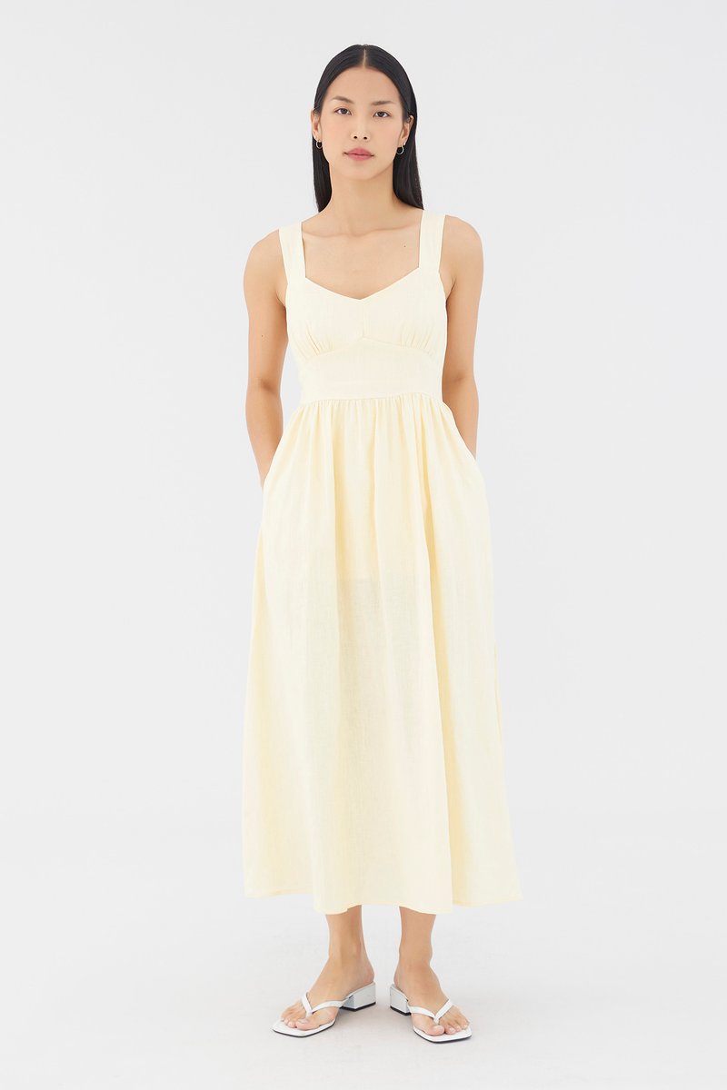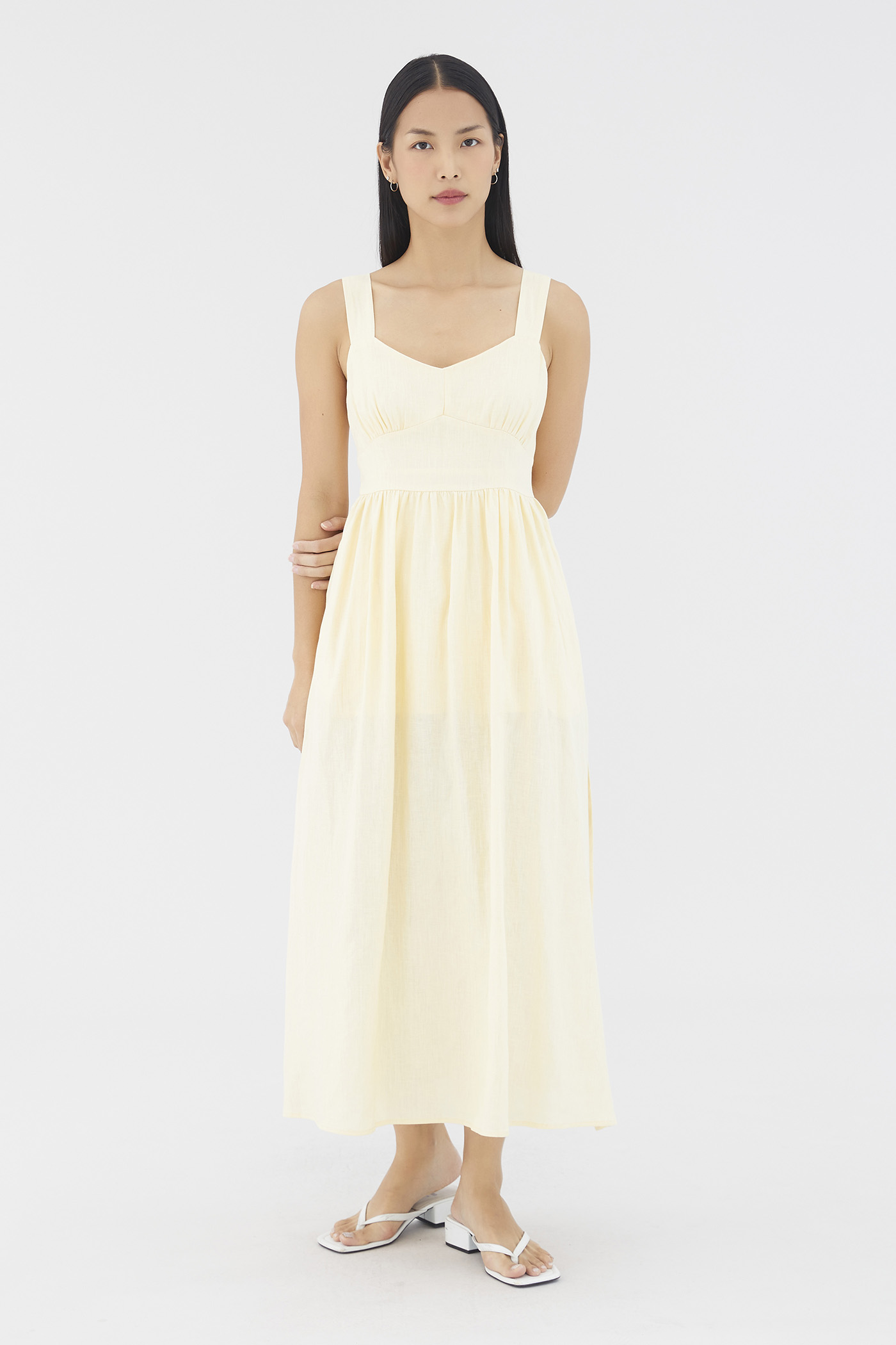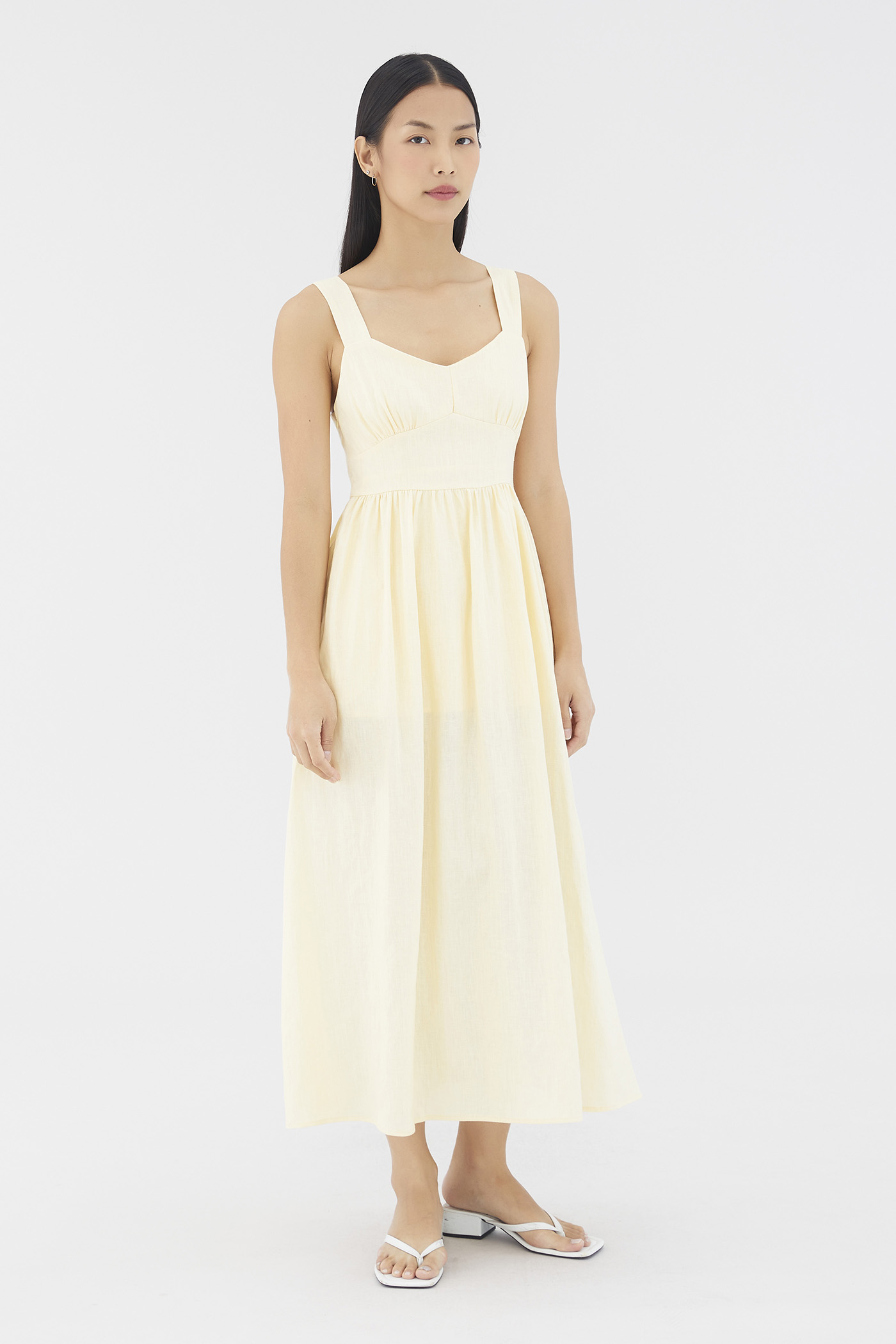 Occasion ready. Cut from airy and softly structured 100% linen, this sleeveless maxi dress features a dipped neckline, wide shoulder straps, a broad waist panel, a partially smocked back and a side zip closure. Worn in an A-line silhouette that fits slimmer through the bodice before flowing out in a relaxed skirt.