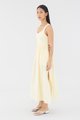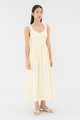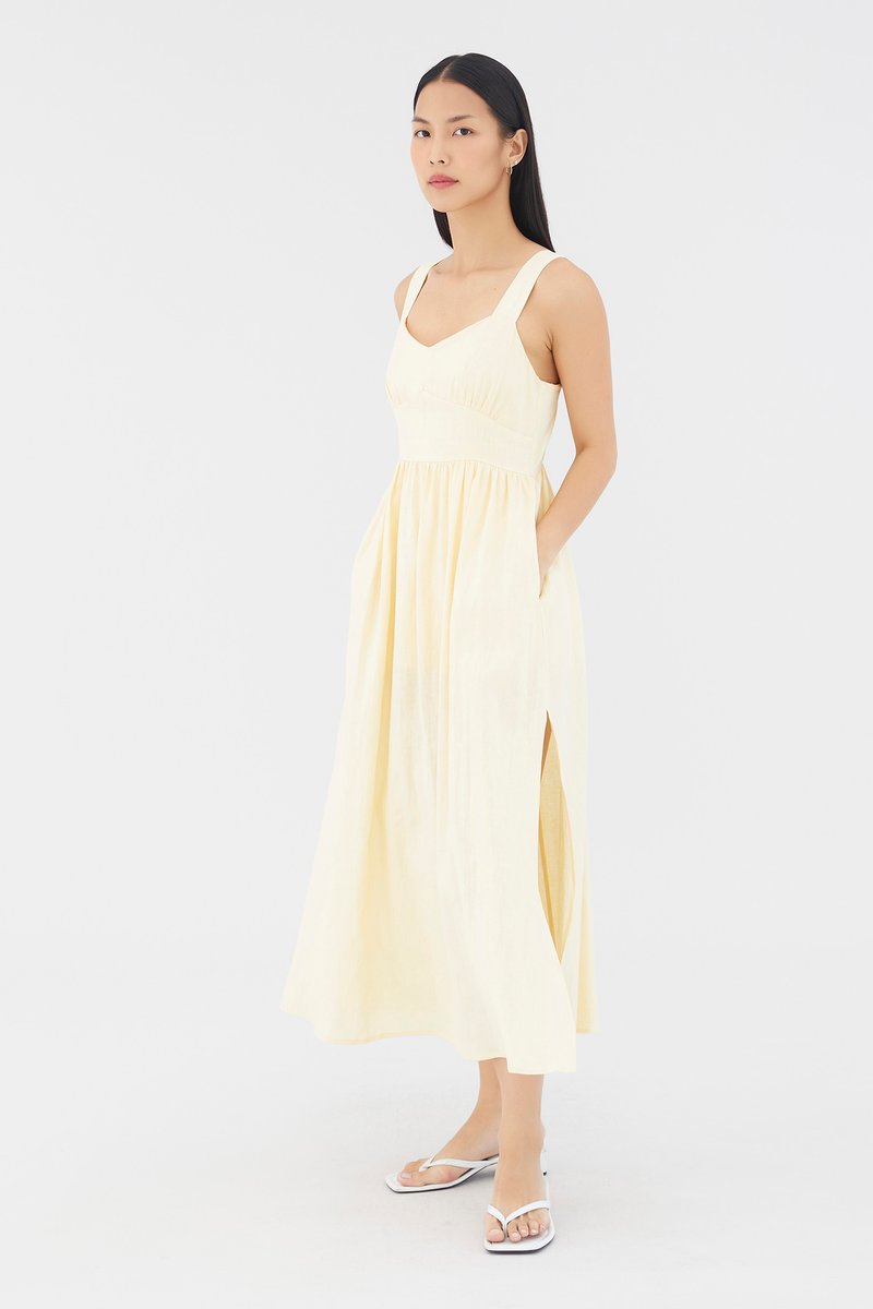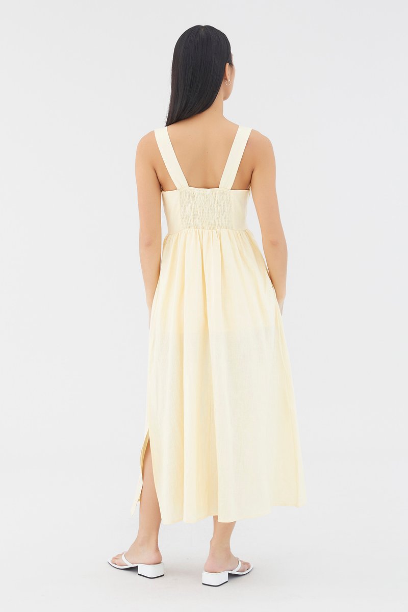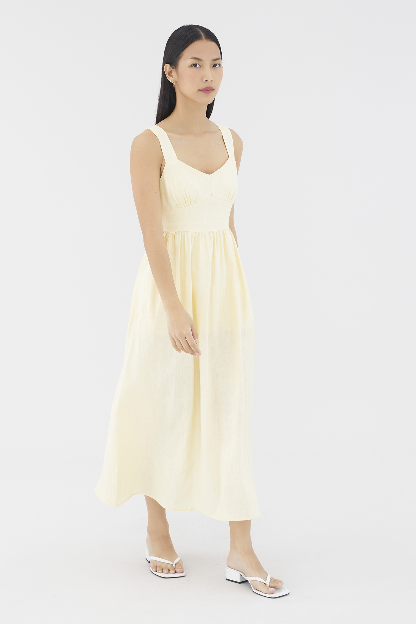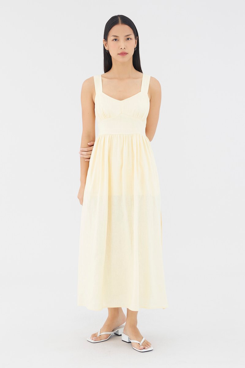 Occasion ready. Cut from airy and softly structured 100% linen, this sleeveless maxi dress features a dipped neckline, wide shoulder straps, a broad waist panel, a partially smocked back and a side zip closure. Worn in an A-line silhouette that fits slimmer through the bodice before flowing out in a relaxed skirt.