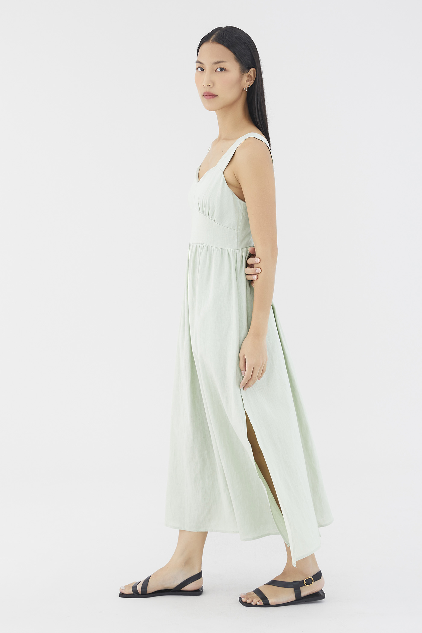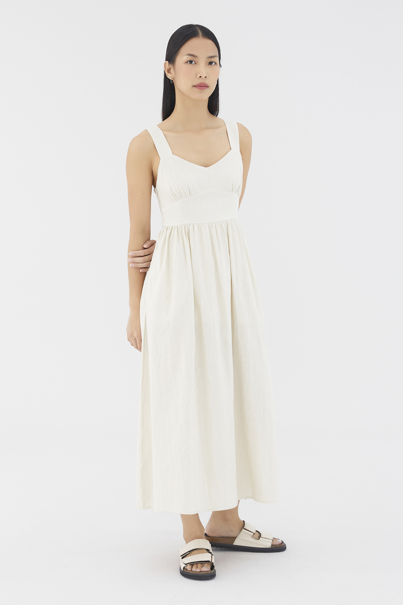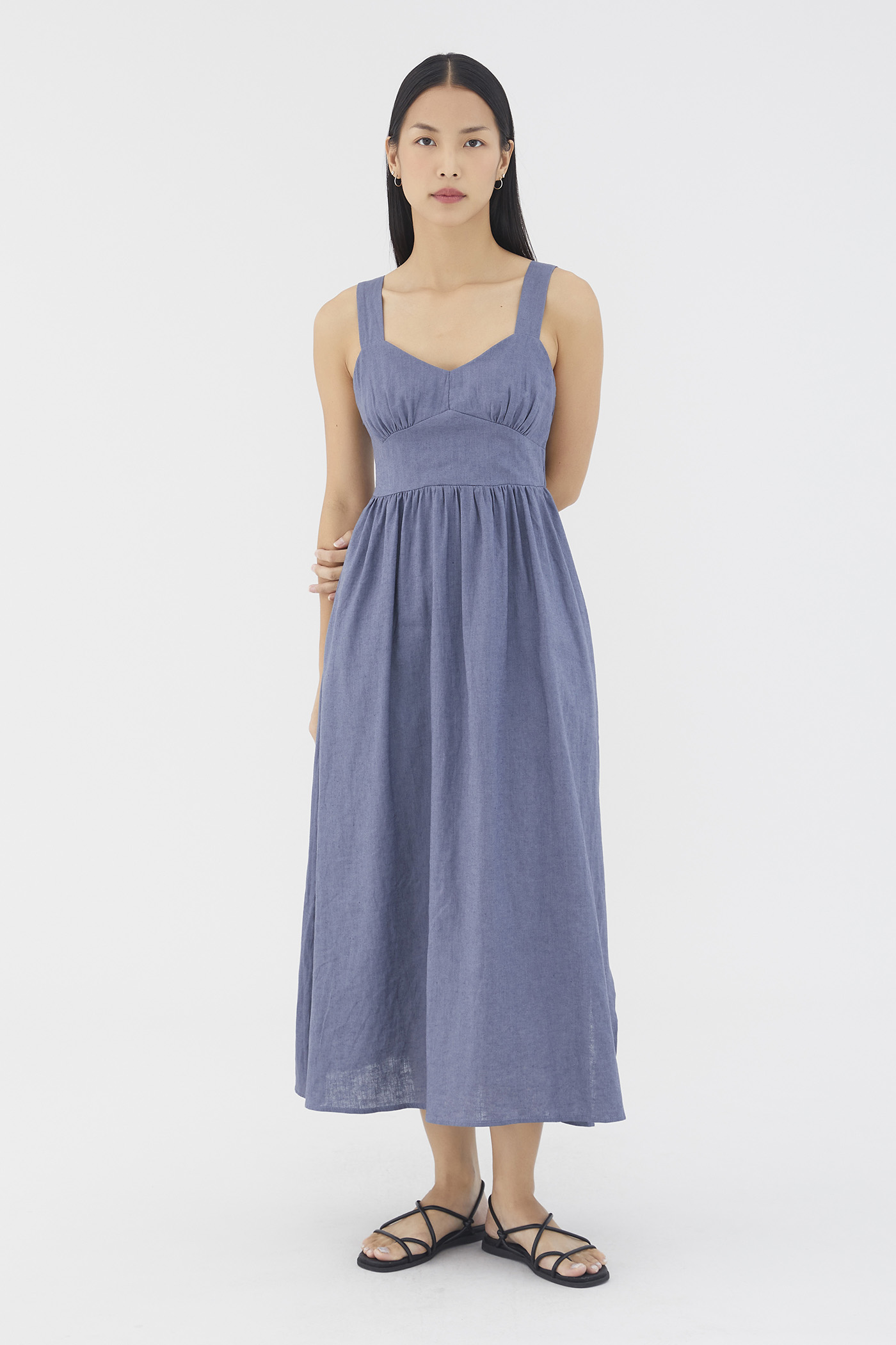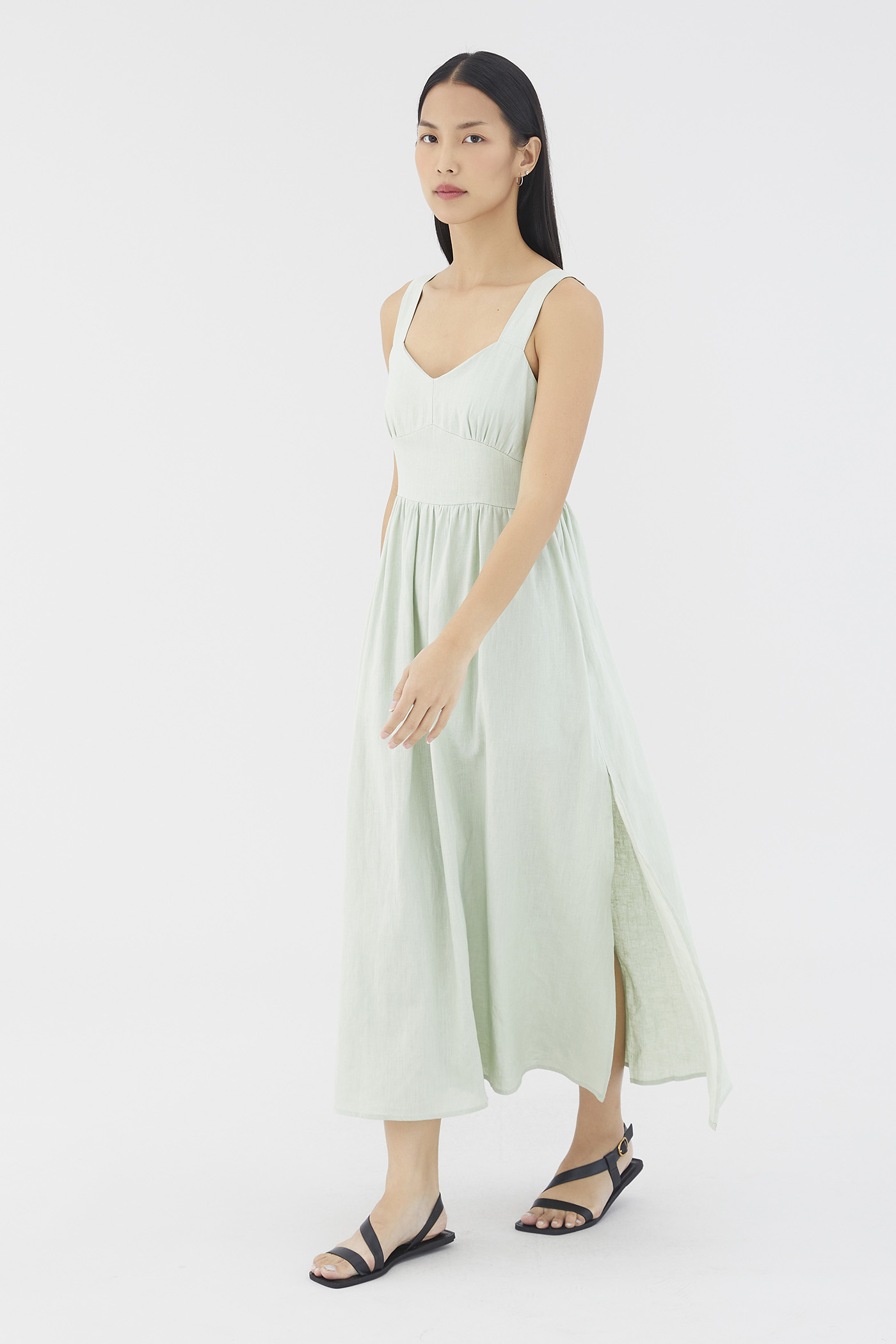 Occasion ready. Cut from airy and softly structured 100% linen, this sleeveless maxi dress features a dipped neckline, wide shoulder straps, a broad waist panel, a partially smocked back and a side zip closure. Worn in an A-line silhouette that fits slimmer through the bodice before flowing out in a relaxed skirt.