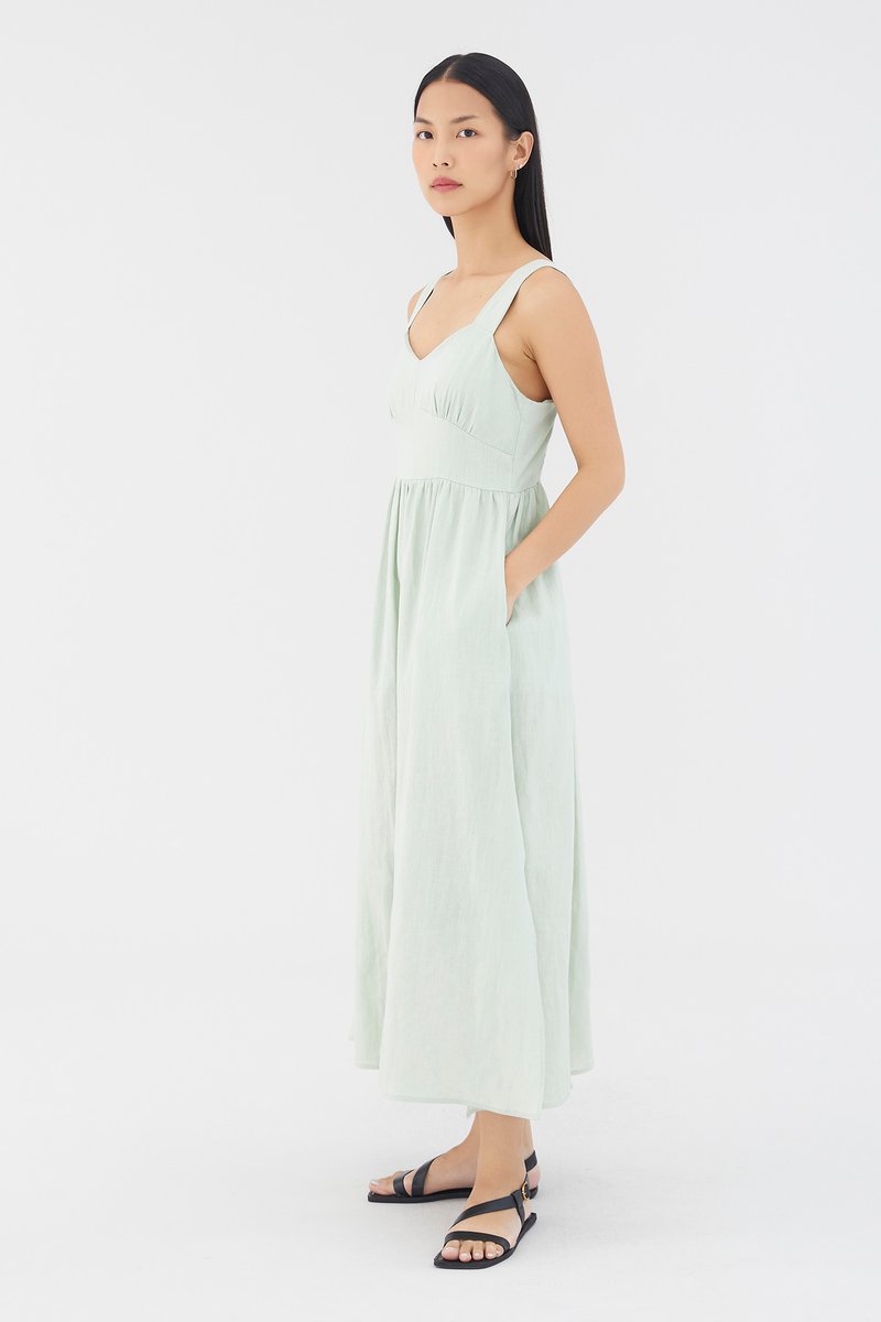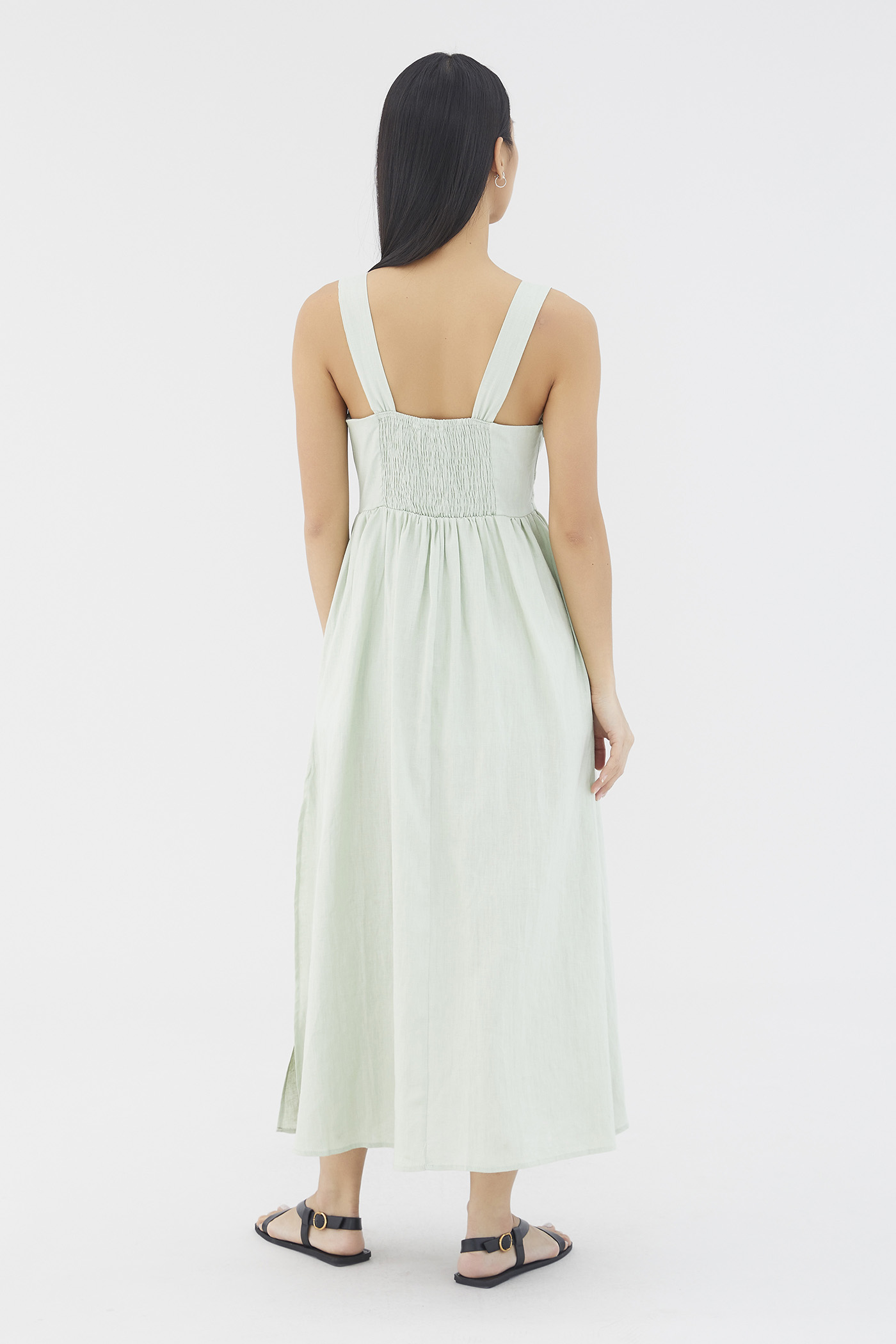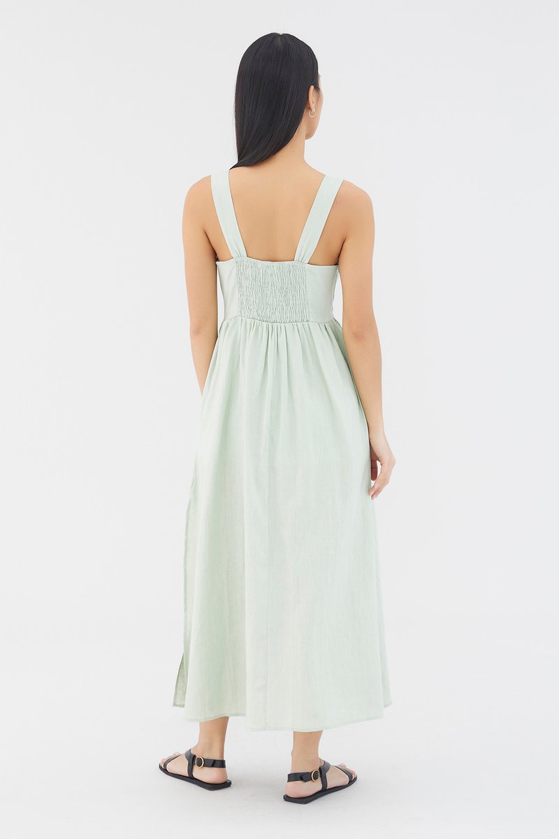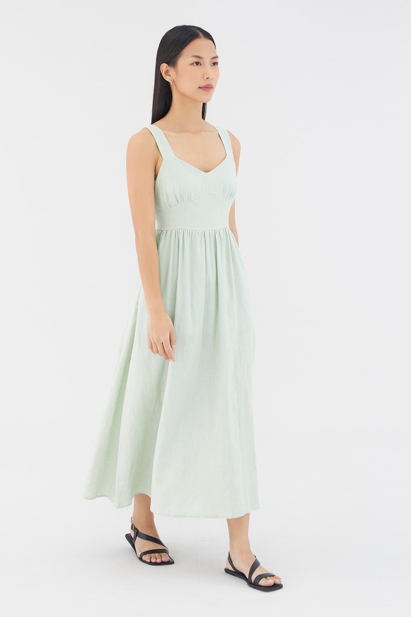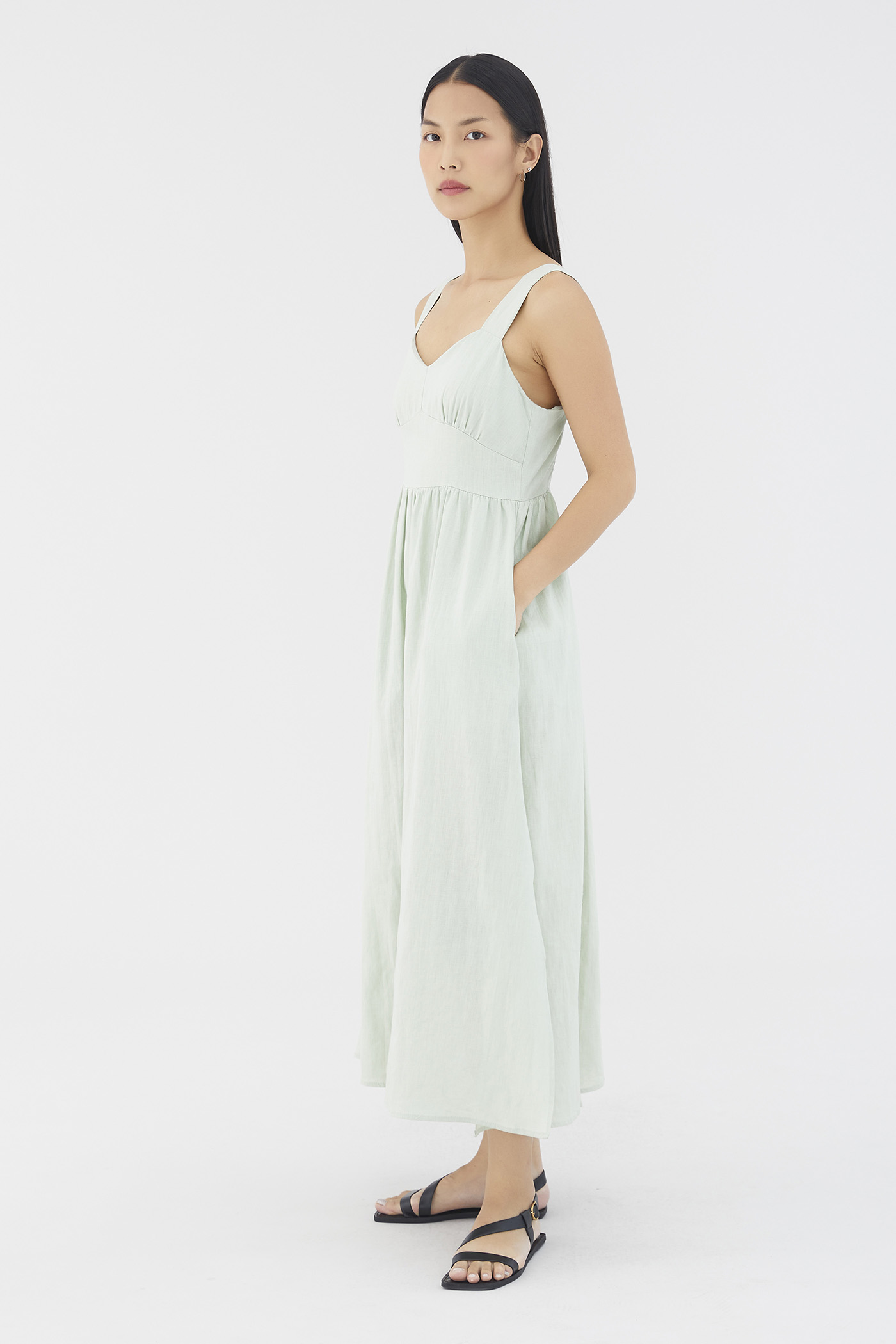Occasion ready. Cut from airy and softly structured 100% linen, this sleeveless maxi dress features a dipped neckline, wide shoulder straps, a broad waist panel, a partially smocked back and a side zip closure. Worn in an A-line silhouette that fits slimmer through the bodice before flowing out in a relaxed skirt.