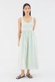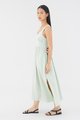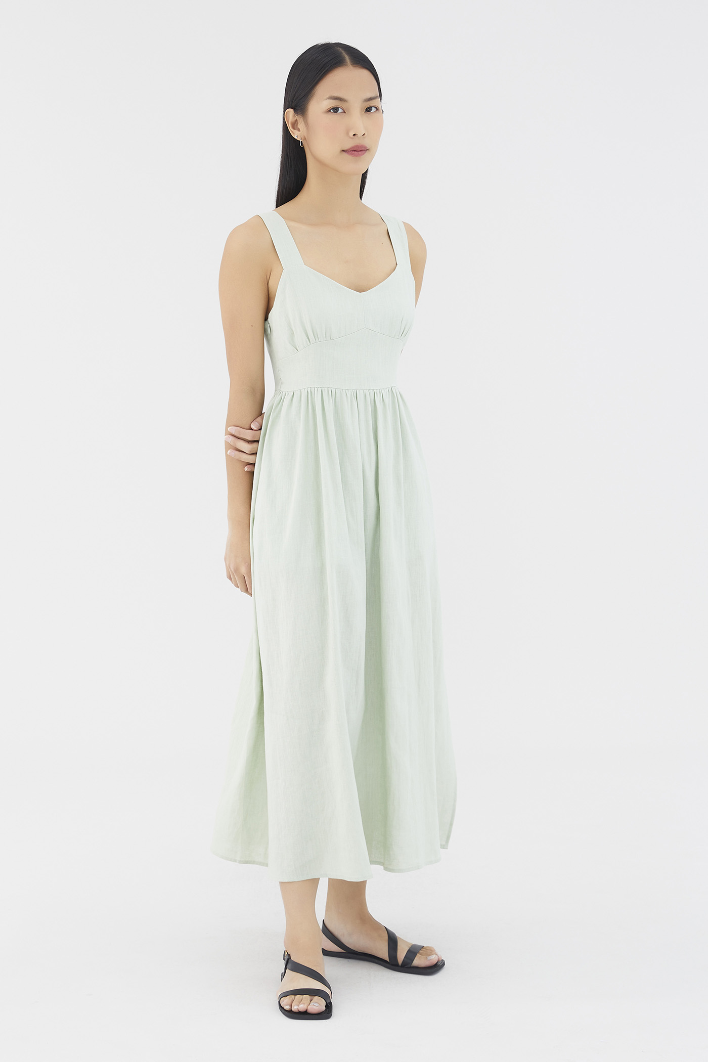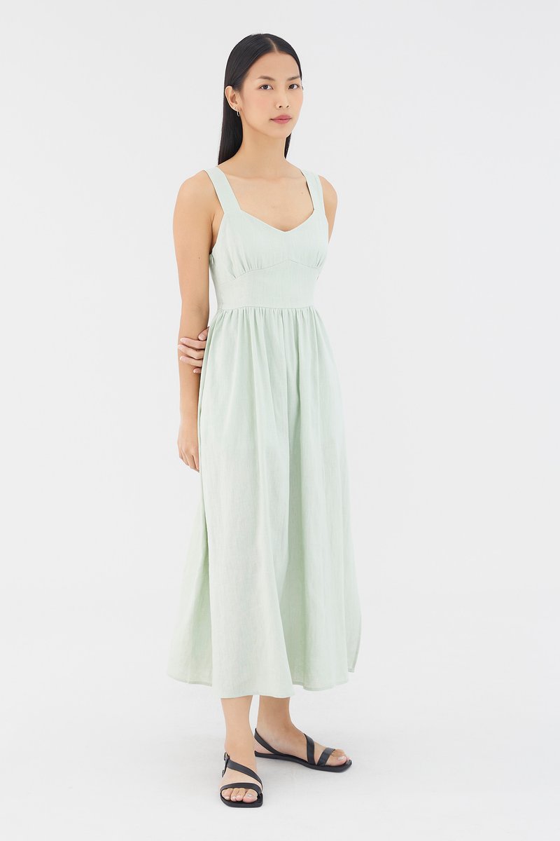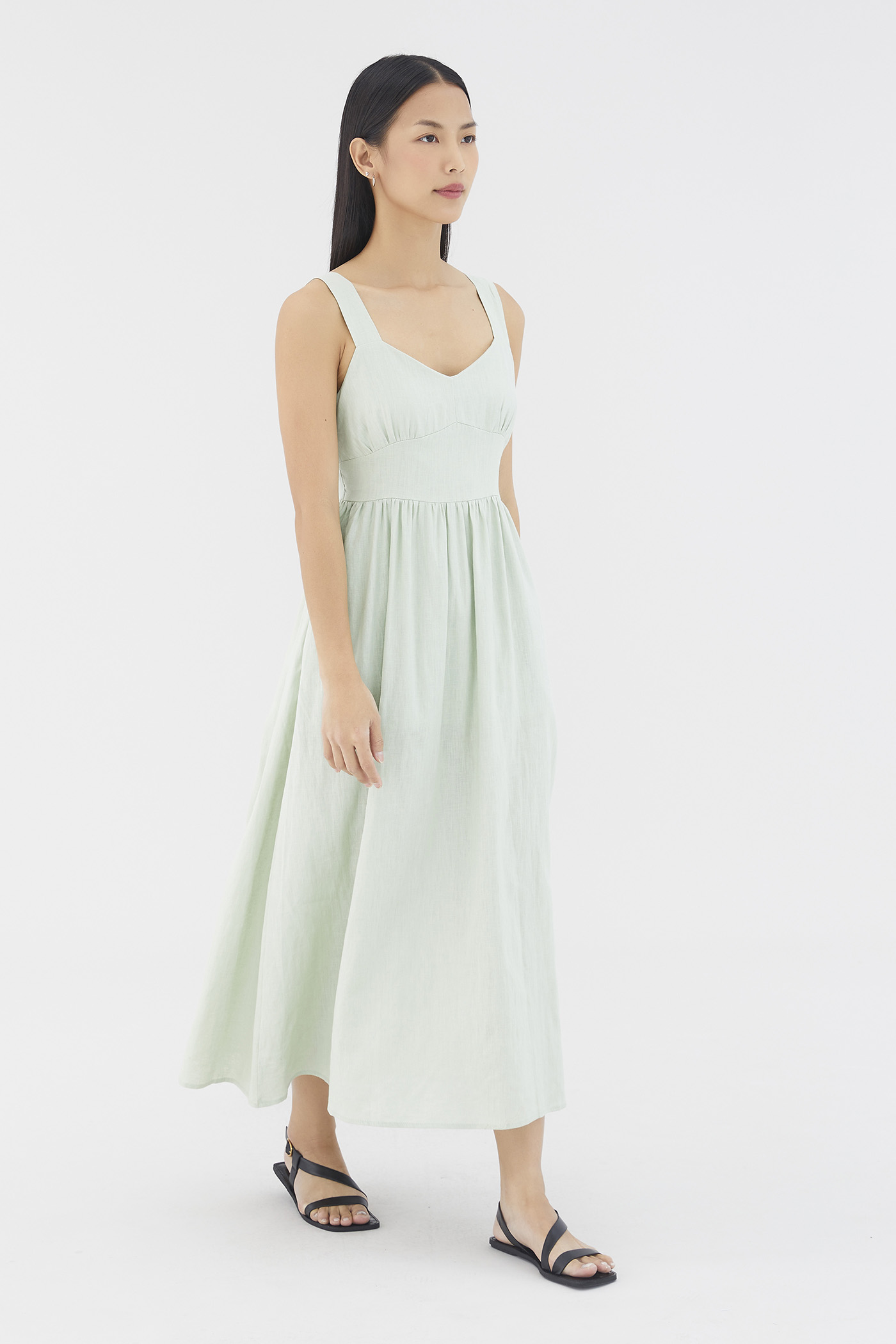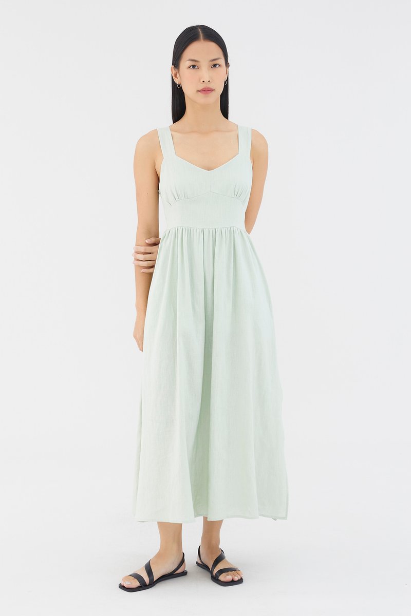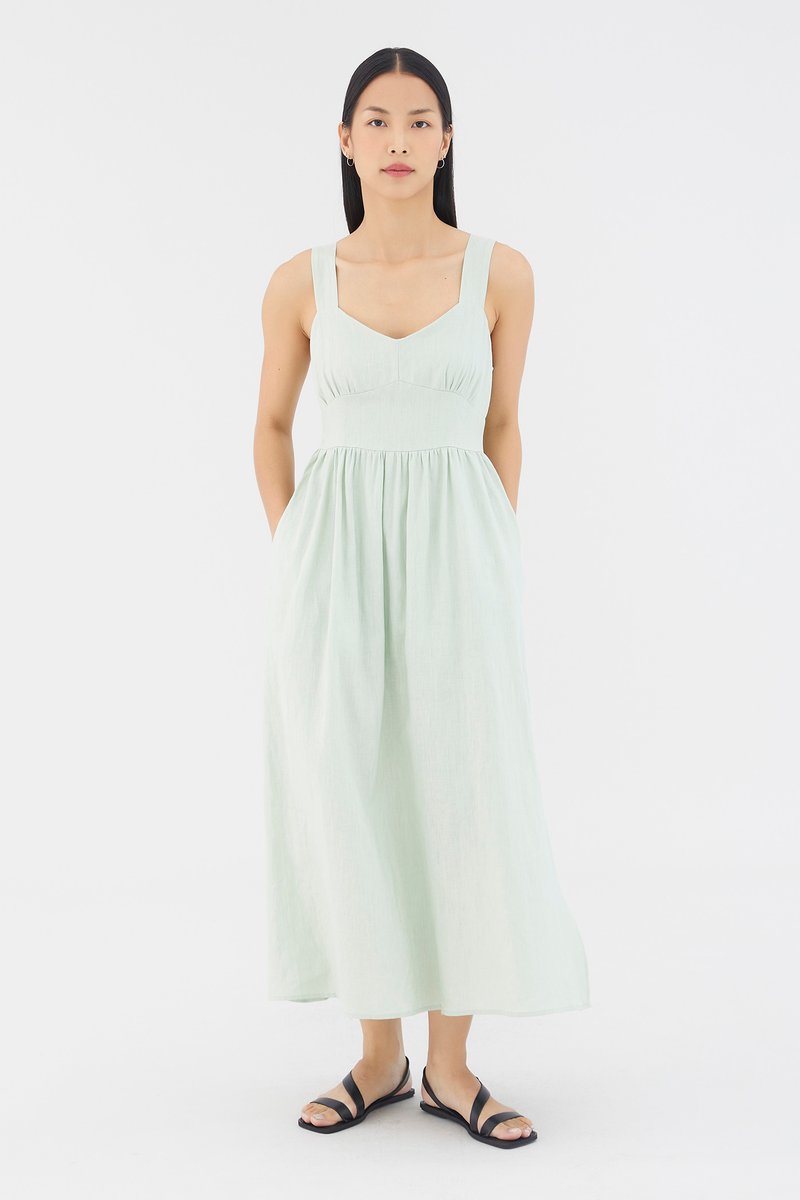 Occasion ready. Cut from airy and softly structured 100% linen, this sleeveless maxi dress features a dipped neckline, wide shoulder straps, a broad waist panel, a partially smocked back and a side zip closure. Worn in an A-line silhouette that fits slimmer through the bodice before flowing out in a relaxed skirt.