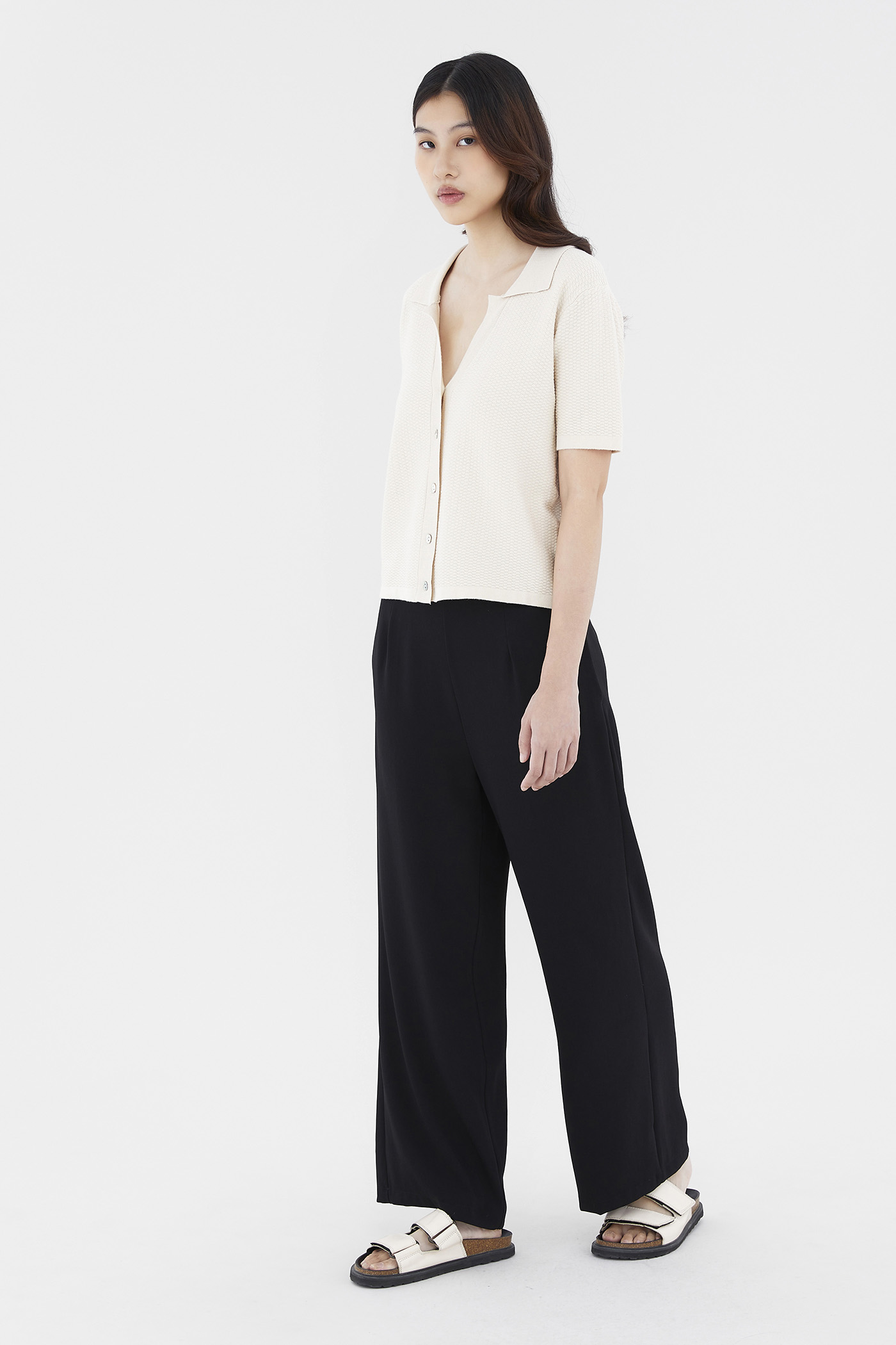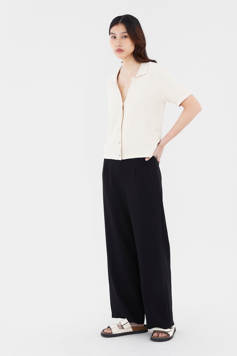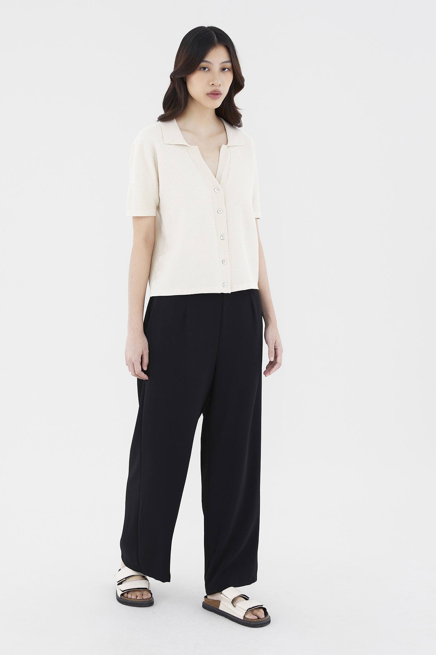 Not a polo tee. Made from soft waffle knit, this top features a collared V-neckline, short sleeves and a front button-down closure. Worn in a relaxed fit.