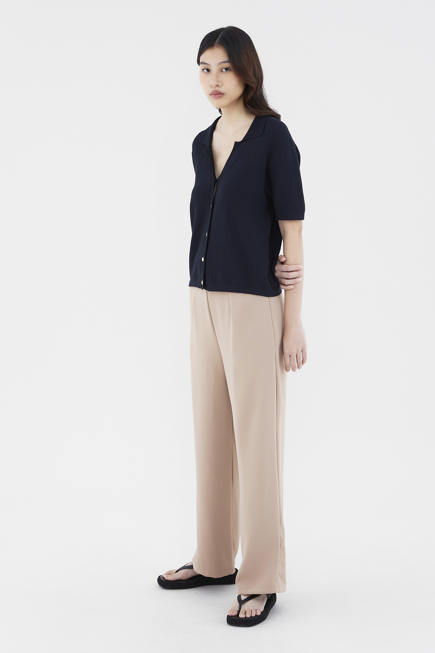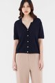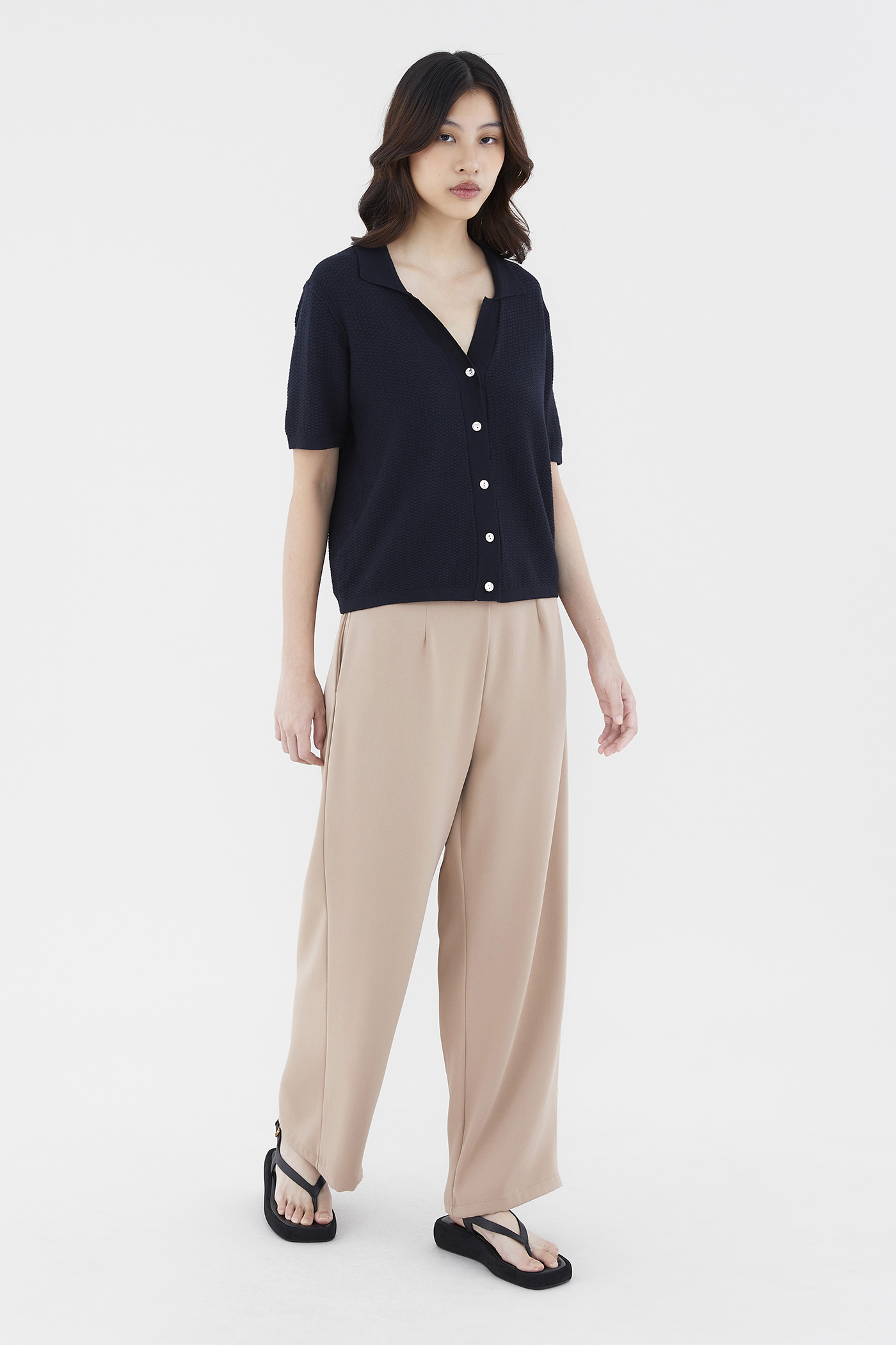 Not a polo tee. Made from soft waffle knit, this top features a collared V-neckline, short sleeves and a front button-down closure. Worn in a relaxed fit.