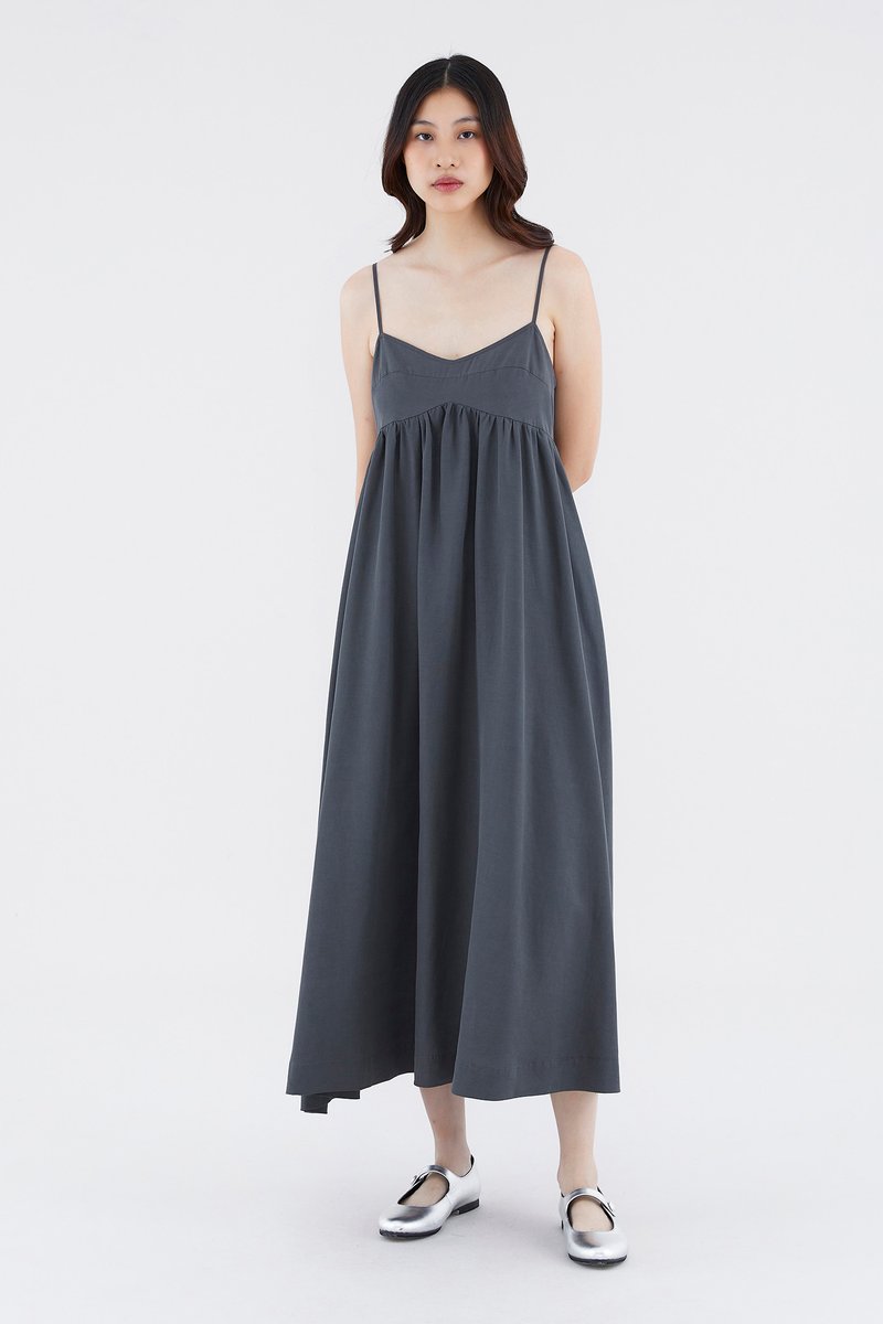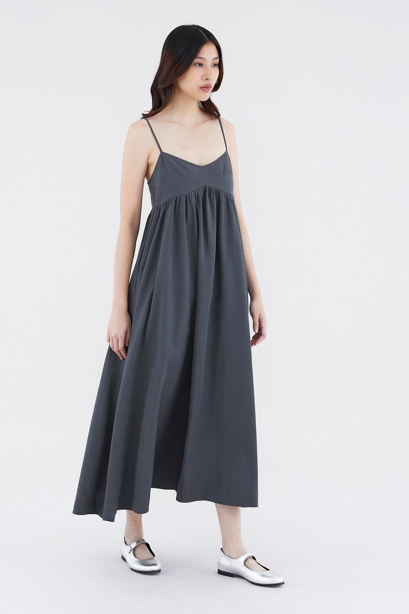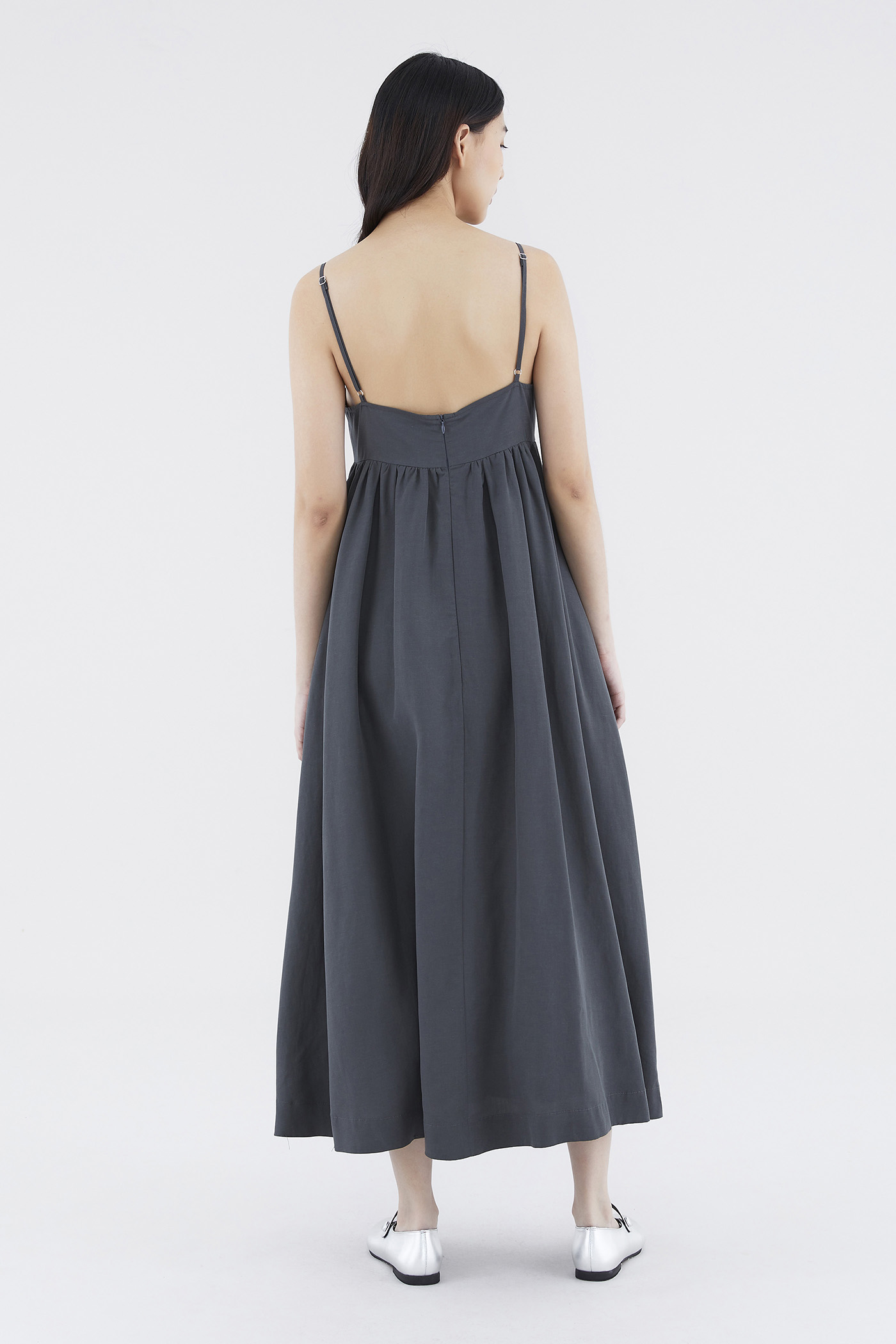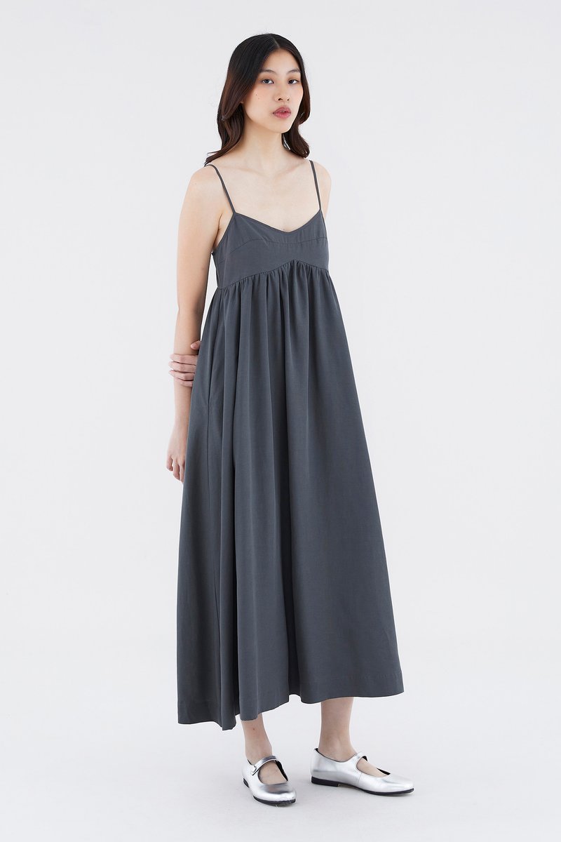 Up for anything. Cut from smooth fabric with a structured drape, this sleeveless maxi dress features slim adjustable shoulder straps, a dipped neckline and a back zip closure. Worn in an empire-waist silhouette that fits slimmer through the bust before flowing out in a relaxed skirt.