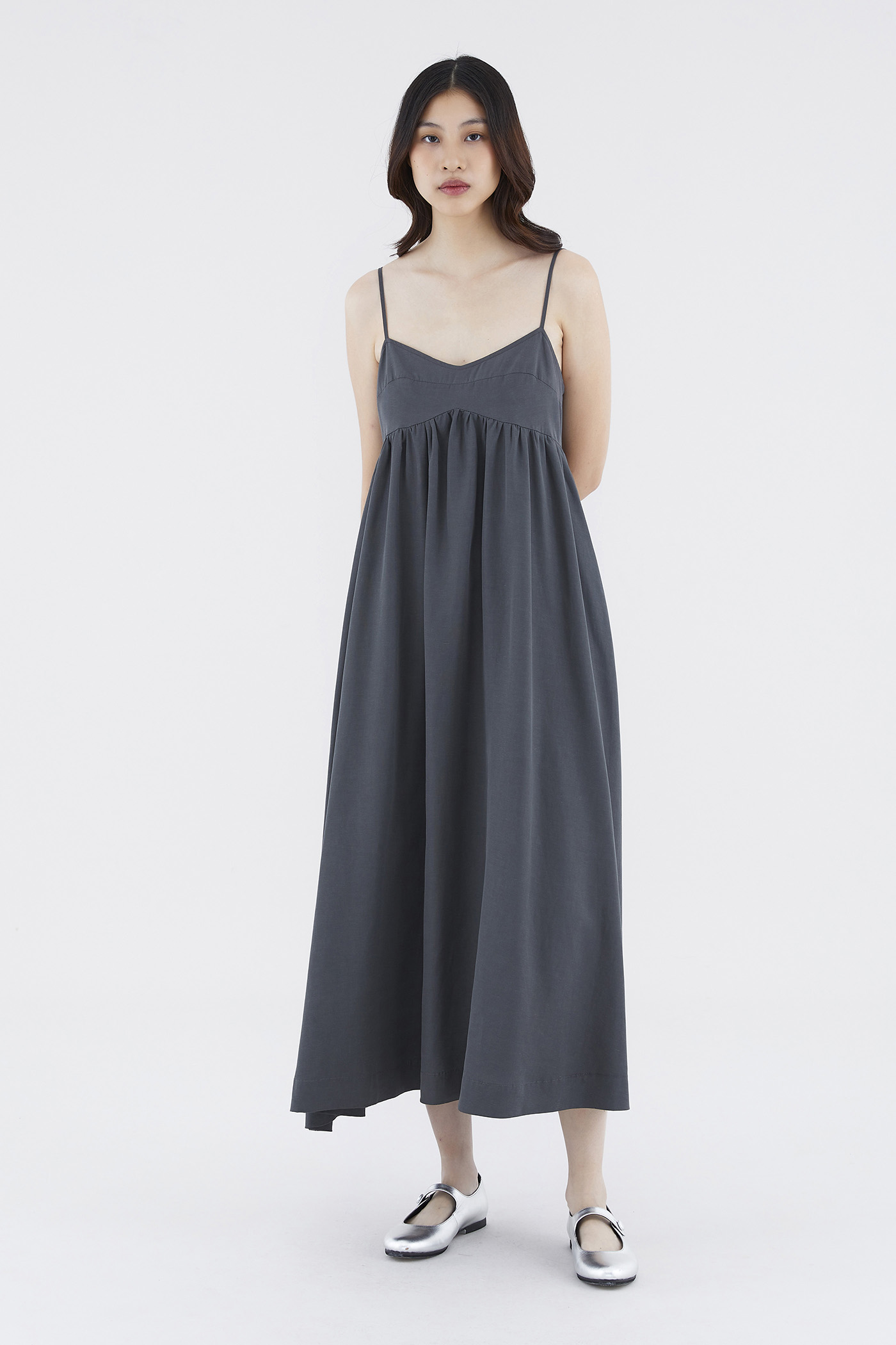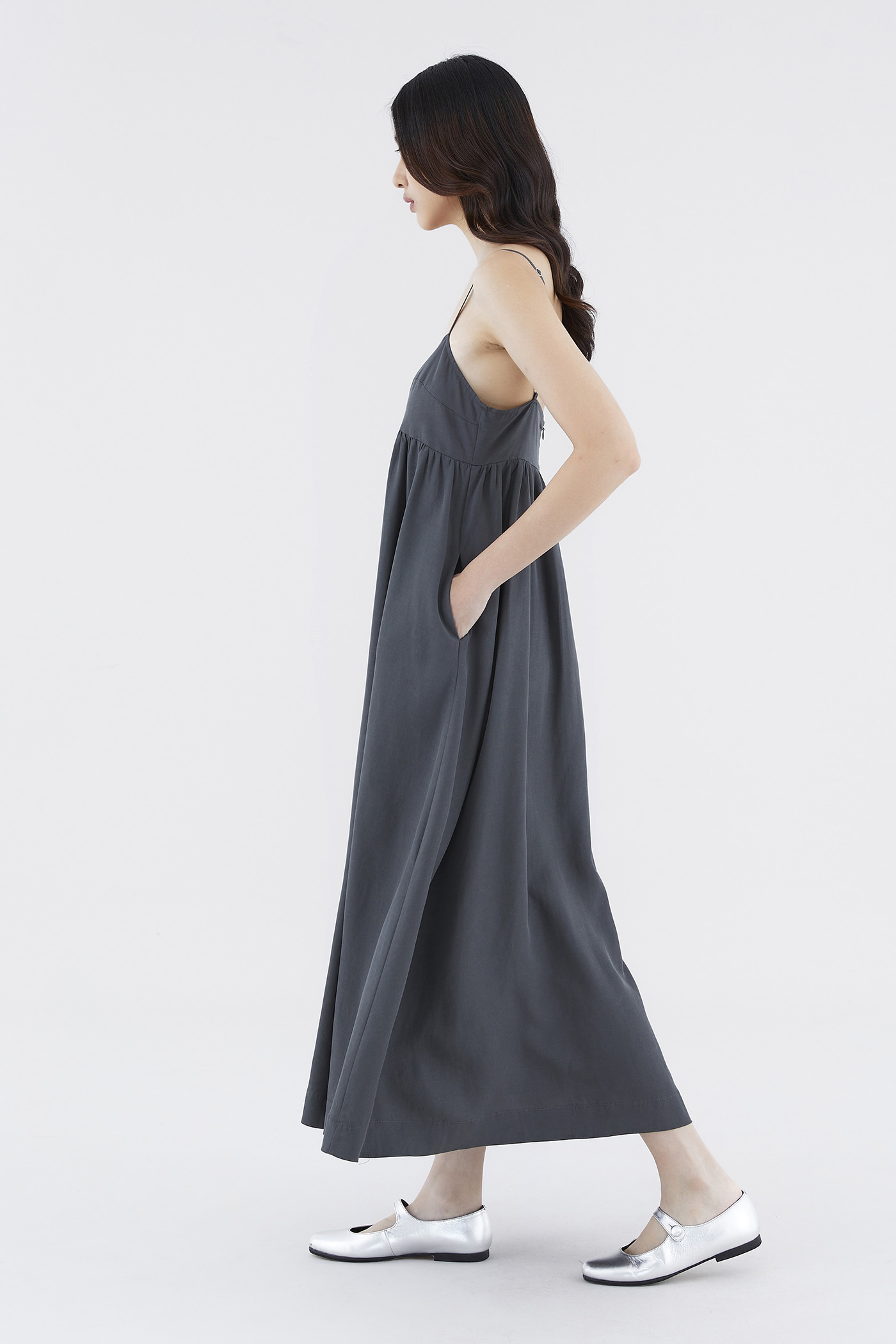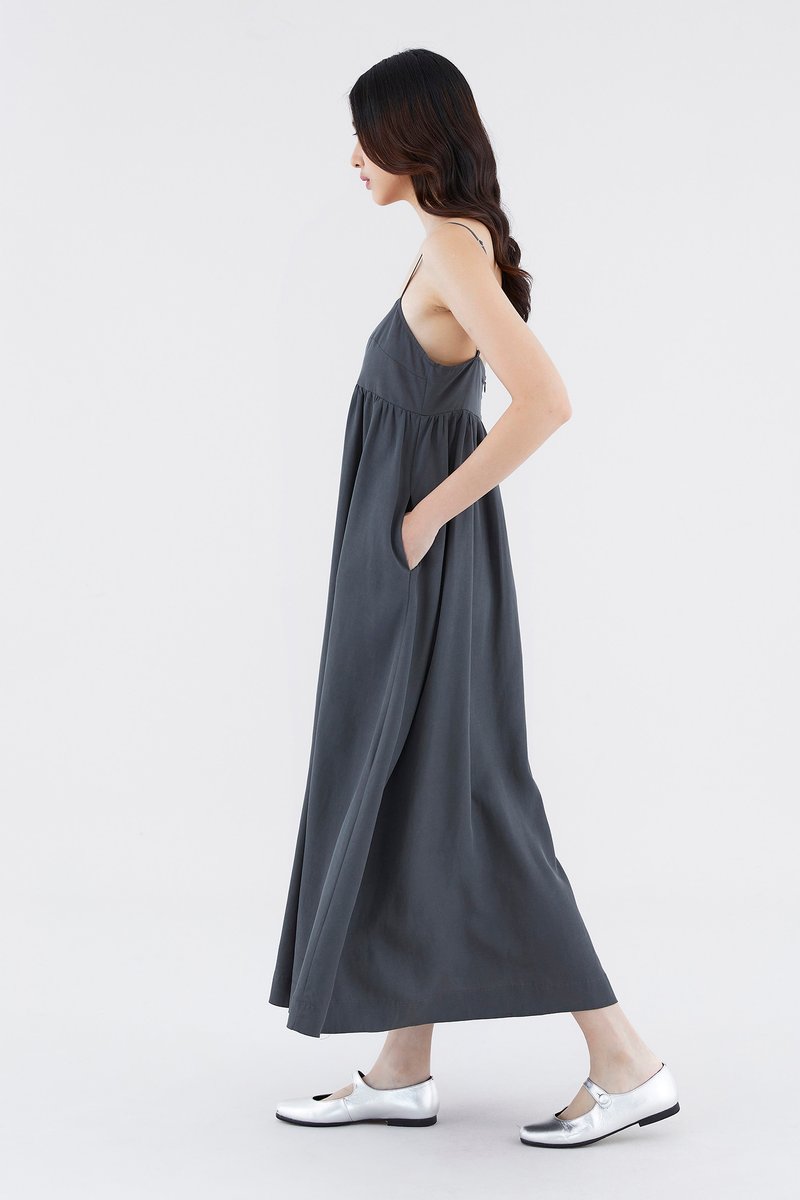 Up for anything. Cut from smooth fabric with a structured drape, this sleeveless maxi dress features slim adjustable shoulder straps, a dipped neckline and a back zip closure. Worn in an empire-waist silhouette that fits slimmer through the bust before flowing out in a relaxed skirt.