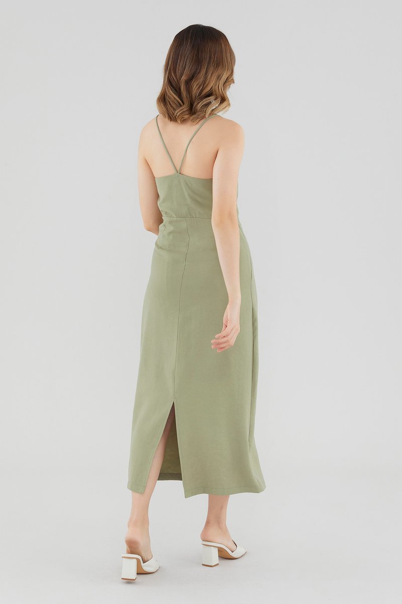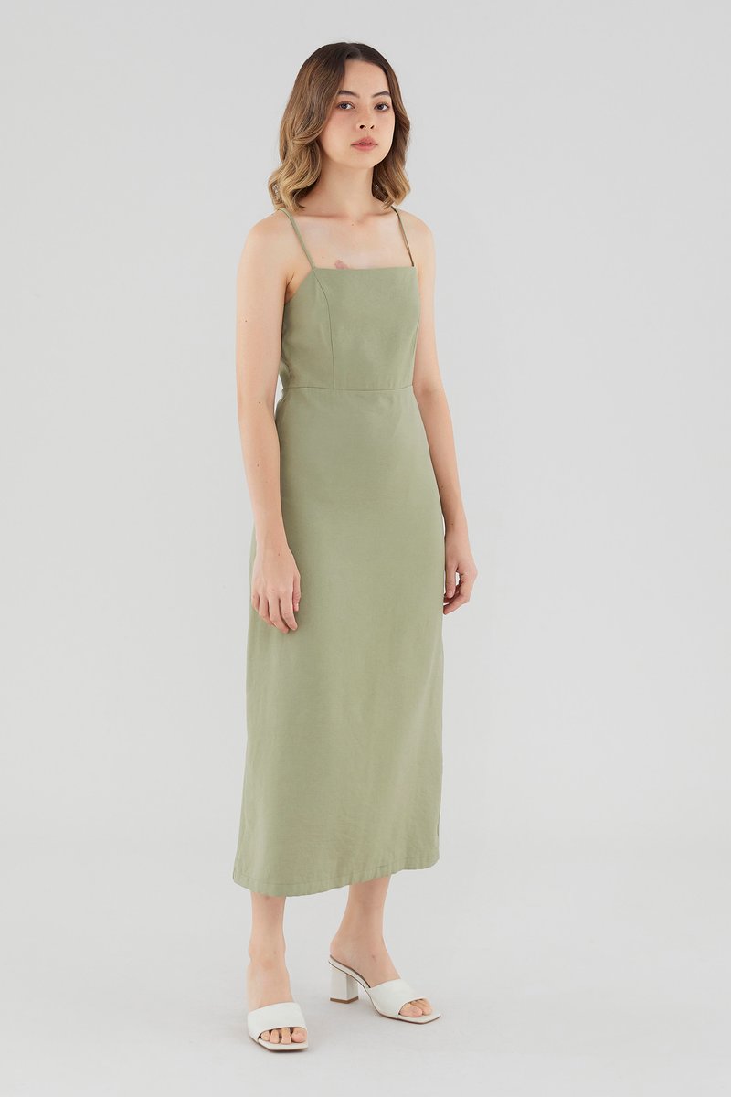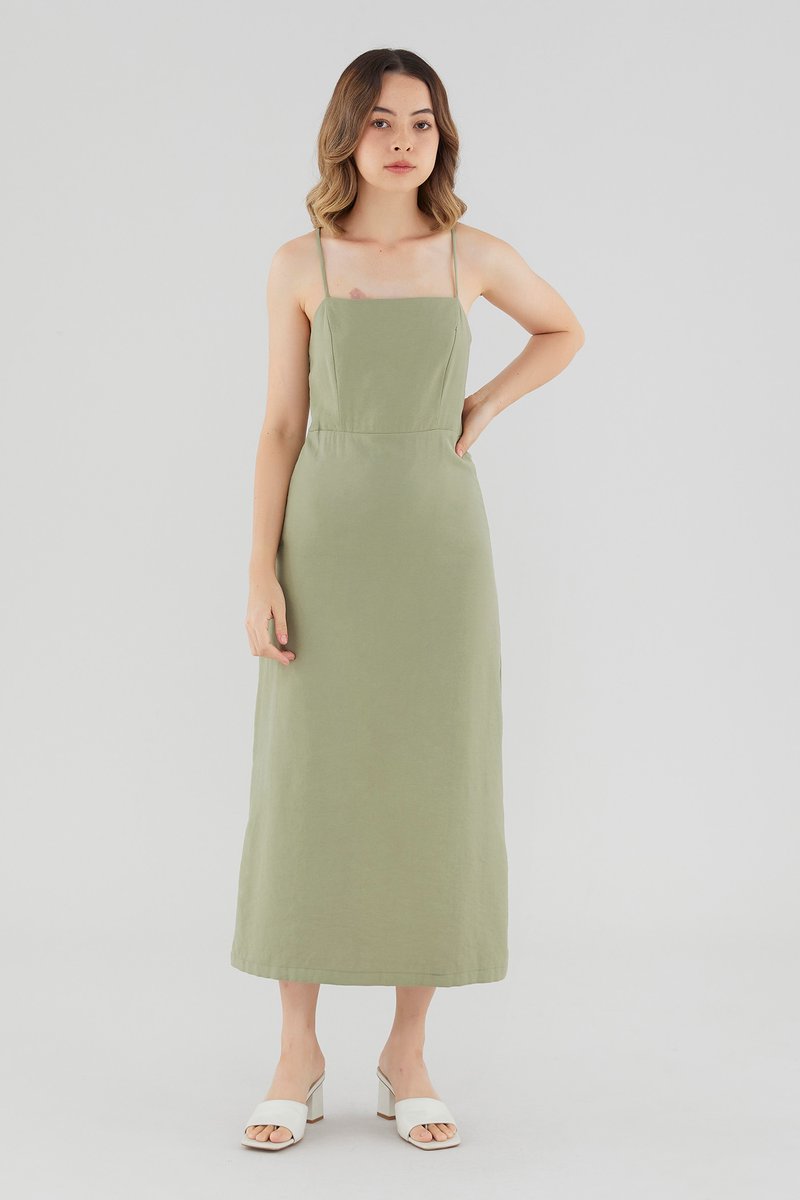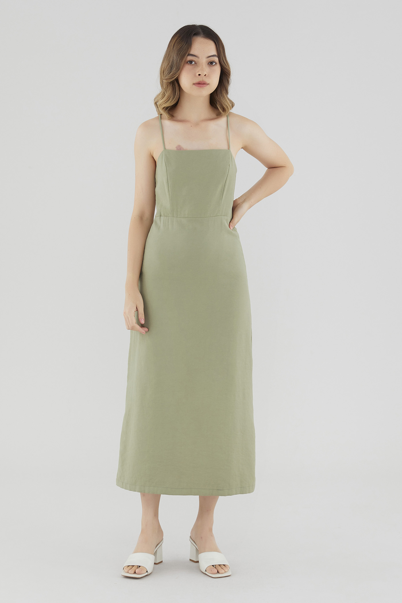 Your AM to PM frock. Cut from smooth and non-stretch fabric, this sleeveless midi dress features slim non-adjustable straps that meet at the back in a V design, along with a straight neckline, panelled bodice and back slit. Fits slim with a side zip closure.