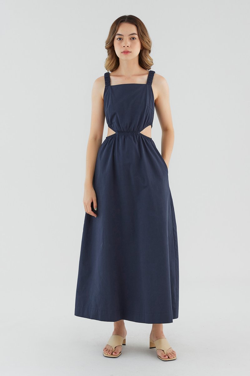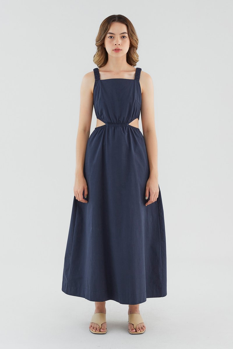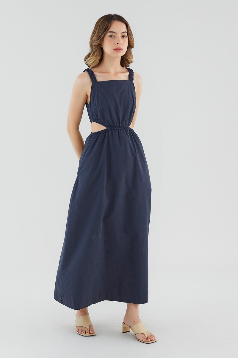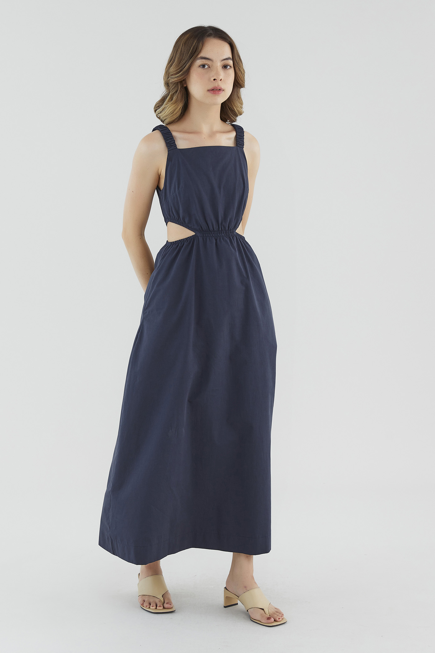 <p><span style="font-weight: 400;">Fabric Composition: 100% Cotton</span></p> <p><span style="font-weight: 400;">Lining: Full</span></p> <p><span style="font-weight: 400;">Sheerness: Not sheer</span></p> <p><span style="font-weight: 400;">Pockets: Two pockets on the side</span></p> <p><span style="font-weight: 400;">Peek-a-boo. Cut from crisp and non-stretch cotton, this sleeveless maxi dress features a square neckline, stretchy ruched shoulder straps and an elasticated waist with side cut-outs. Fits slimmer around the waist before flaring out in a relaxed skirt. </span></p> <p><span style="font-weight: 400;">Care Instructions: Do not soak / Do not bleach / Handwash or Machine wash on gentle mode / Do not machine dry / Iron using low heat</span></p>