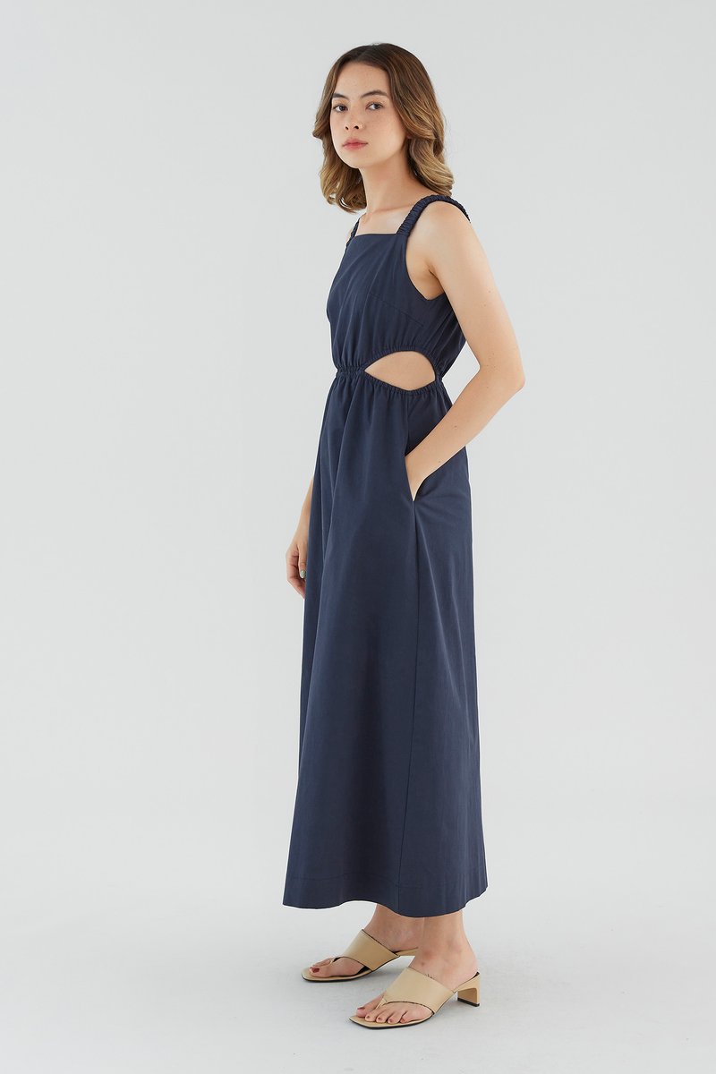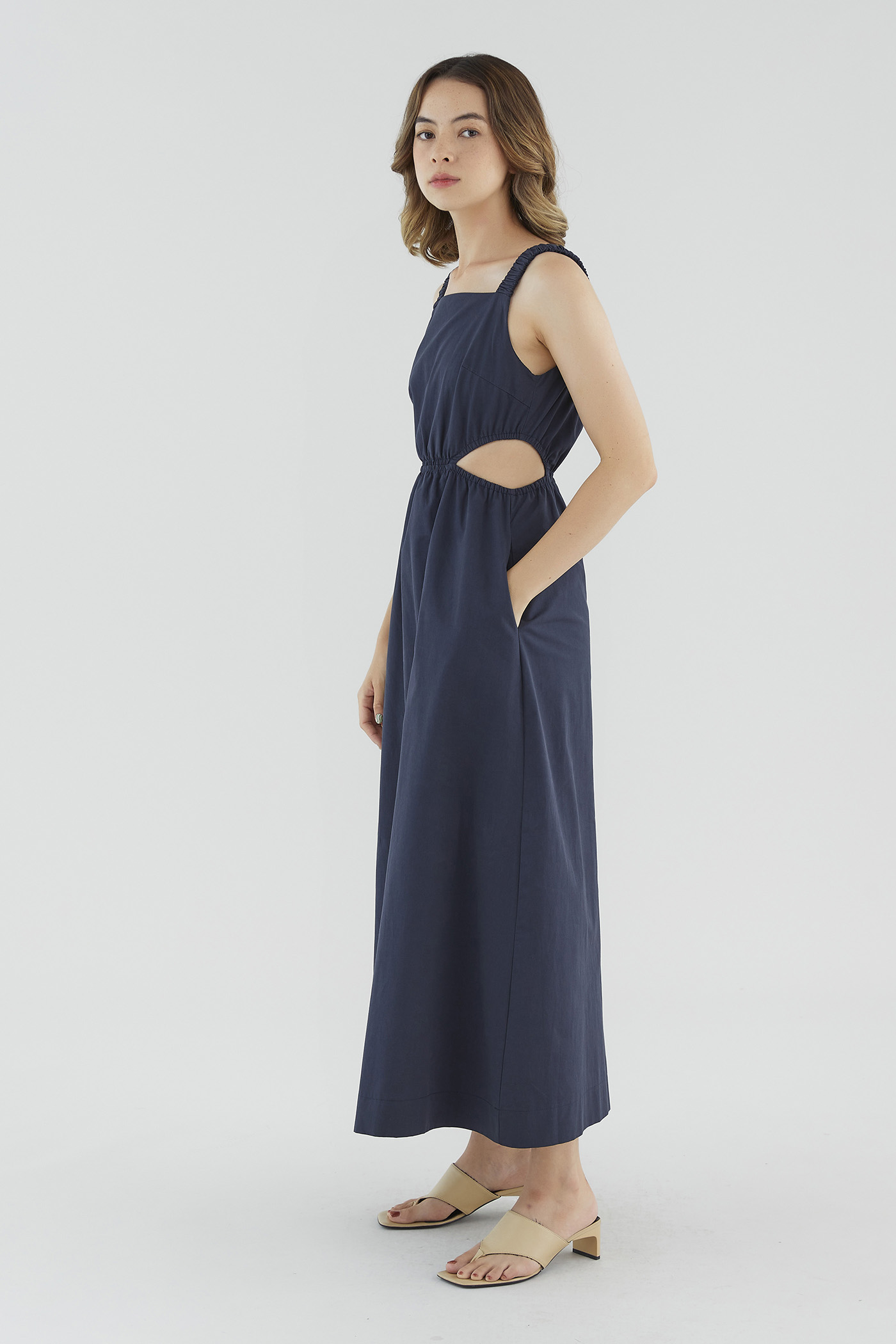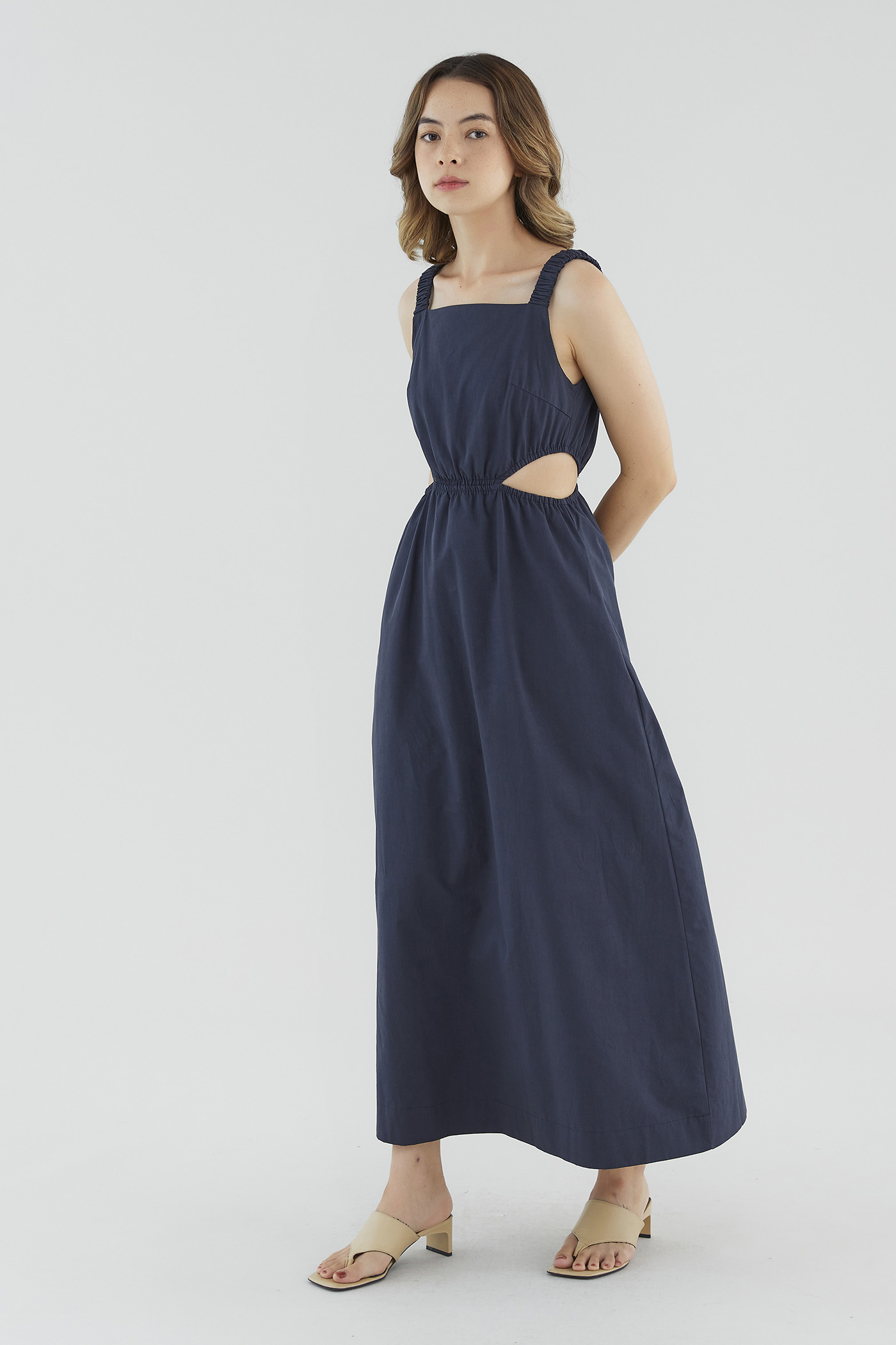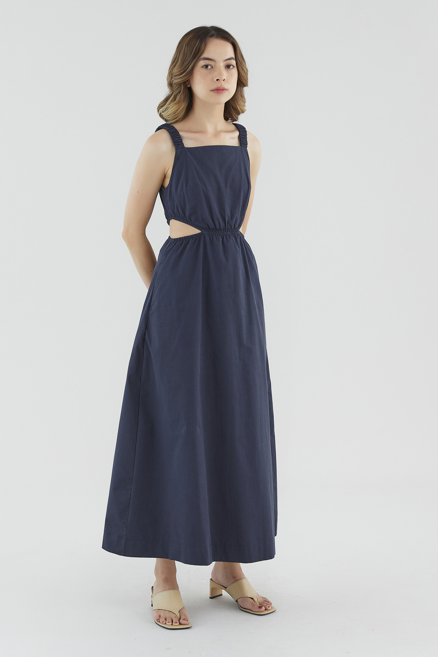 <p><span style="font-weight: 400;">Fabric Composition: 100% Cotton</span></p> <p><span style="font-weight: 400;">Lining: Full</span></p> <p><span style="font-weight: 400;">Sheerness: Not sheer</span></p> <p><span style="font-weight: 400;">Pockets: Two pockets on the side</span></p> <p><span style="font-weight: 400;">Peek-a-boo. Cut from crisp and non-stretch cotton, this sleeveless maxi dress features a square neckline, stretchy ruched shoulder straps and an elasticated waist with side cut-outs. Fits slimmer around the waist before flaring out in a relaxed skirt. </span></p> <p><span style="font-weight: 400;">Care Instructions: Do not soak / Do not bleach / Handwash or Machine wash on gentle mode / Do not machine dry / Iron using low heat</span></p>