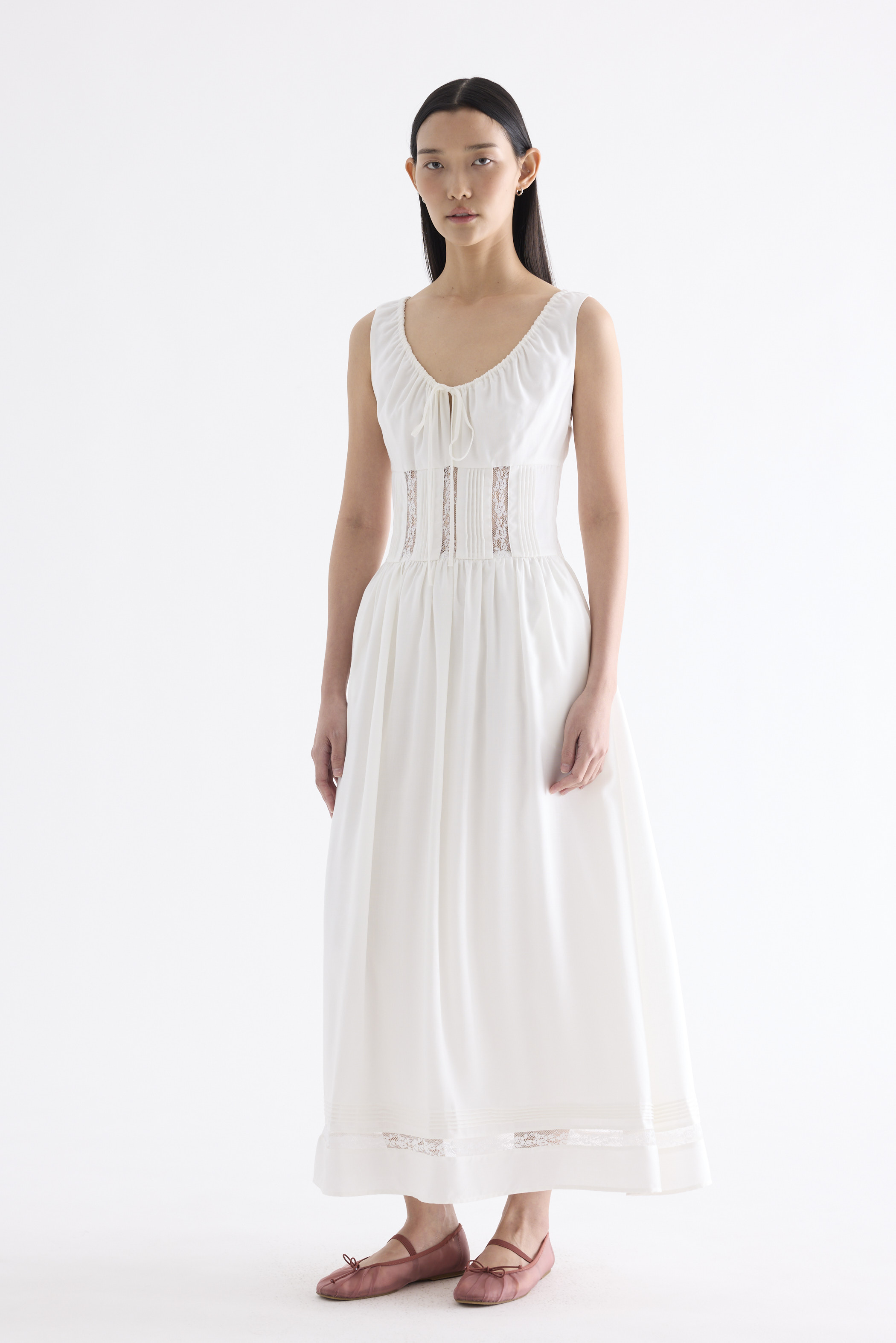 Occasion worthy. Made from smooth and non-stretch Tencel, this sleeveless maxi dress features a round drawstring neckline, front slit with a tie-strap closure, waist panel with lace panels and pin-tuck pleats, as well as a side zip closure. Worn in an A-line silhouette that flows out at the waist into a relaxed skirt.