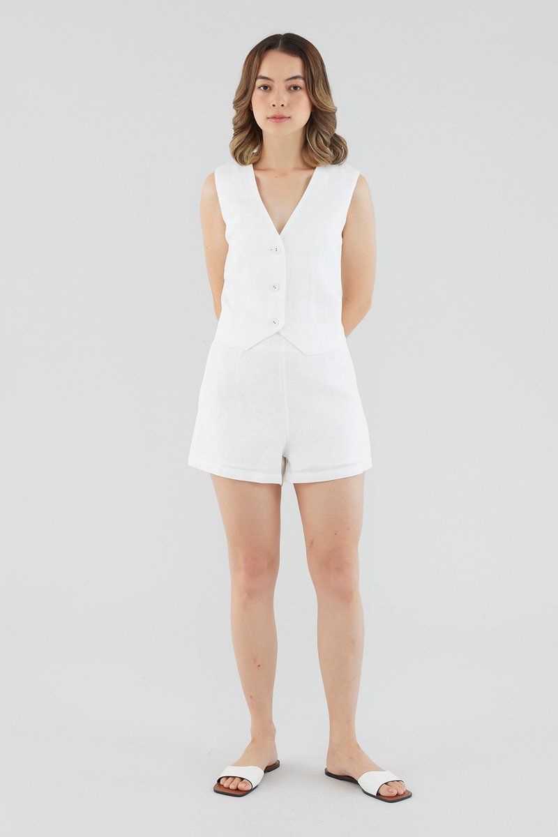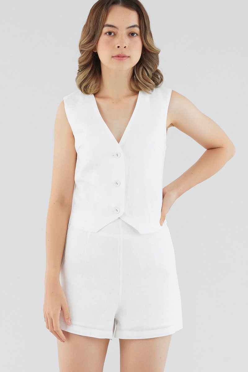 <p><span style="font-weight: 400;">Fabric Composition: 100% Linen</span></p> <p><span style="font-weight: 400;">Lining: Full</span></p> <p><span style="font-weight: 400;">Sheerness: Not sheer</span></p> <p><span style="font-weight: 400;">Pockets: None</span></p> <p><span style="font-weight: 400;">Suiting, deconstructed. Cut from textured and non-stretch 100% linen, this softly tailored waistcoat features a deep V-neckline, front button-down closure and panelled bodice for extra polish. Fits slim in a slightly cropped length.</span></p> <p><span style="font-weight: 400;">Care Instructions: Do not soak / Do not bleach / Handwash or Machine wash on gentle mode / Do not machine dry / Iron using low heat</span></p> <p><i><span style="font-weight: 400;">This piece is made from 100% linen, the unsung hero of hot days and one of the least environmentally damaging fabrics. Derived from the unfussy flax plant, not only does its cultivation consume significantly less water, pesticides and arable land — but linen’s excellent durability and biodegradable nature also means your clothes have a longer, more waste-free life cycle.</span></i></p>