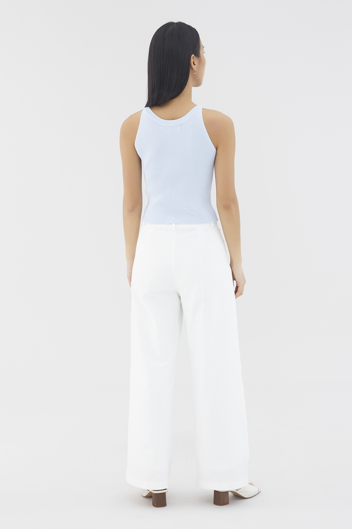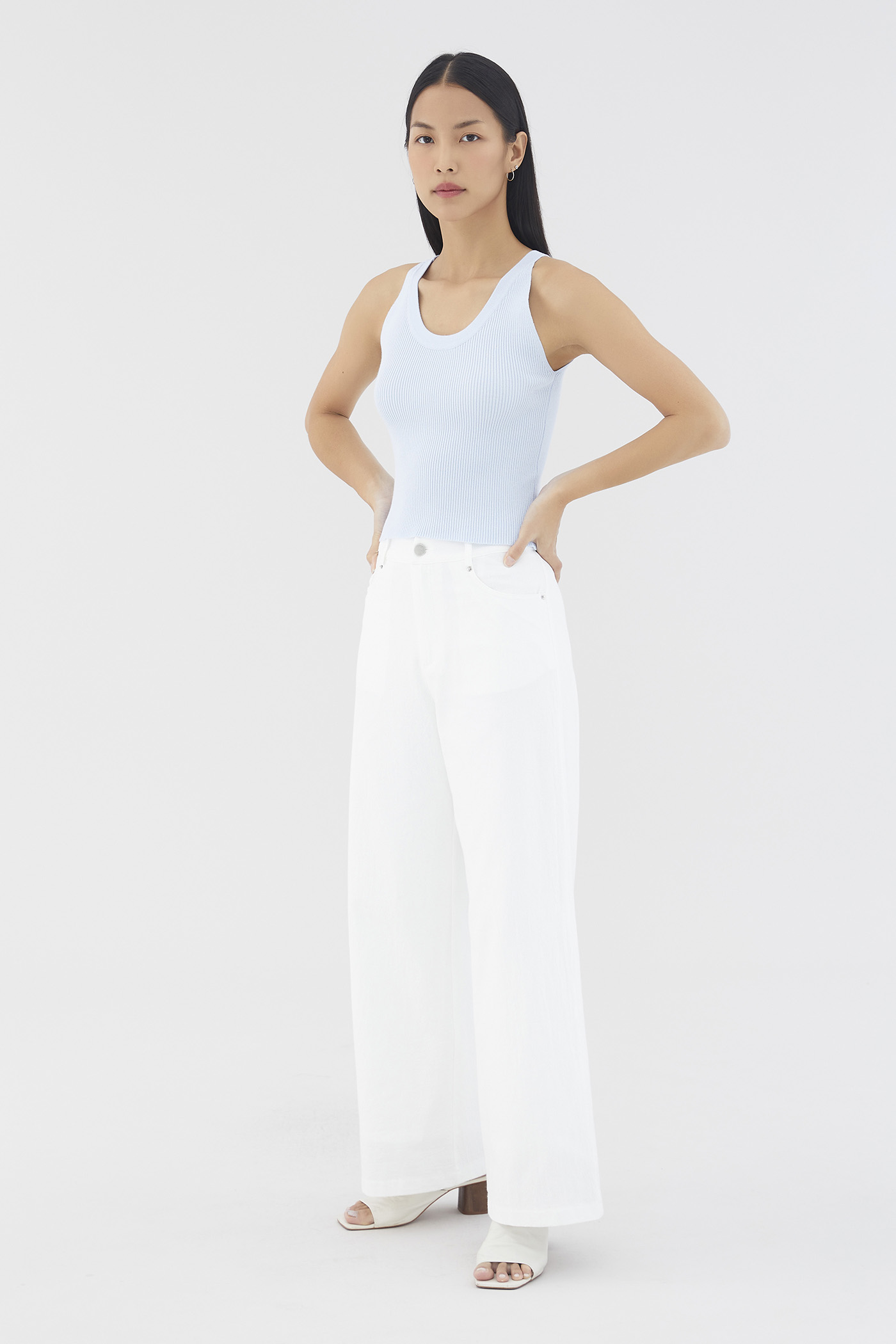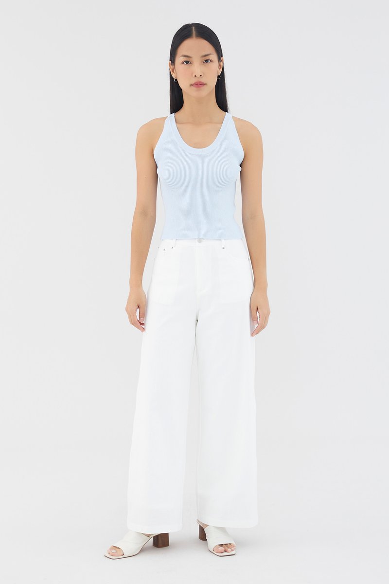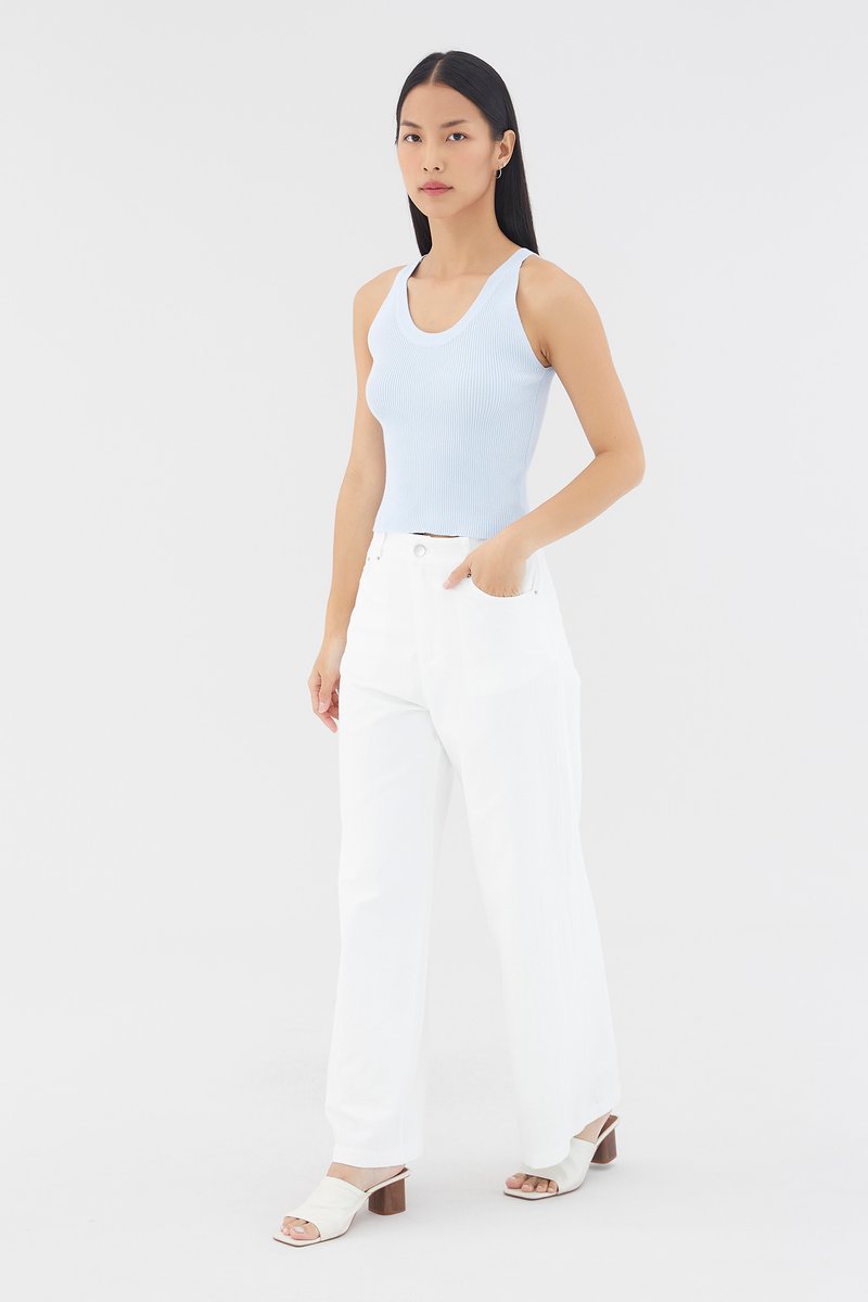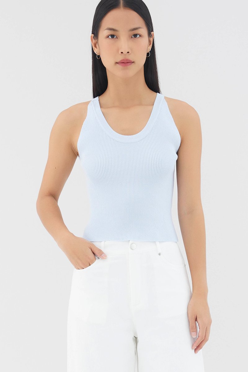 Form flattering. Made from soft and stretchy knit, this sleeveless top features a V-neckline, wide shoulder straps and a slightly cropped length. Worn in a slim fit.