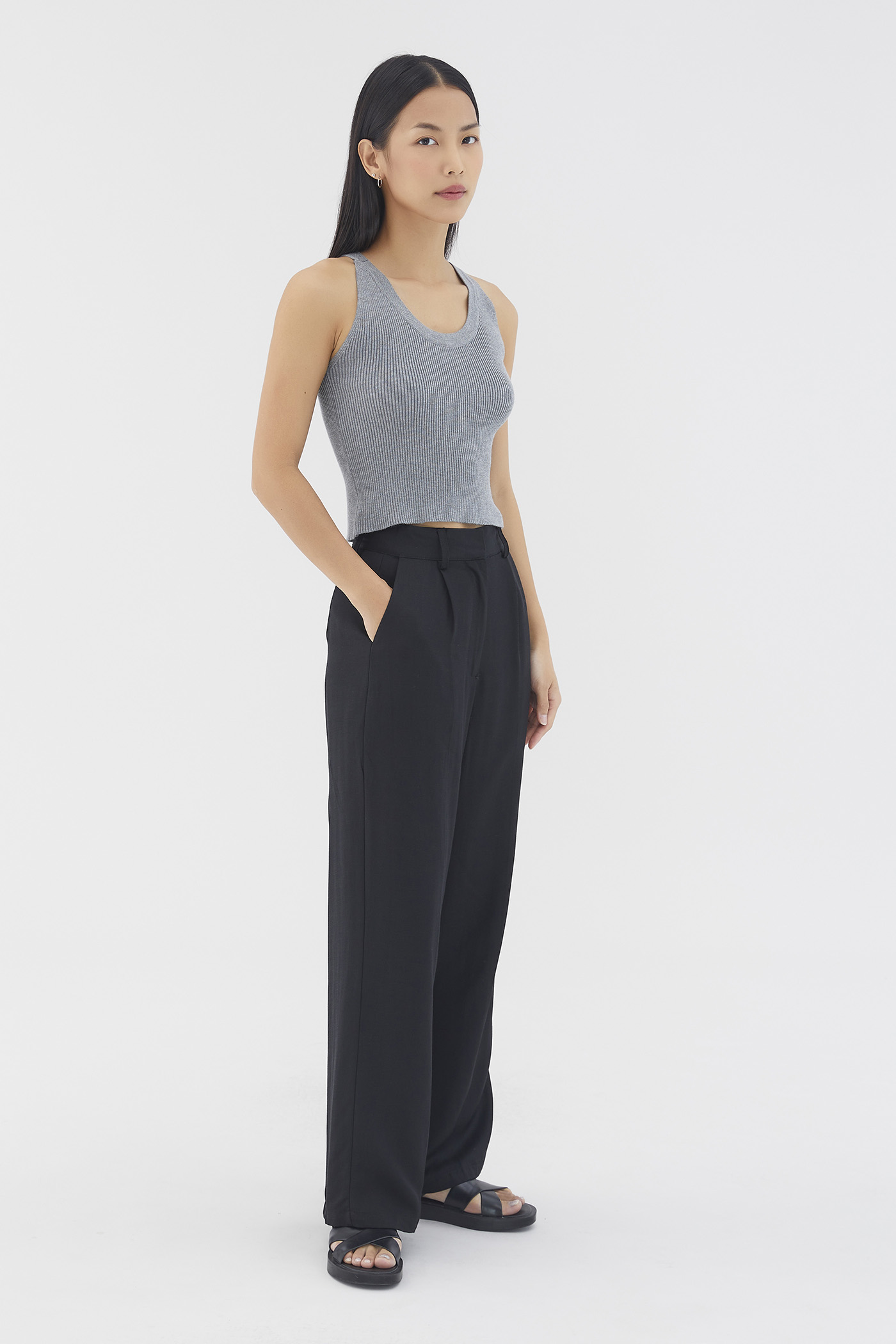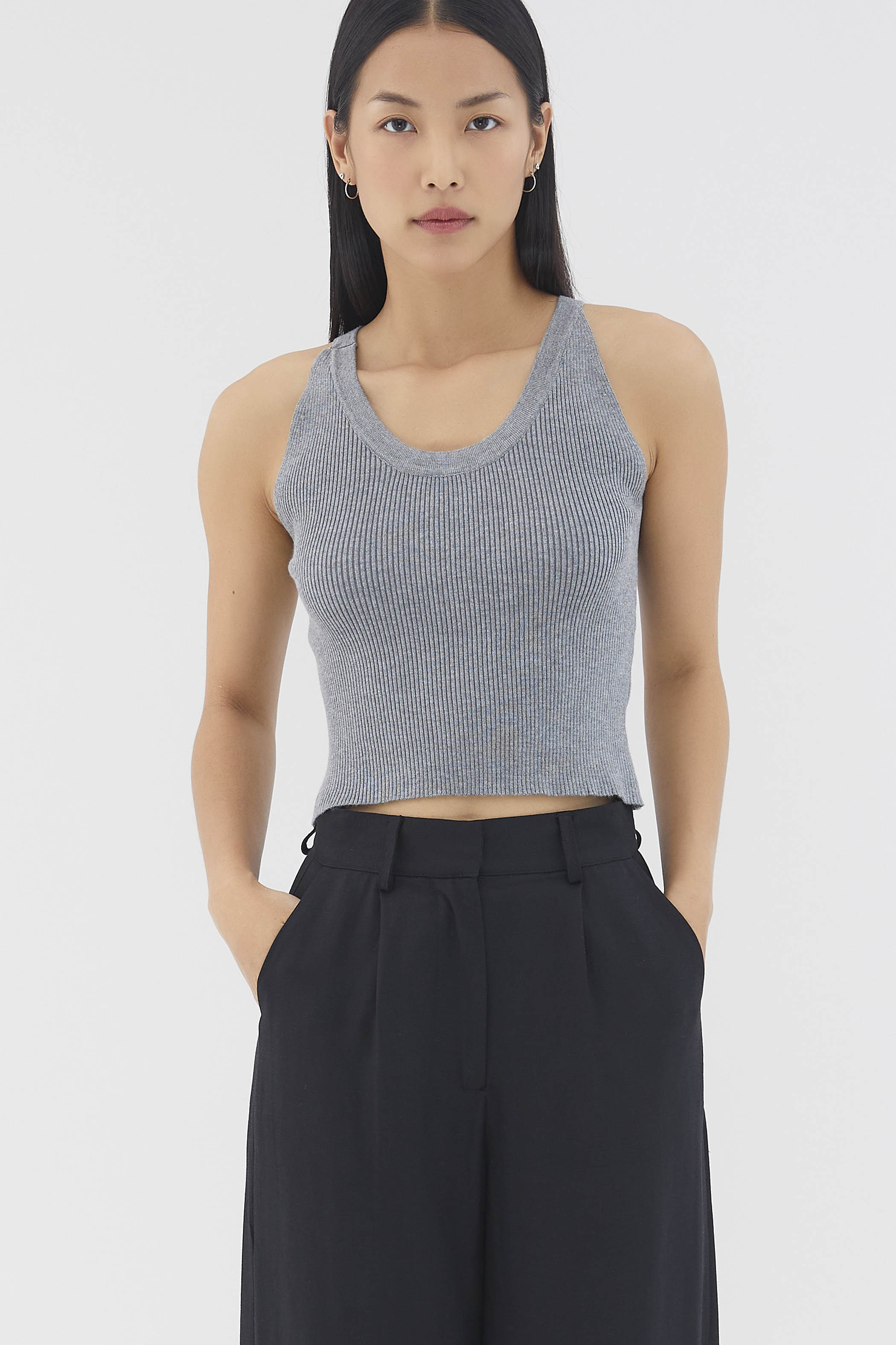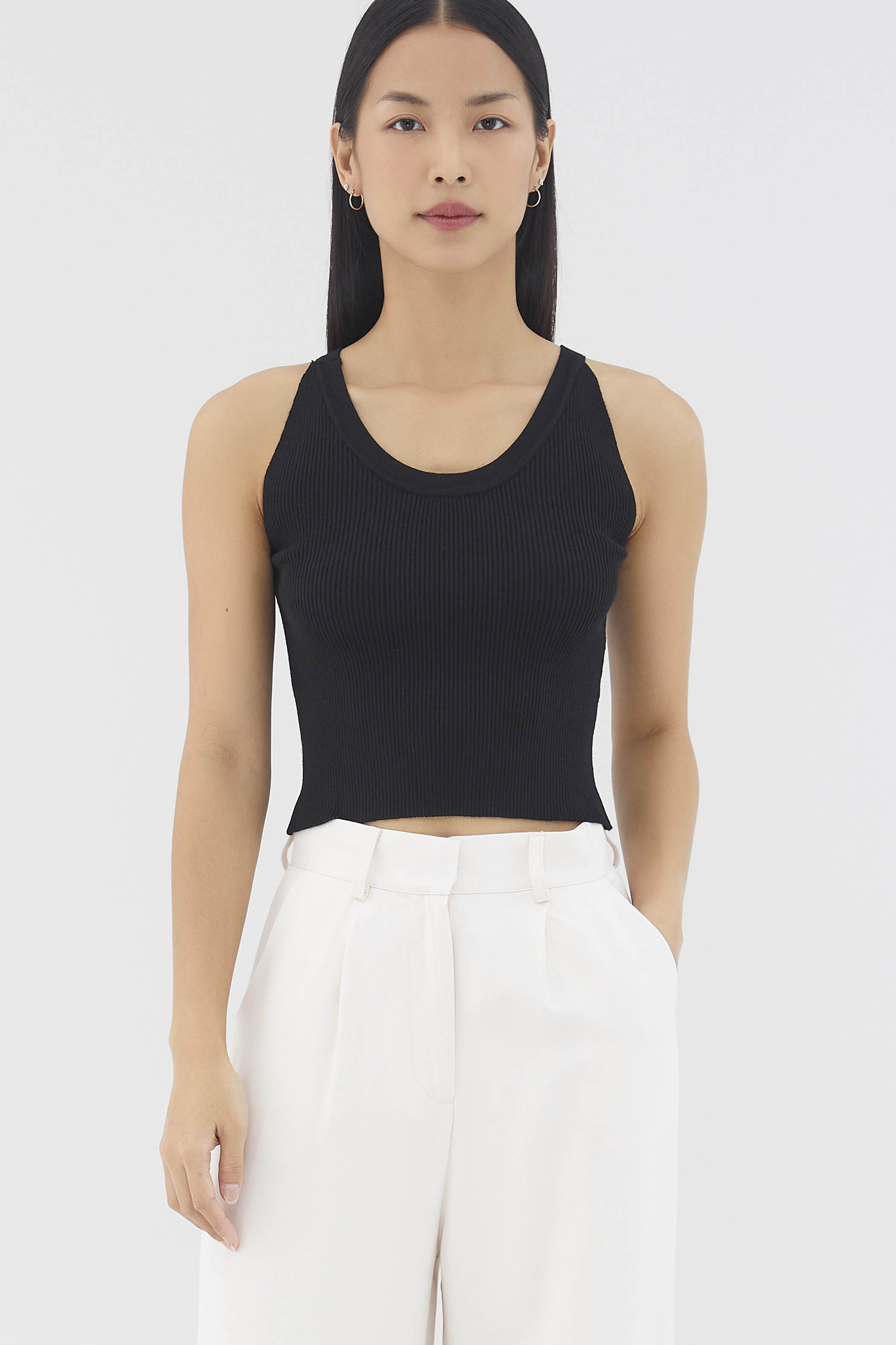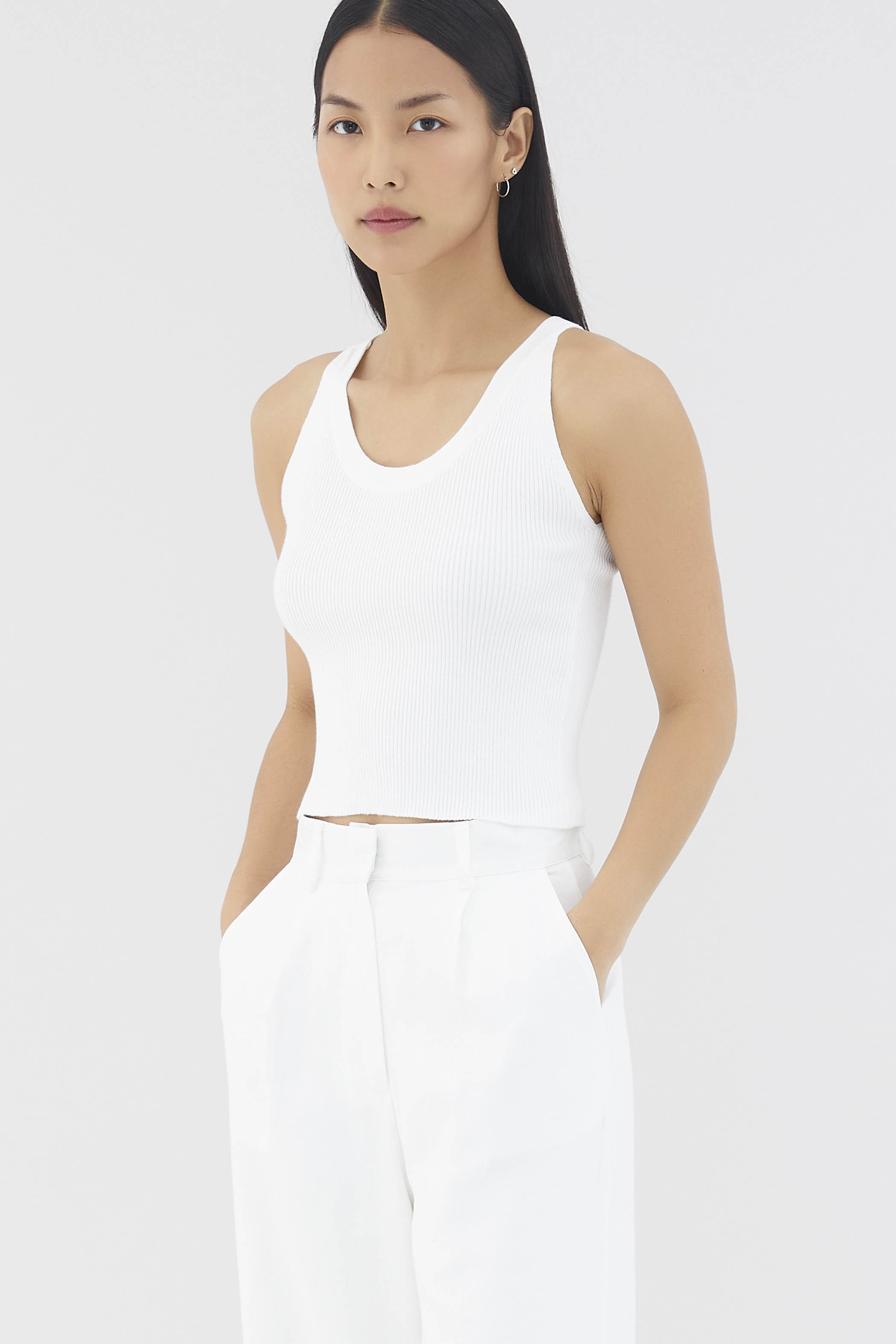Form flattering. Made from soft and stretchy knit, this sleeveless top features a V-neckline, wide shoulder straps and a slightly cropped length. Worn in a slim fit.