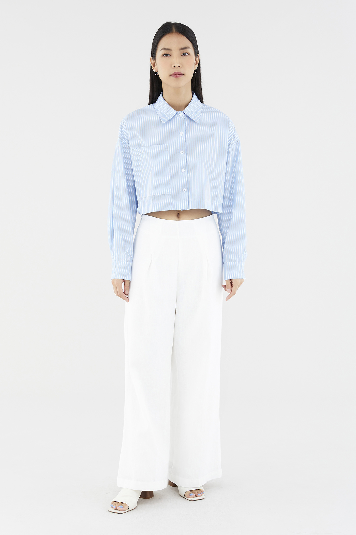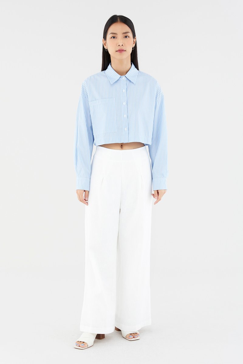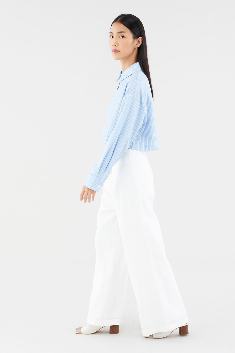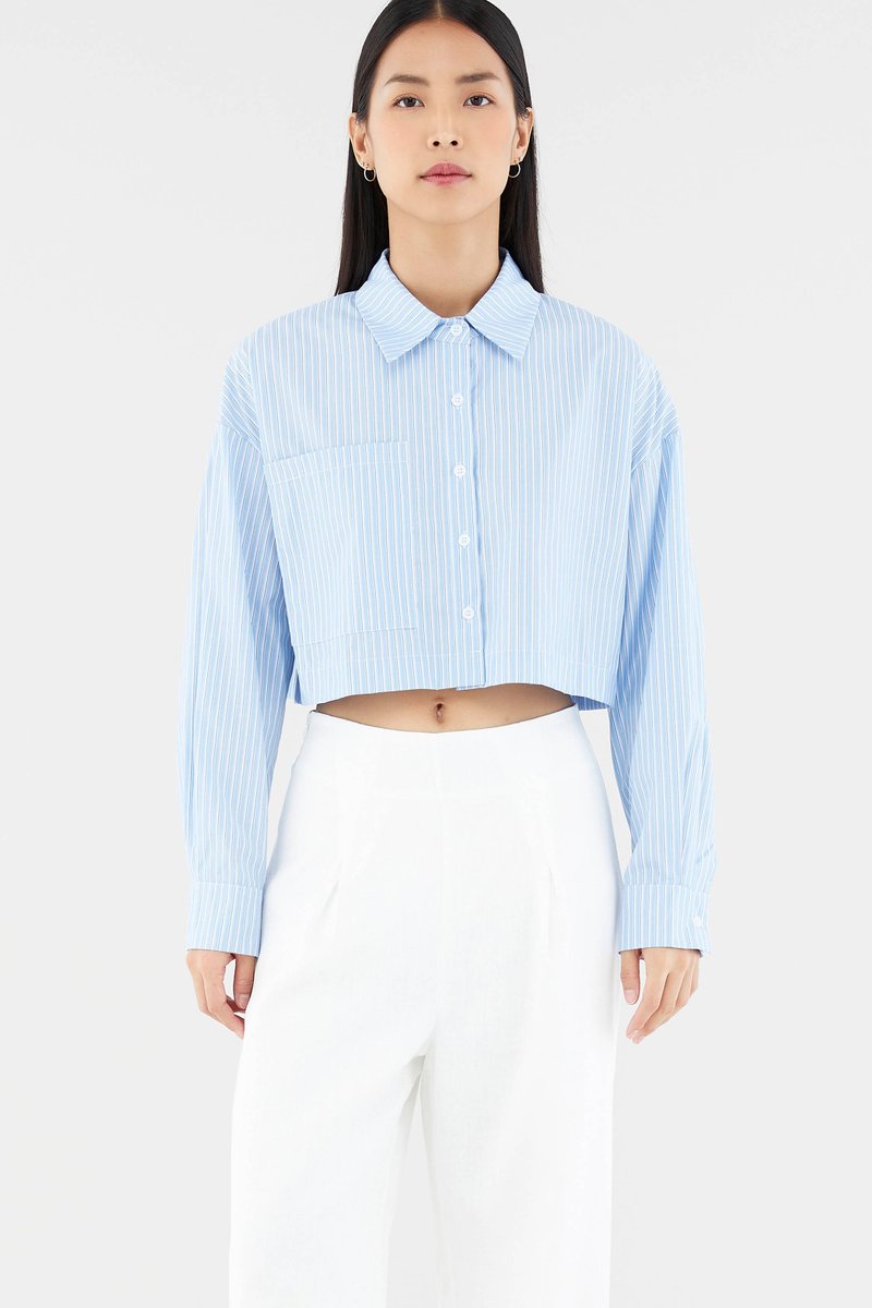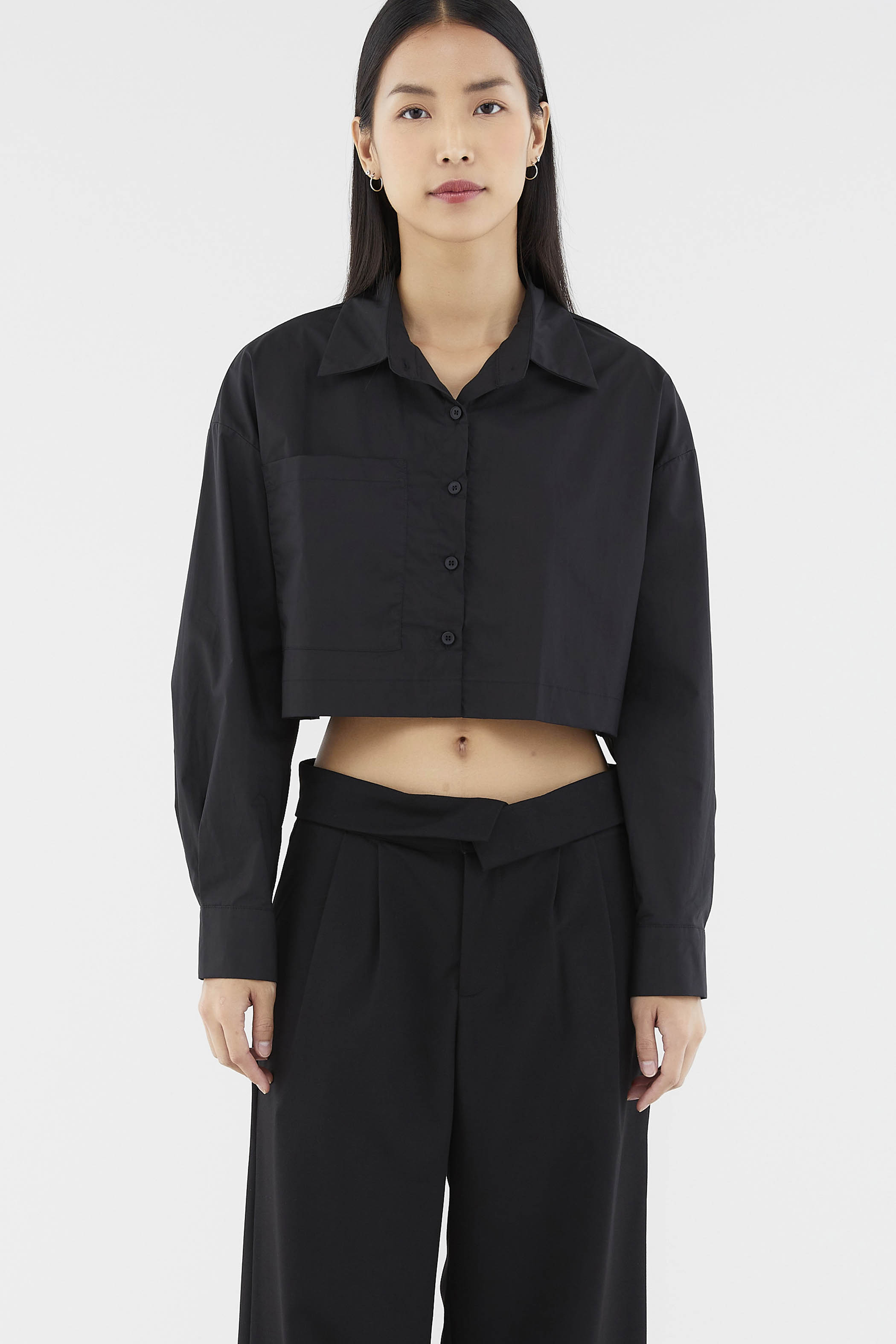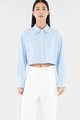 Cool cuts. Made from crisp and gently structured fabric, this shirt features long sleeves, a button-down opening and an oversized, boxy silhouette. Fits relaxed in a cropped length.