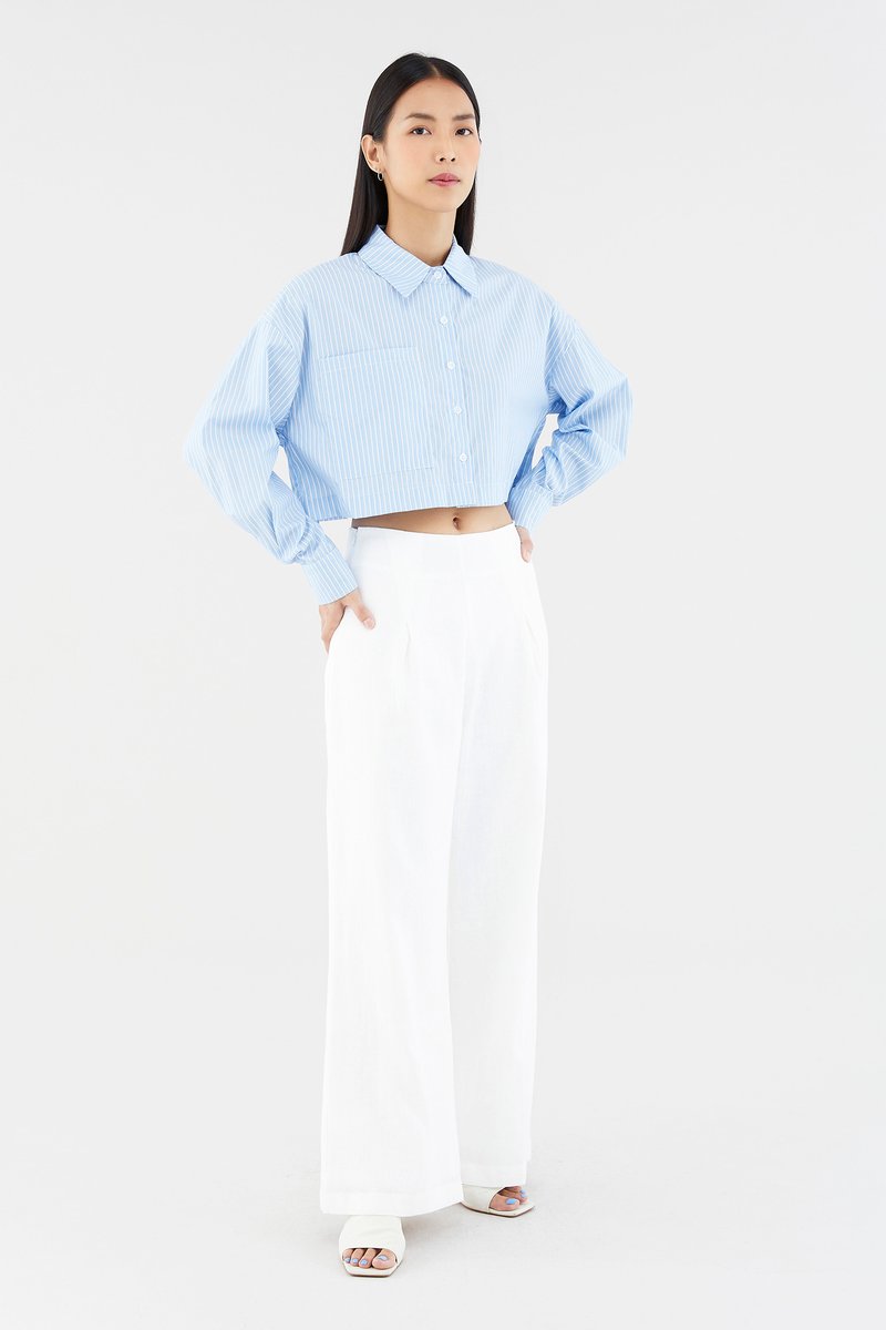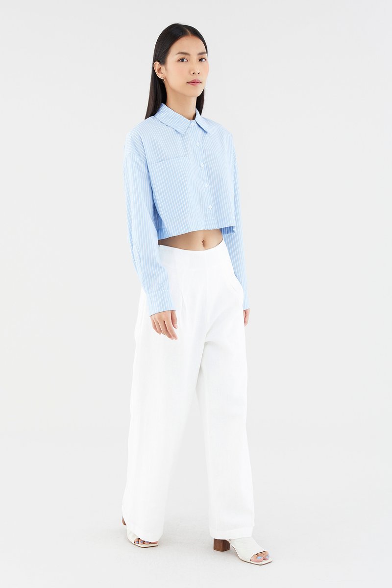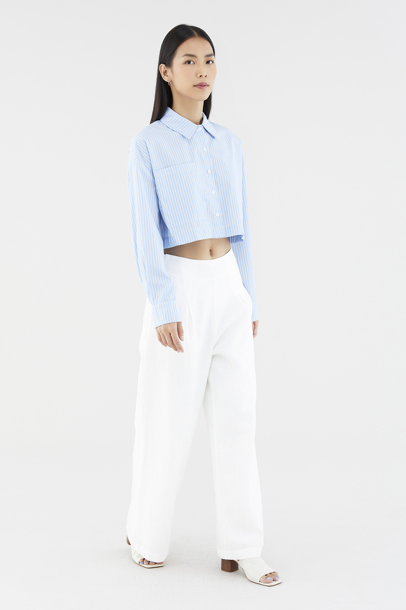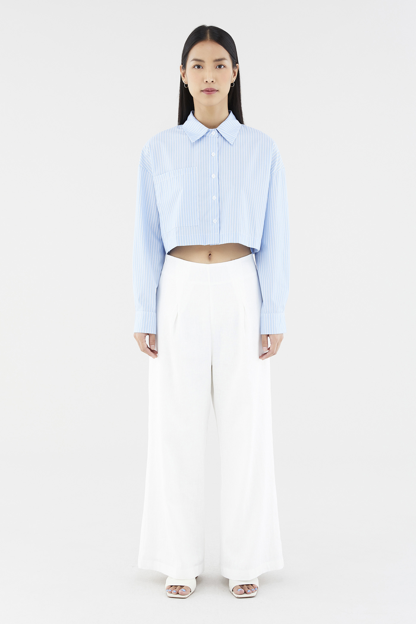 Cool cuts. Made from crisp and gently structured fabric, this shirt features long sleeves, a button-down opening and an oversized, boxy silhouette. Fits relaxed in a cropped length.