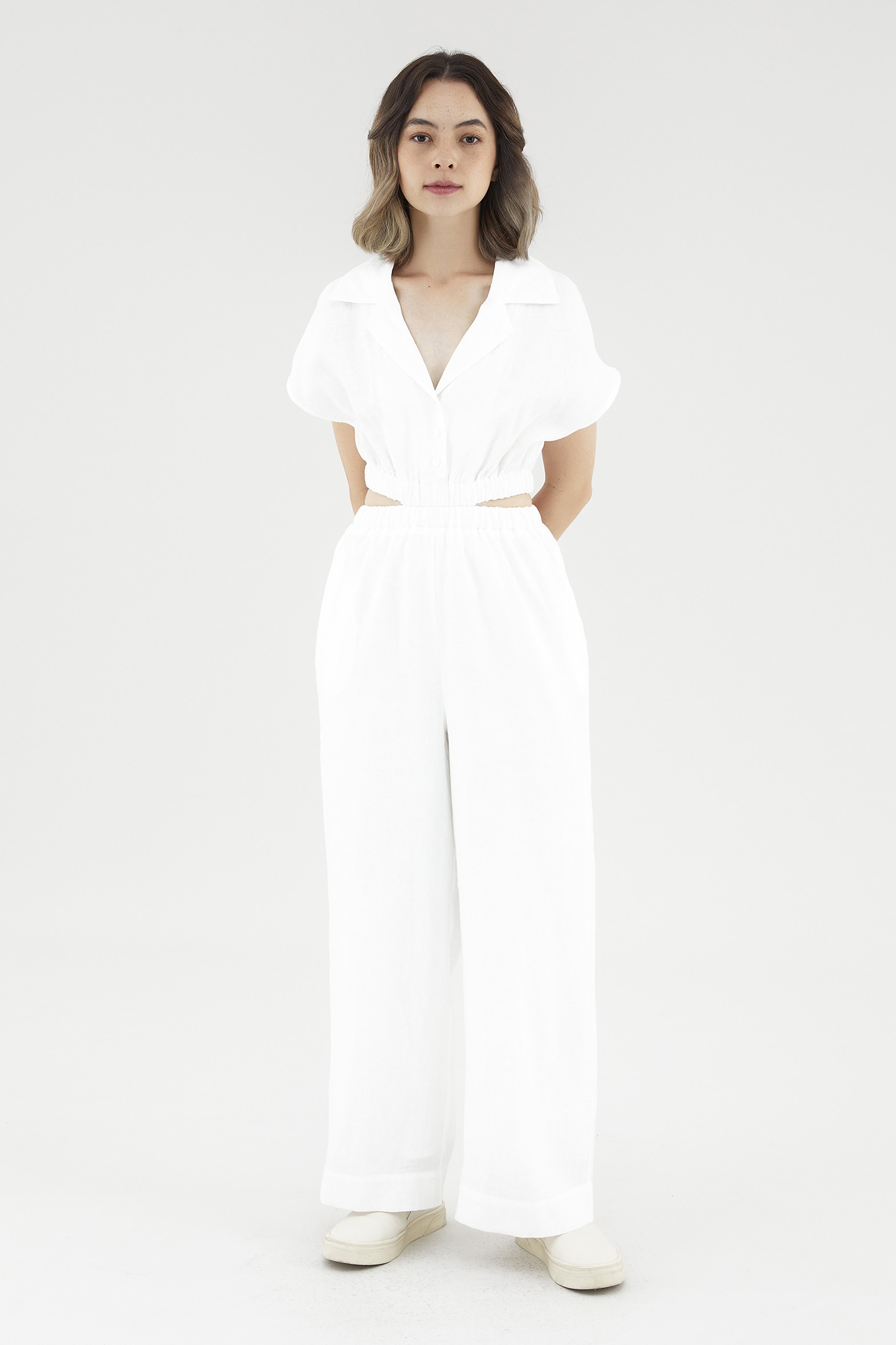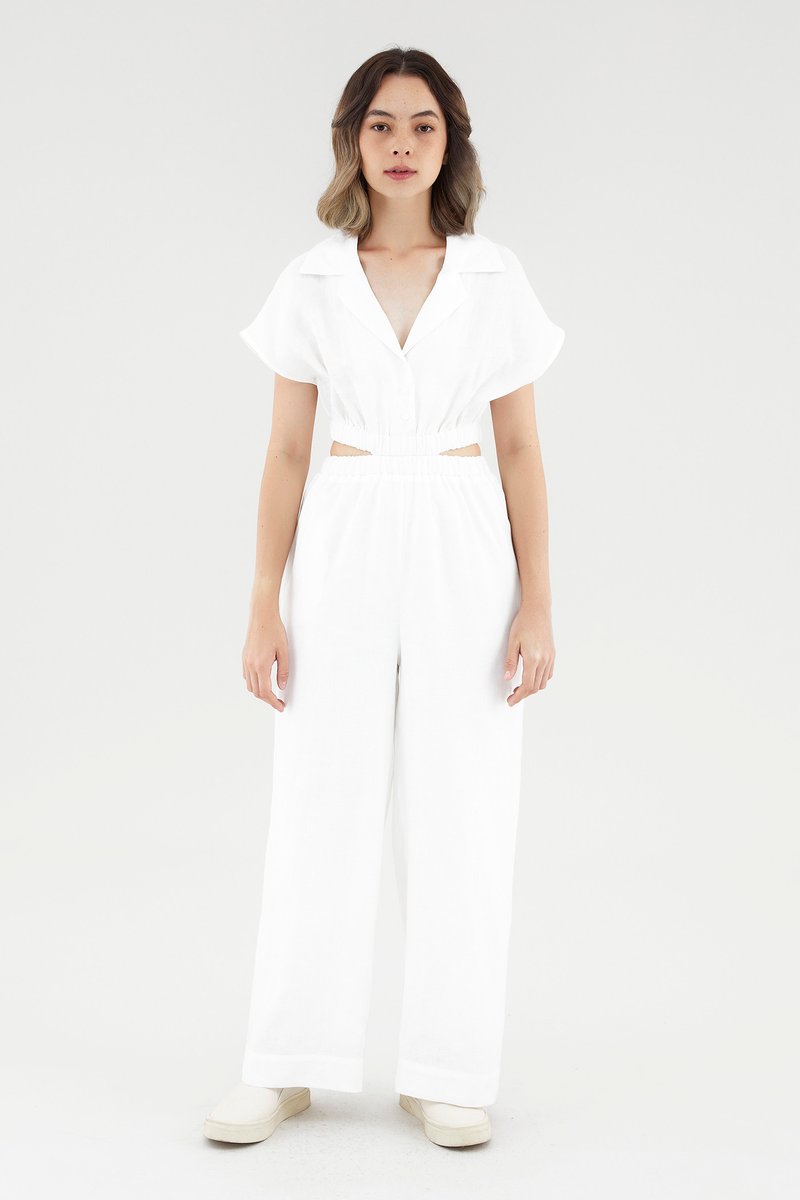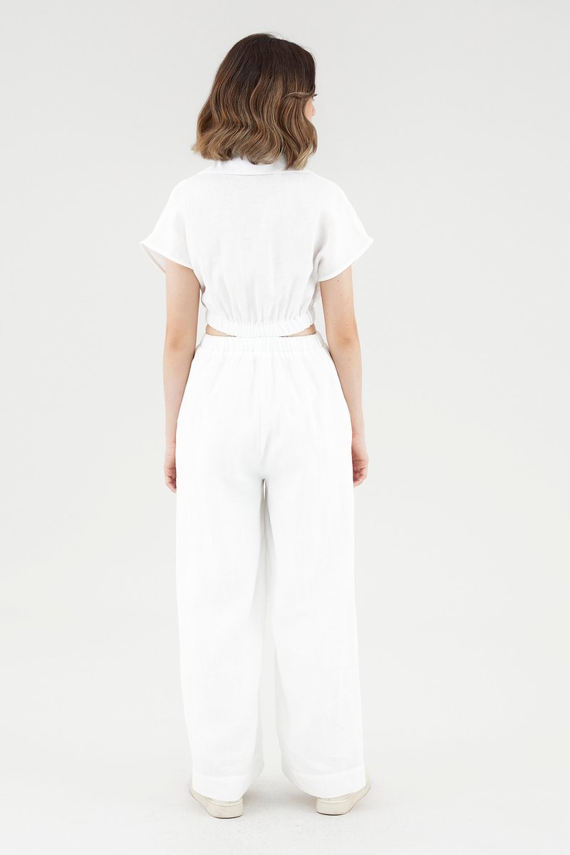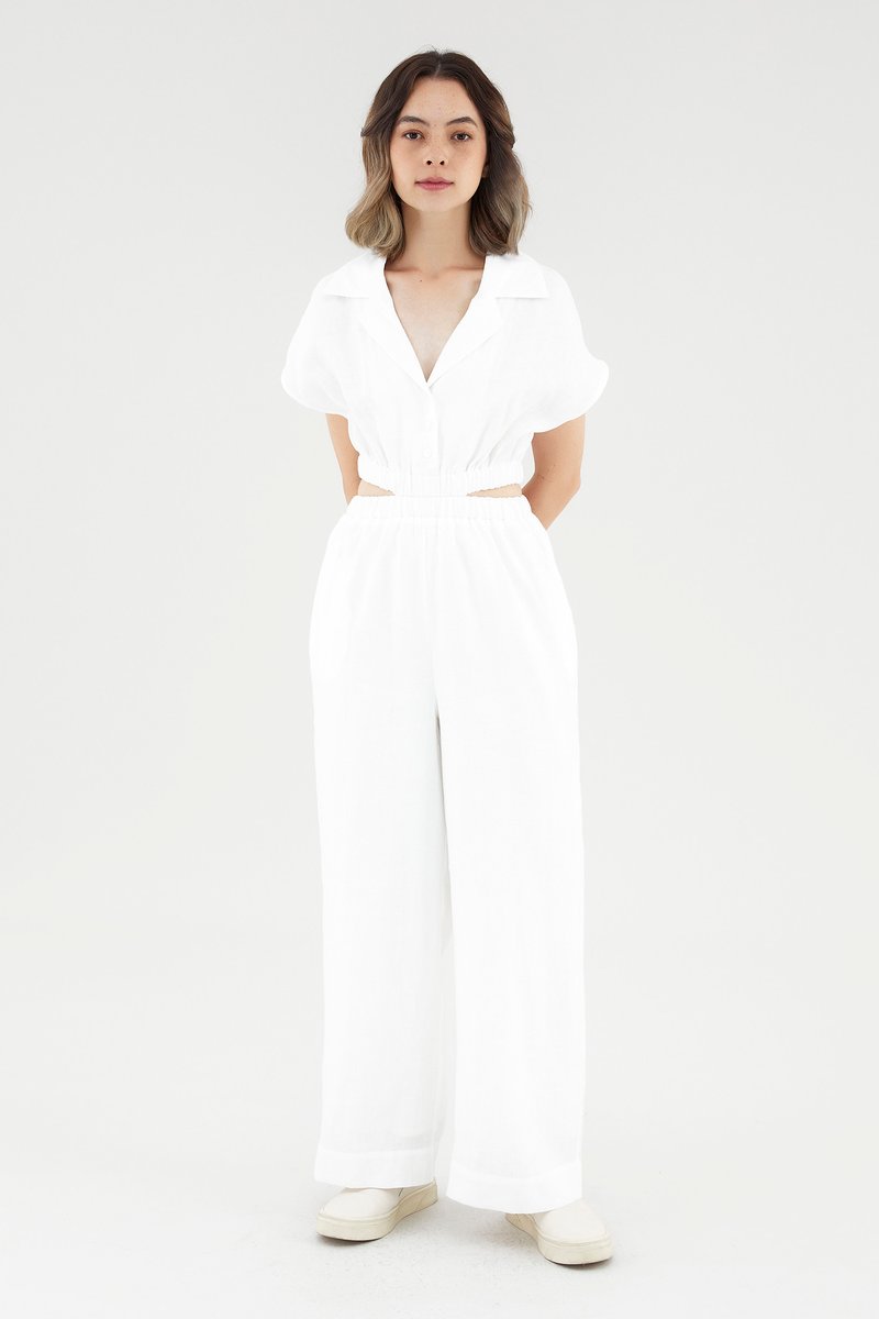 <p><span style="font-weight: 400;">Fabric Composition: 100% Linen</span></p> <p><span style="font-weight: 400;">Lining: Bodice is unlined; pants are fully lined. </span></p> <p><span style="font-weight: 400;">Sheerness: Bodice is slightly sheer, nude undergarments are recommended. Pants are opaque. </span></p> <p><span style="font-weight: 400;">Pockets: Two pockets on the side</span></p> <p><span style="font-weight: 400;">Polished silhouette, playful details. Cut from airy and non-stretch linen, this jumpsuit features a shirt top with a collared V-neckline and front button-down closure, wide short sleeves, an elasticated waist with side cut-outs and flowy, wide legs. Worn in a slim fit. </span></p> <p><span style="font-weight: 400;">Care Instructions: Do not soak / Do not bleach / Handwash or Machine wash on gentle mode / Do not machine dry / Iron using low heat</span></p> <p><i><span style="font-weight: 400;">This piece is made from 100% linen, the unsung hero of hot days and one of the least environmentally damaging fabrics. Derived from the unfussy flax plant, not only does its cultivation consume significantly less water, pesticides and arable land — but linen’s excellent durability and biodegradable nature also means your clothes have a longer, more waste-free life cycle.</span></i></p>
