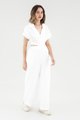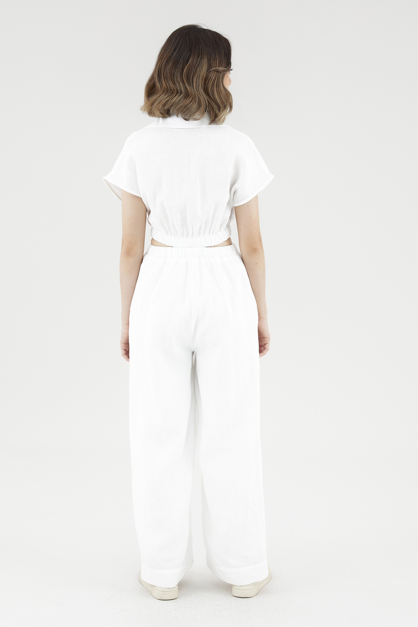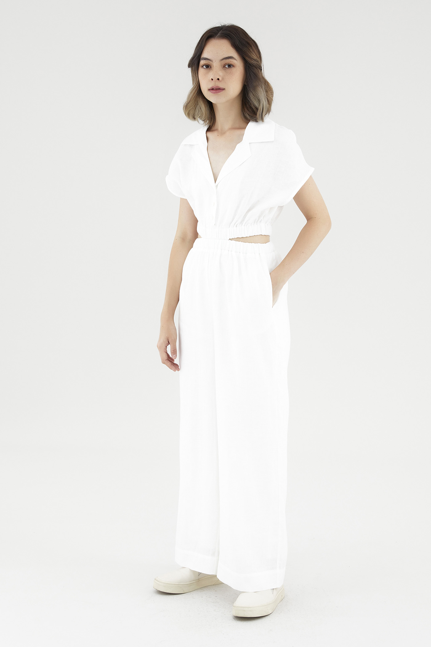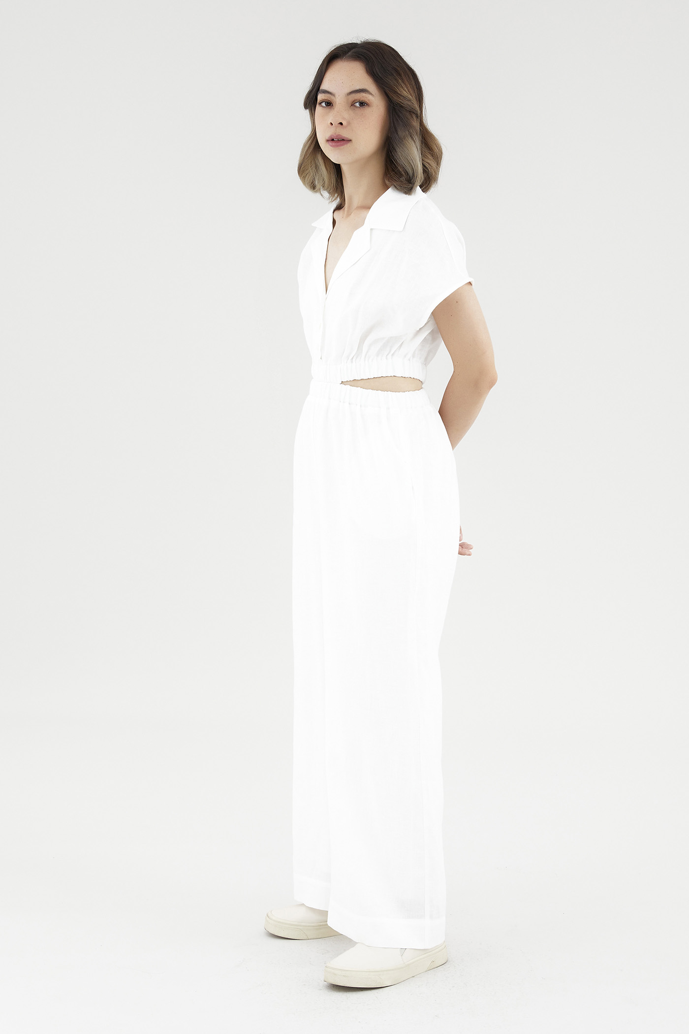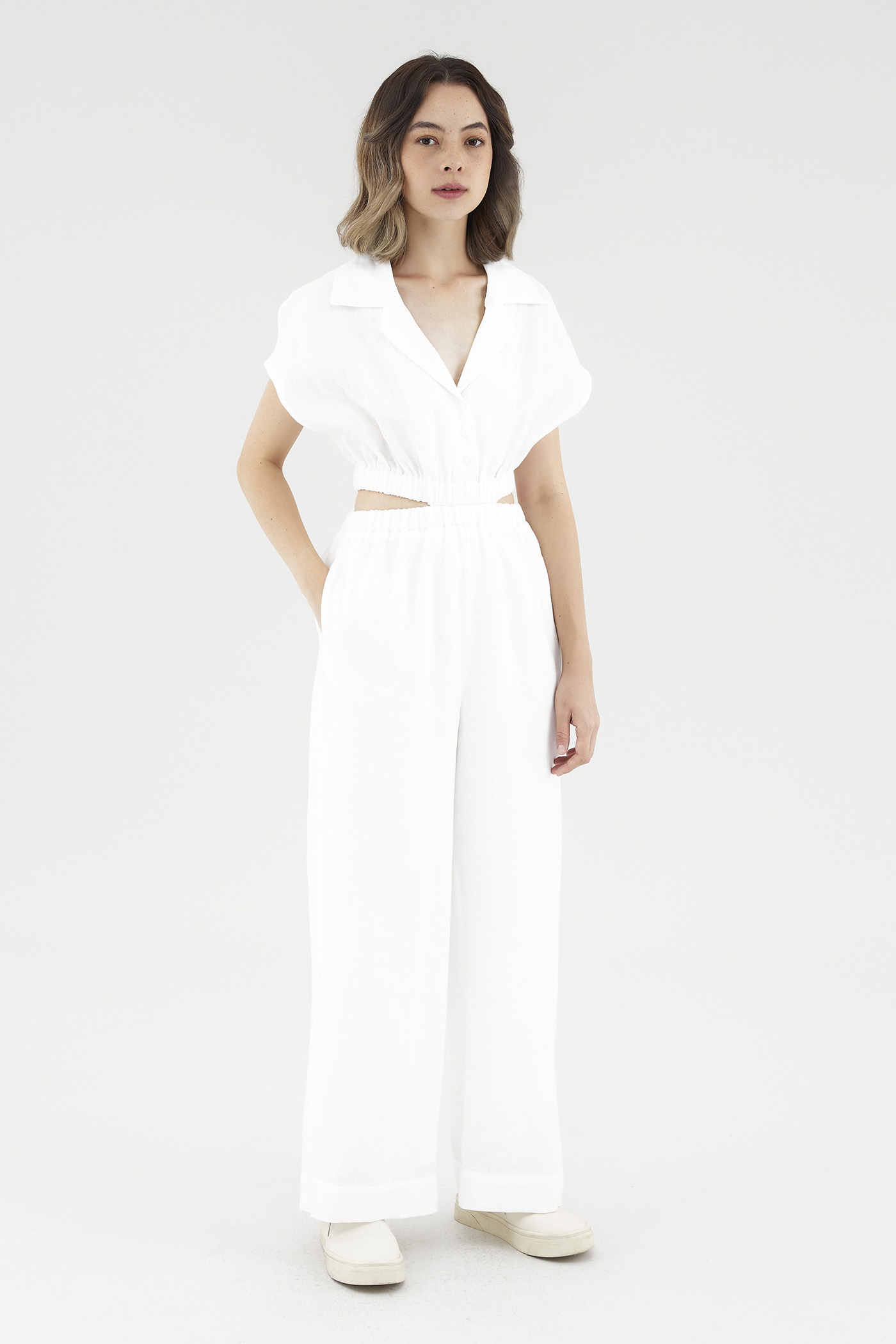 <p><span style="font-weight: 400;">Fabric Composition: 100% Linen</span></p> <p><span style="font-weight: 400;">Lining: Bodice is unlined; pants are fully lined. </span></p> <p><span style="font-weight: 400;">Sheerness: Bodice is slightly sheer, nude undergarments are recommended. Pants are opaque. </span></p> <p><span style="font-weight: 400;">Pockets: Two pockets on the side</span></p> <p><span style="font-weight: 400;">Polished silhouette, playful details. Cut from airy and non-stretch linen, this jumpsuit features a shirt top with a collared V-neckline and front button-down closure, wide short sleeves, an elasticated waist with side cut-outs and flowy, wide legs. Worn in a slim fit. </span></p> <p><span style="font-weight: 400;">Care Instructions: Do not soak / Do not bleach / Handwash or Machine wash on gentle mode / Do not machine dry / Iron using low heat</span></p> <p><i><span style="font-weight: 400;">This piece is made from 100% linen, the unsung hero of hot days and one of the least environmentally damaging fabrics. Derived from the unfussy flax plant, not only does its cultivation consume significantly less water, pesticides and arable land — but linen’s excellent durability and biodegradable nature also means your clothes have a longer, more waste-free life cycle.</span></i></p>