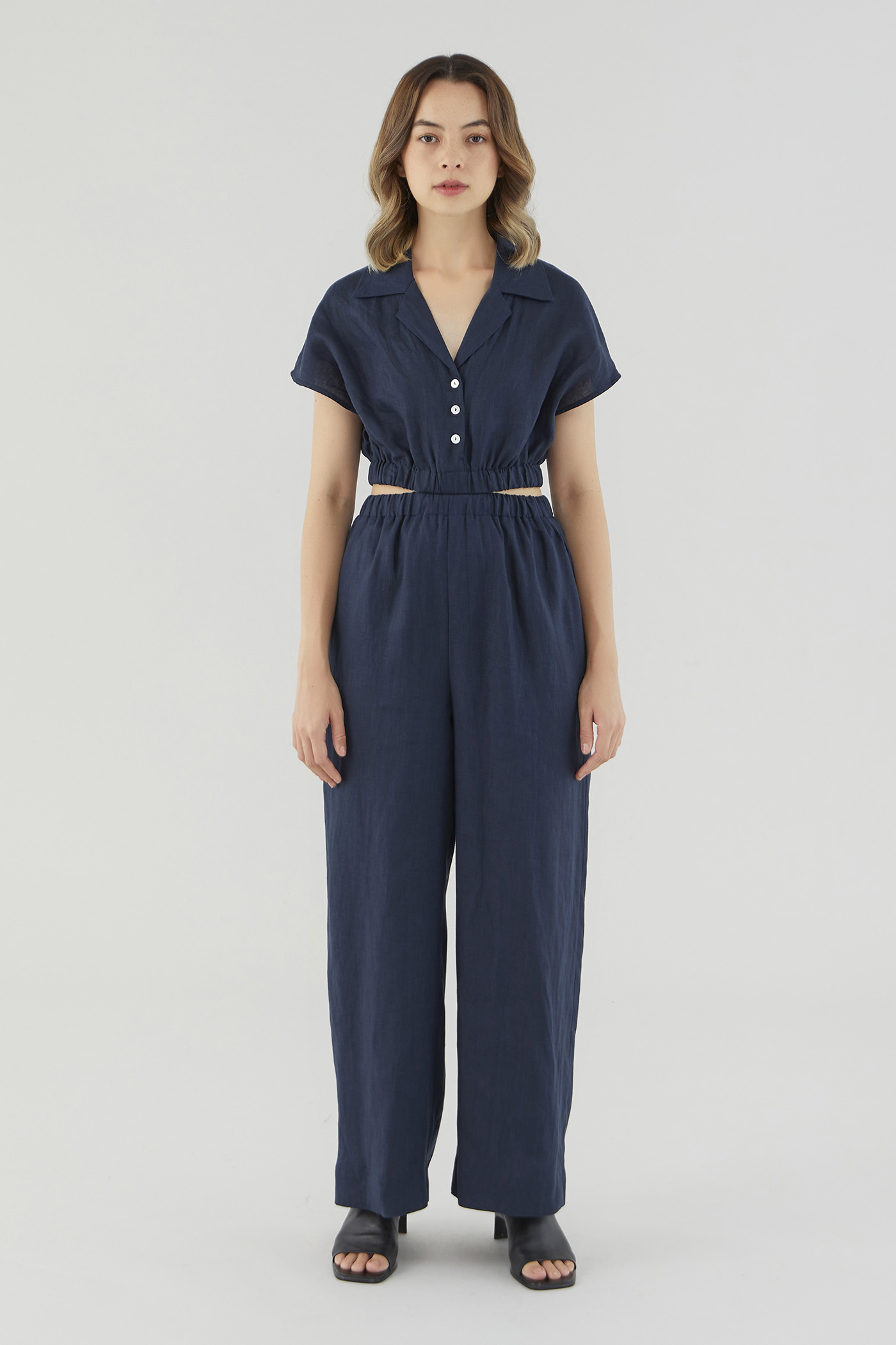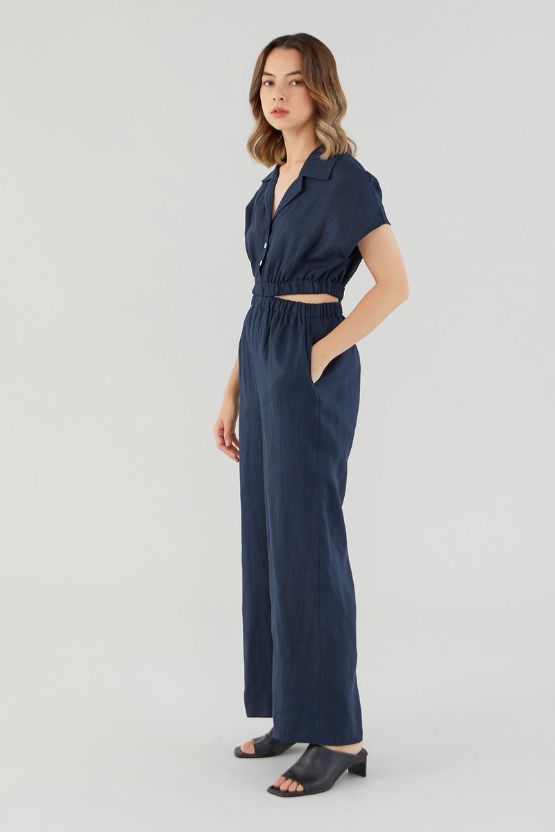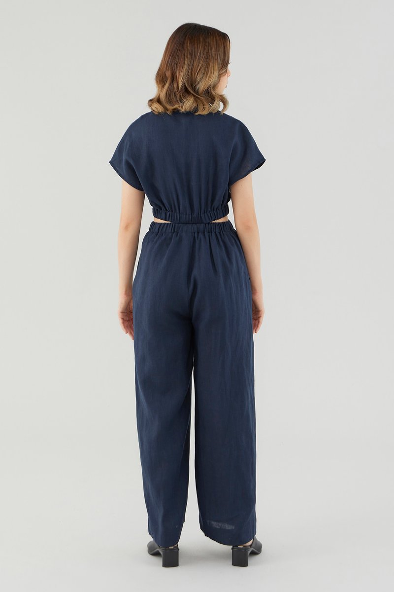 <p><span style="font-weight: 400;">Fabric Composition: 100% Linen</span></p> <p><span style="font-weight: 400;">Lining: Bodice is unlined; pants are fully lined. </span></p> <p><span style="font-weight: 400;">Sheerness: Bodice may be slightly sheer; nude undergarments are recommended for lighter colour options. Pants are not sheer. </span></p> <p><span style="font-weight: 400;">Pockets: Two pockets on the side</span></p> <p><span style="font-weight: 400;">Polished silhouette, playful details. Cut from airy and non-stretch 100% linen, this jumpsuit features a shirt top with a collared V-neckline and front button closure, wide short sleeves, an elasticated waist with side cut-outs and flowy wide legs. Worn in a slim fit. </span></p> <p><span style="font-weight: 400;">Care Instructions: Do not soak / Do not bleach / Handwash or Machine wash on gentle mode / Do not machine dry / Iron using low heat</span></p> <p><i><span style="font-weight: 400;">This piece is made from 100% linen, the unsung hero of hot days and one of the least environmentally damaging fabrics. Derived from the unfussy flax plant, not only does its cultivation consume significantly less water, pesticides and arable land — but linen’s excellent durability and biodegradable nature also means your clothes have a longer, more waste-free life cycle.</span></i></p>