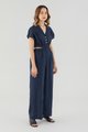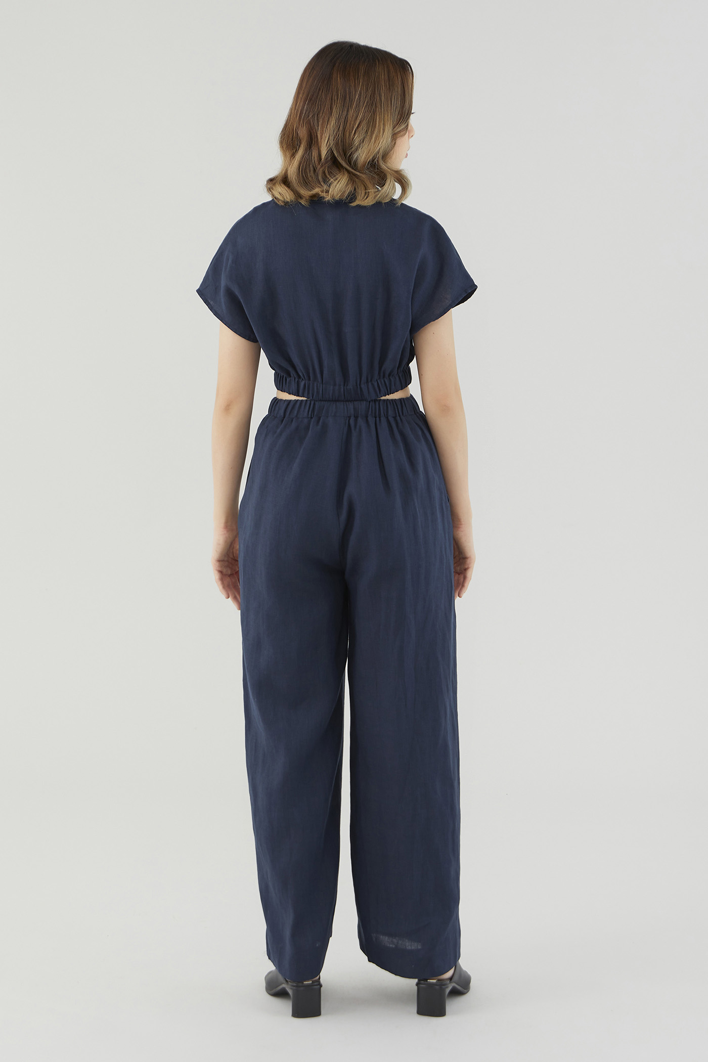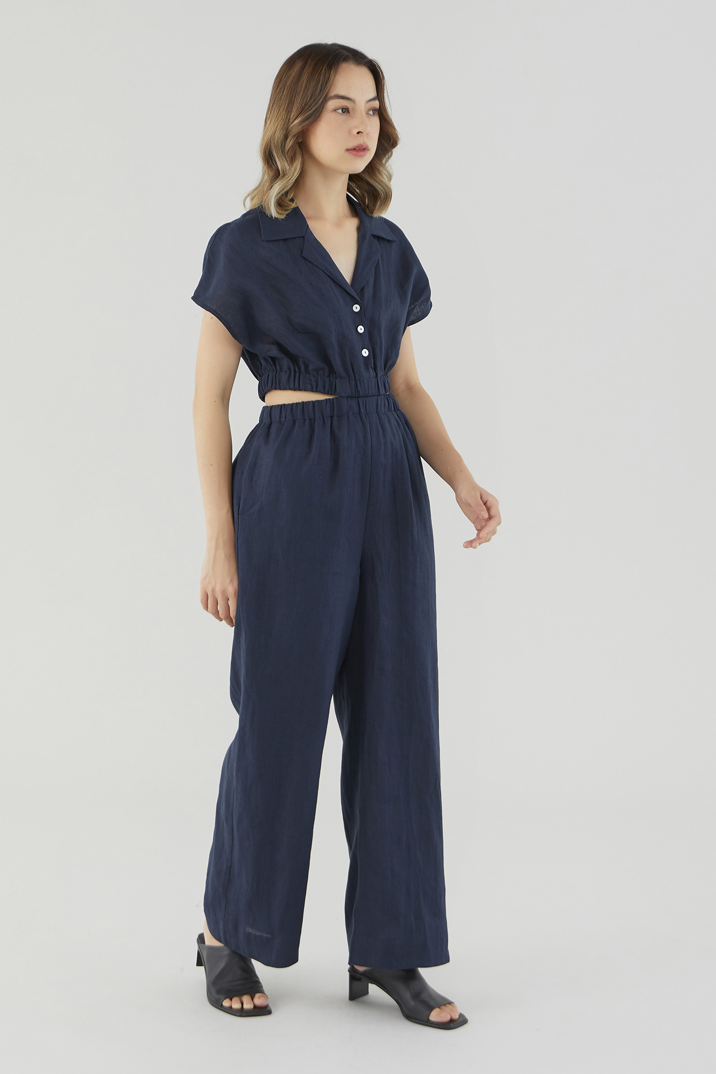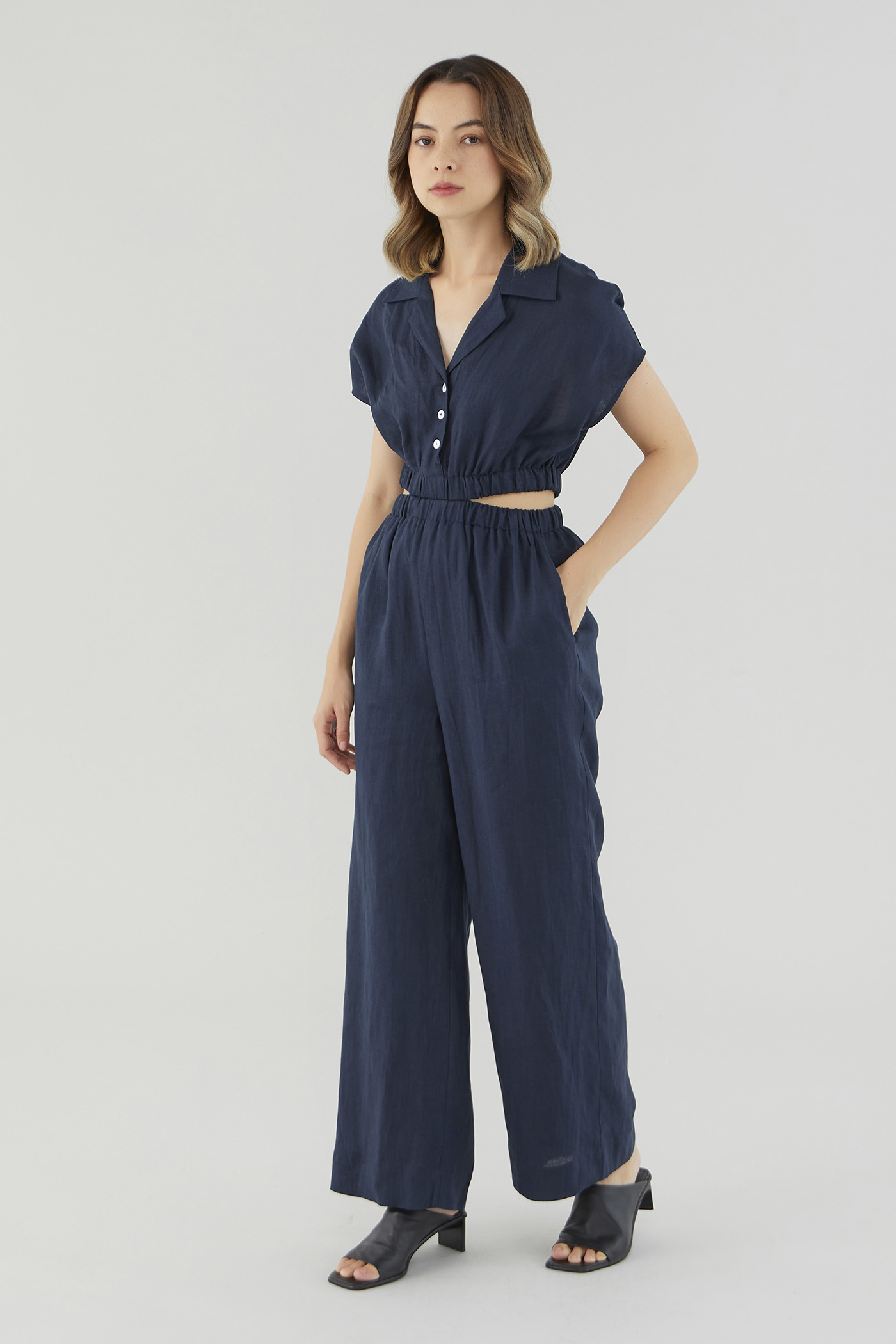 <p><span style="font-weight: 400;">Fabric Composition: 100% Linen</span></p> <p><span style="font-weight: 400;">Lining: Bodice is unlined; pants are fully lined. </span></p> <p><span style="font-weight: 400;">Sheerness: Bodice may be slightly sheer; nude undergarments are recommended for lighter colour options. Pants are not sheer. </span></p> <p><span style="font-weight: 400;">Pockets: Two pockets on the side</span></p> <p><span style="font-weight: 400;">Polished silhouette, playful details. Cut from airy and non-stretch 100% linen, this jumpsuit features a shirt top with a collared V-neckline and front button closure, wide short sleeves, an elasticated waist with side cut-outs and flowy wide legs. Worn in a slim fit. </span></p> <p><span style="font-weight: 400;">Care Instructions: Do not soak / Do not bleach / Handwash or Machine wash on gentle mode / Do not machine dry / Iron using low heat</span></p> <p><i><span style="font-weight: 400;">This piece is made from 100% linen, the unsung hero of hot days and one of the least environmentally damaging fabrics. Derived from the unfussy flax plant, not only does its cultivation consume significantly less water, pesticides and arable land — but linen’s excellent durability and biodegradable nature also means your clothes have a longer, more waste-free life cycle.</span></i></p>