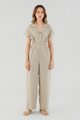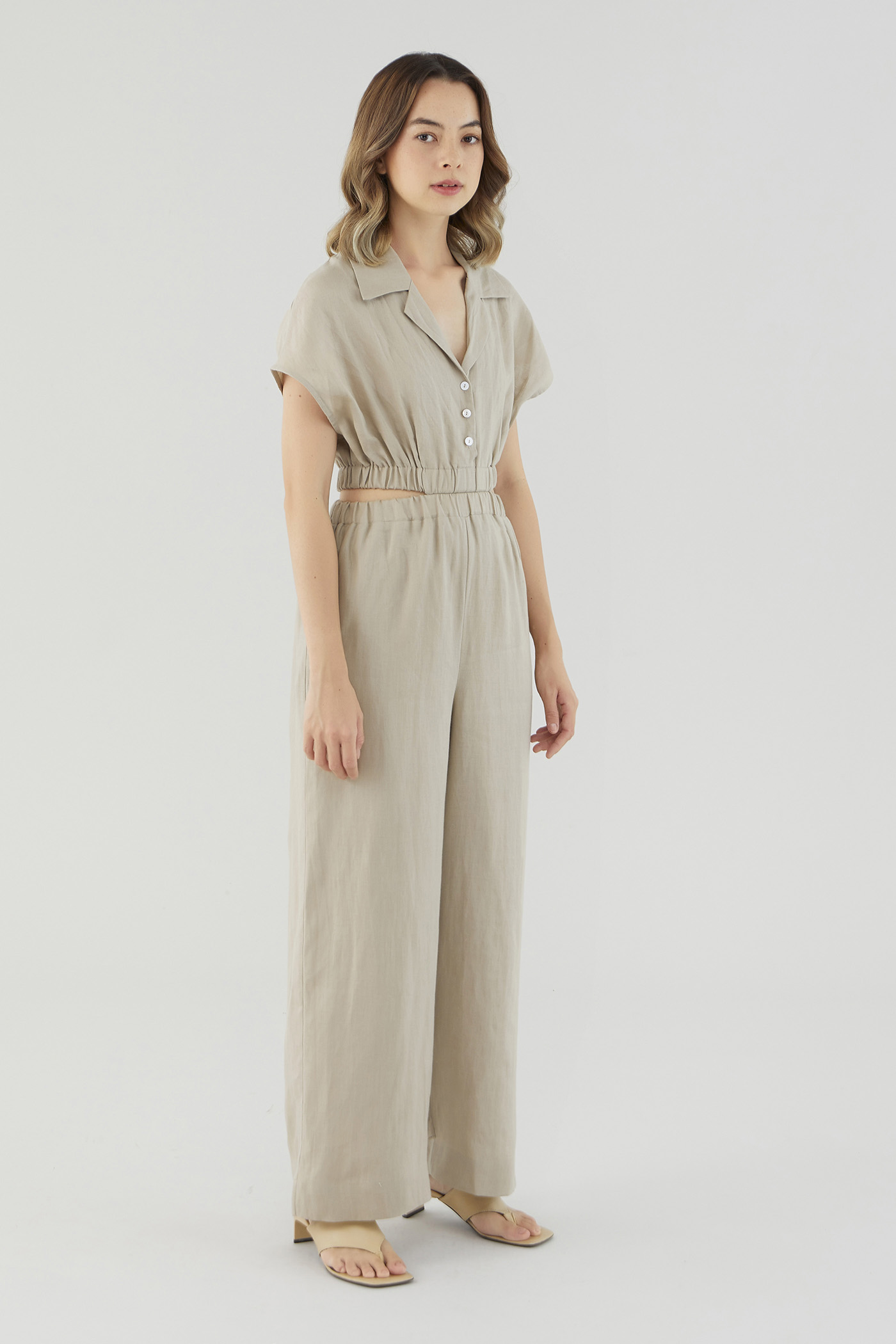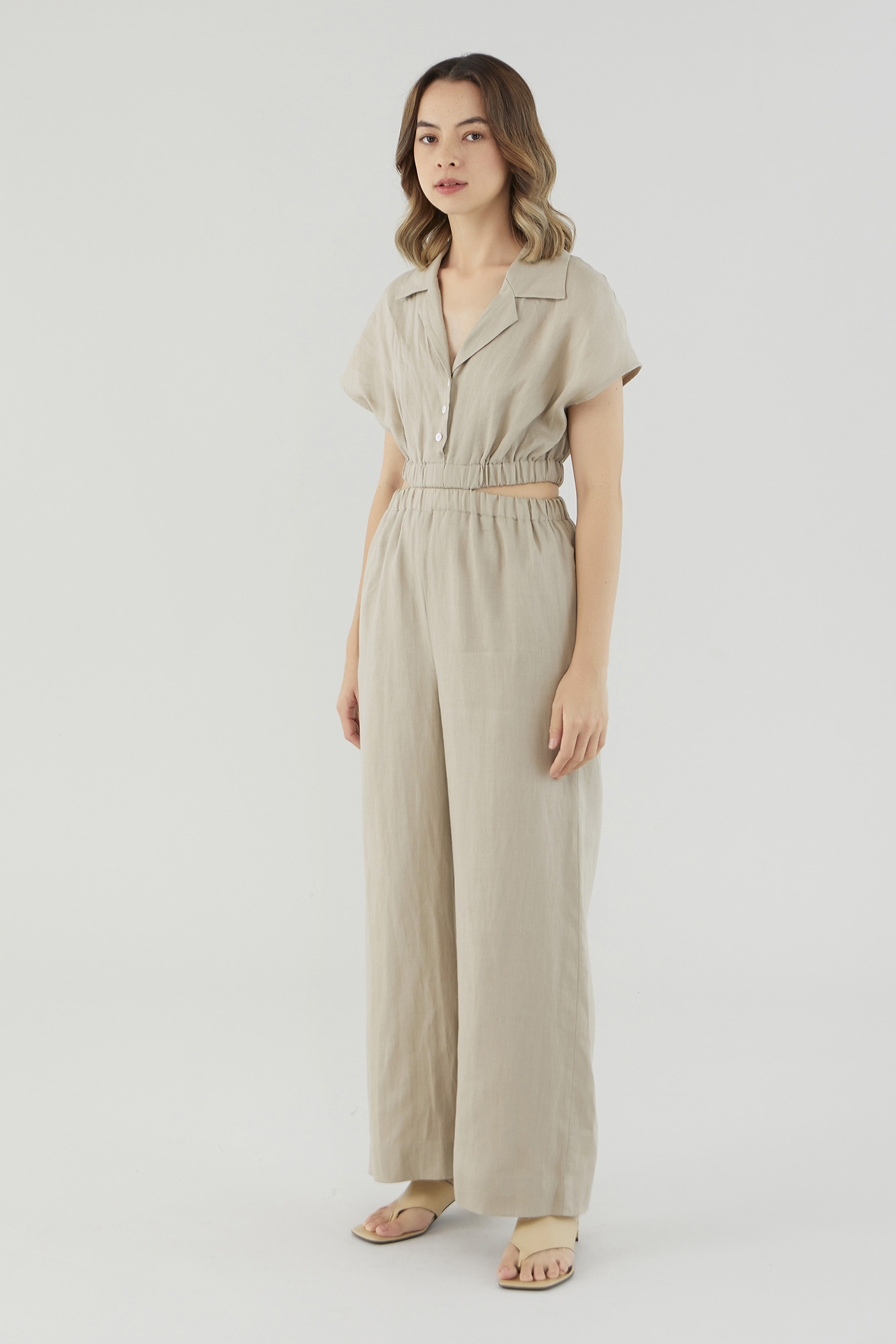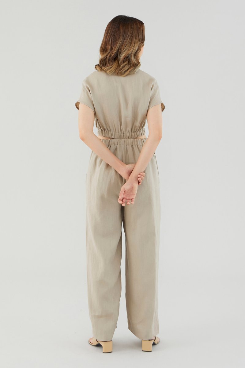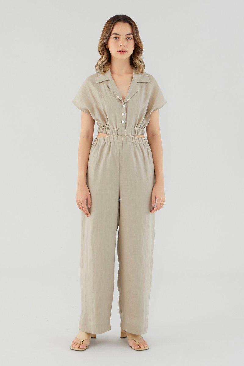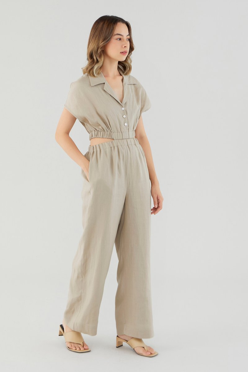 <p><span style="font-weight: 400;">Fabric Composition: 100% Linen</span></p> <p><span style="font-weight: 400;">Lining: Bodice is unlined; pants are fully lined. </span></p> <p><span style="font-weight: 400;">Sheerness: Bodice may be slightly sheer; nude undergarments are recommended for lighter colour options. Pants are not sheer. </span></p> <p><span style="font-weight: 400;">Pockets: Two pockets on the side</span></p> <p><span style="font-weight: 400;">Polished silhouette, playful details. Cut from airy and non-stretch 100% linen, this jumpsuit features a shirt top with a collared V-neckline and front button closure, wide short sleeves, an elasticated waist with side cut-outs and flowy wide legs. Worn in a slim fit. </span></p> <p><span style="font-weight: 400;">Care Instructions: Do not soak / Do not bleach / Handwash or Machine wash on gentle mode / Do not machine dry / Iron using low heat</span></p> <p><i><span style="font-weight: 400;">This piece is made from 100% linen, the unsung hero of hot days and one of the least environmentally damaging fabrics. Derived from the unfussy flax plant, not only does its cultivation consume significantly less water, pesticides and arable land — but linen’s excellent durability and biodegradable nature also means your clothes have a longer, more waste-free life cycle.</span></i></p>