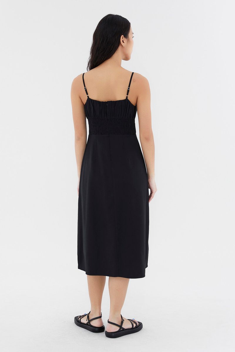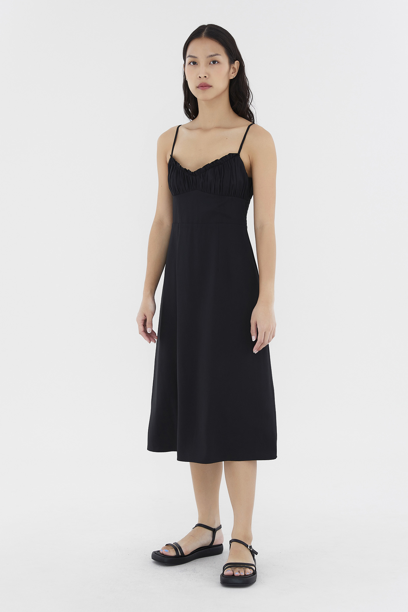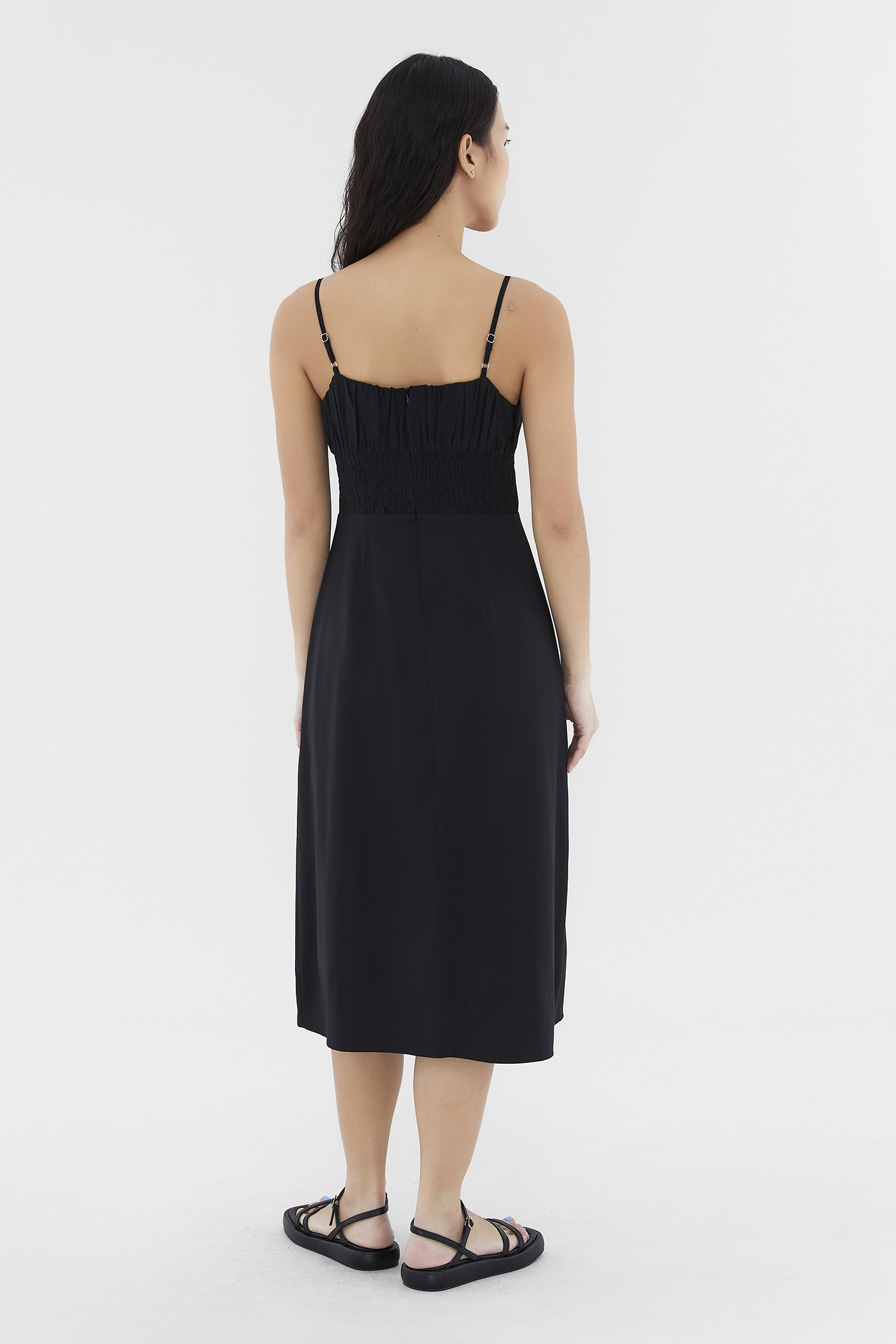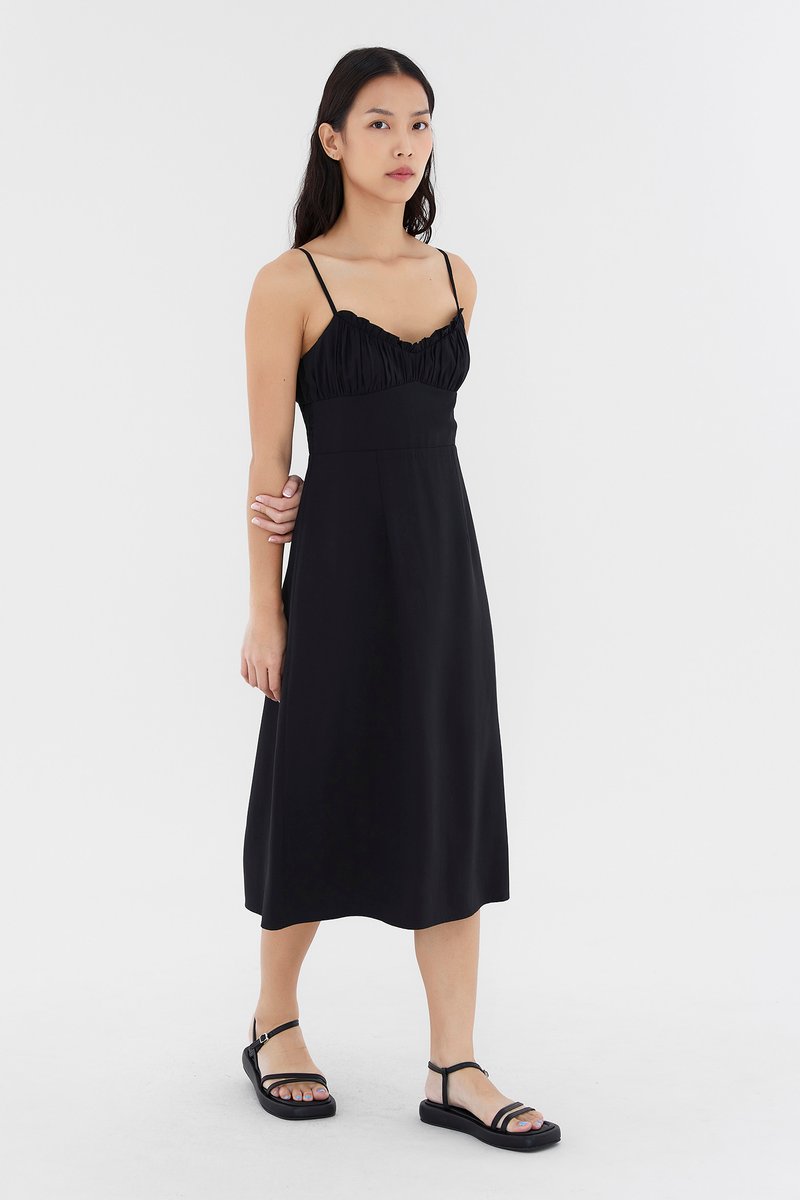 Add to your summer staples. Made from smooth and non-stretch fabric, this sleeveless midi dress features a ruched bust, a dipped, frill-trimmed neckline, slim adjustable shoulder straps, a wide waist panel and smocking at the back. Fits slim with a back zip closure.