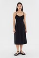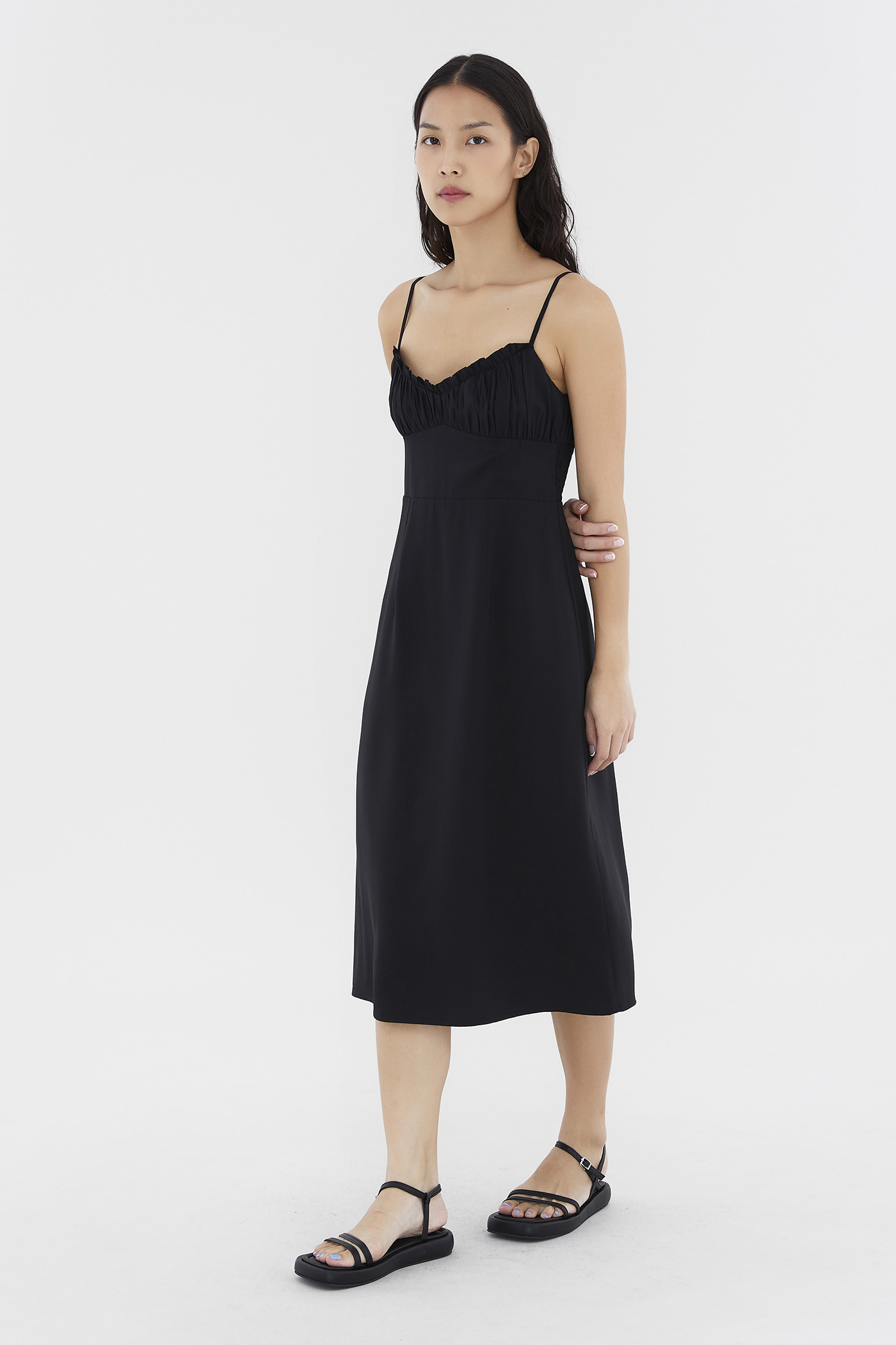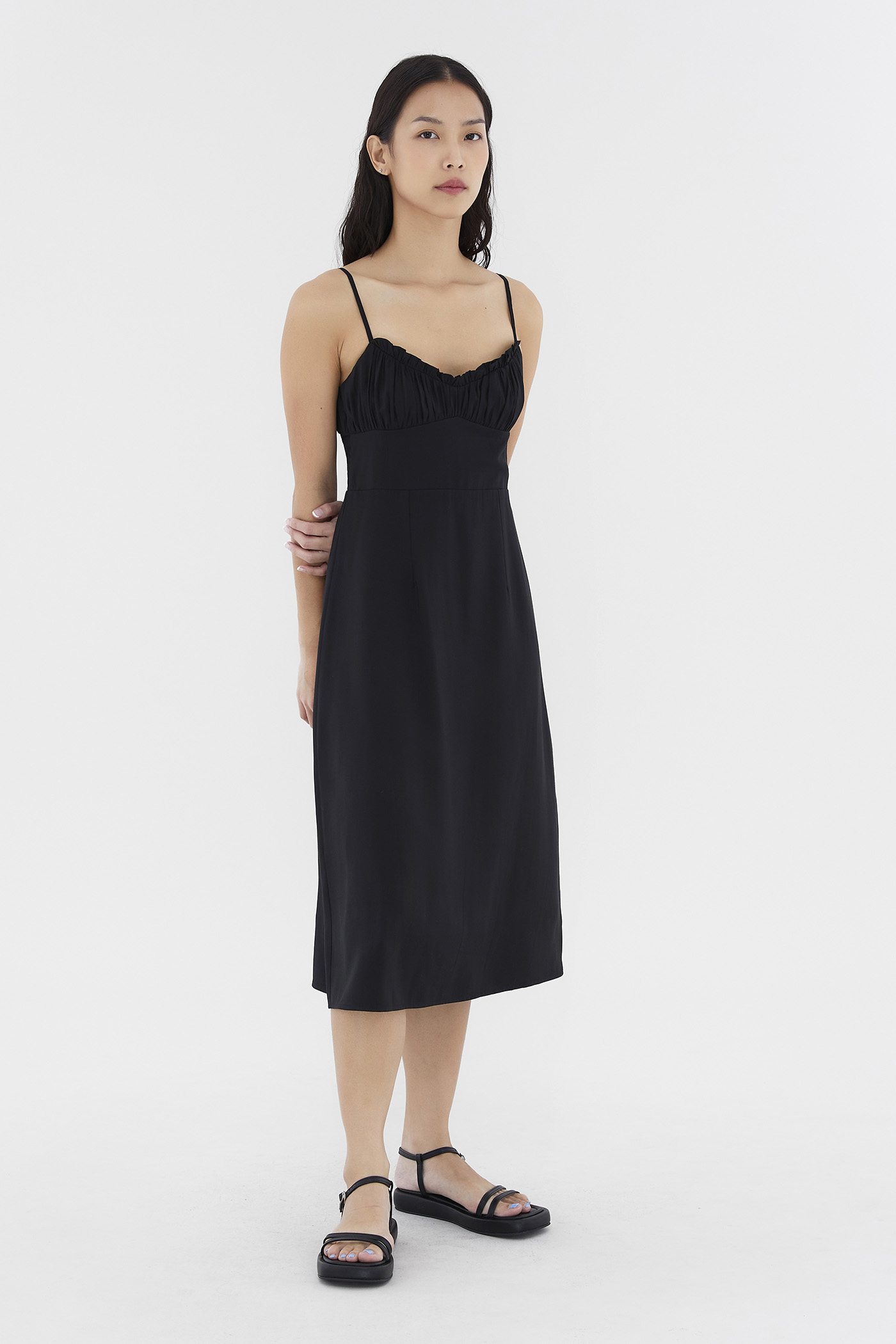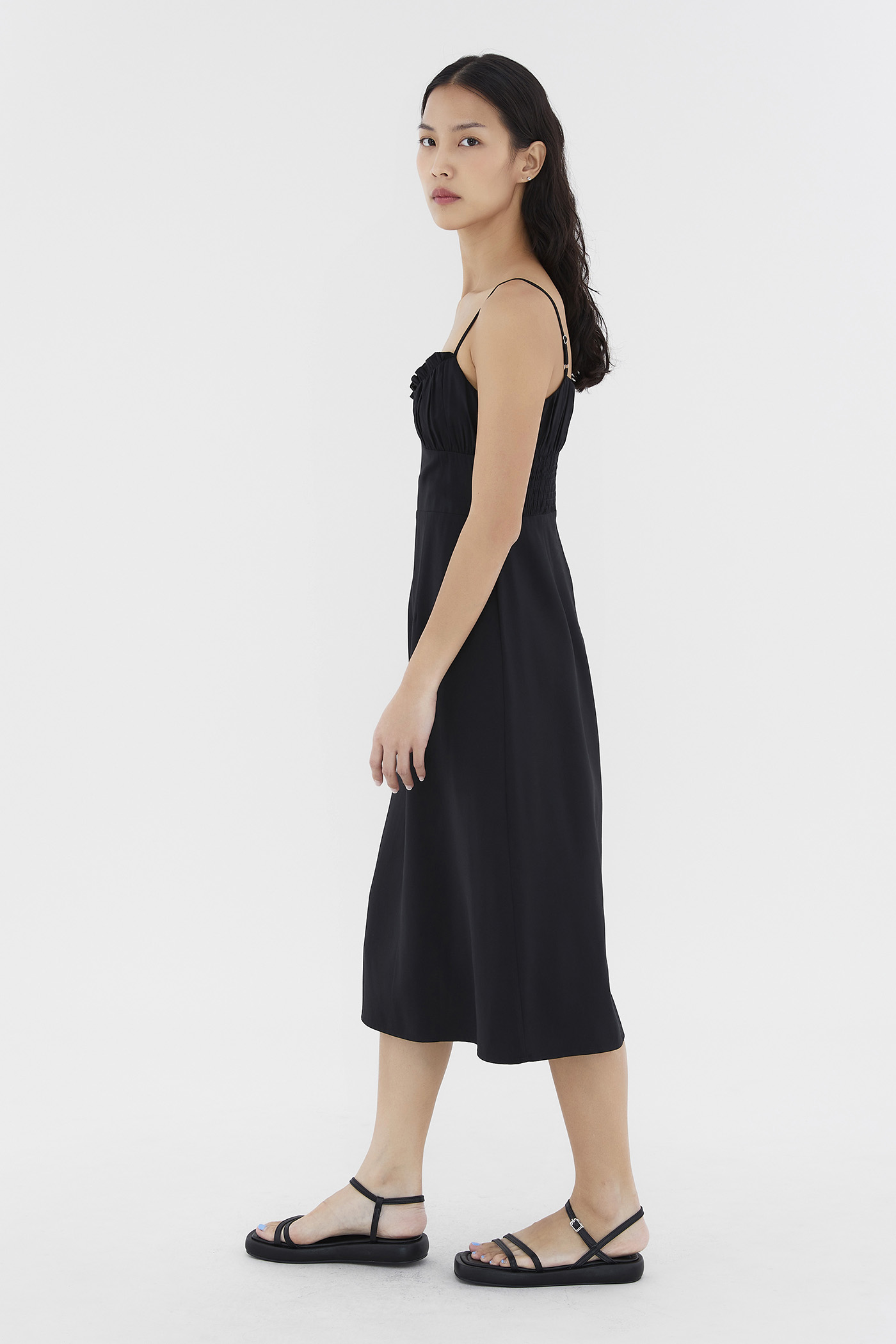 Add to your summer staples. Made from smooth and non-stretch fabric, this sleeveless midi dress features a ruched bust, a dipped, frill-trimmed neckline, slim adjustable shoulder straps, a wide waist panel and smocking at the back. Fits slim with a back zip closure.