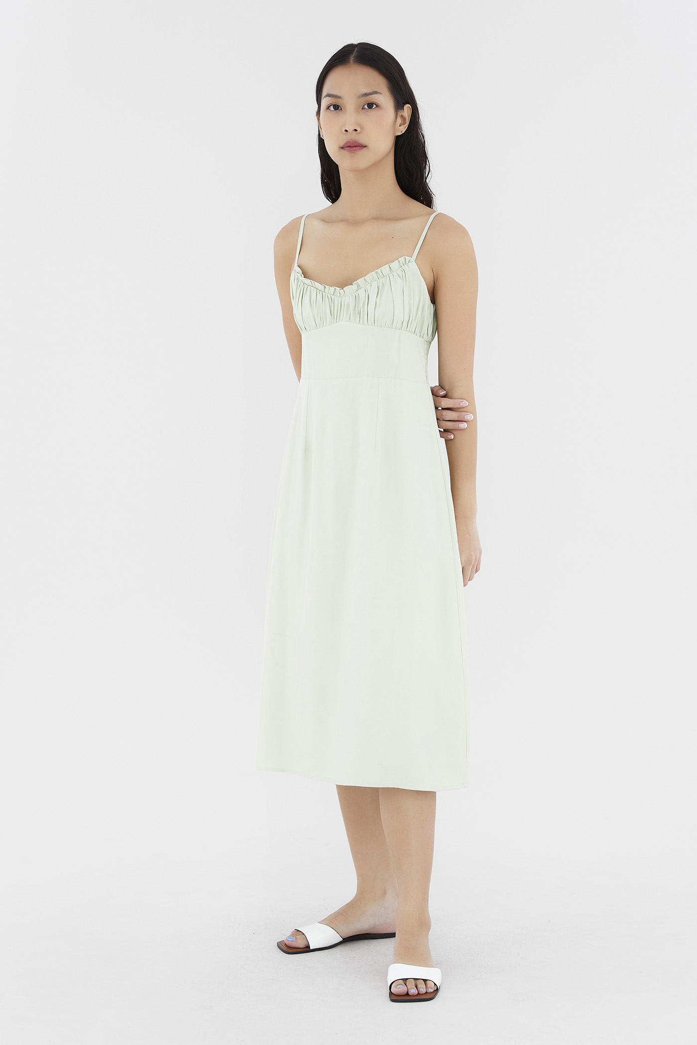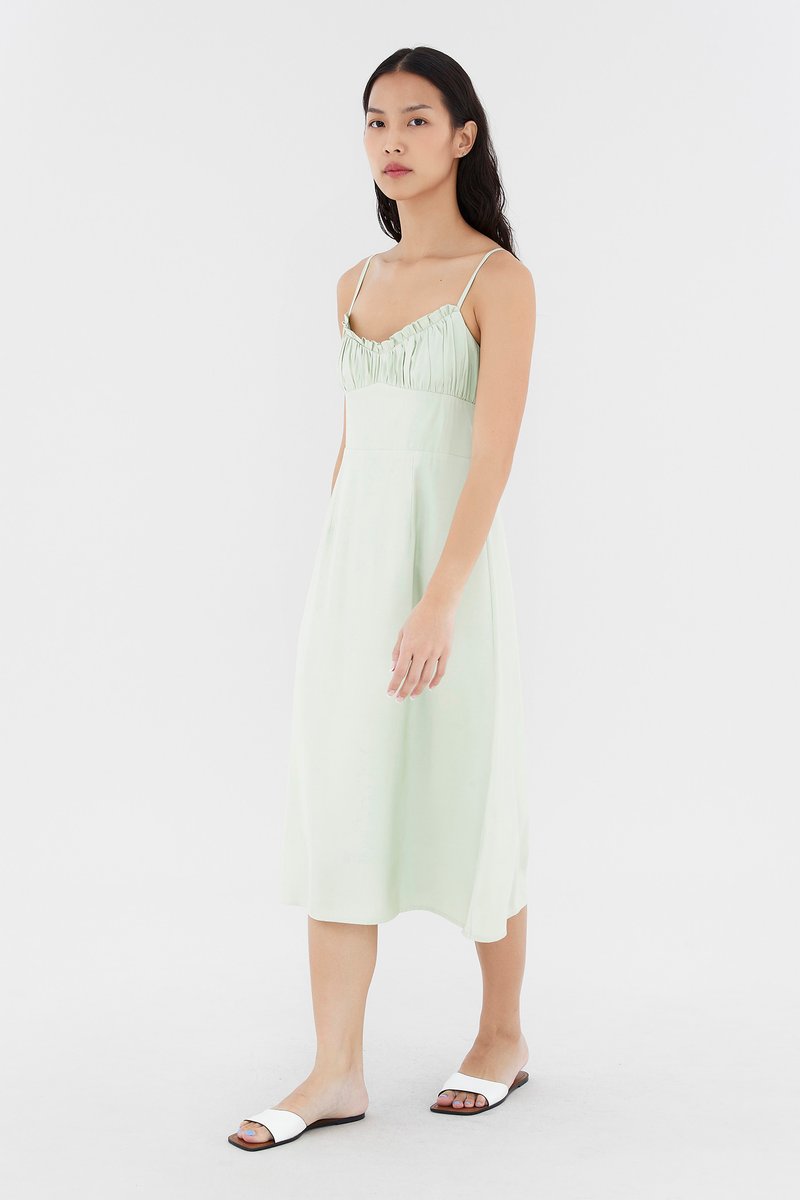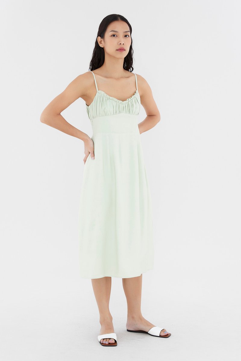 Add to your summer staples. Made from smooth and non-stretch fabric, this sleeveless midi dress features a ruched bust, a dipped, frill-trimmed neckline, slim adjustable shoulder straps, a wide waist panel and smocking at the back. Fits slim with a back zip closure.