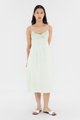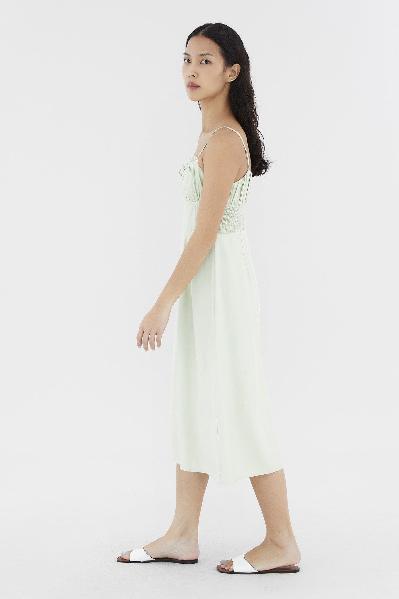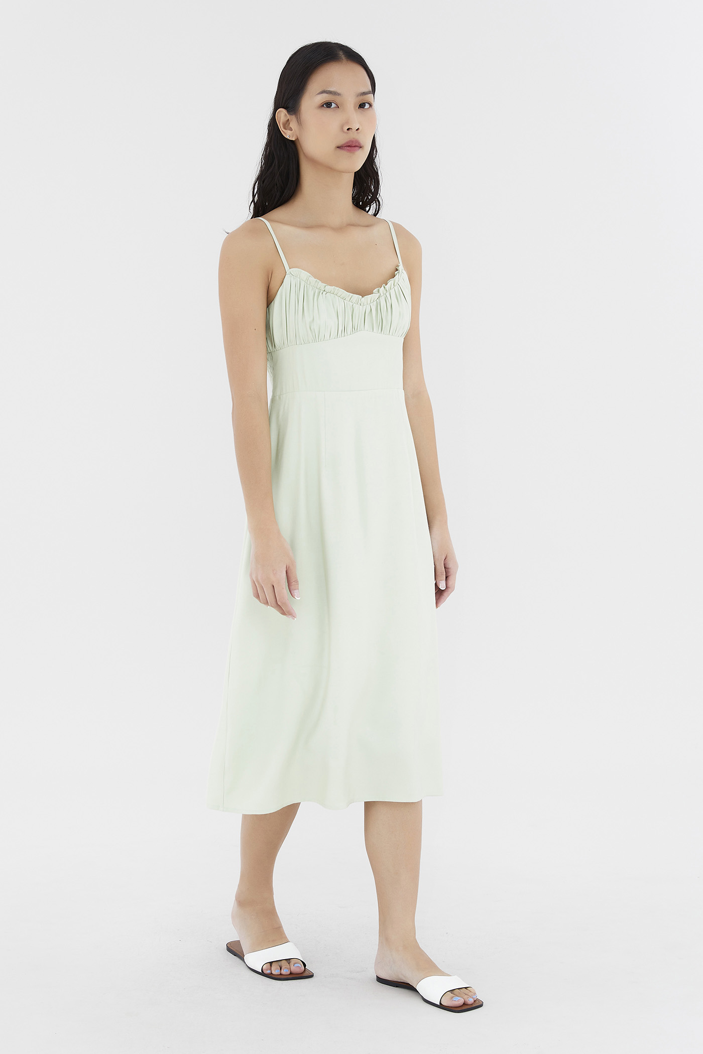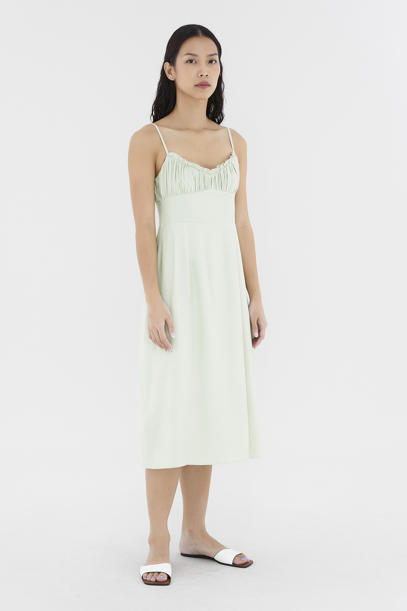 Add to your summer staples. Made from smooth and non-stretch fabric, this sleeveless midi dress features a ruched bust, a dipped, frill-trimmed neckline, slim adjustable shoulder straps, a wide waist panel and smocking at the back. Fits slim with a back zip closure.