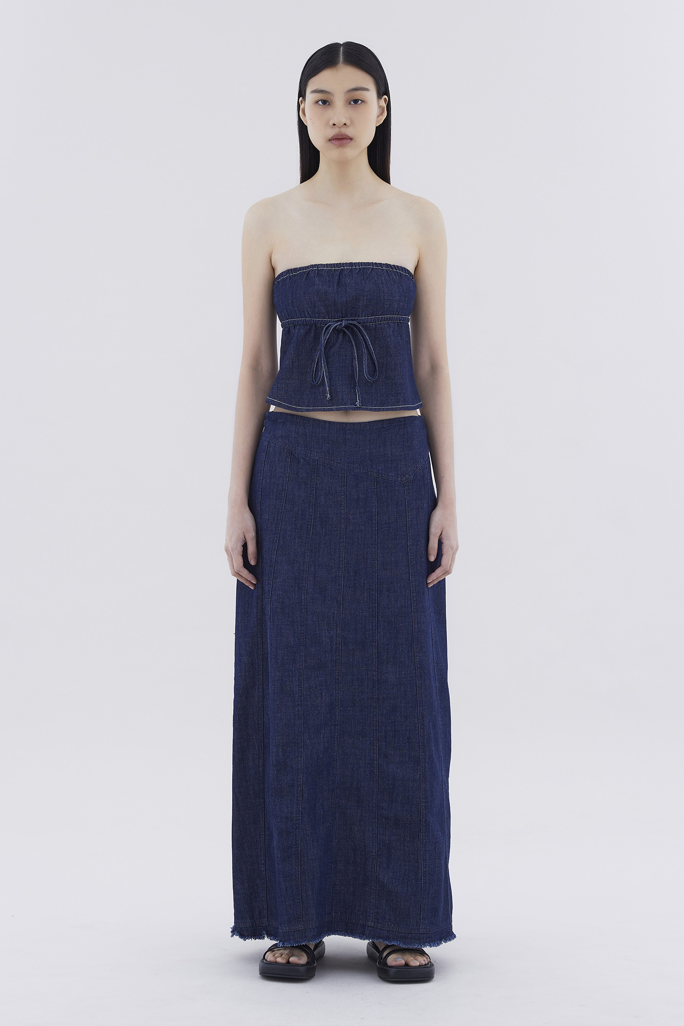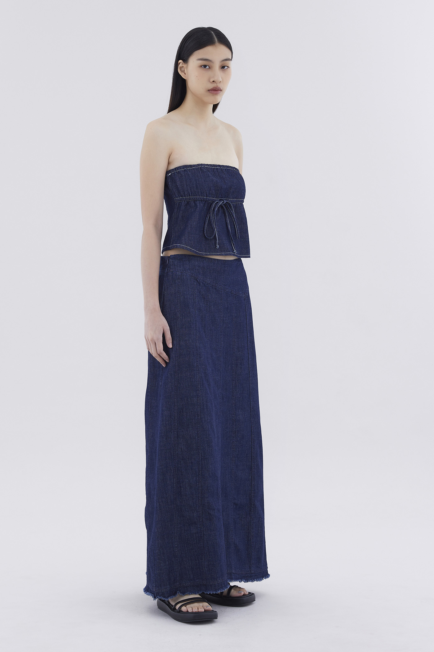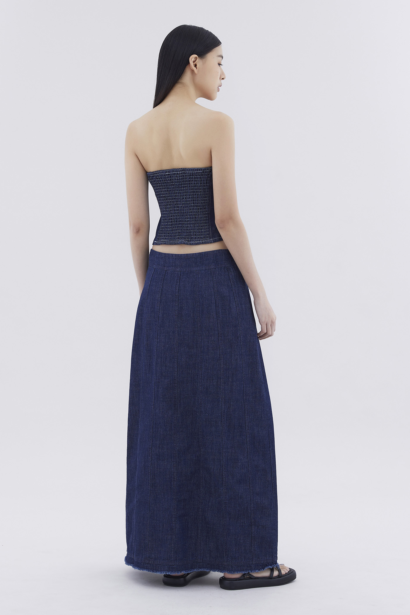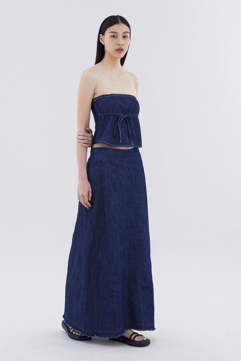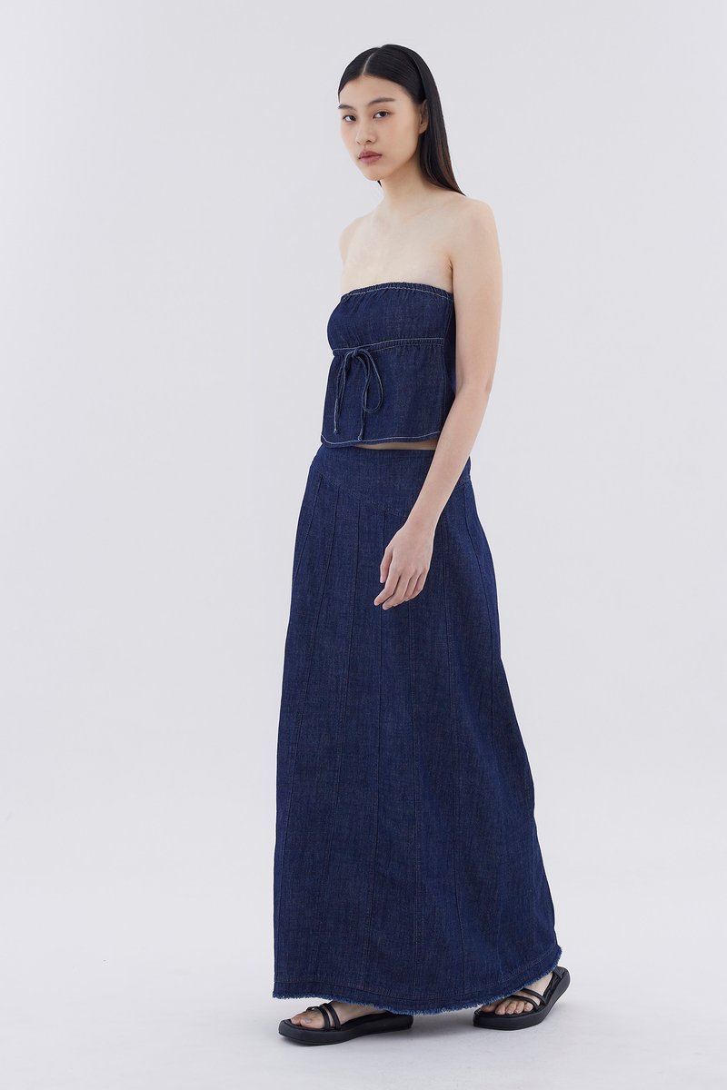 Not just a phase. Made from soft and gently structured cotton, this panelled denim skirt features a seamless, mid-rise waistband, a frayed hemline and a side zip closure. Worn in a slim A-line silhouette and maxi length.