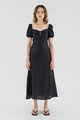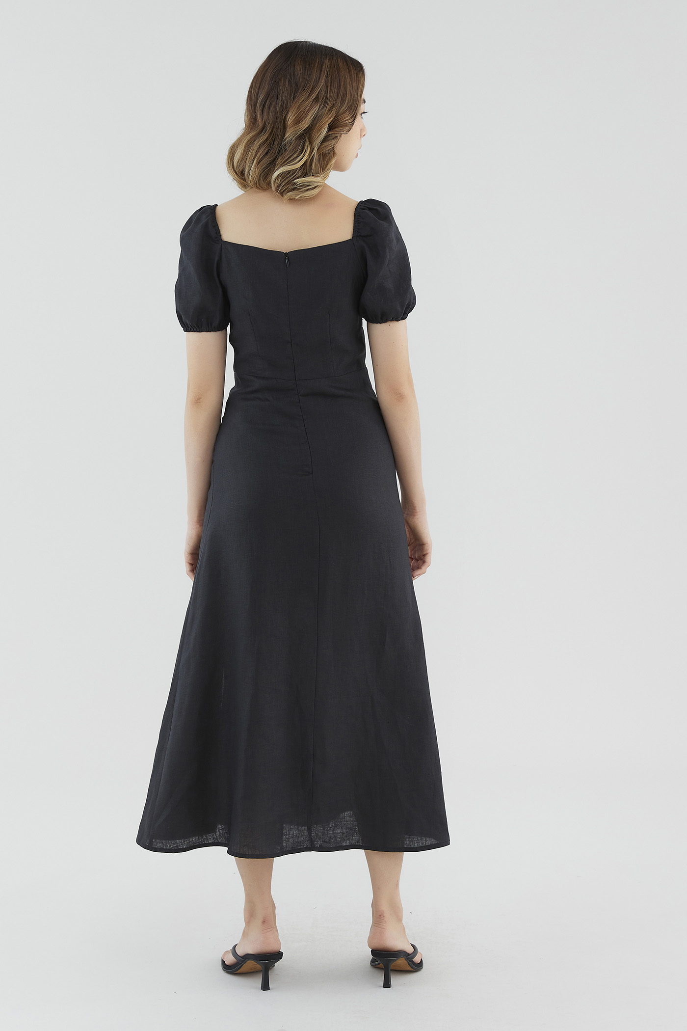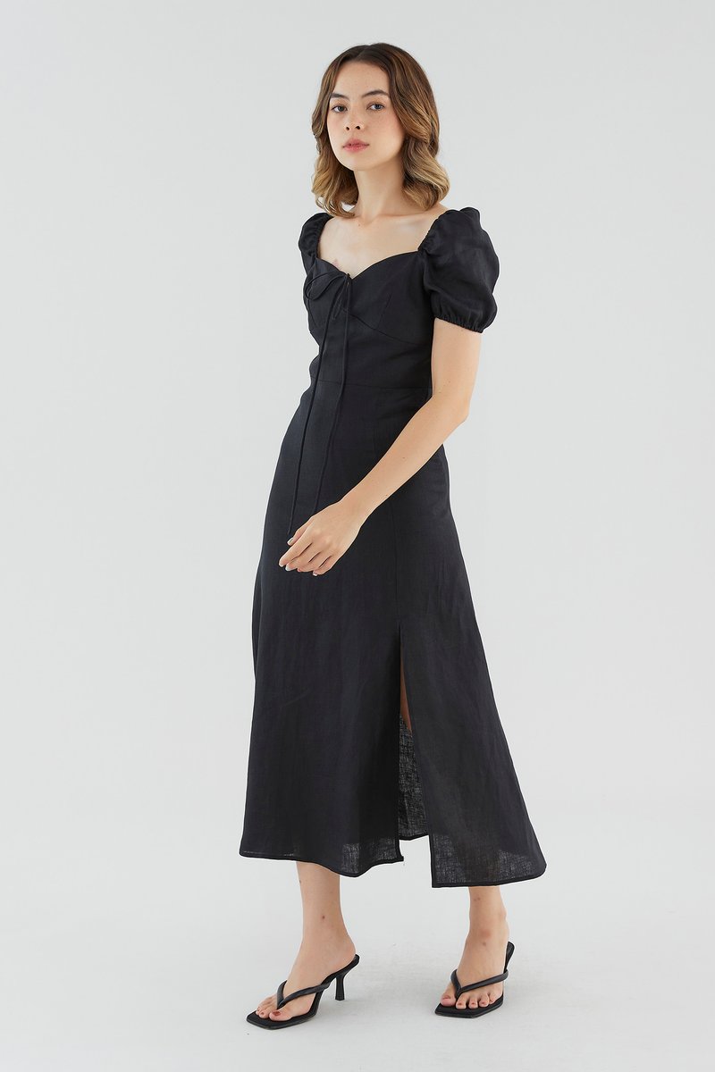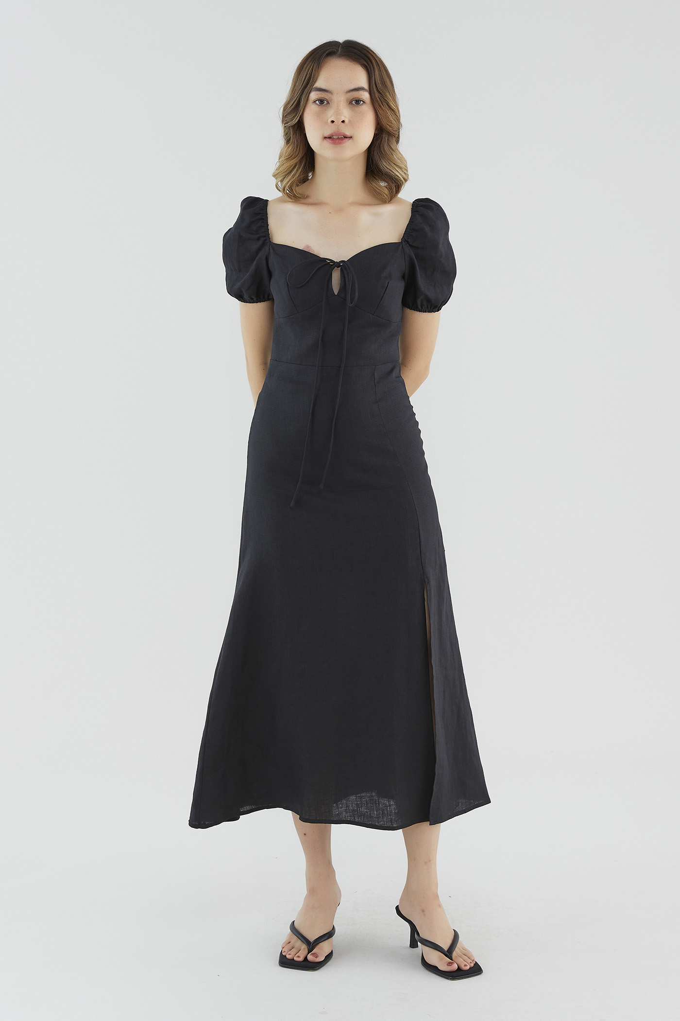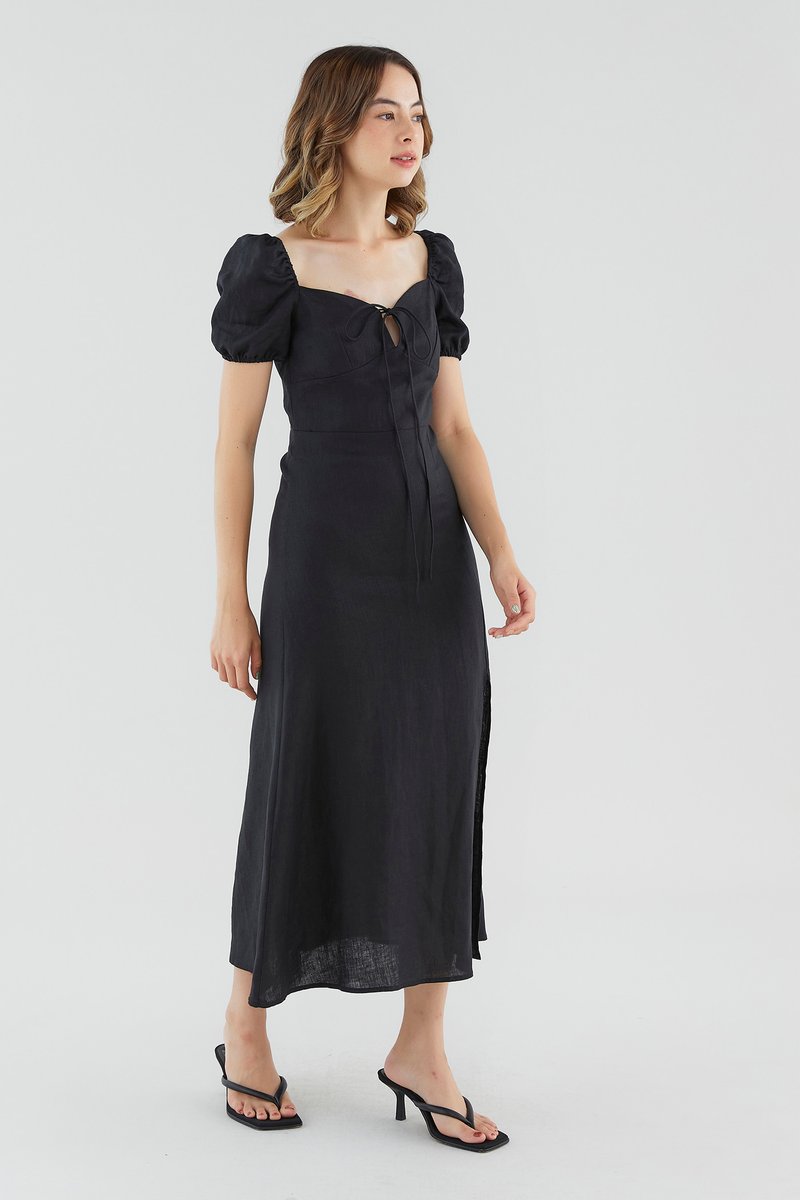 <p><span style="font-weight: 400;">Fabric composition: 100% Linen</span></p> <p><span style="font-weight: 400;">Lining: Full</span></p> <p><span style="font-weight: 400;">Sheerness: None </span></p> <p><span style="font-weight: 400;">Pockets: None</span></p> <p><span style="font-weight: 400;">Your beach-to-brunch mainstay. Made from airy 100% linen with a structured drape, this dress features a sweetheart neckline, short puff sleeves, elasticated shoulders, a tie-front closure and a side skirt slit. Worn in a slim fit and midi-to-maxi length, with a zip closure on the back. </span></p> <p><span style="font-weight: 400;">Care Instructions: Do not soak / Do not bleach / Handwash or Machine wash on gentle mode / Do not machine dry / Iron using low heat</span></p>