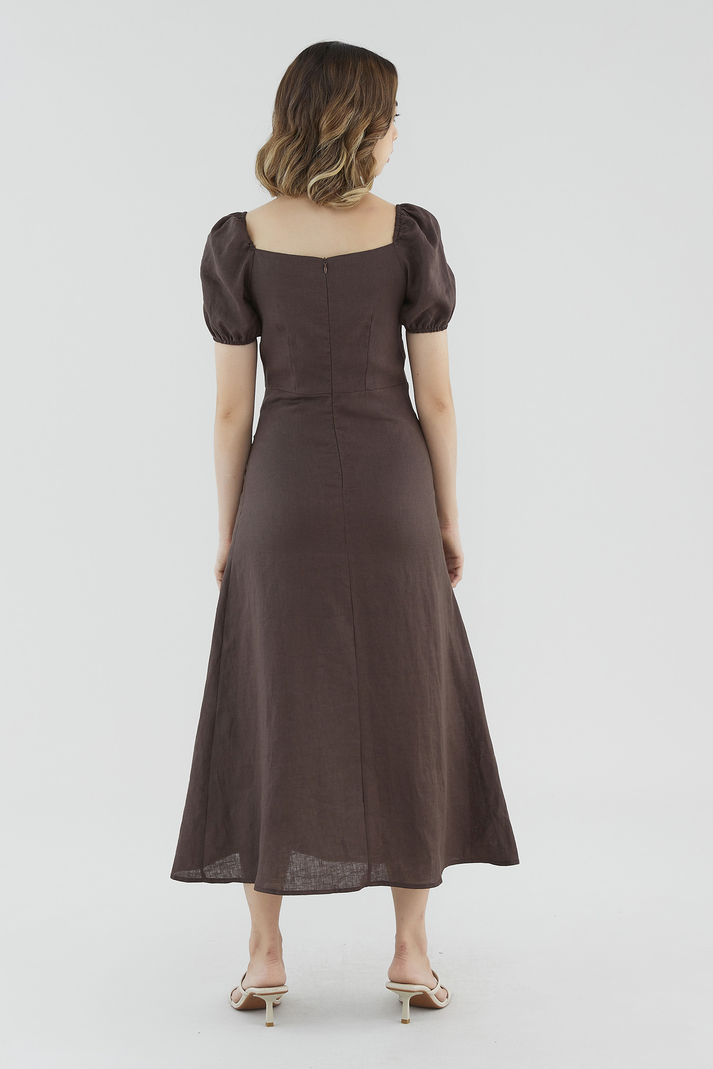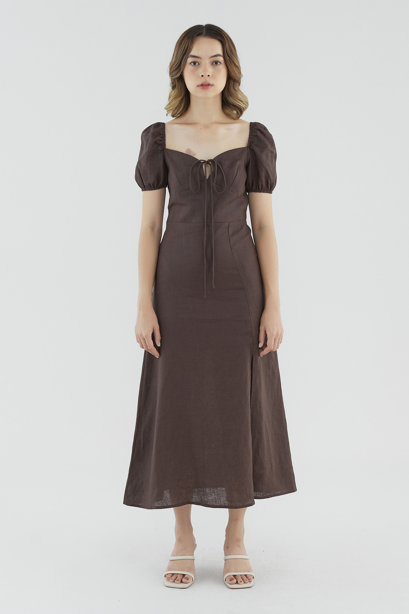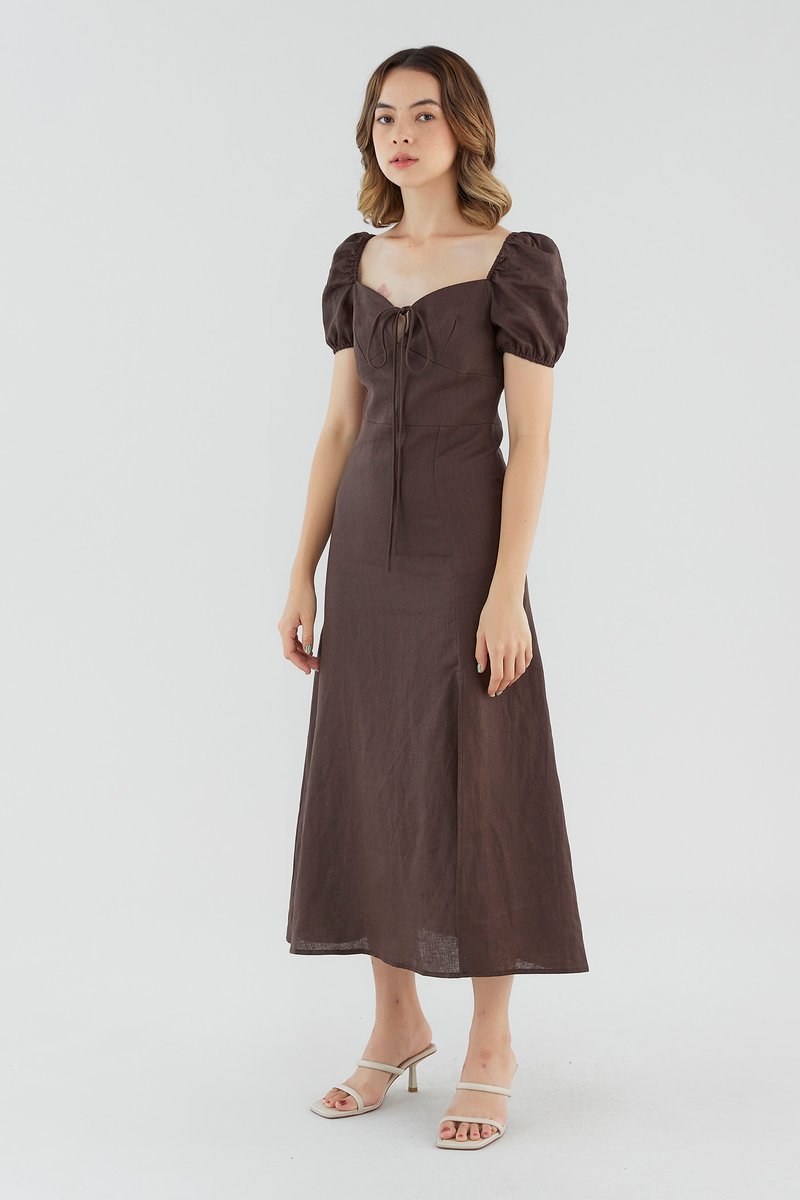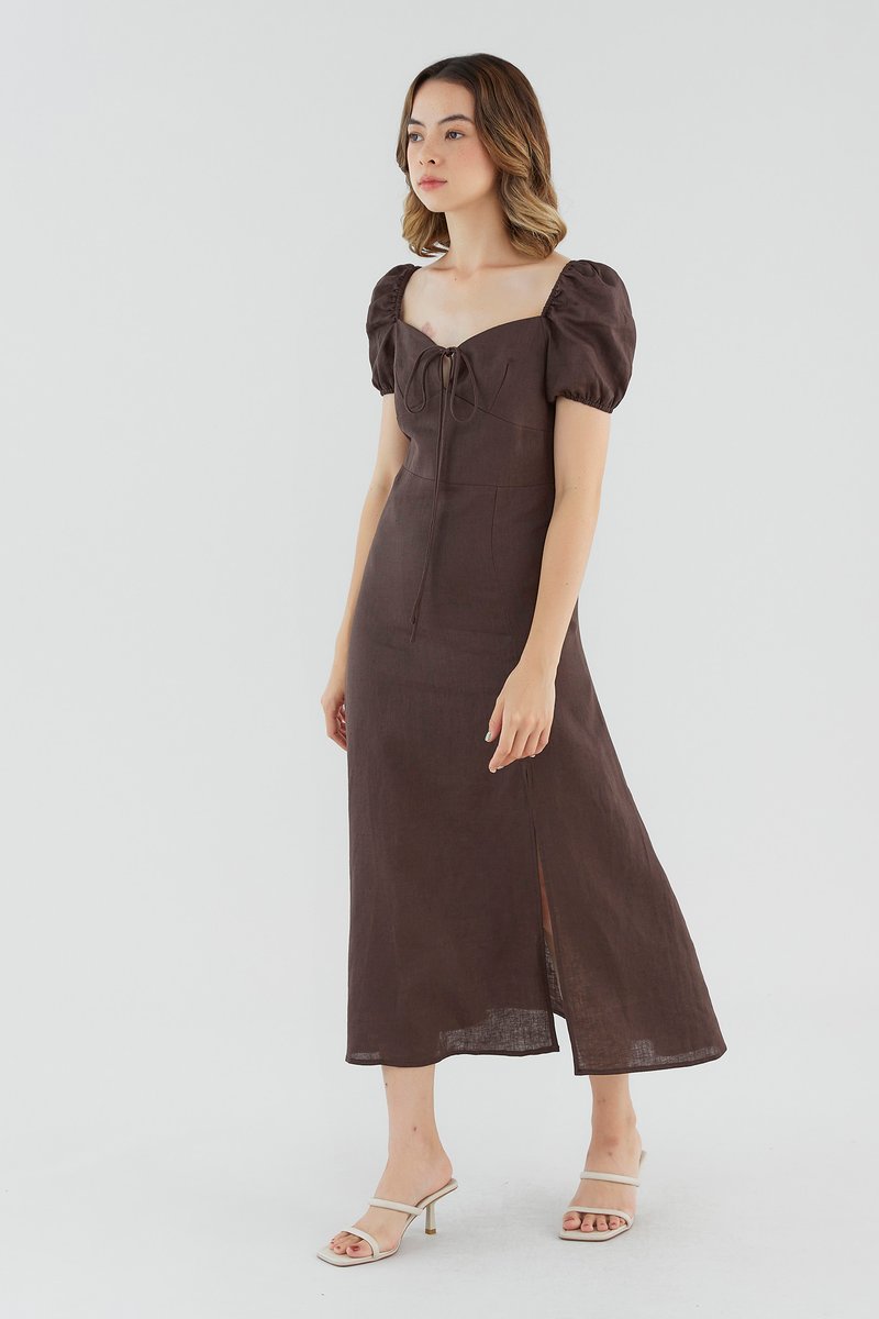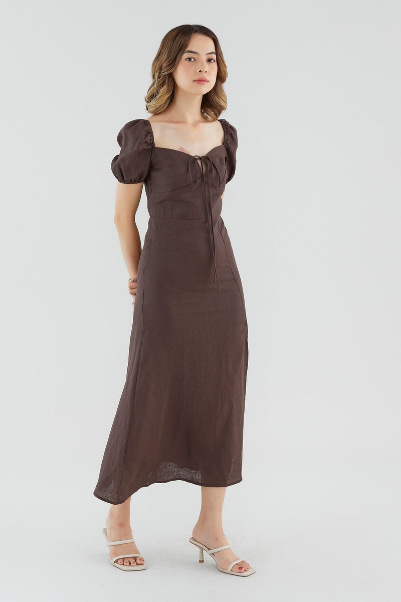 <p><span style="font-weight: 400;">Fabric composition: 100% Linen</span></p> <p><span style="font-weight: 400;">Lining: Full</span></p> <p><span style="font-weight: 400;">Sheerness: None </span></p> <p><span style="font-weight: 400;">Pockets: None</span></p> <p><span style="font-weight: 400;">Your beach-to-brunch mainstay. Made from airy 100% linen with a structured drape, this dress features a sweetheart neckline, short puff sleeves, elasticated shoulders, a tie-front closure and a side skirt slit. Worn in a slim fit and midi-to-maxi length, with a zip closure on the back. </span></p> <p><span style="font-weight: 400;">Care Instructions: Do not soak / Do not bleach / Handwash or Machine wash on gentle mode / Do not machine dry / Iron using low heat</span></p>