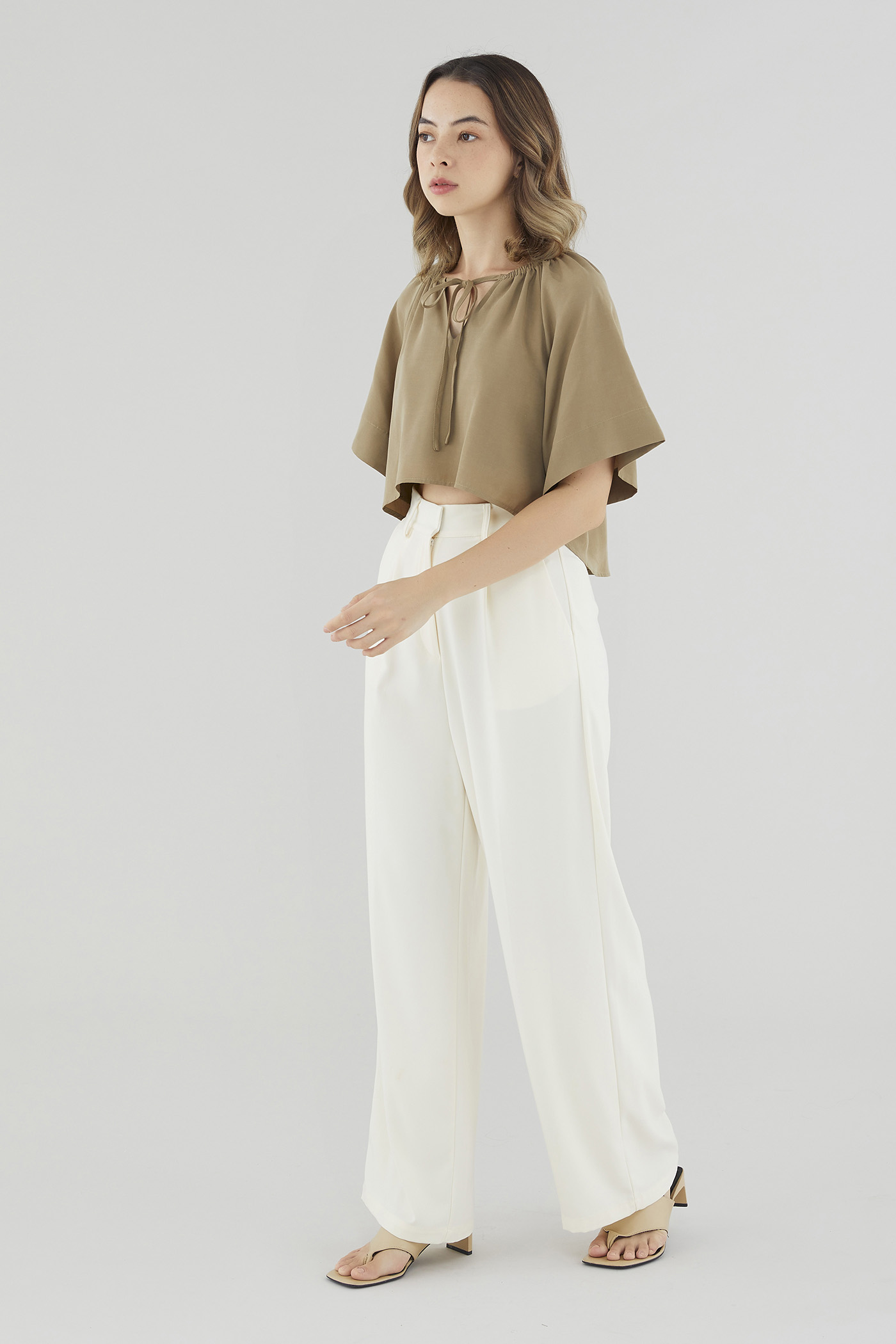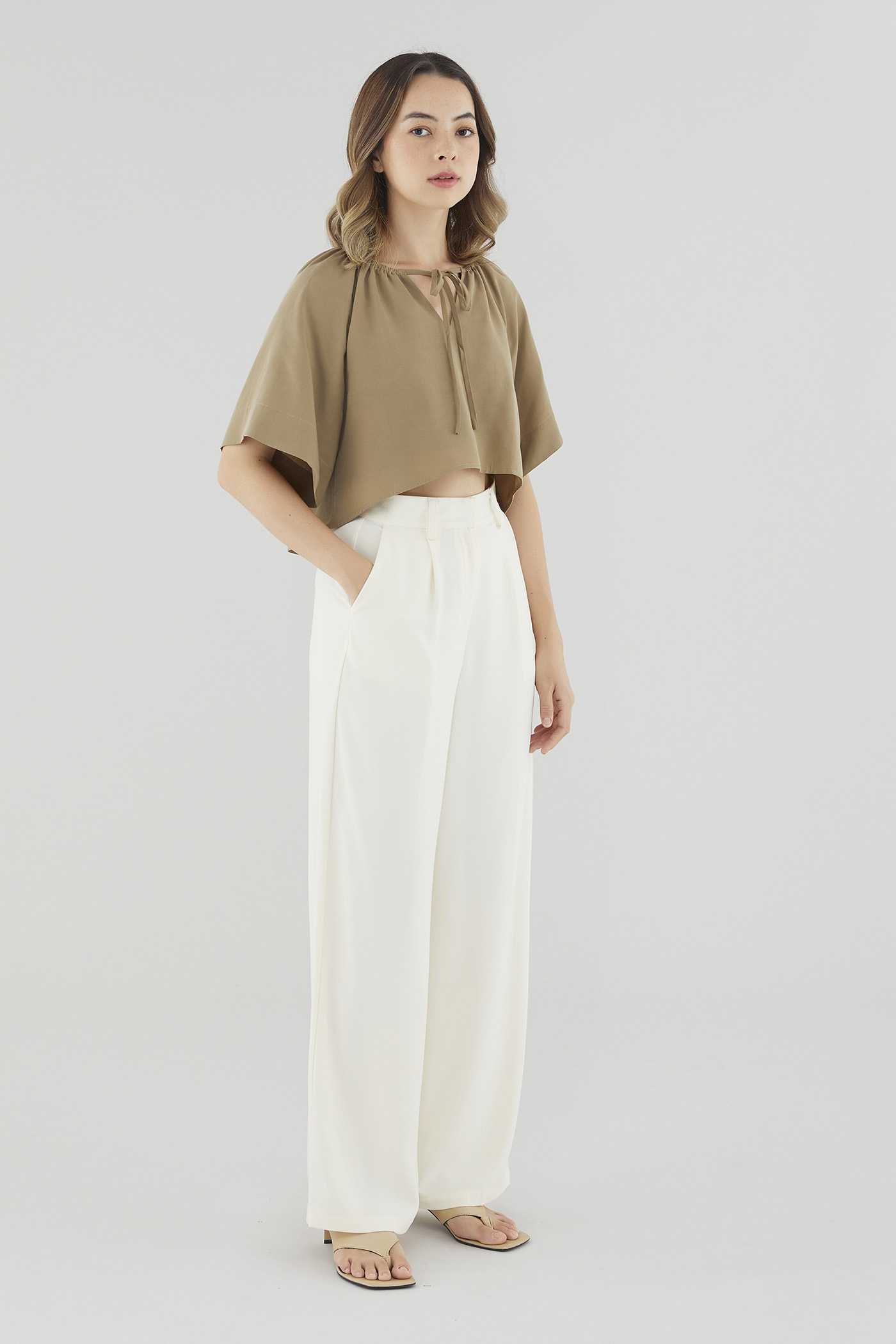 More than meets the eye. Made from lightweight and non-stretch fabric, this blouse features short wide sleeves, an elasticated V-notch neckline with a self-tie closure and a flowy, high-low hemline that is slightly cropped at the front. Worn in a relaxed fit.