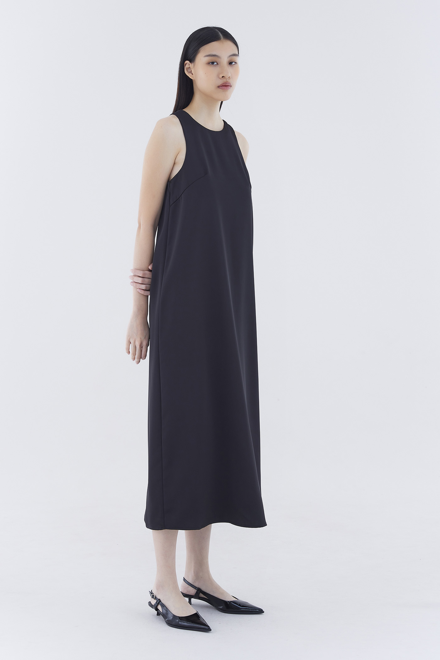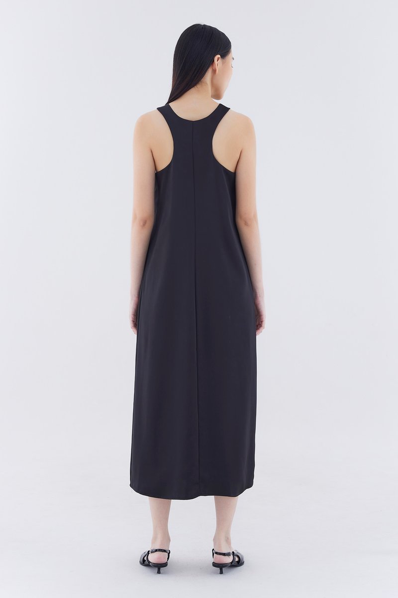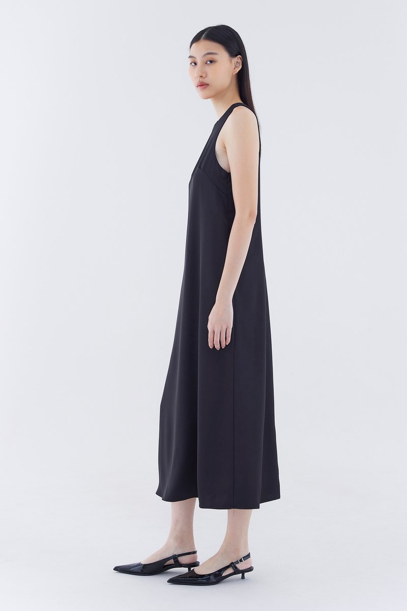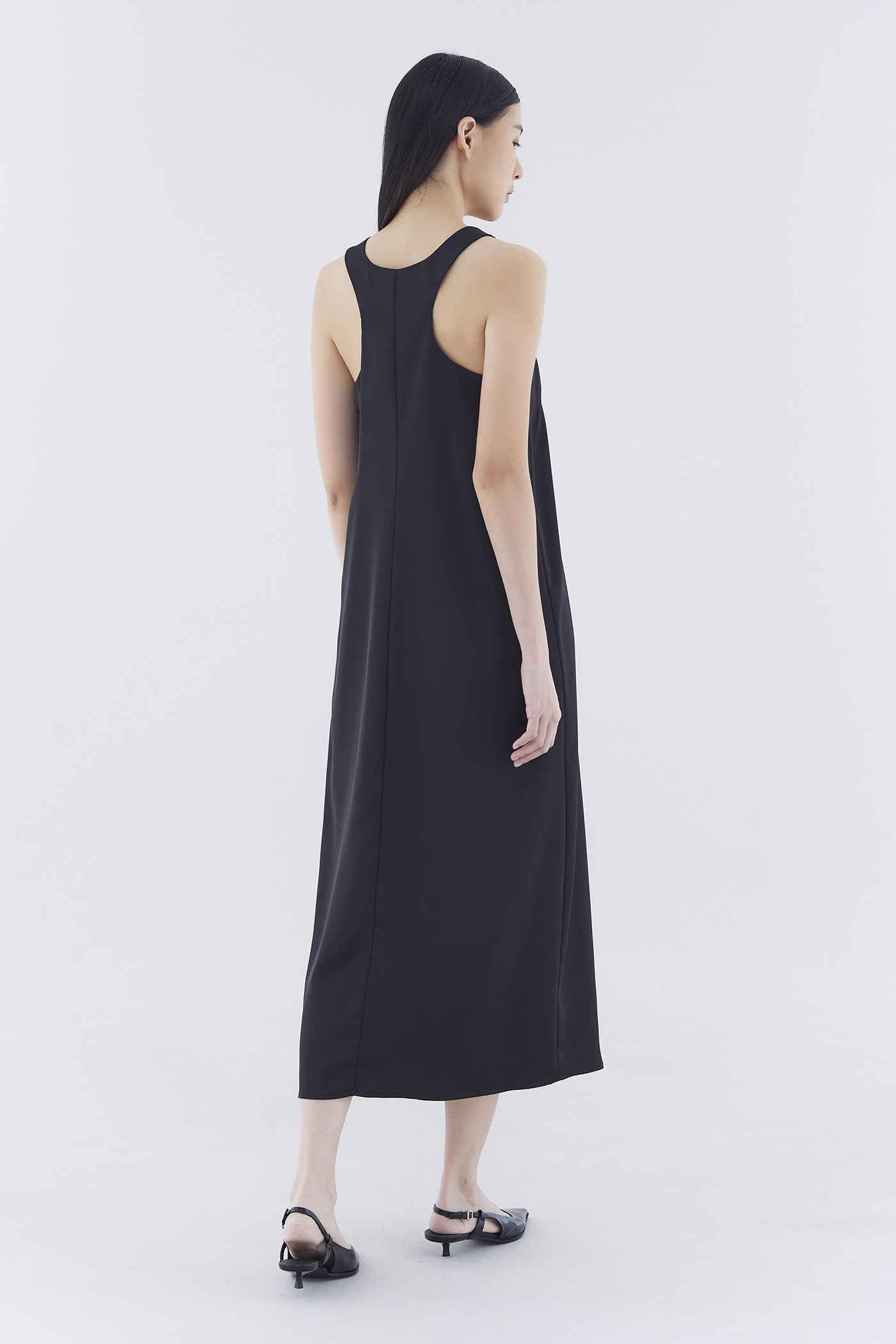 One and done. Made from smooth and satiny fabric, this sleeveless maxi dress features a round neckline, racerback and side zip closure. Fits relaxed in a flowy, column silhouette.