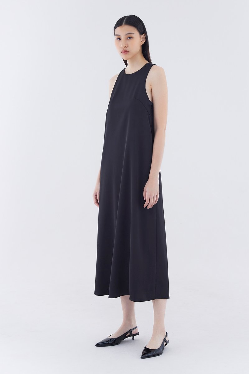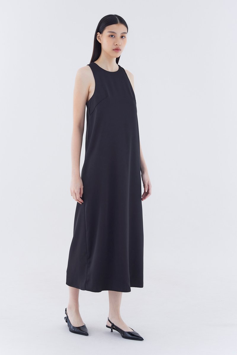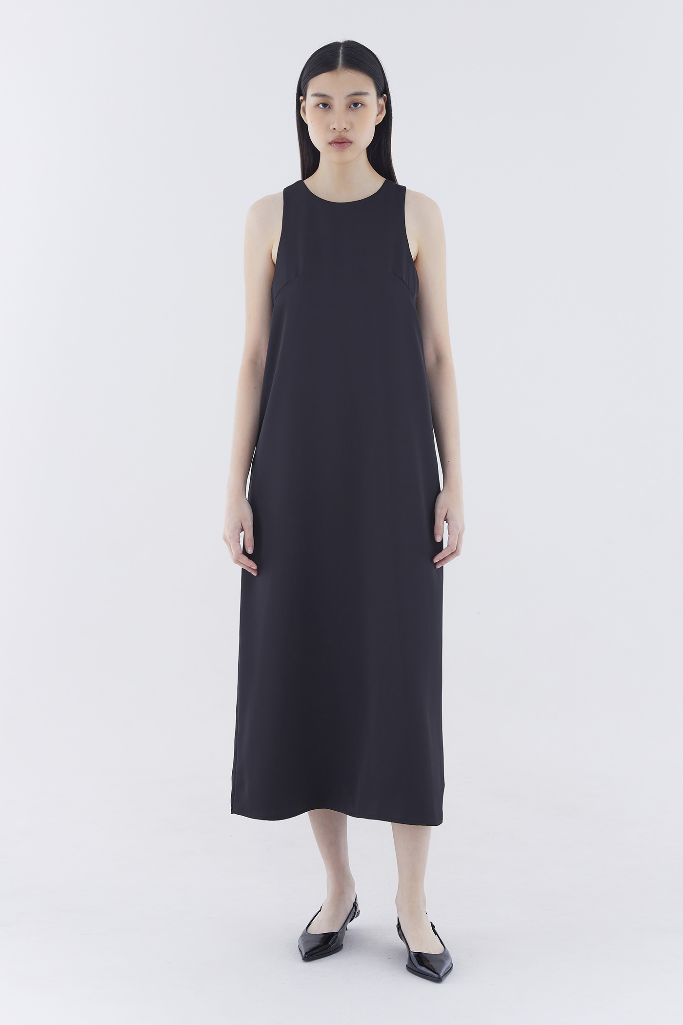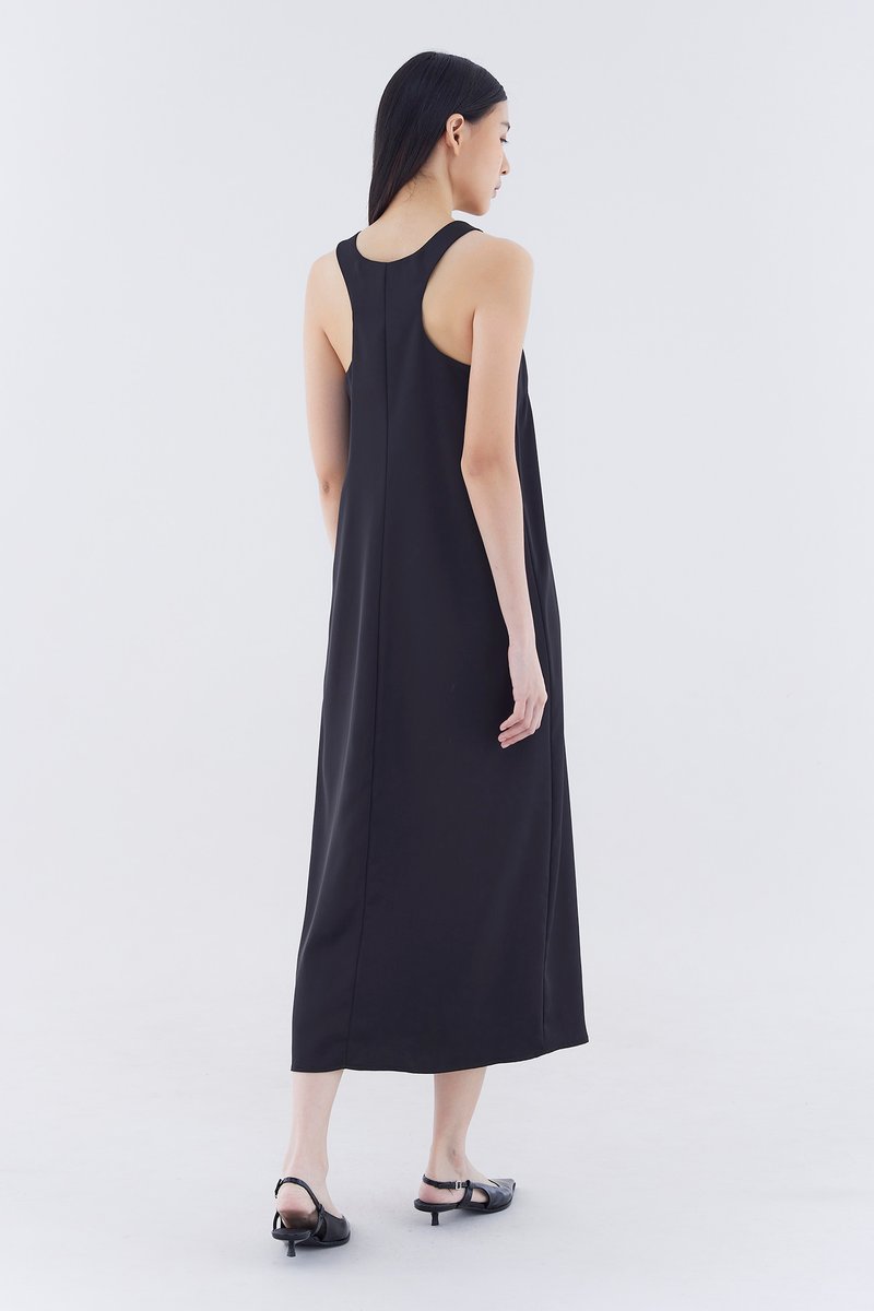 One and done. Made from smooth and satiny fabric, this sleeveless maxi dress features a round neckline, racerback and side zip closure. Fits relaxed in a flowy, column silhouette.