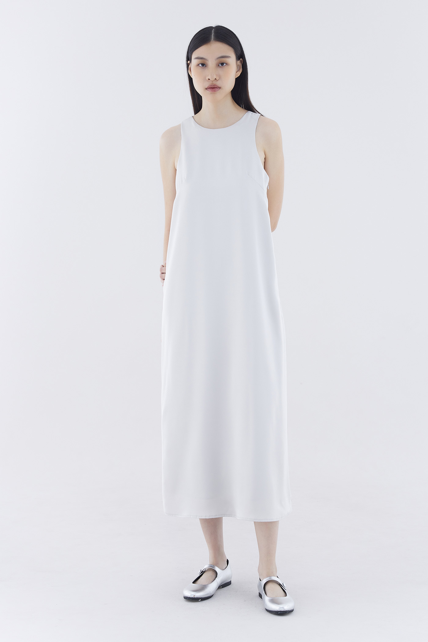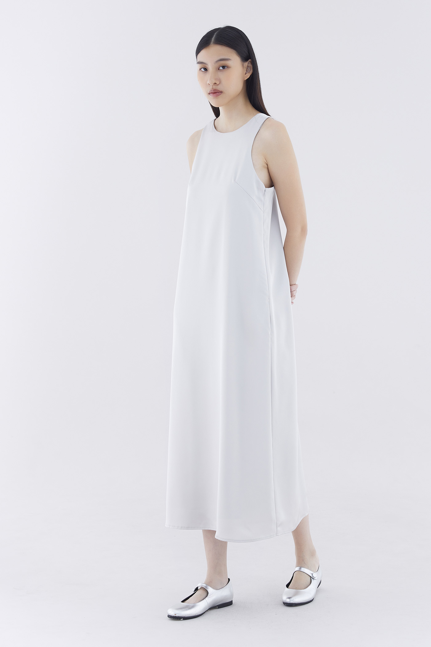 One and done. Made from smooth and satiny fabric, this sleeveless maxi dress features a round neckline, racerback and side zip closure. Fits relaxed in a flowy, column silhouette.