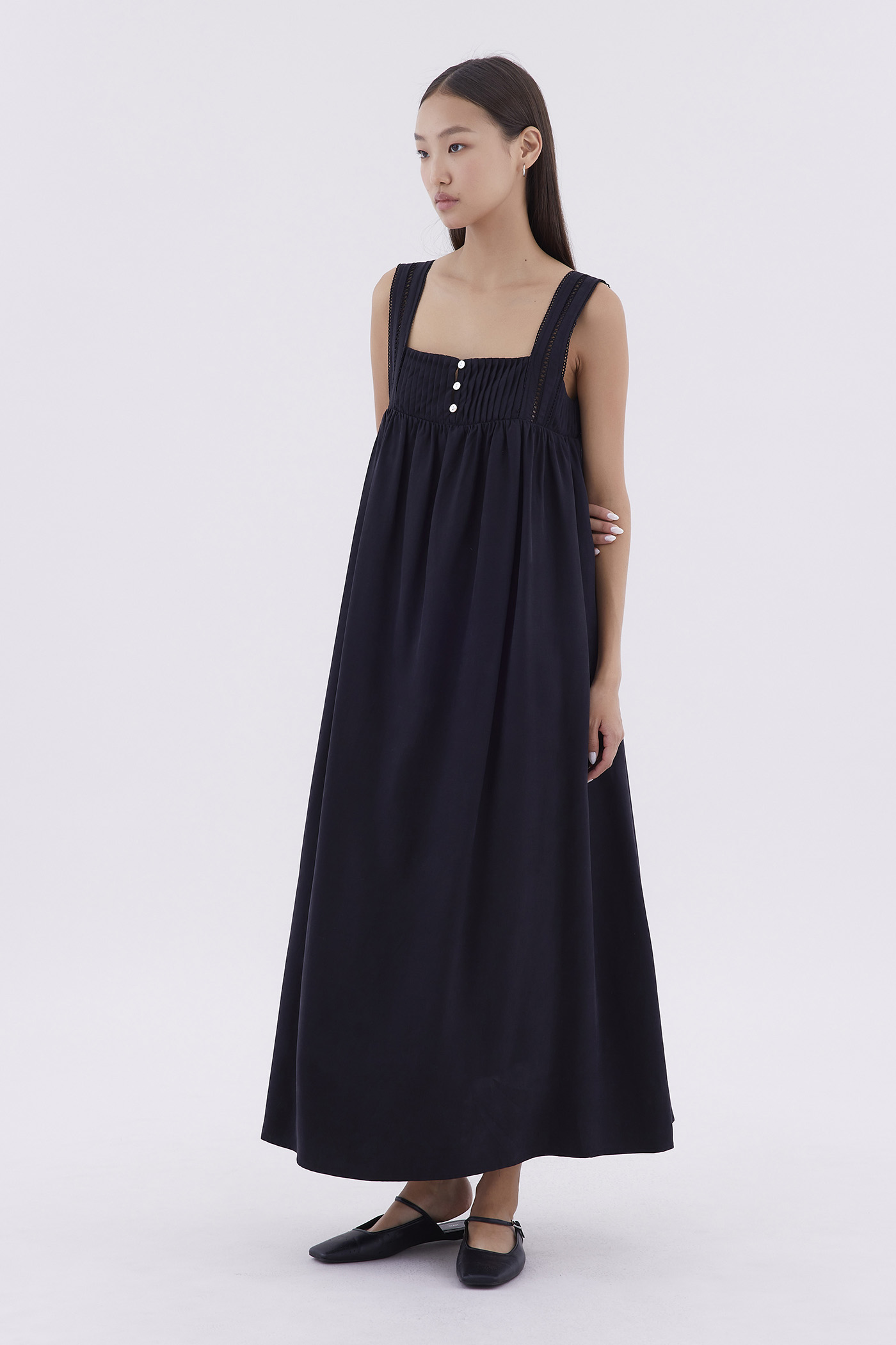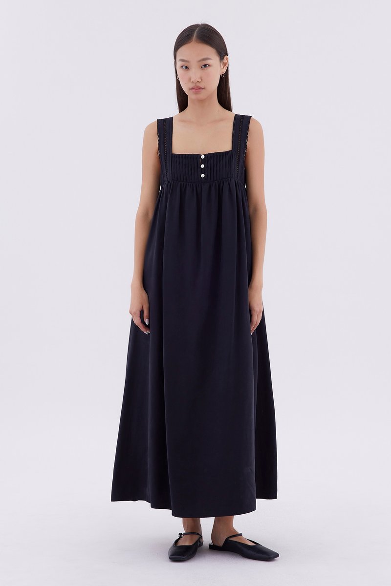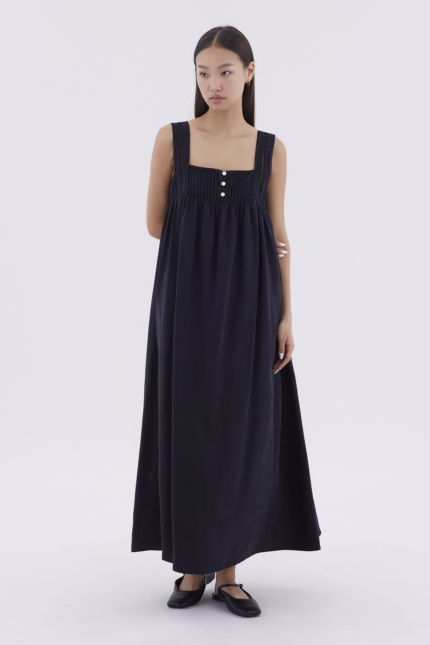 Clean lines. Made from smooth and lightweight fabric, this sleeveless maxi dress features wide lace-trimmed shoulder straps, a square neckline, a pin-tucked bust and front buttons. Fits relaxed in a tent silhouette.