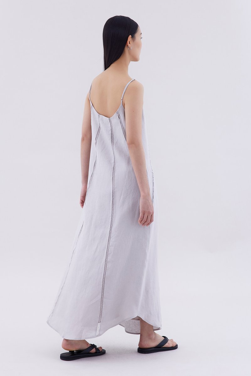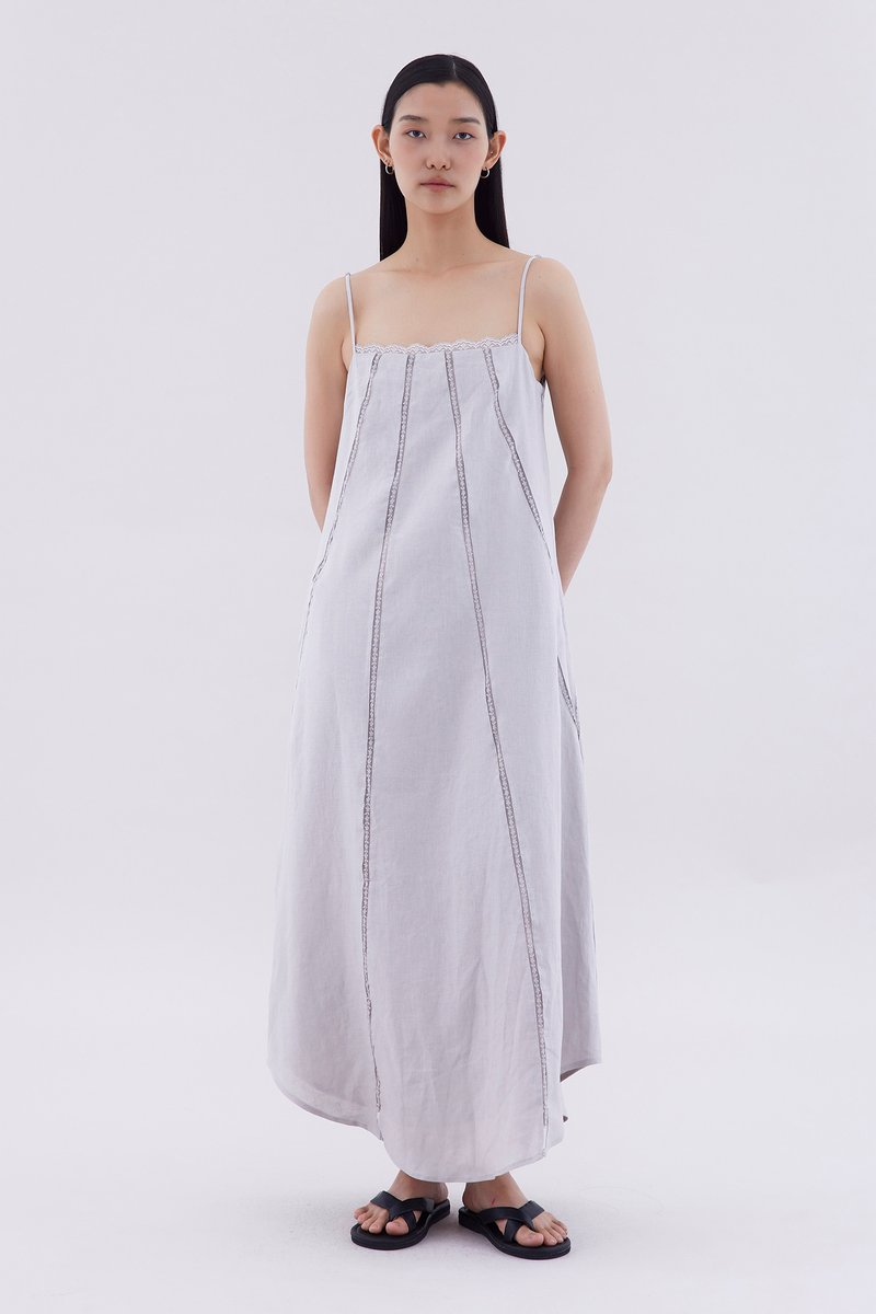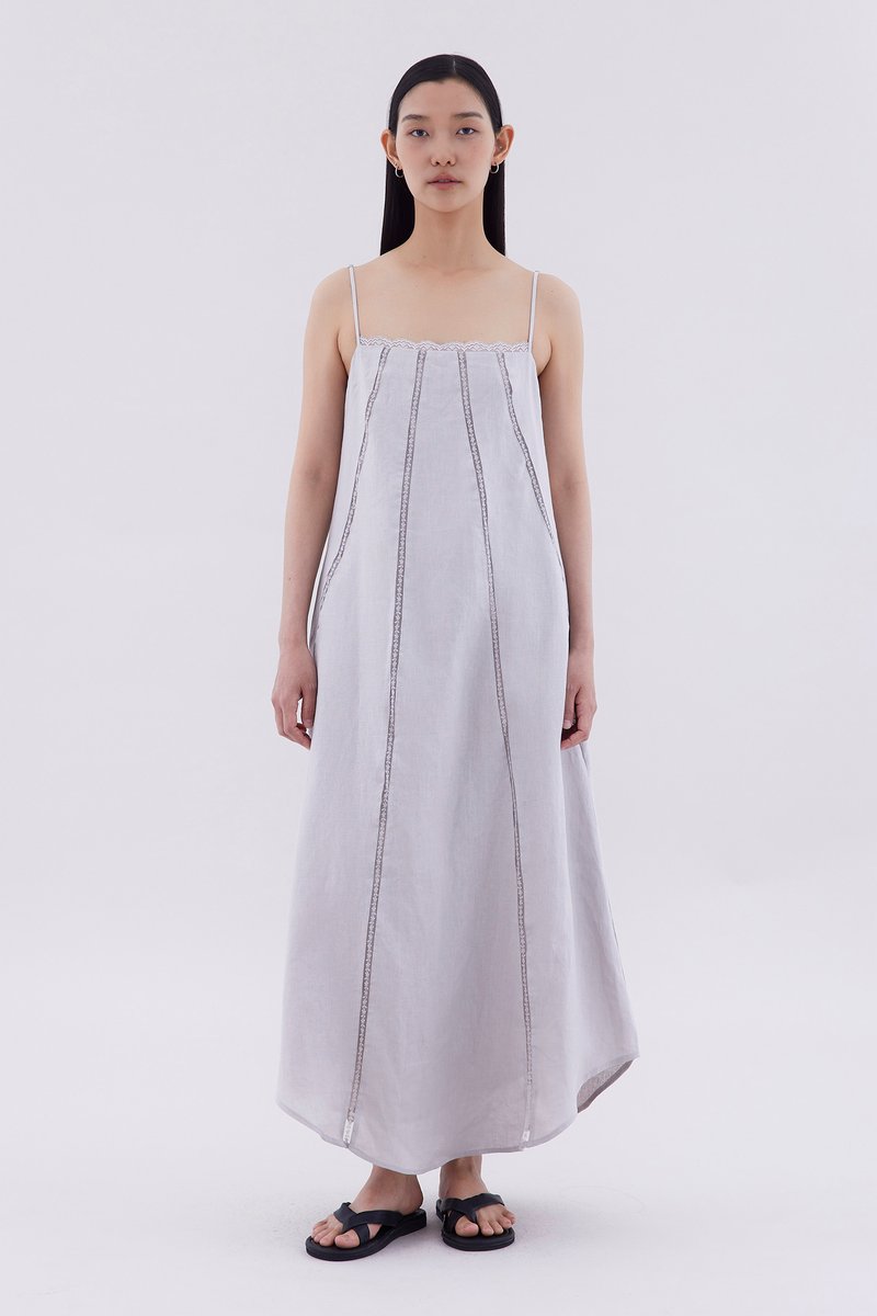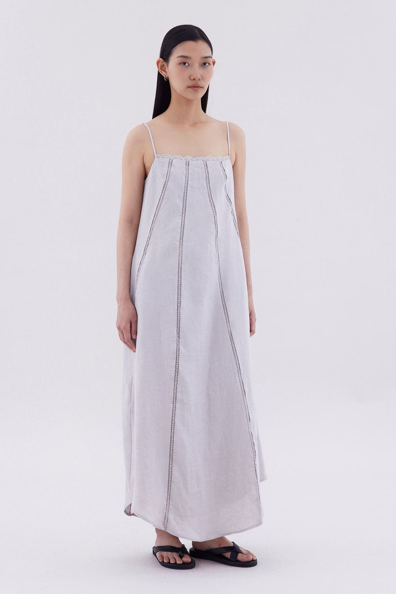 Take on hot days. Cut from airy and gently tailored linen, this sleeveless maxi dress features a straight lace-trimmed neckline, lace-trimmed panels, slim adjustable shoulder straps and a side zip closure. Worn in a relaxed fit.
