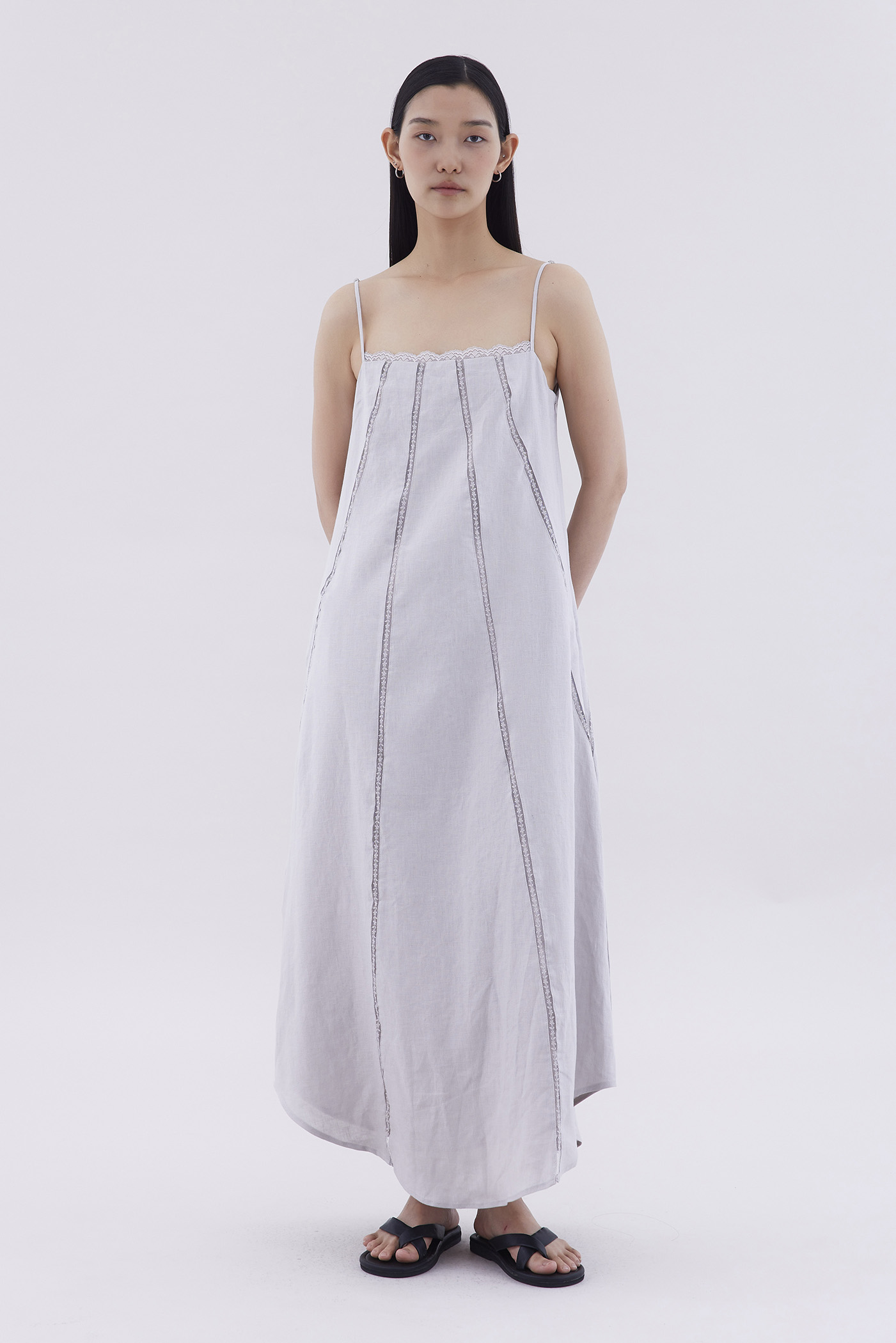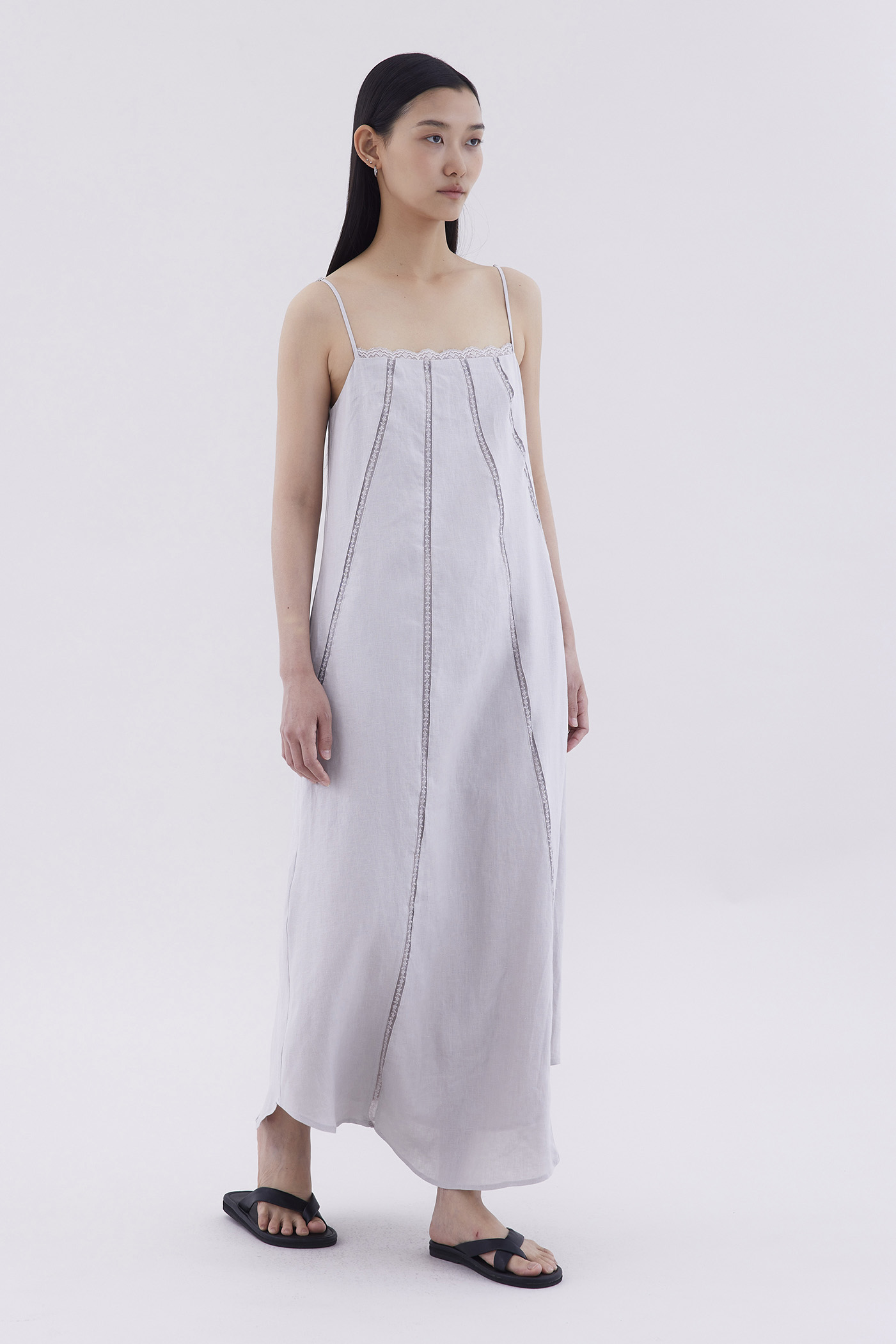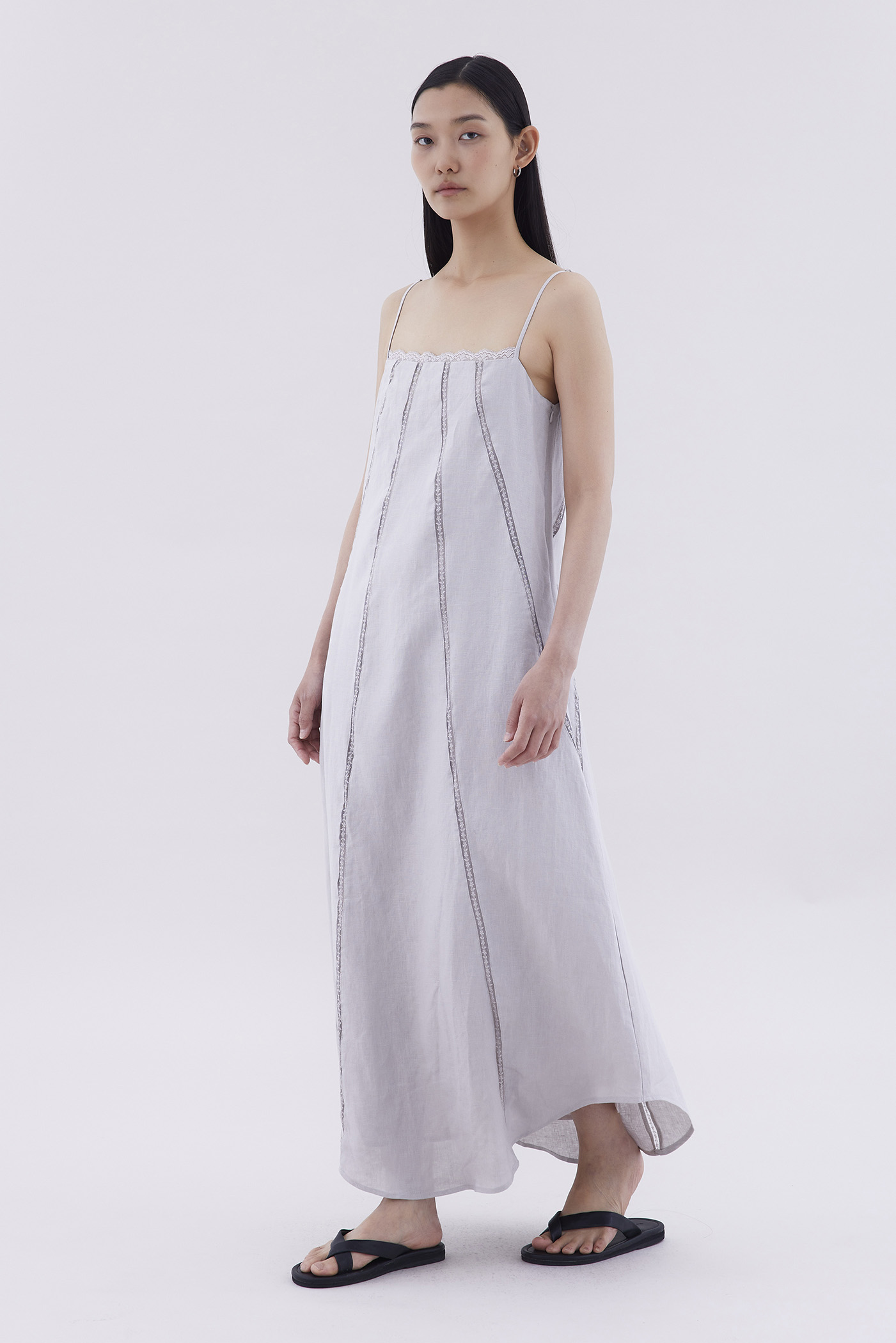 Take on hot days. Cut from airy and gently tailored linen, this sleeveless maxi dress features a straight lace-trimmed neckline, lace-trimmed panels, slim adjustable shoulder straps and a side zip closure. Worn in a relaxed fit.